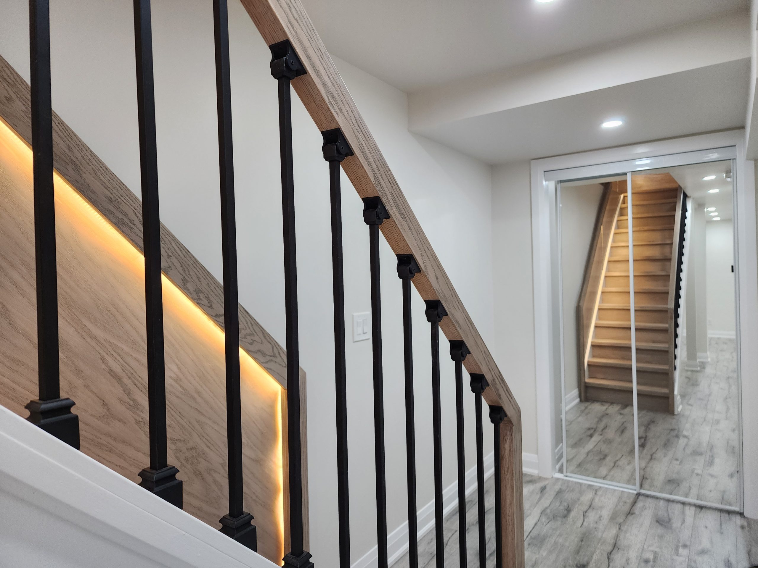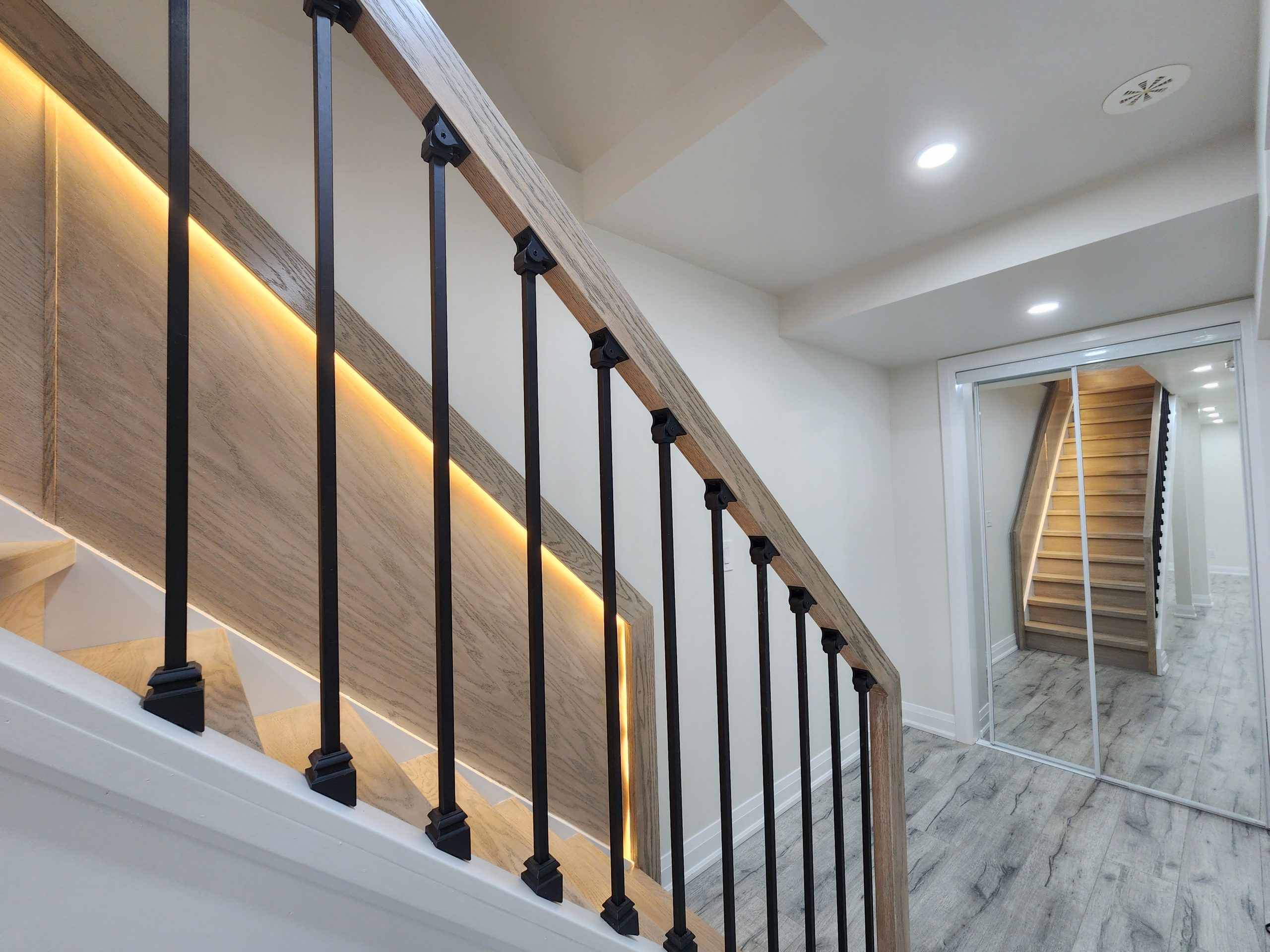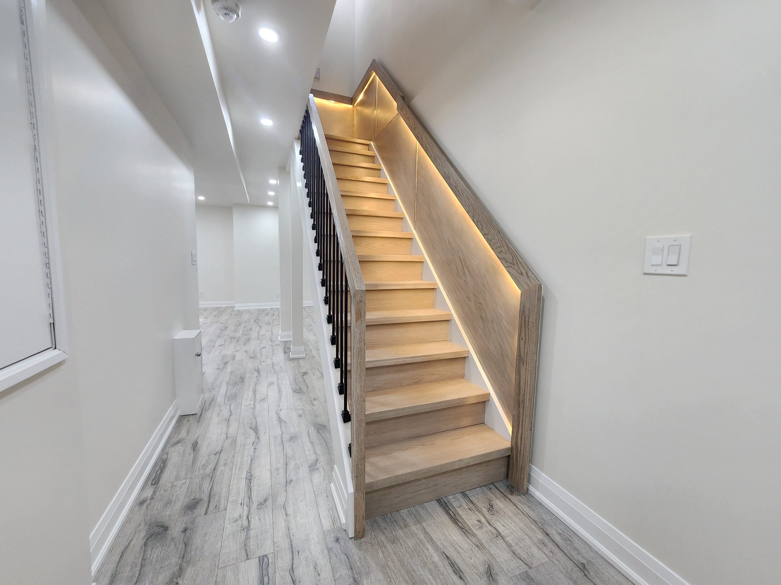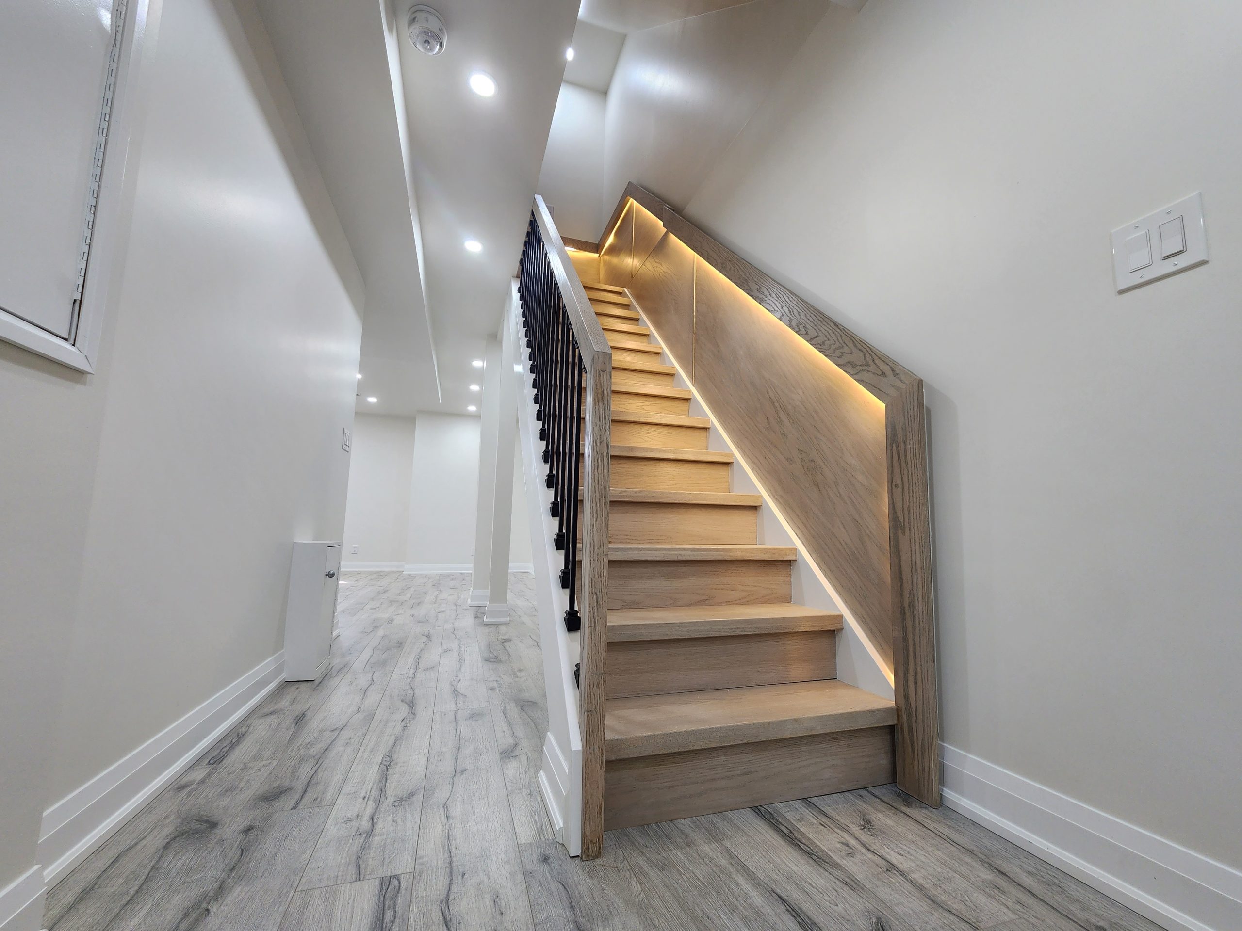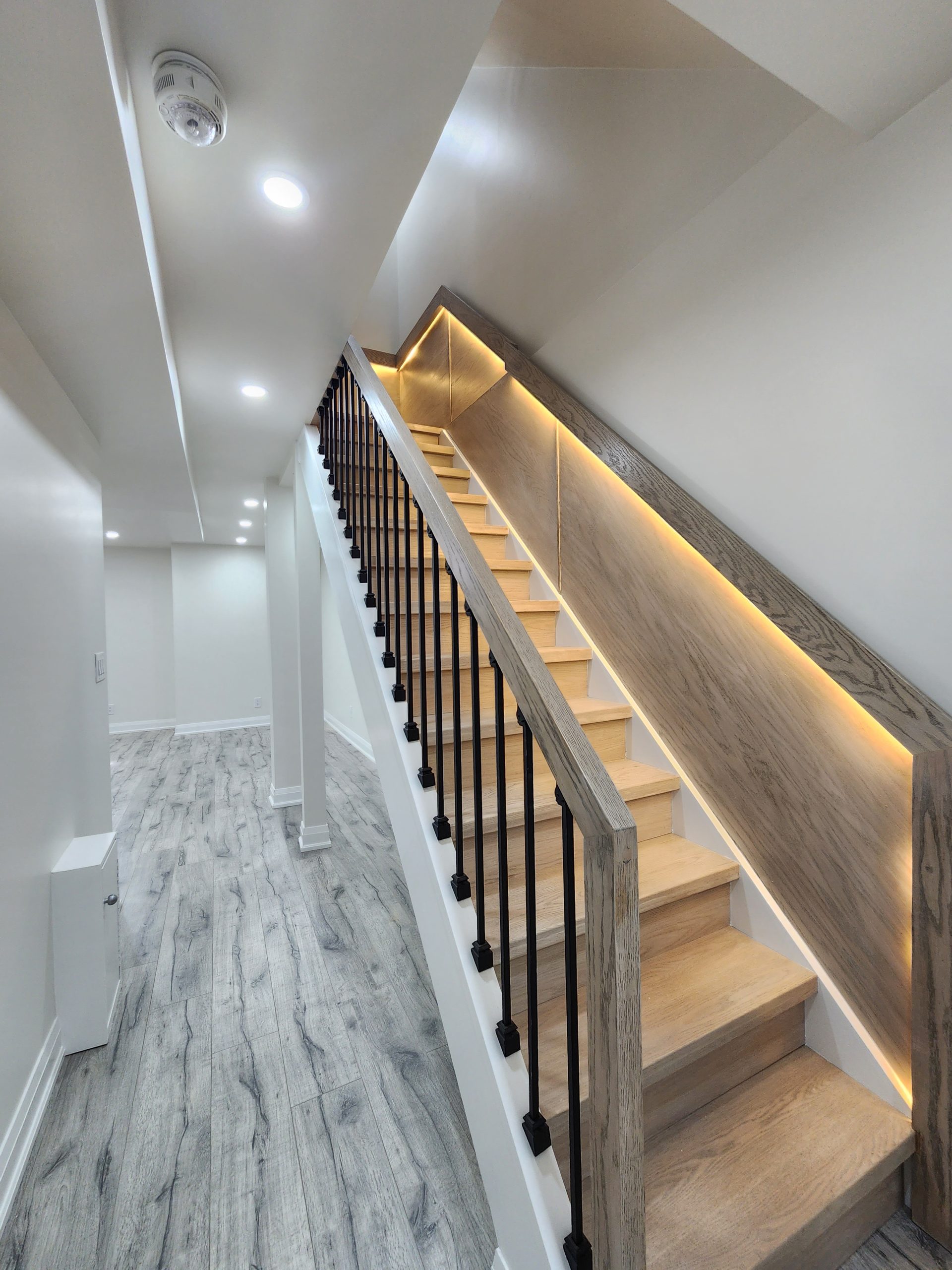 This renovation transformed an unfinished basement into a clean, modern, and fully functional living space—featuring one of our signature custom LED staircases.