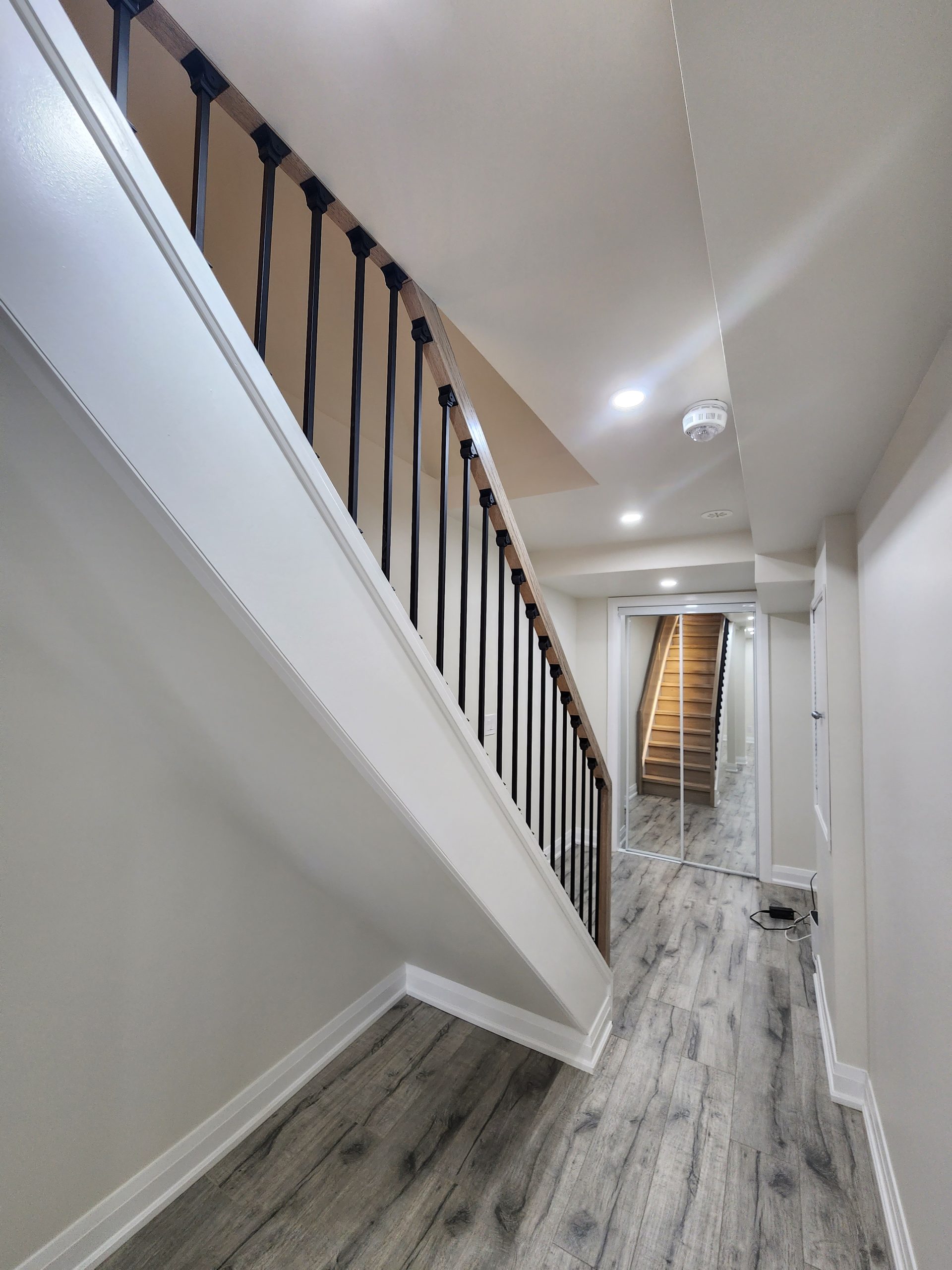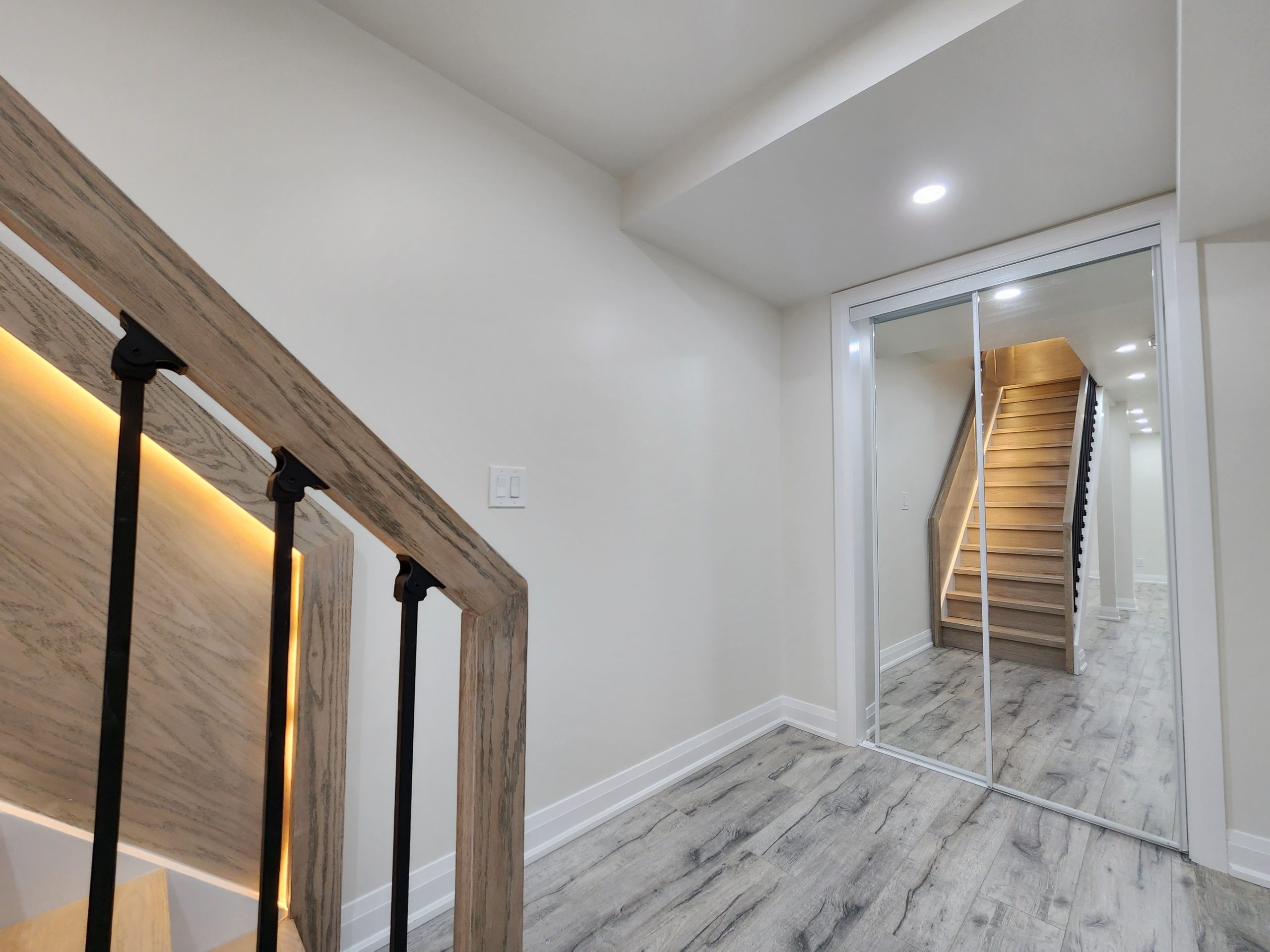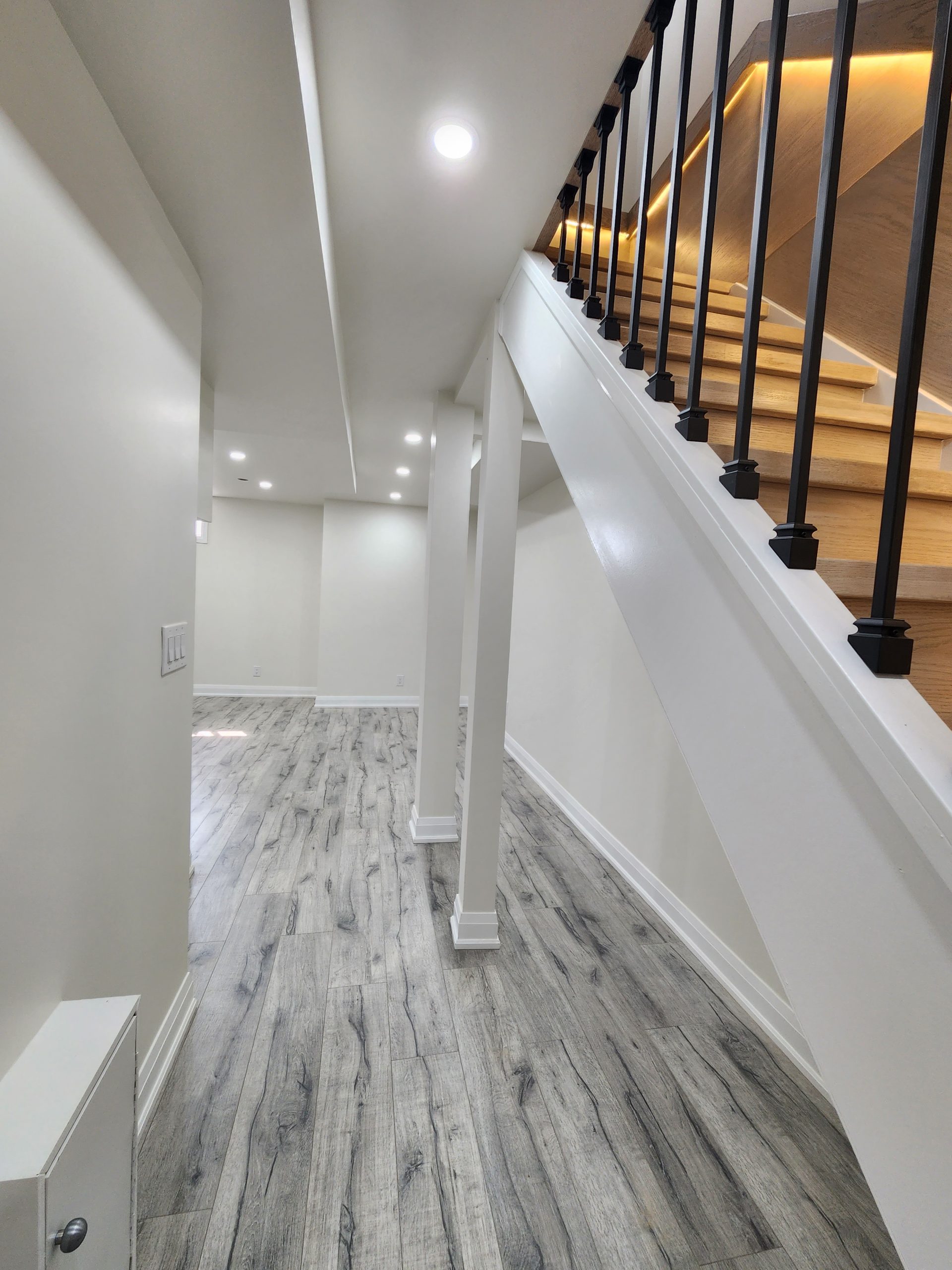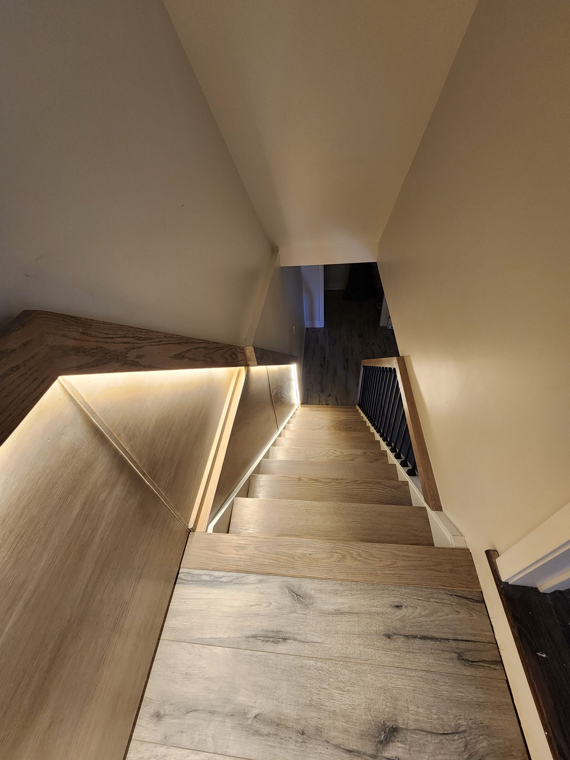 This renovation transformed an unfinished basement into a clean, modern, and fully functional living space—featuring one of our signature custom LED staircases.