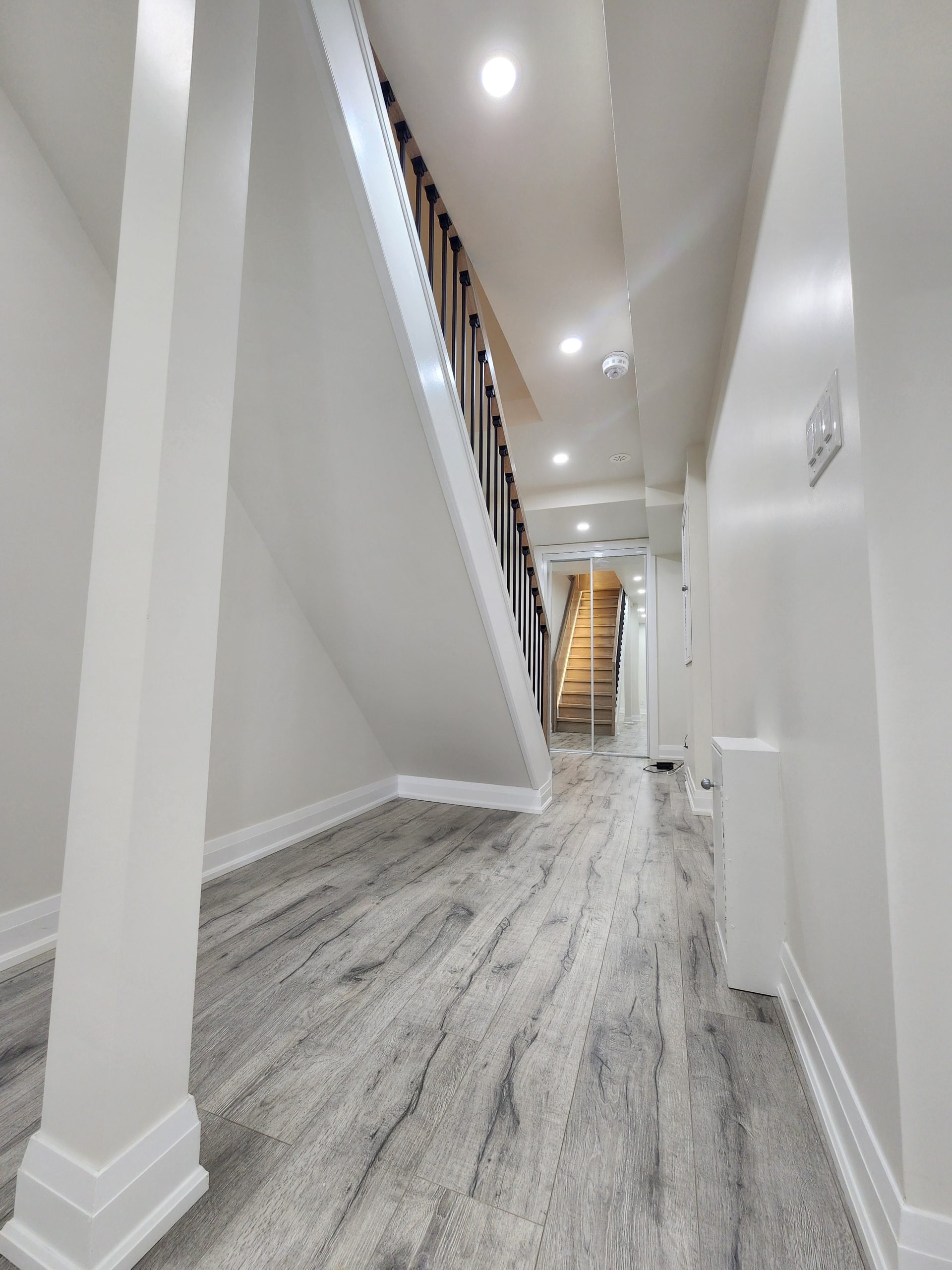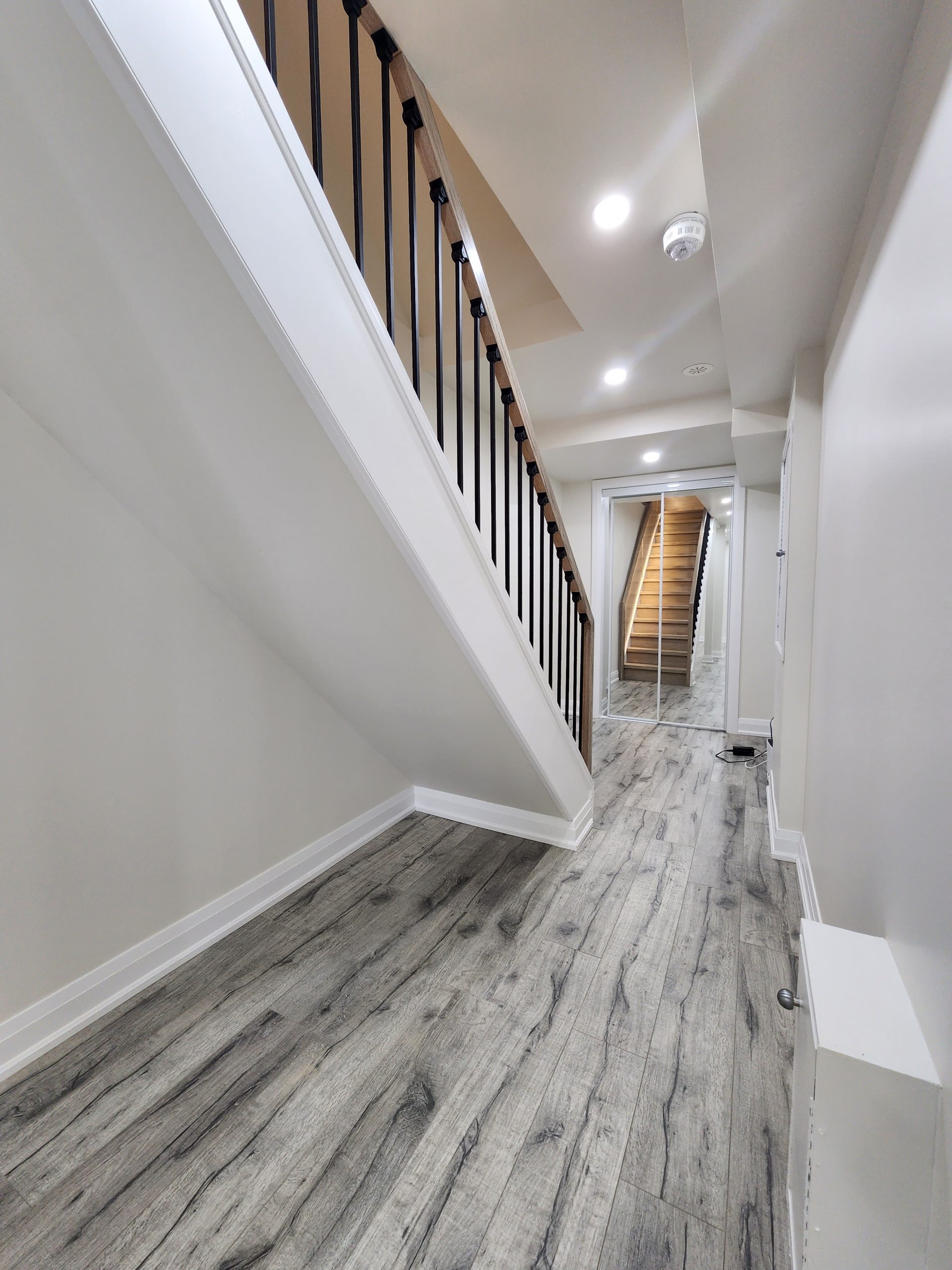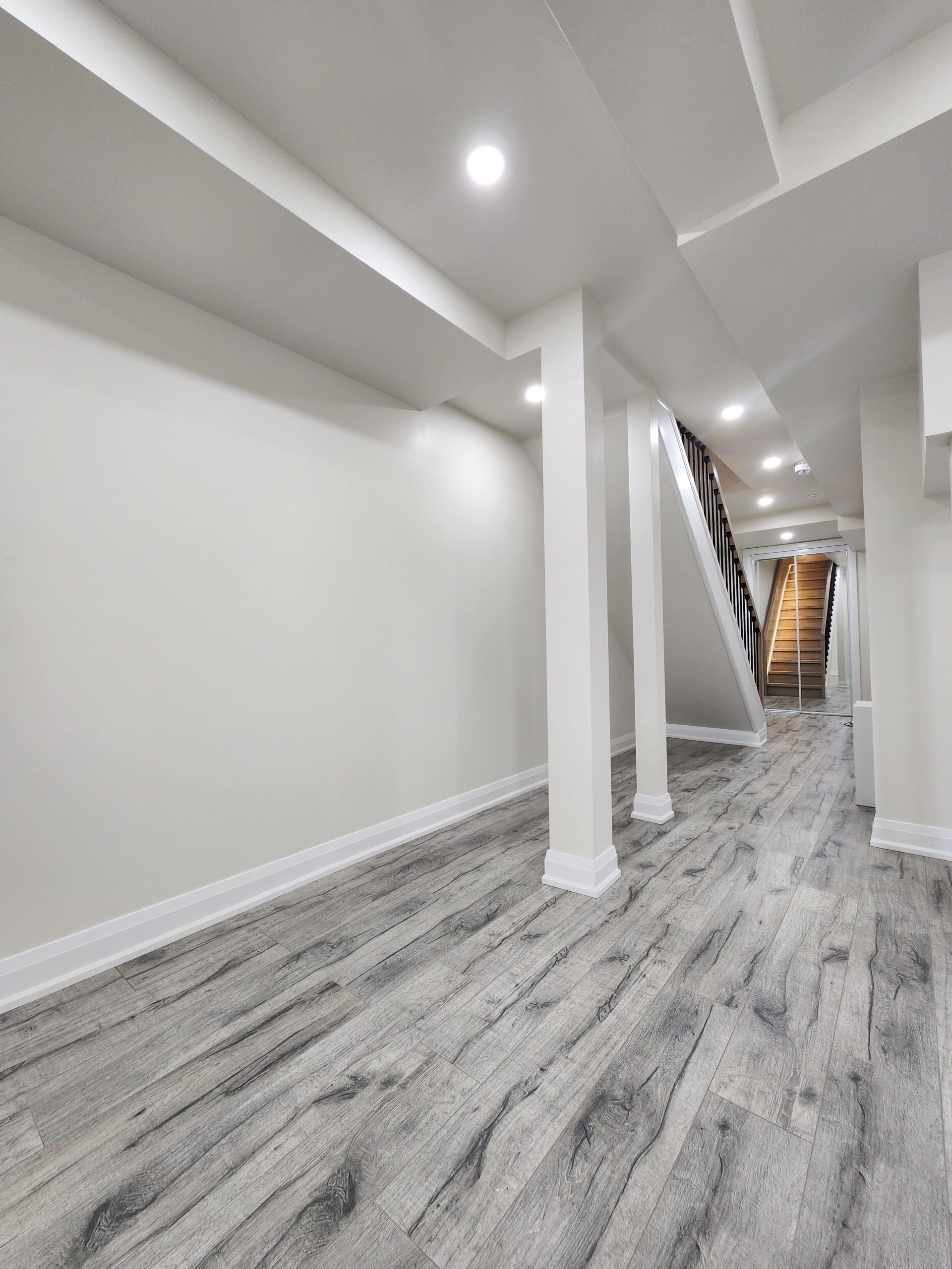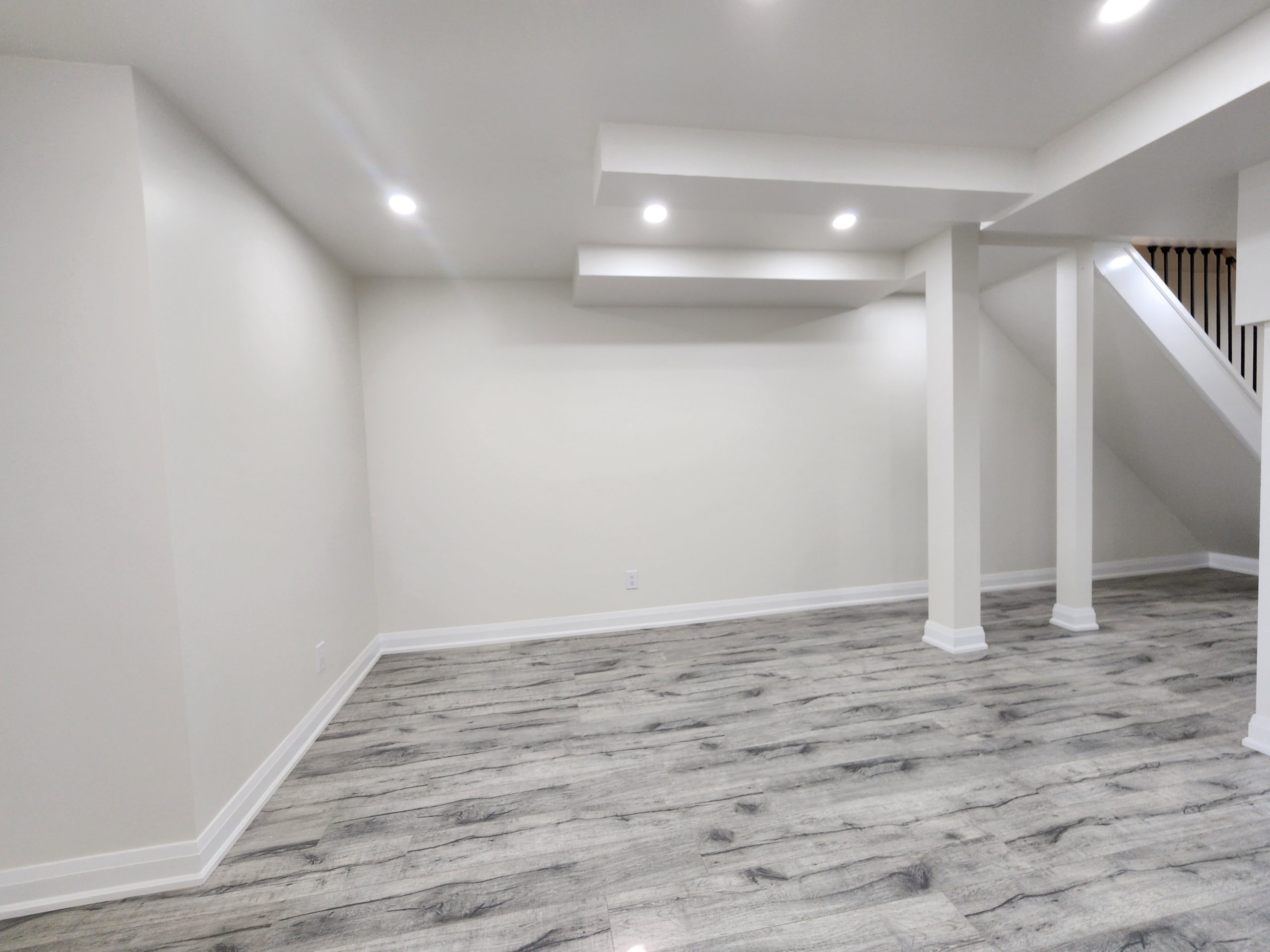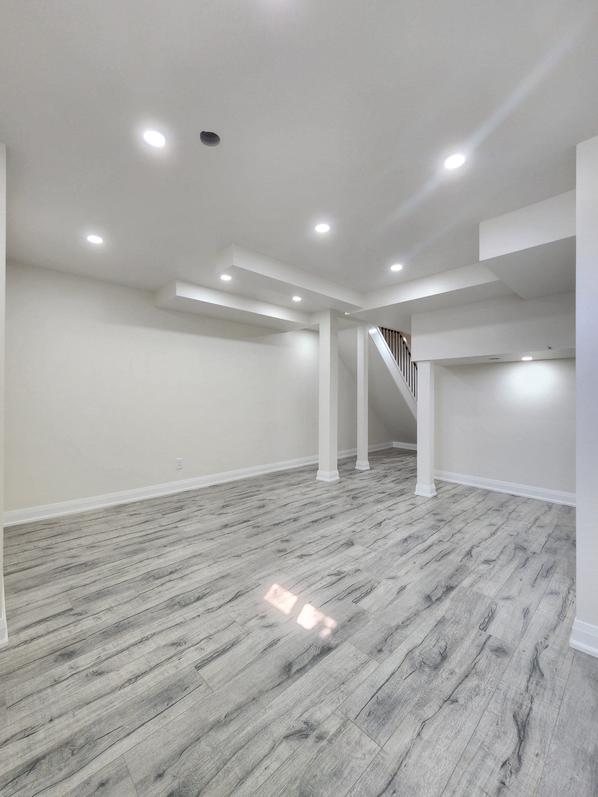 This renovation transformed an unfinished basement into a clean, modern, and fully functional living space—featuring one of our signature custom LED staircases.