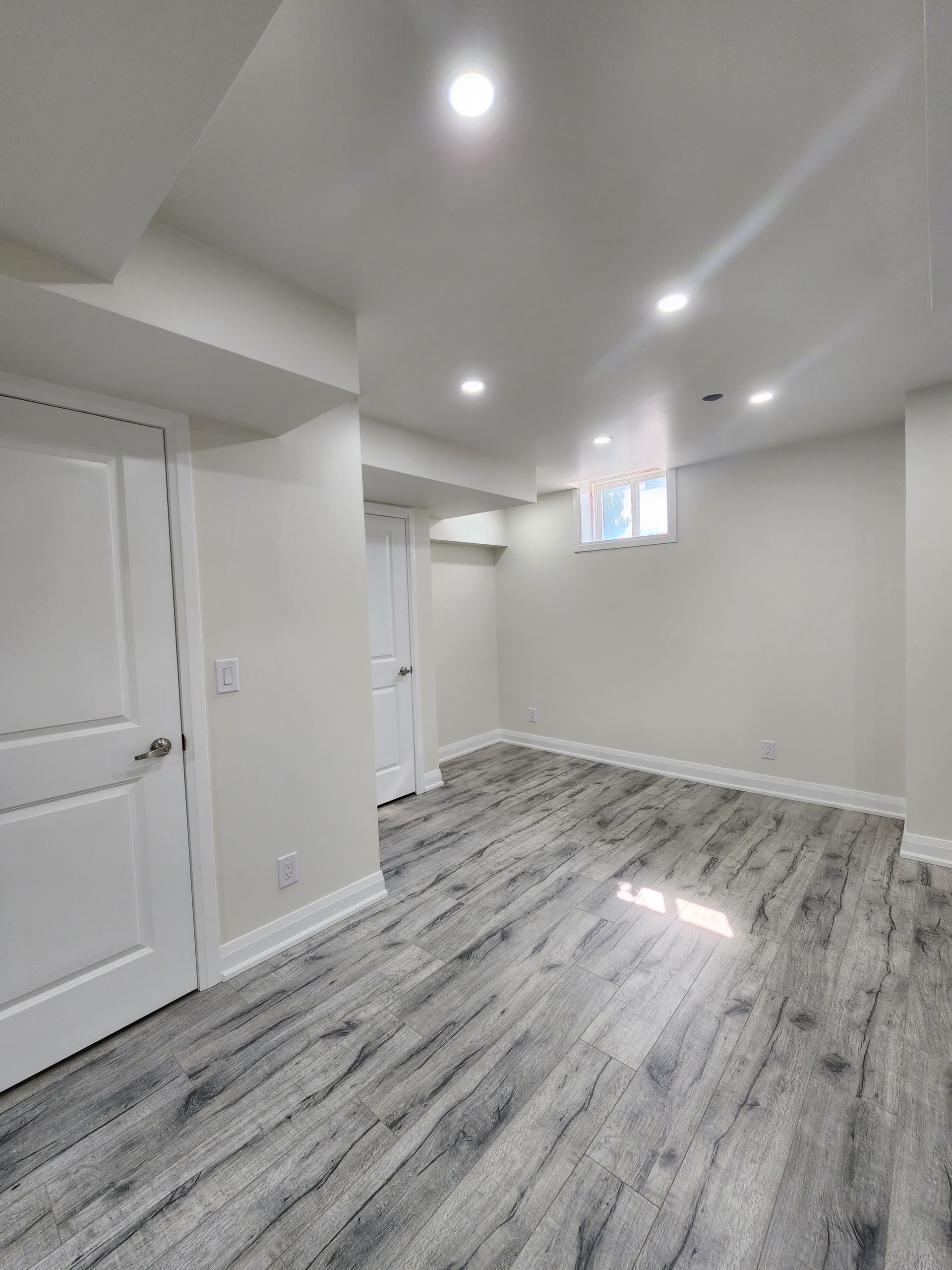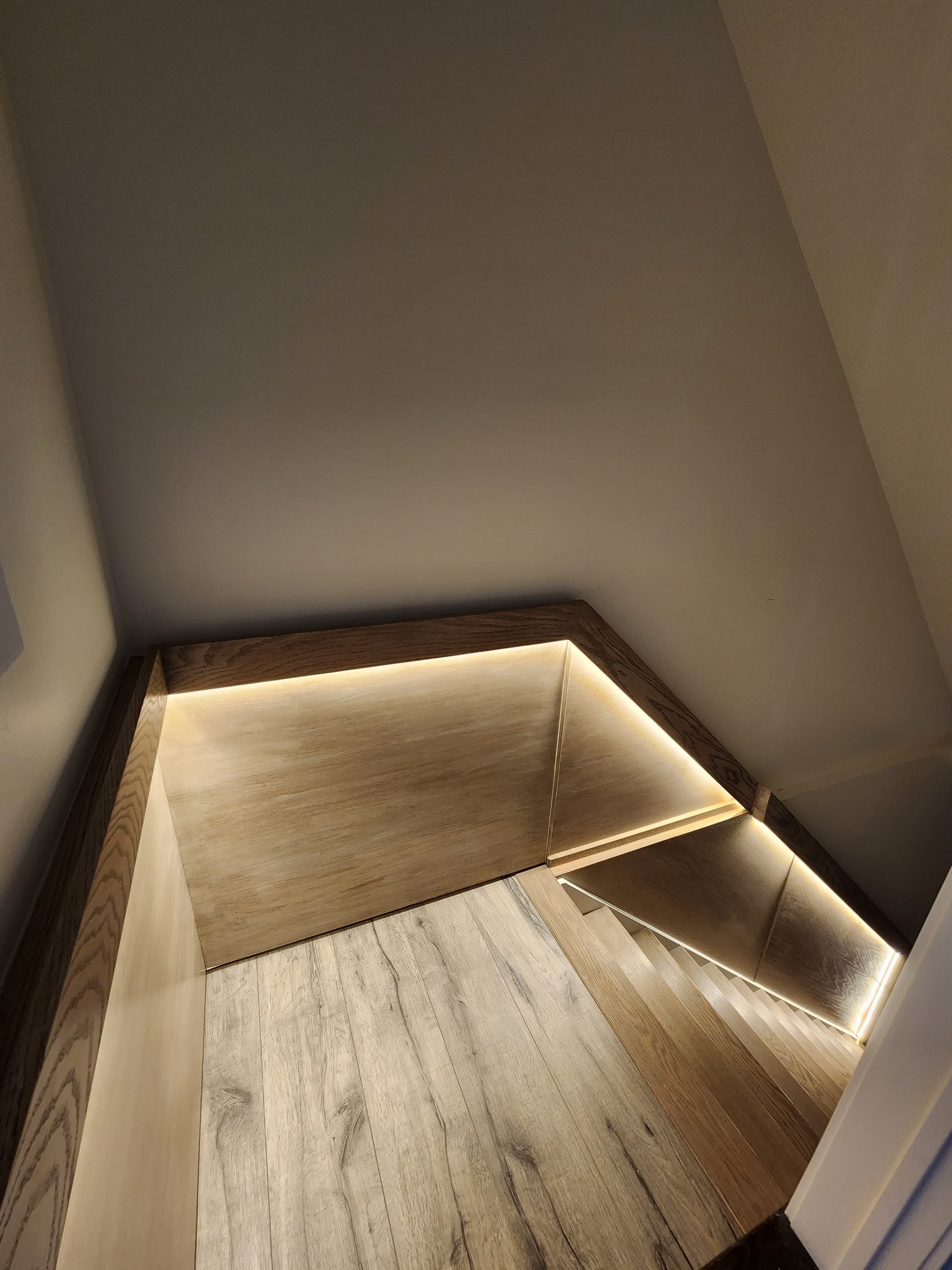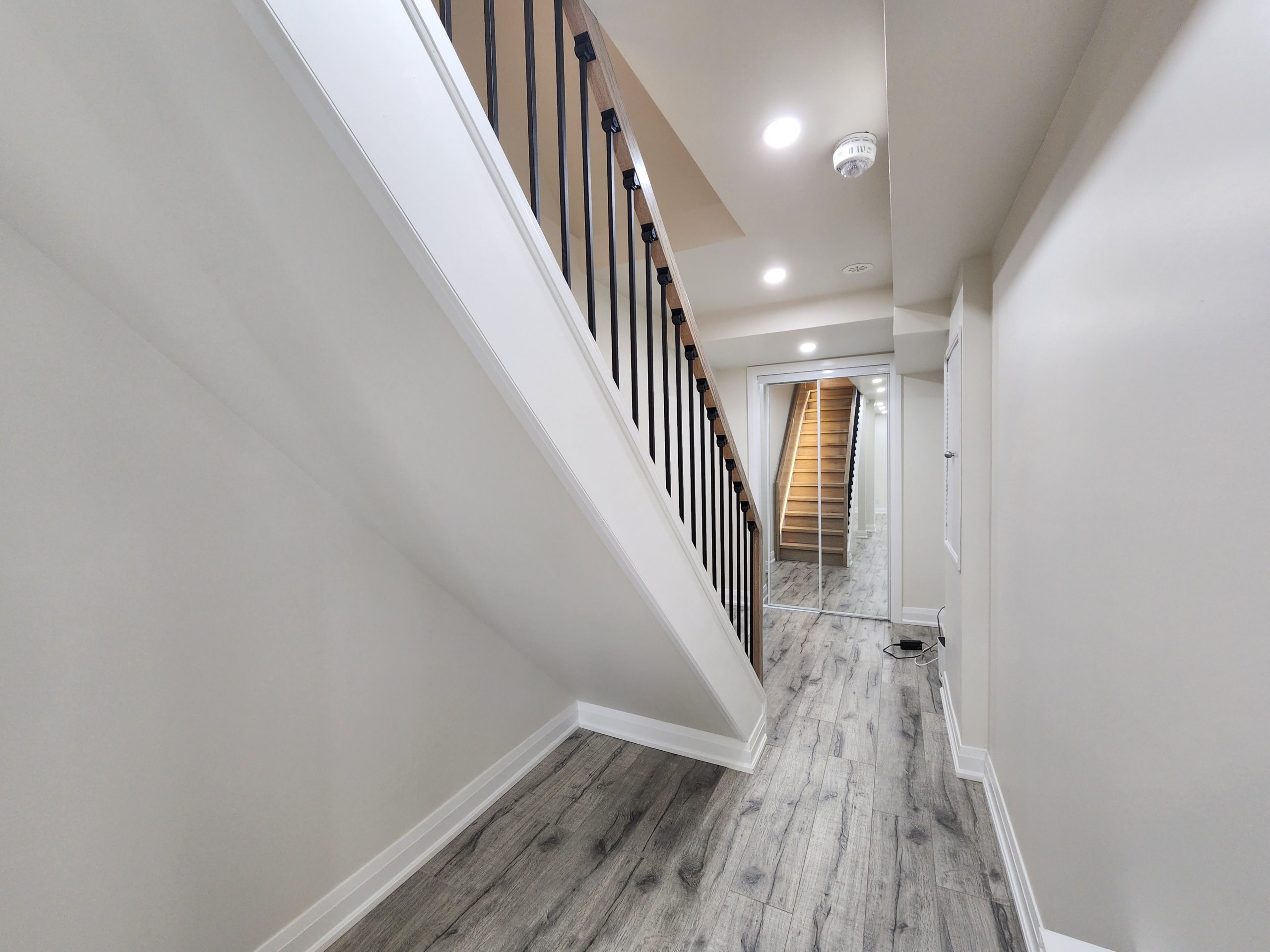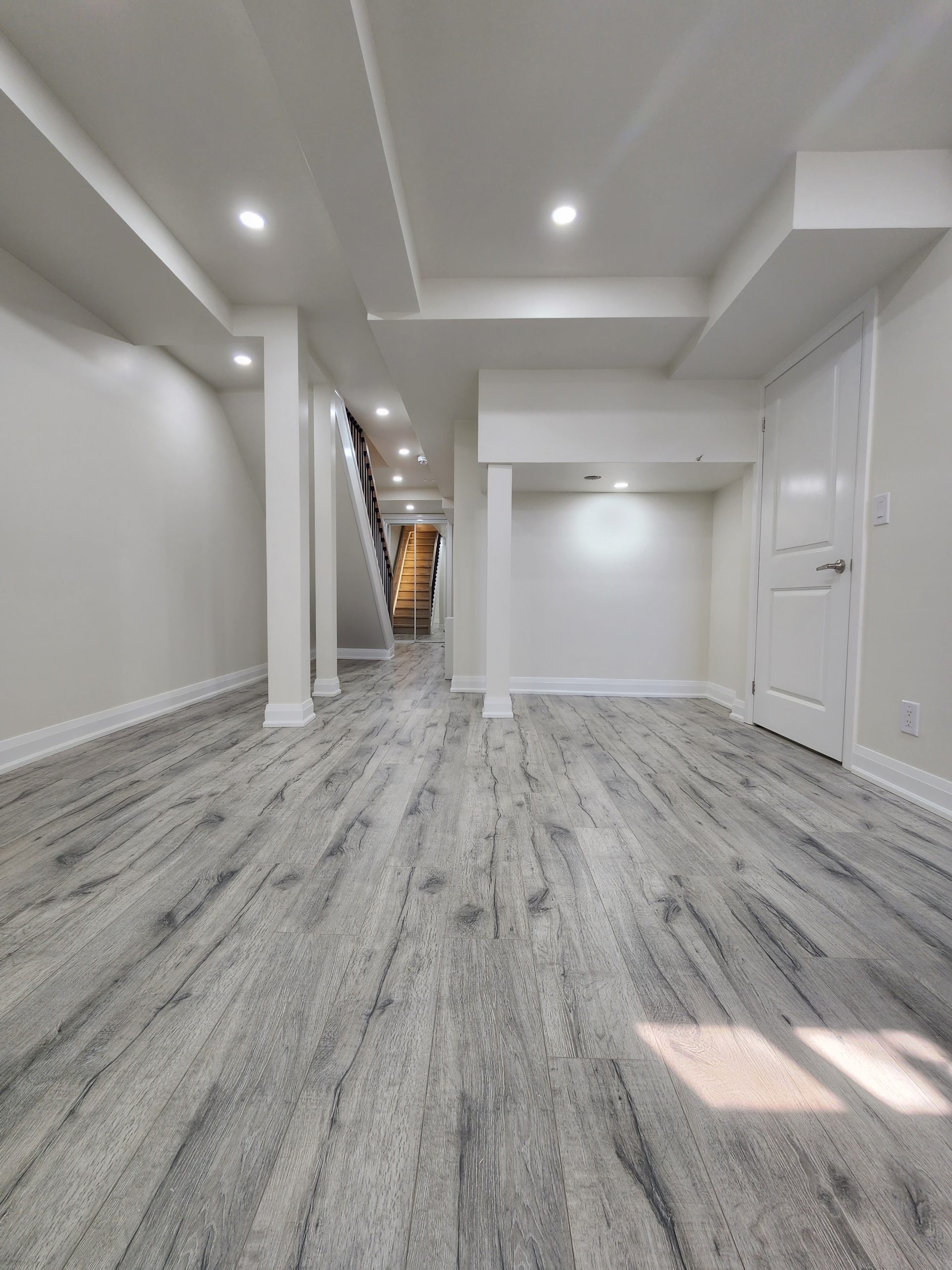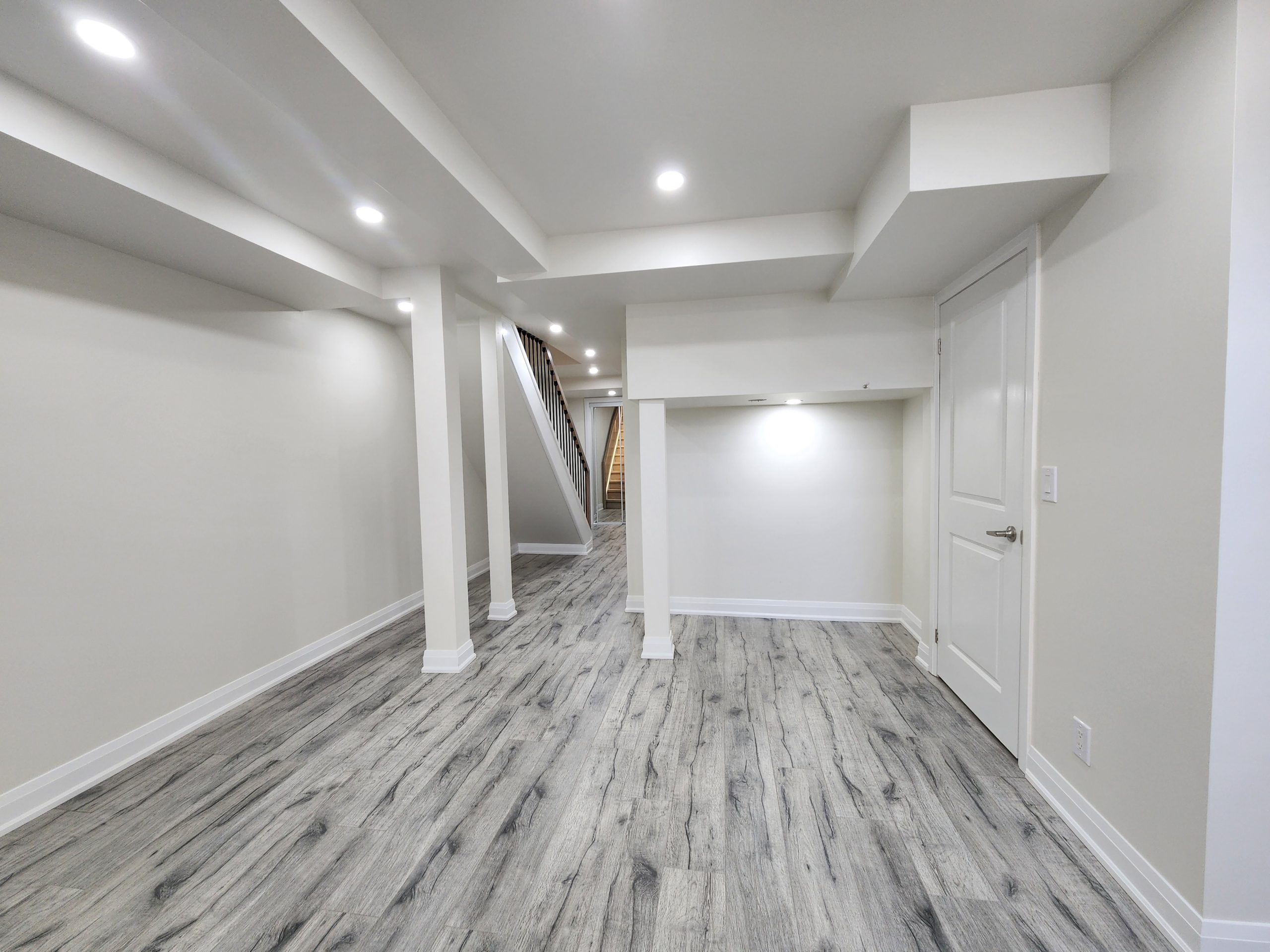 This renovation transformed an unfinished basement into a clean, modern, and fully functional living space—featuring one of our signature custom LED staircases.