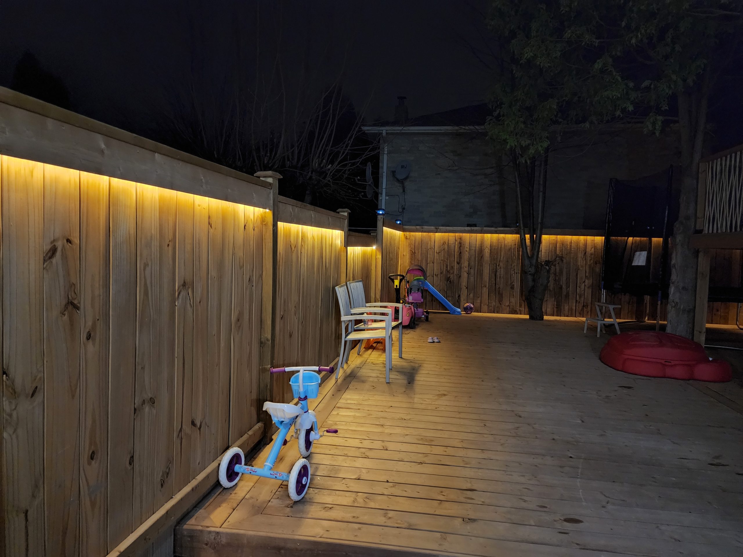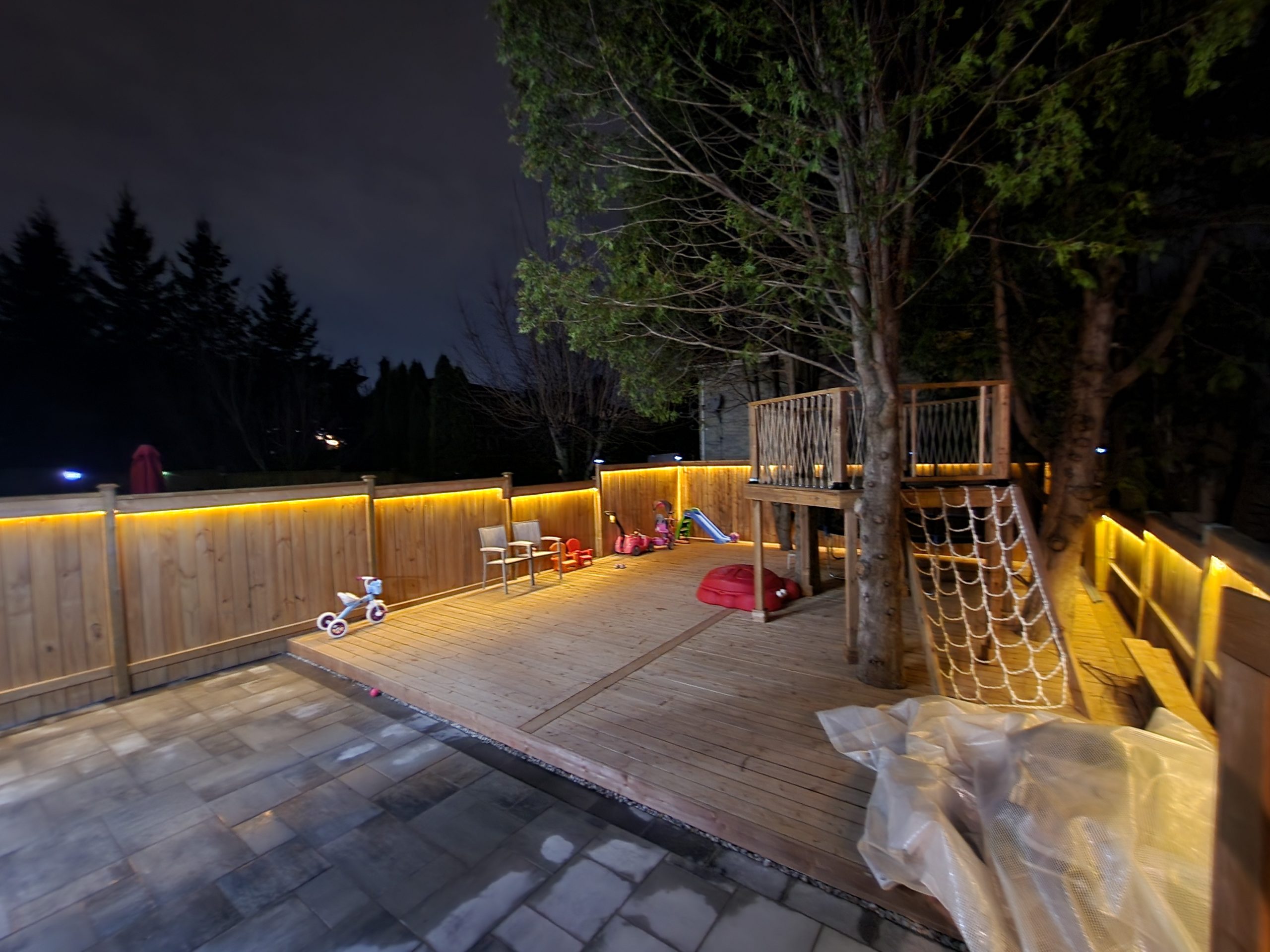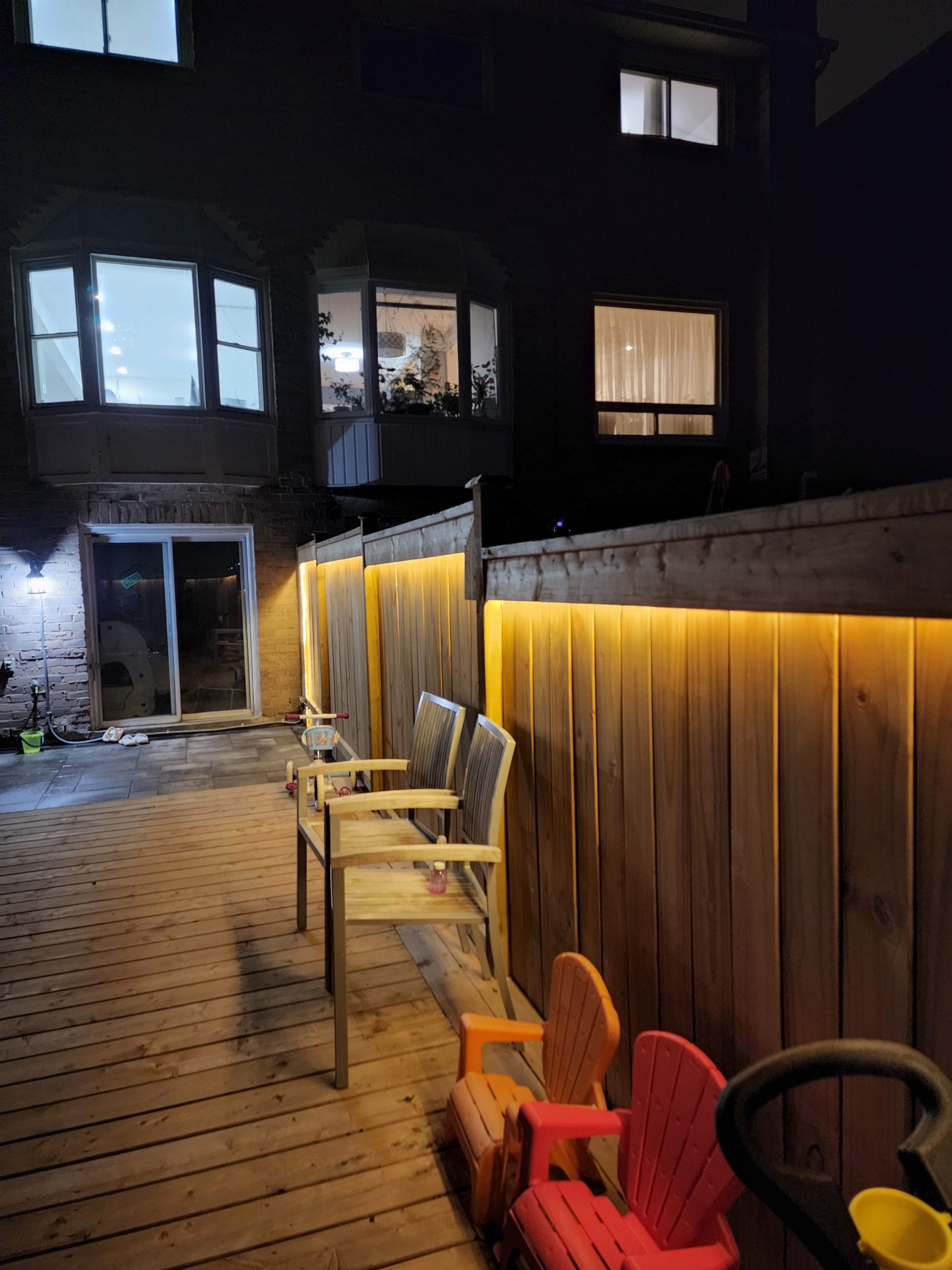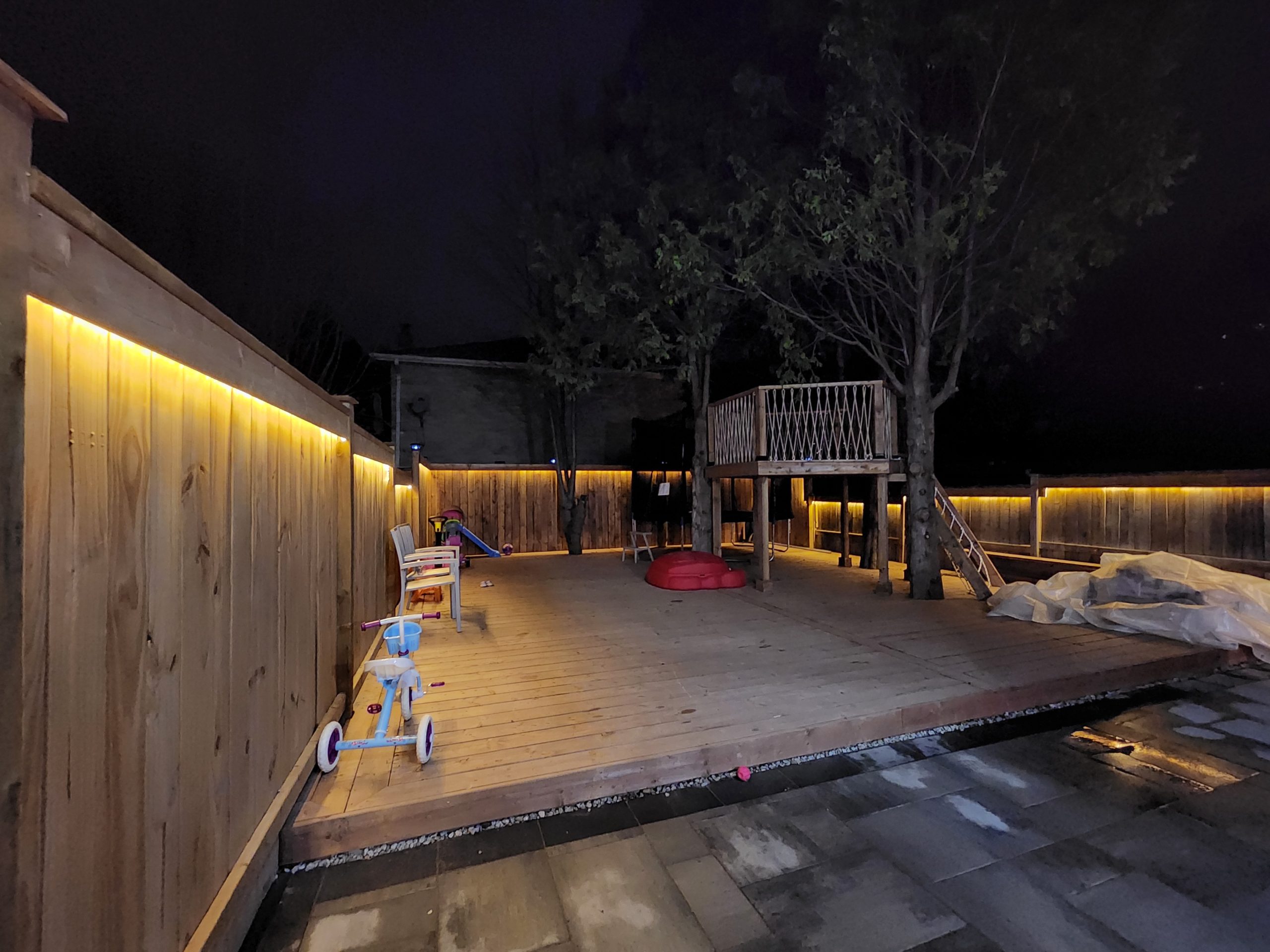 To enhance nighttime usability and create an inviting atmosphere, warm LED strip lighting was installed along the entire perimeter fence—providing ambient glow without visible fixtures.