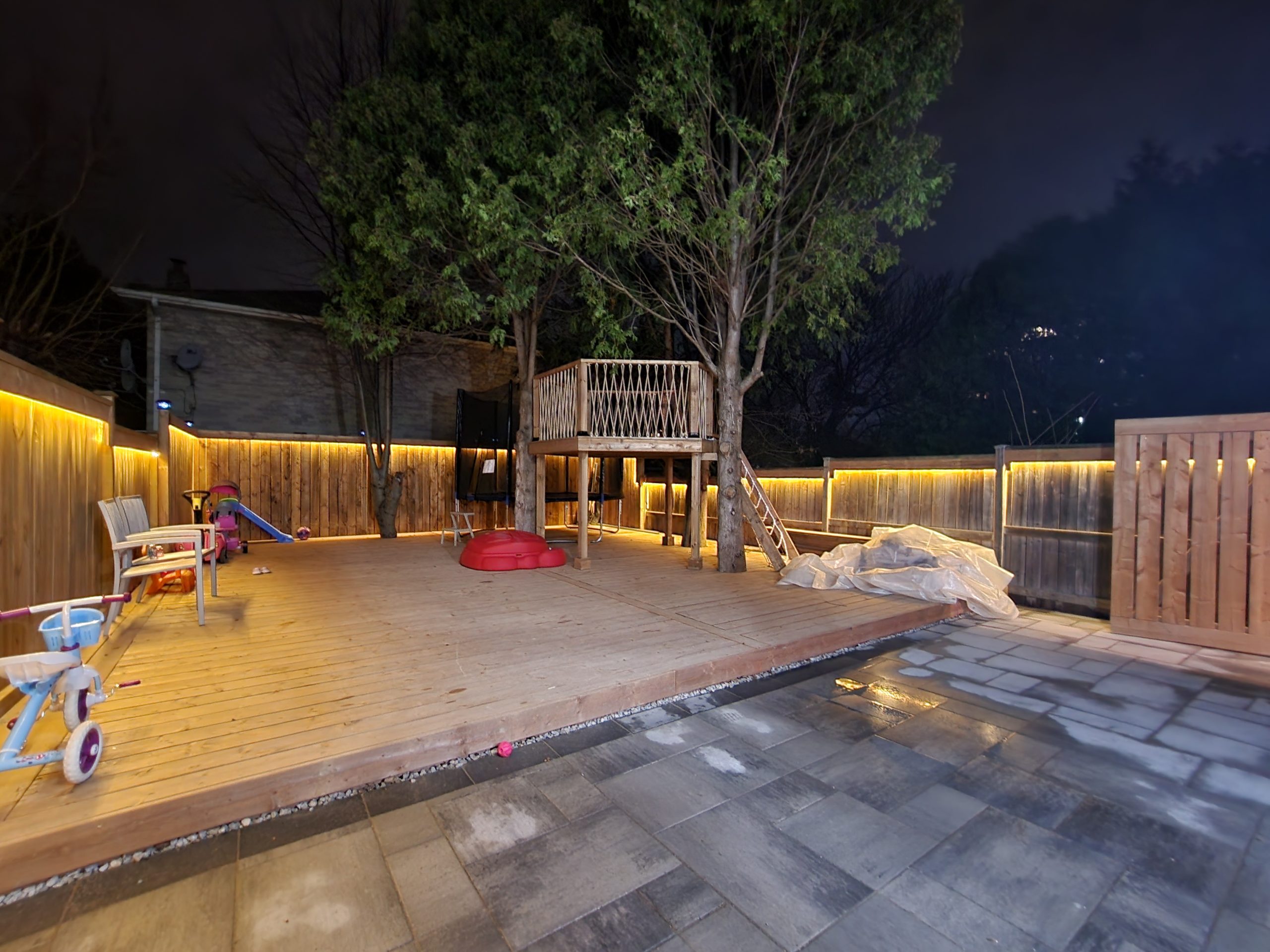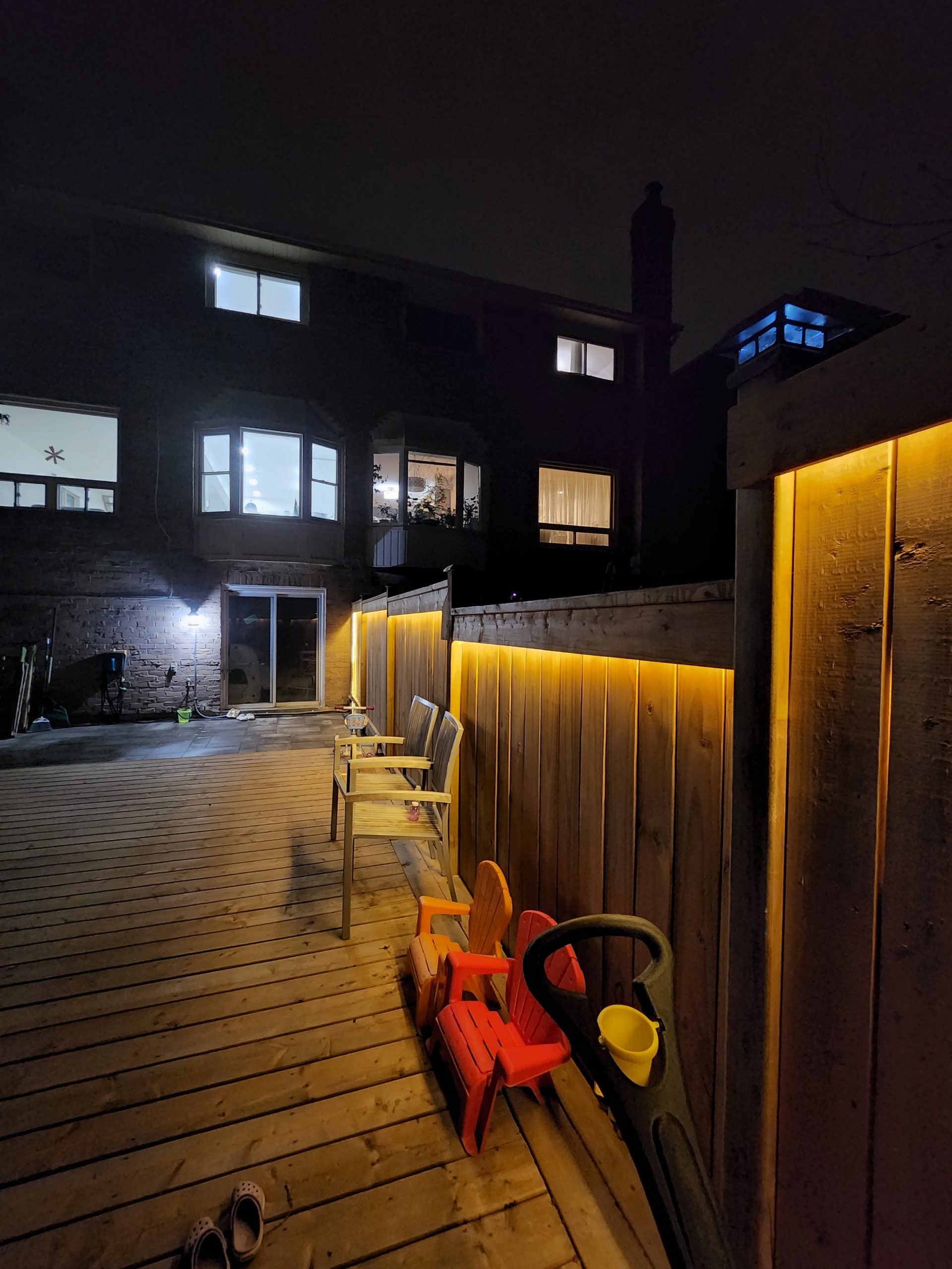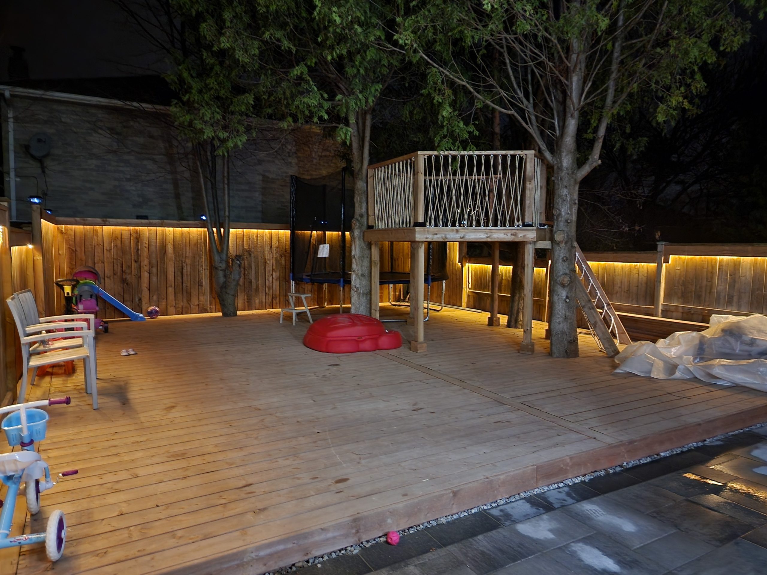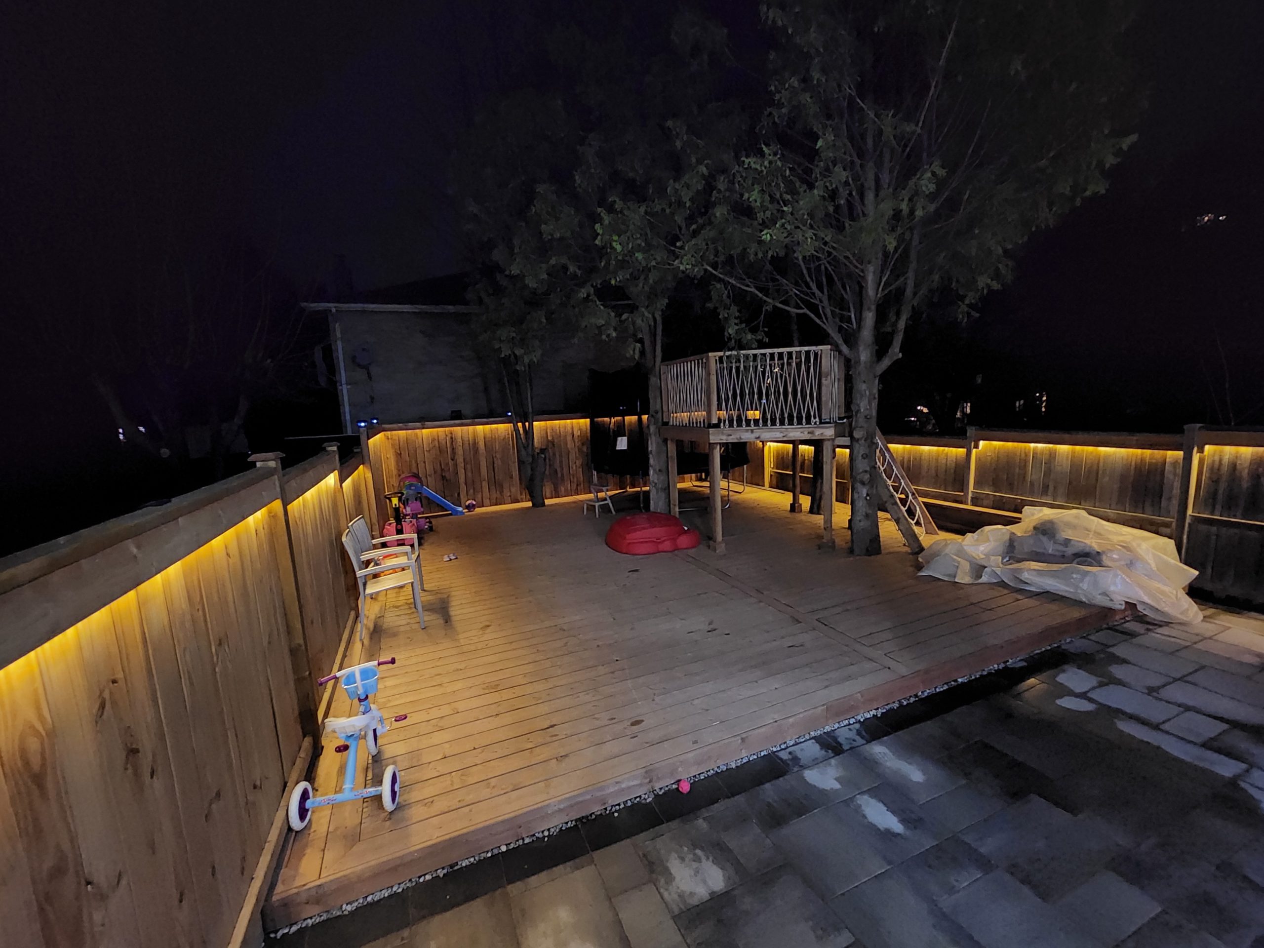To enhance nighttime usability and create an inviting atmosphere, warm LED strip lighting was installed along the entire perimeter fence—providing ambient glow without visible fixtures.
