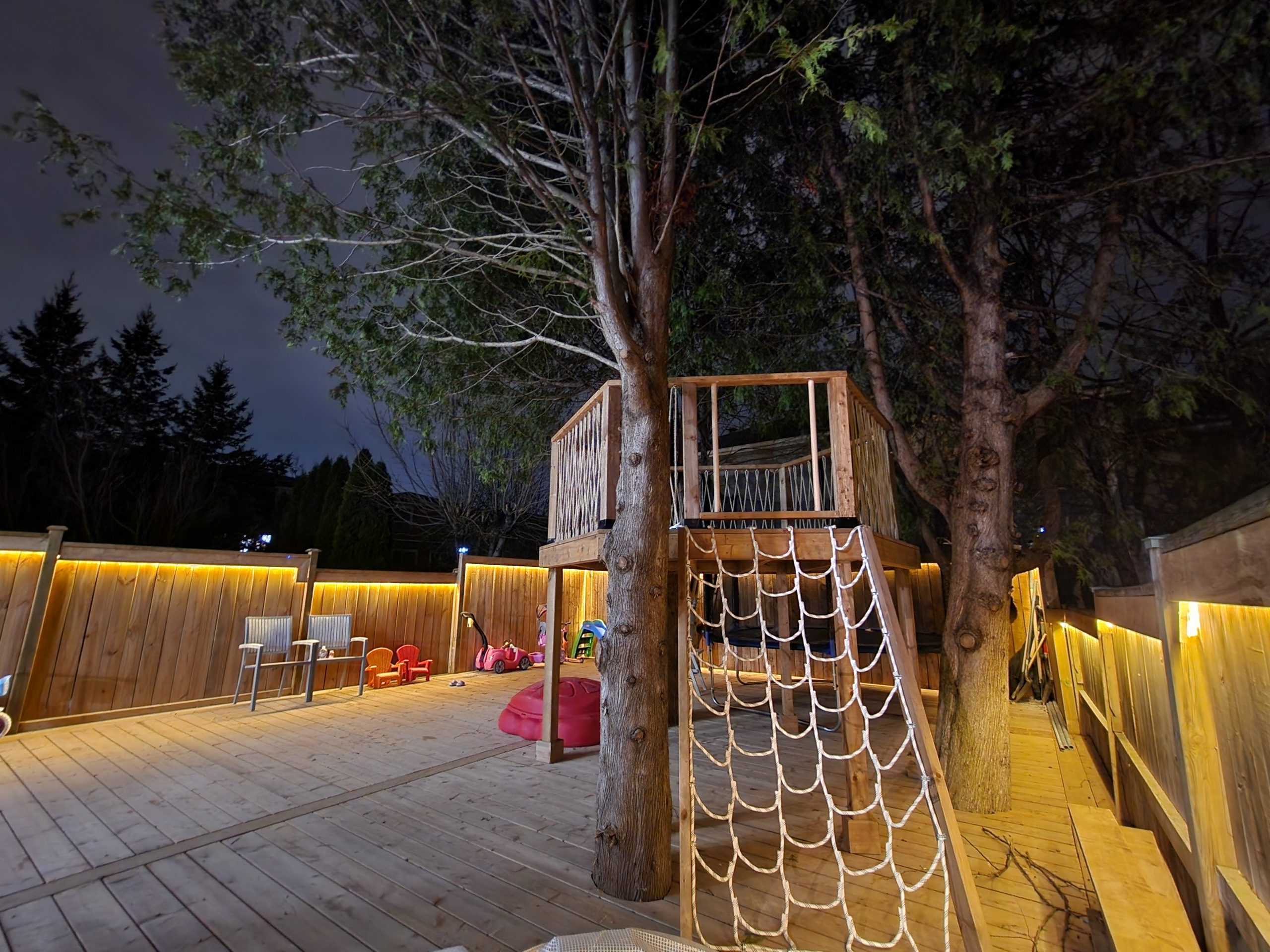 The renovation began by removing the existing turf and leveling the site to prepare for new construction. A custom-designed pressure-treated deck was built from the ground up, incorporating natural trees directly into the design. The centerpiece of the space is an elevated play structure built around mature trees, featuring a secure railing system, climbing net, and safe access points for children.