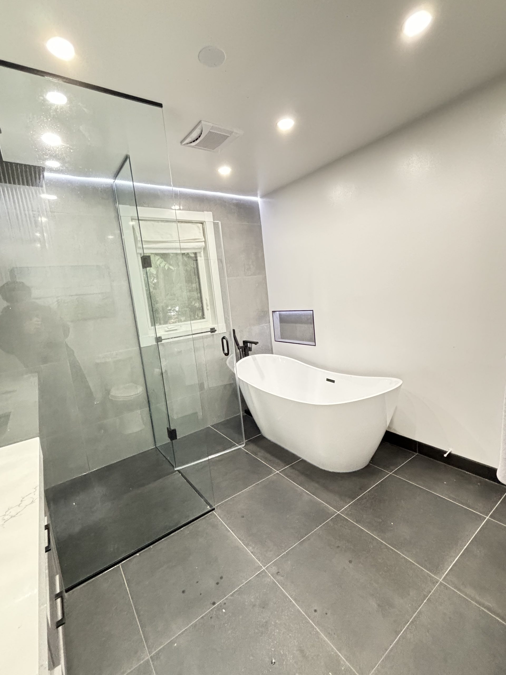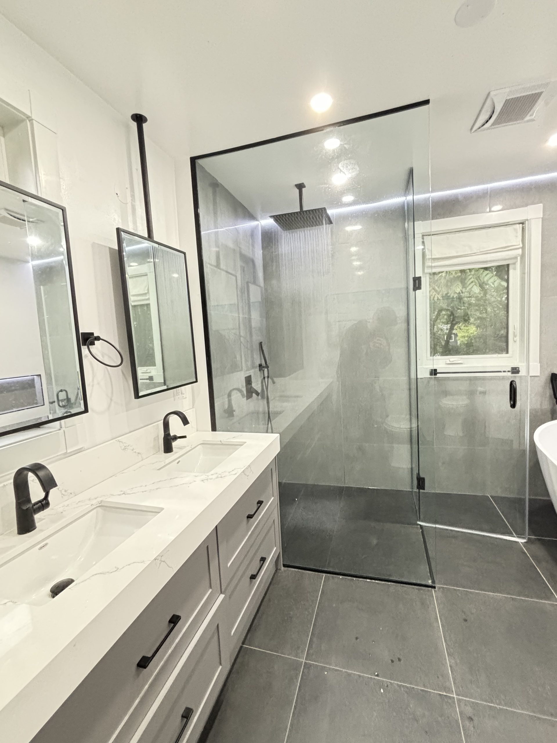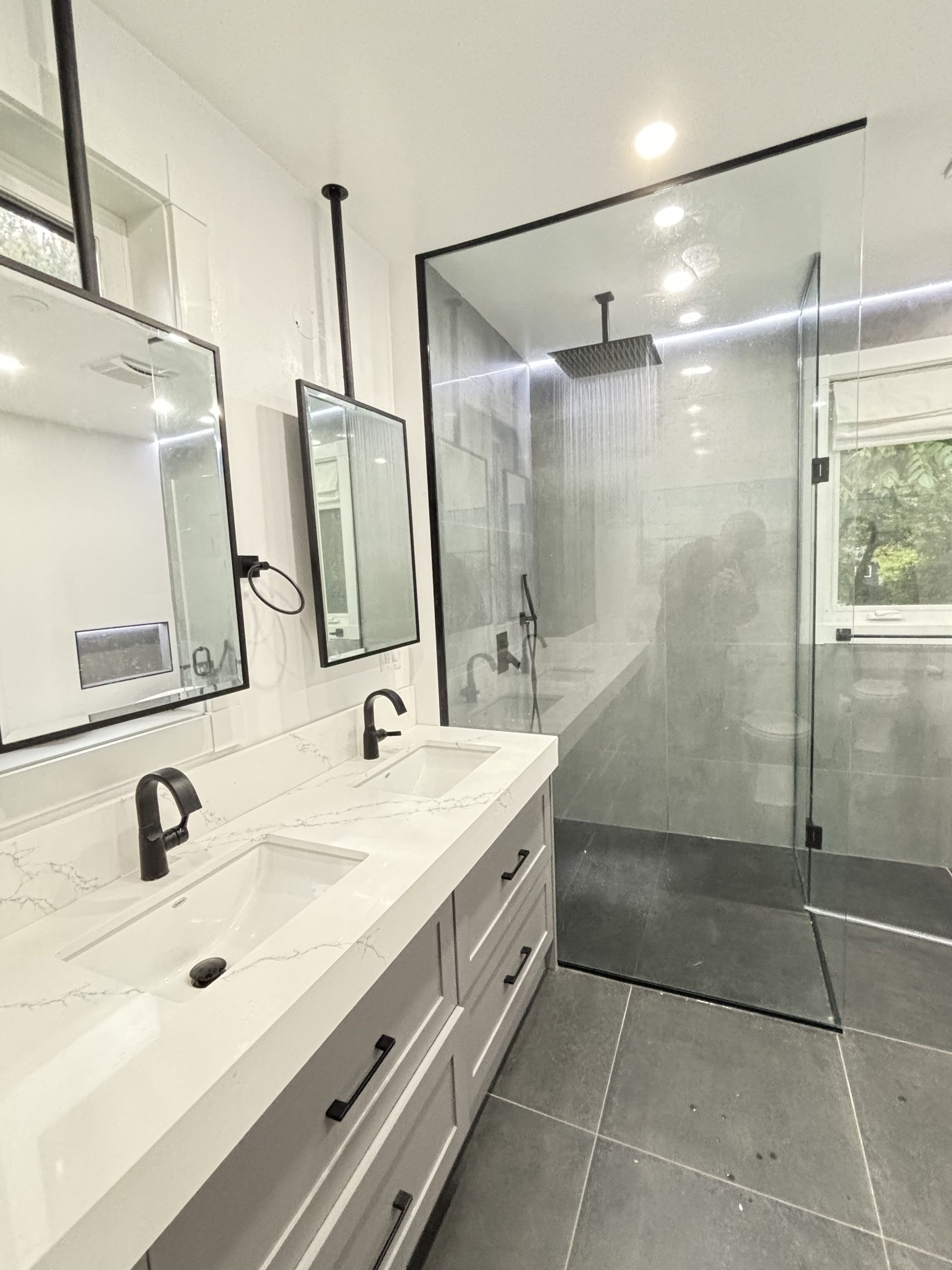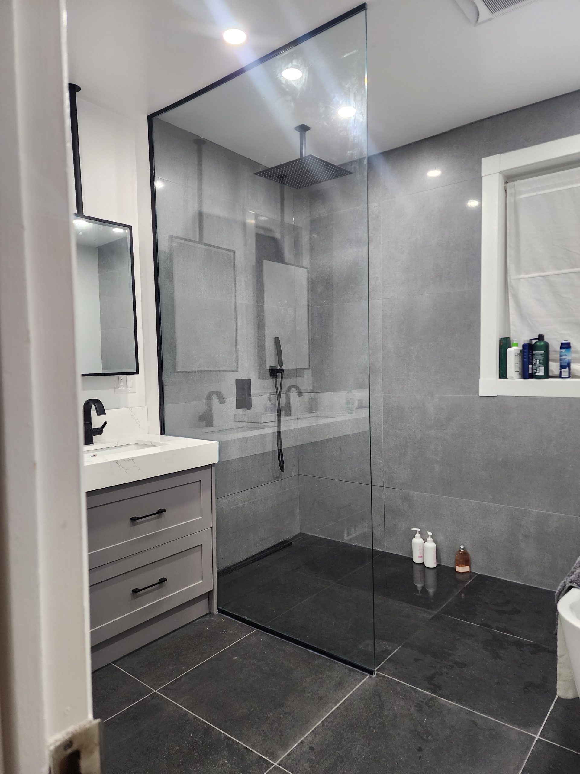 This project delivered a high-end, contemporary bathroom renovation featuring a dramatic contrast between sleek marble-look tile and bold matte black elements. The custom walk-in shower is lined with large-format white marble-look porcelain tile that runs seamlessly up the walls and features a long, custom niche for storage. The shower entrance is enclosed by a frameless glass panel secured with minimalist black hardware. The floor outside the shower and the vanity splash area were finished with complementary large-format tile. A floating wood vanity was installed beneath a simple, clean mirror, and the final look was tied together with a matte black faucet and coordinating accessories.