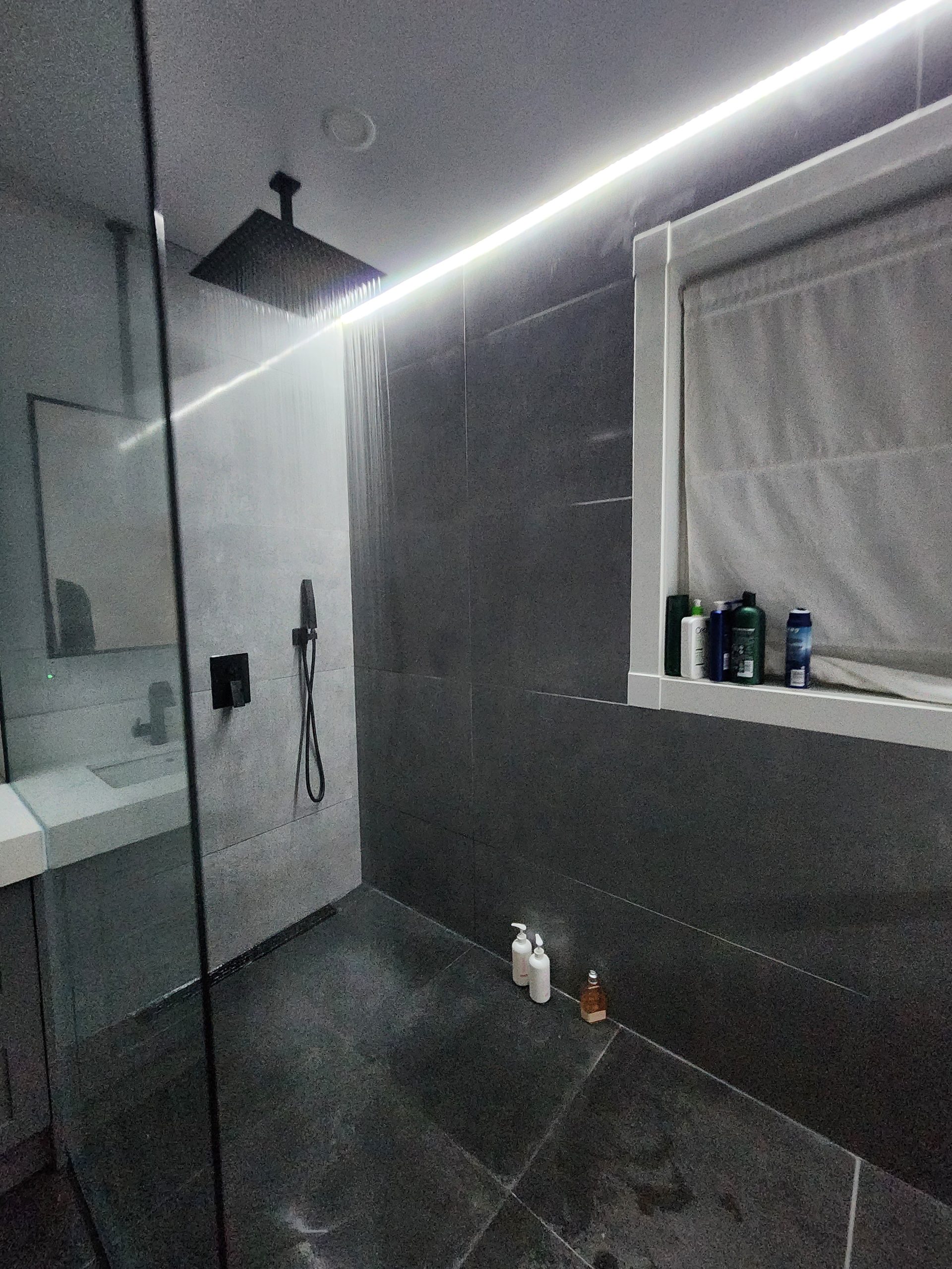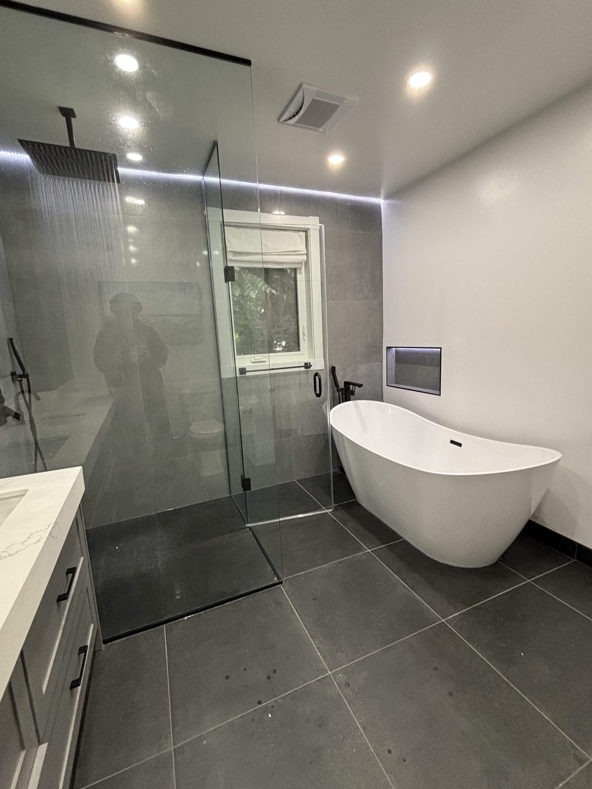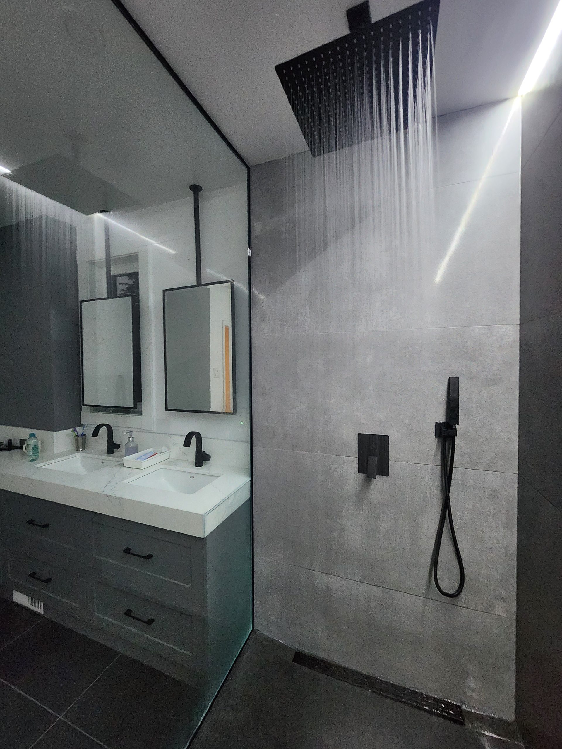 This project delivered a high-end, contemporary bathroom renovation featuring a dramatic contrast between sleek marble-look tile and bold matte black elements. The custom walk-in shower is lined with large-format white marble-look porcelain tile that runs seamlessly up the walls and features a long, custom niche for storage. The shower entrance is enclosed by a frameless glass panel secured with minimalist black hardware. The floor outside the shower and the vanity splash area were finished with complementary large-format tile. A floating wood vanity was installed beneath a simple, clean mirror, and the final look was tied together with a matte black faucet and coordinating accessories.