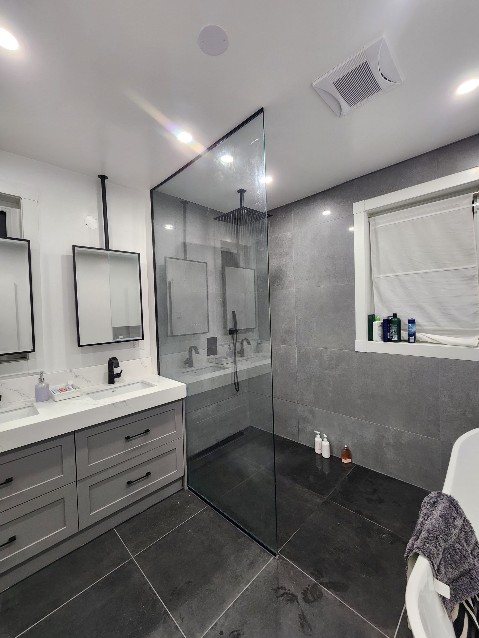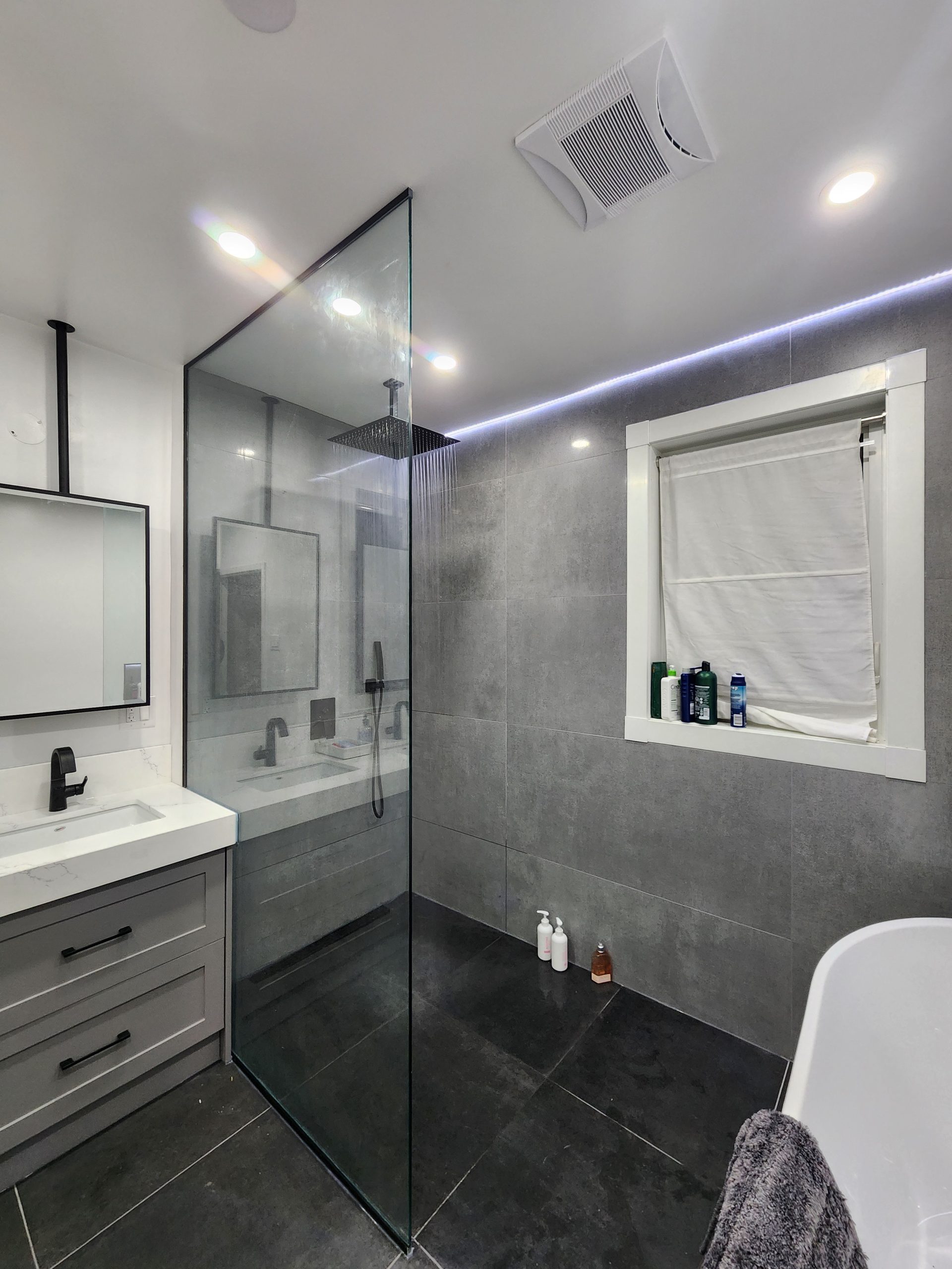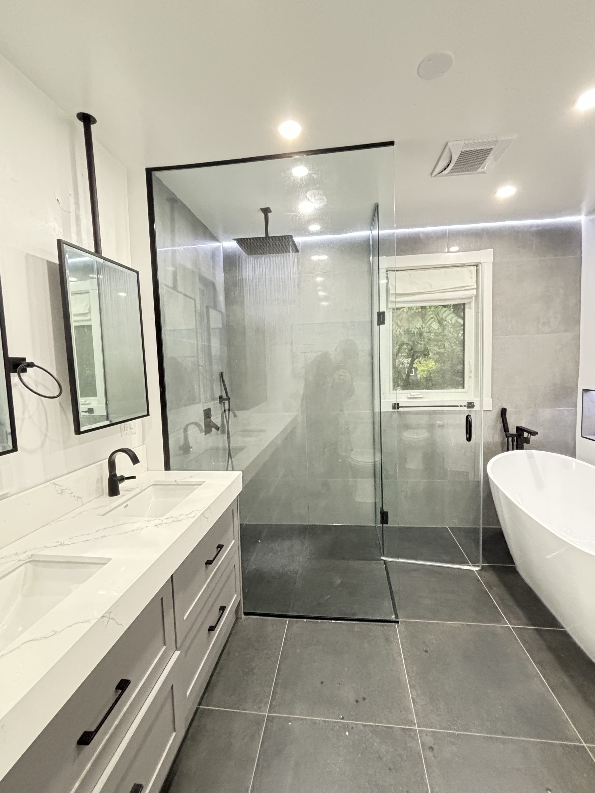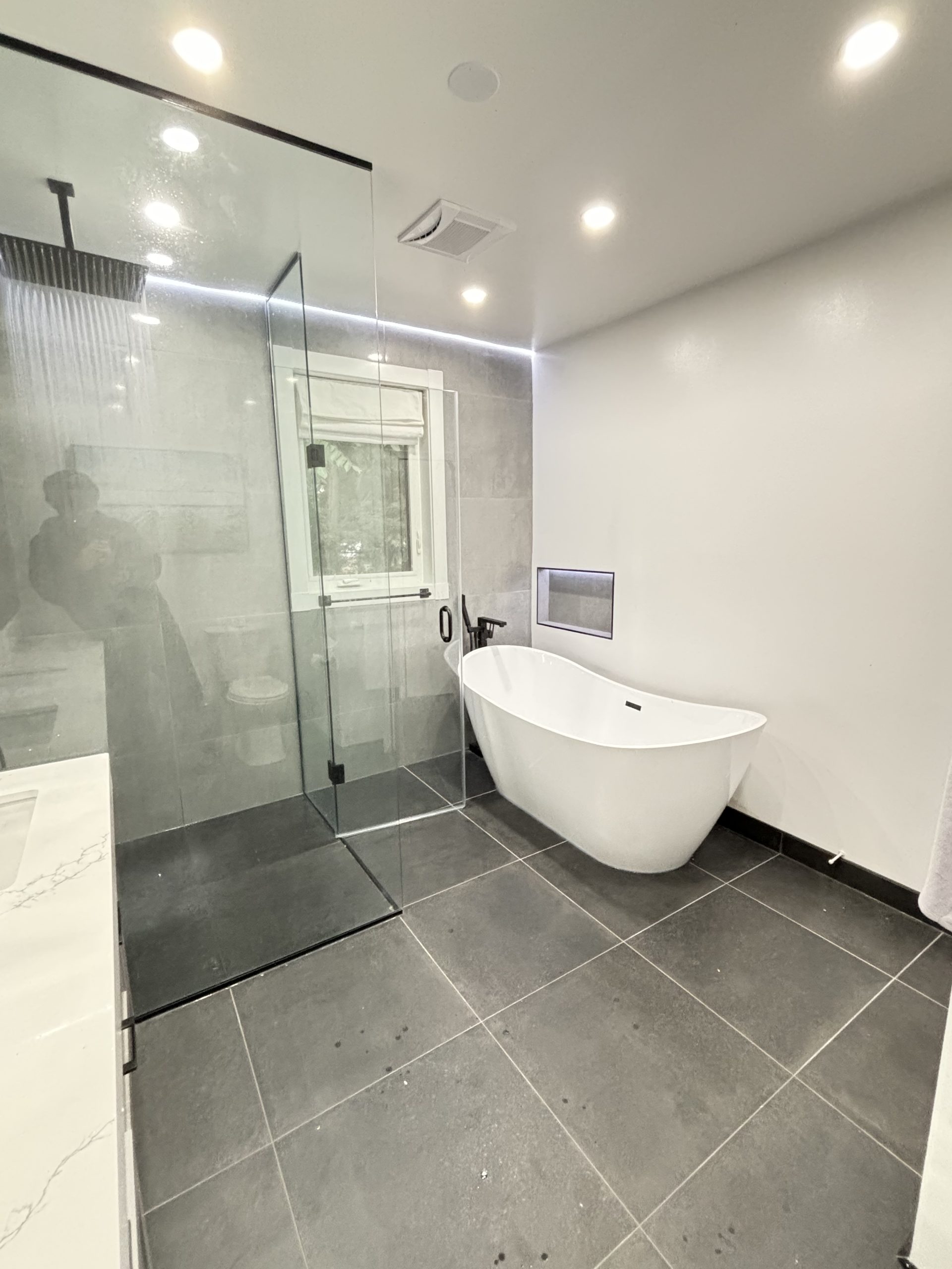 This project delivered a high-end, contemporary bathroom renovation featuring a dramatic contrast between sleek marble-look tile and bold matte black elements. The custom walk-in shower is lined with large-format white marble-look porcelain tile that runs seamlessly up the walls and features a long, custom niche for storage. The shower entrance is enclosed by a frameless glass panel secured with minimalist black hardware. The floor outside the shower and the vanity splash area were finished with complementary large-format tile. A floating wood vanity was installed beneath a simple, clean mirror, and the final look was tied together with a matte black faucet and coordinating accessories.