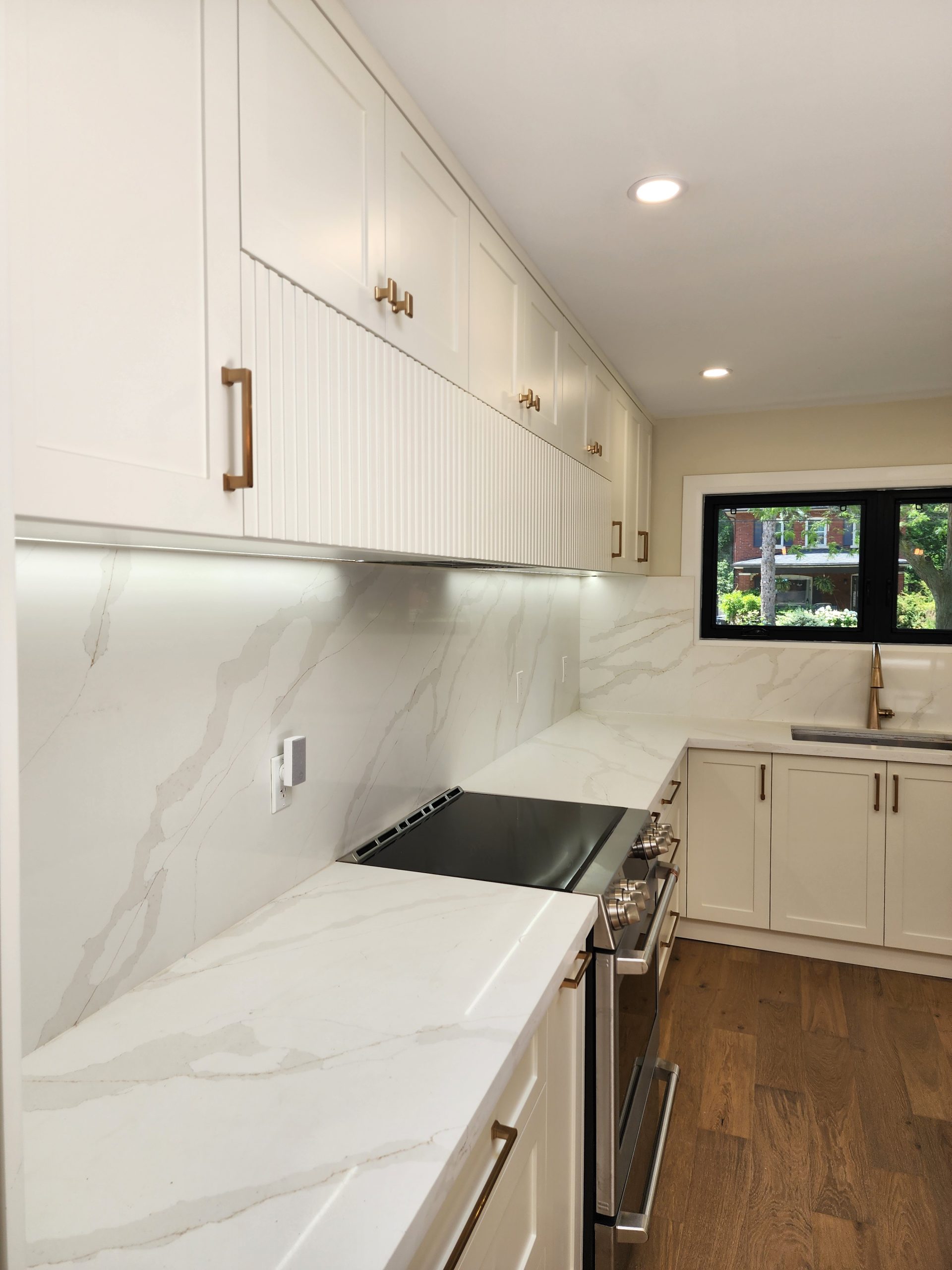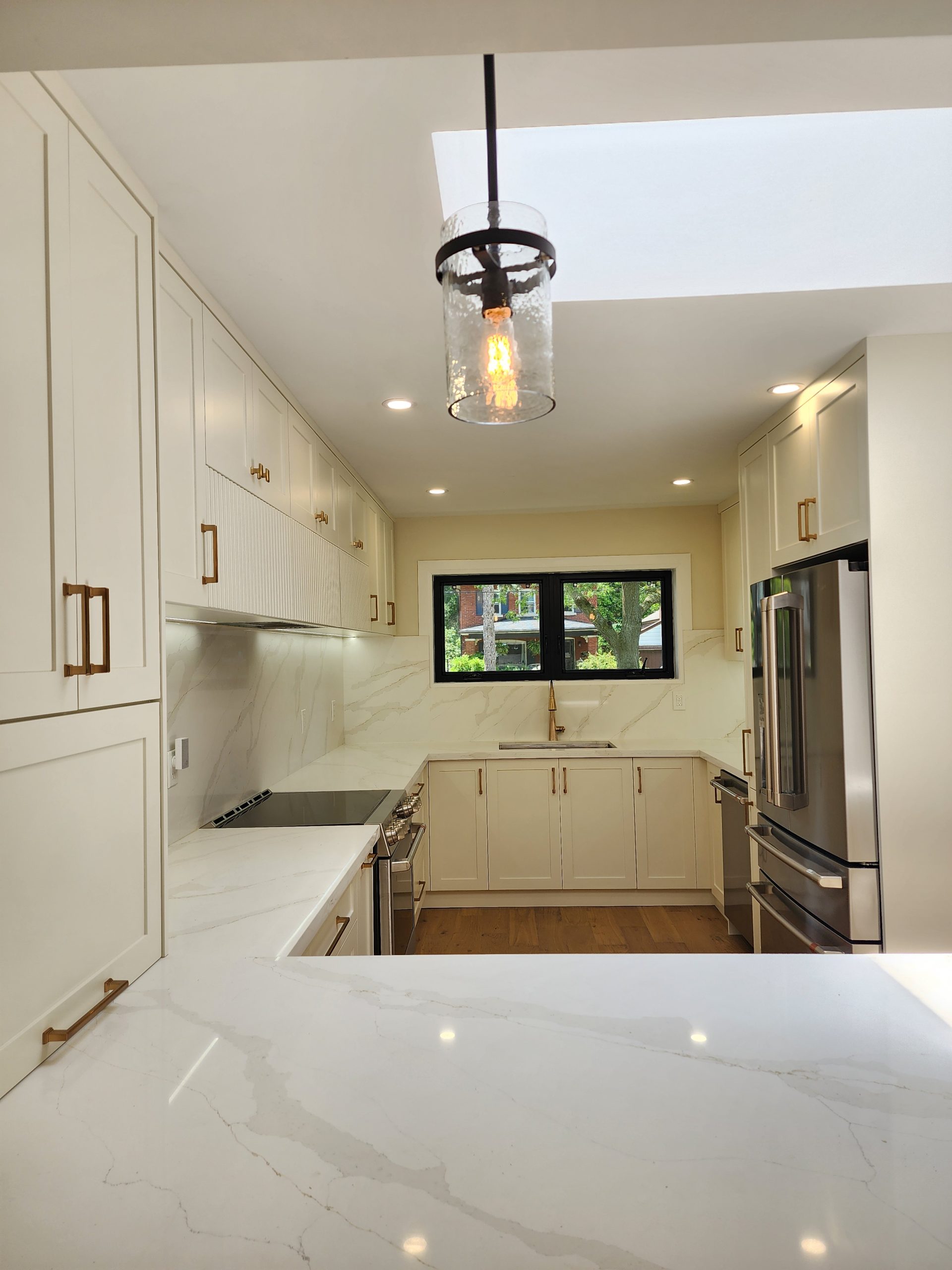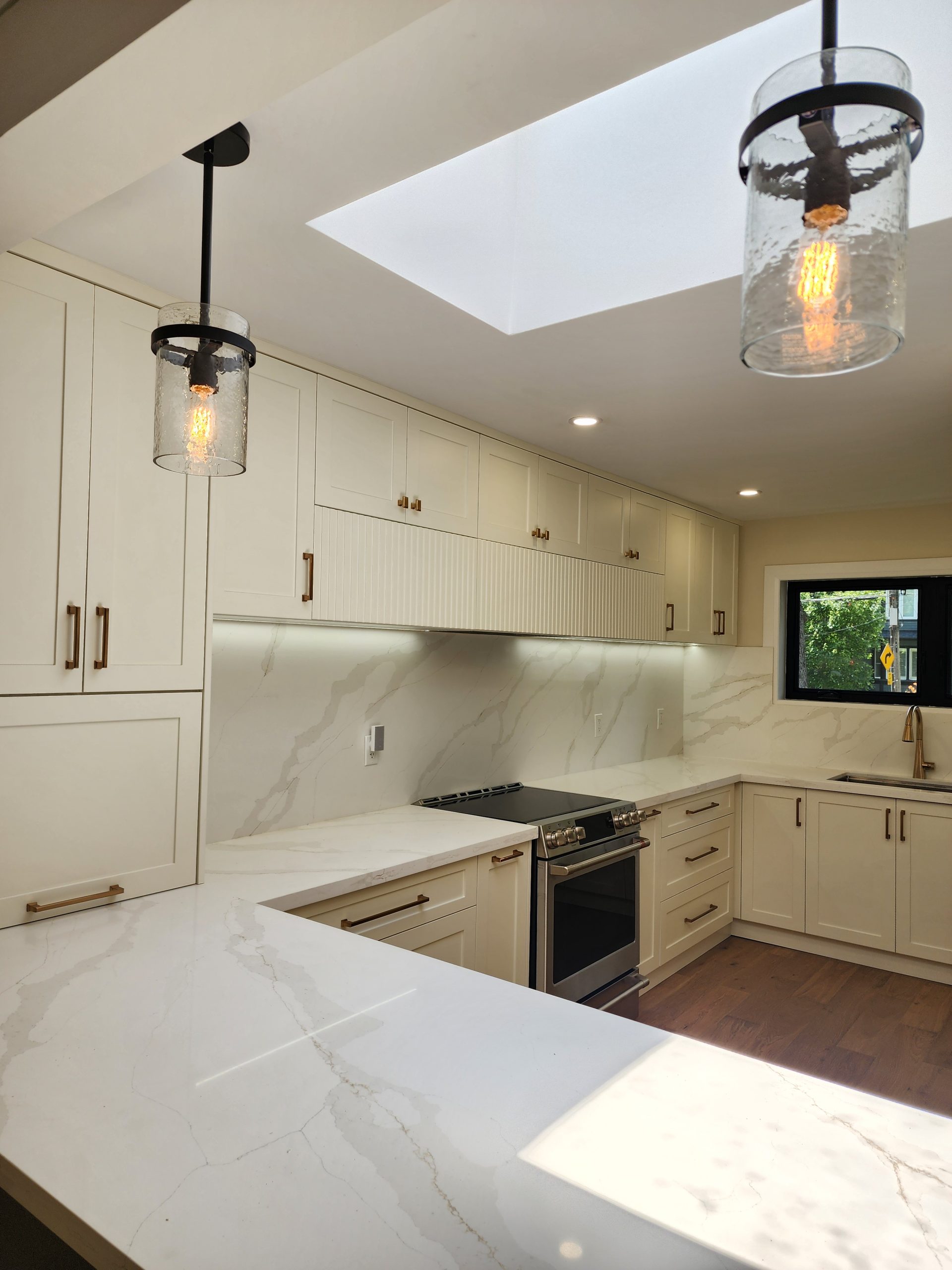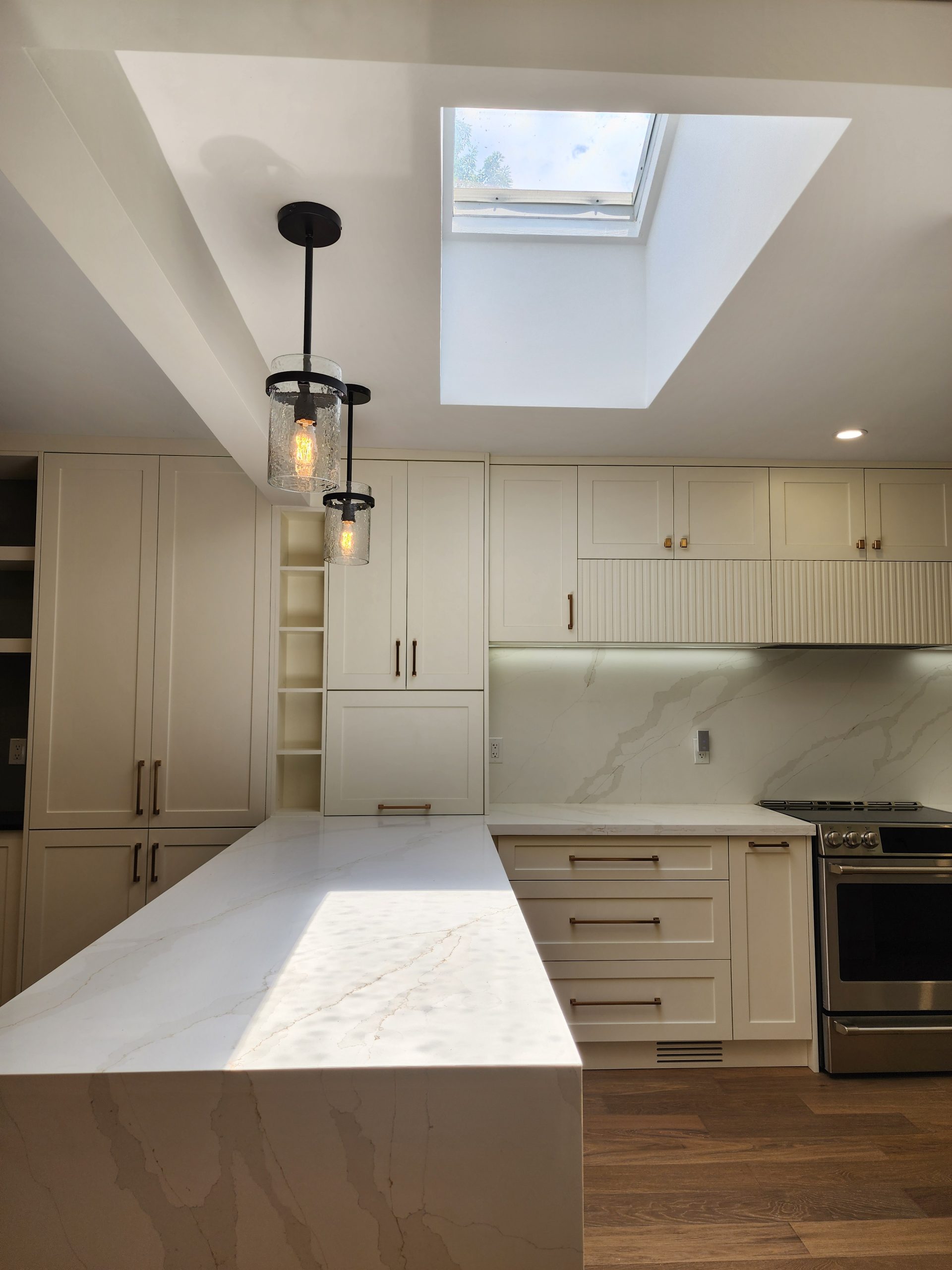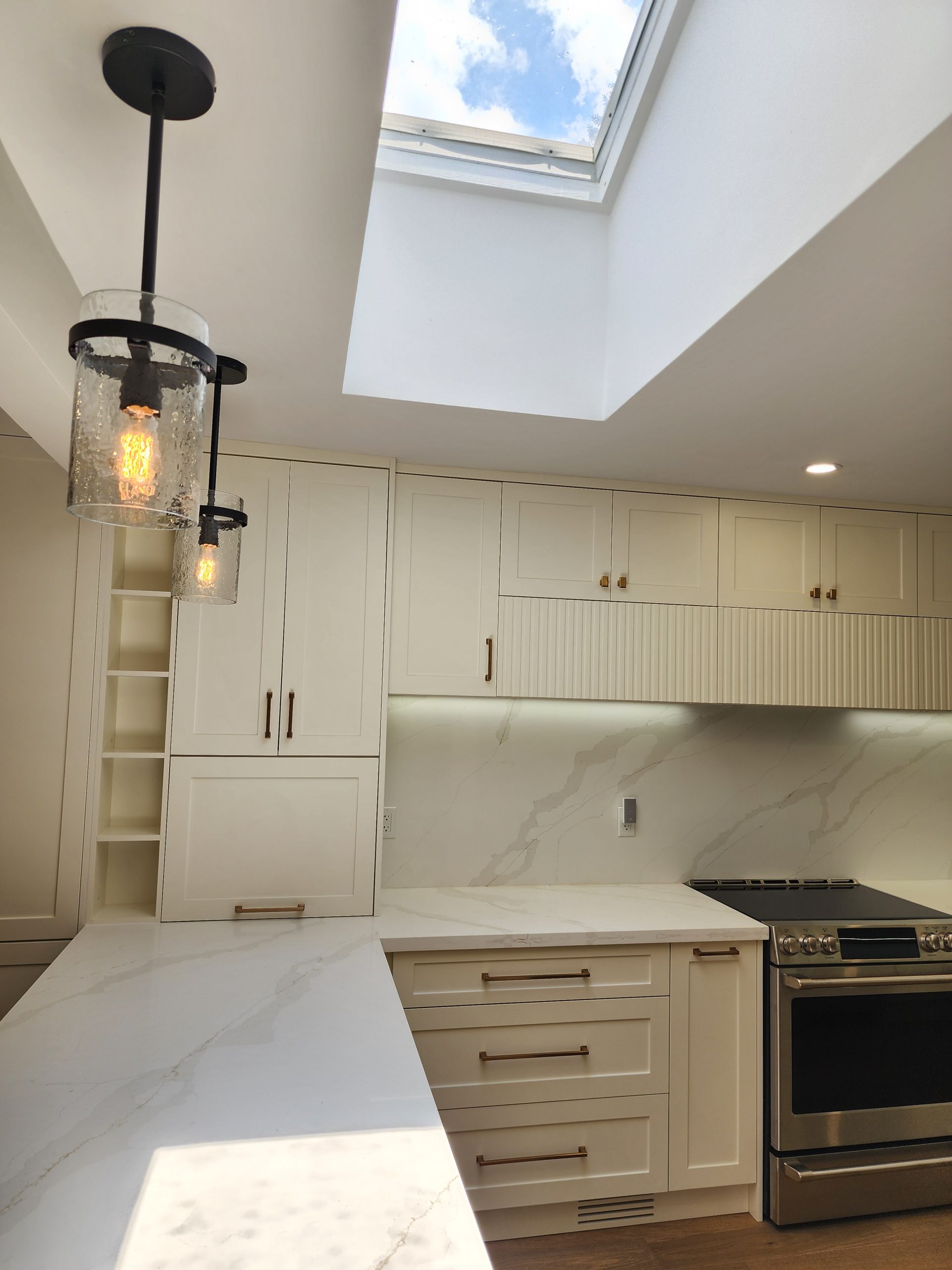 The renovation included a stunning new gourmet kitchen, featuring cream-colored shaker or flat-panel cabinetry, white quartz countertops and full-height slab backsplash, and elegant bronze hardware and faucet. Unique fluted or reeded panel accents on some upper cabinets add custom detail. Ample recessed lighting and a skylight ensure the space is always bright.