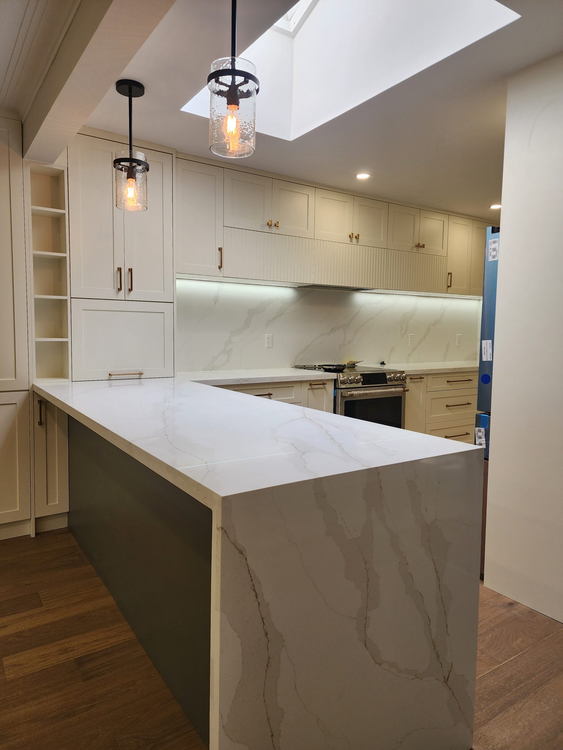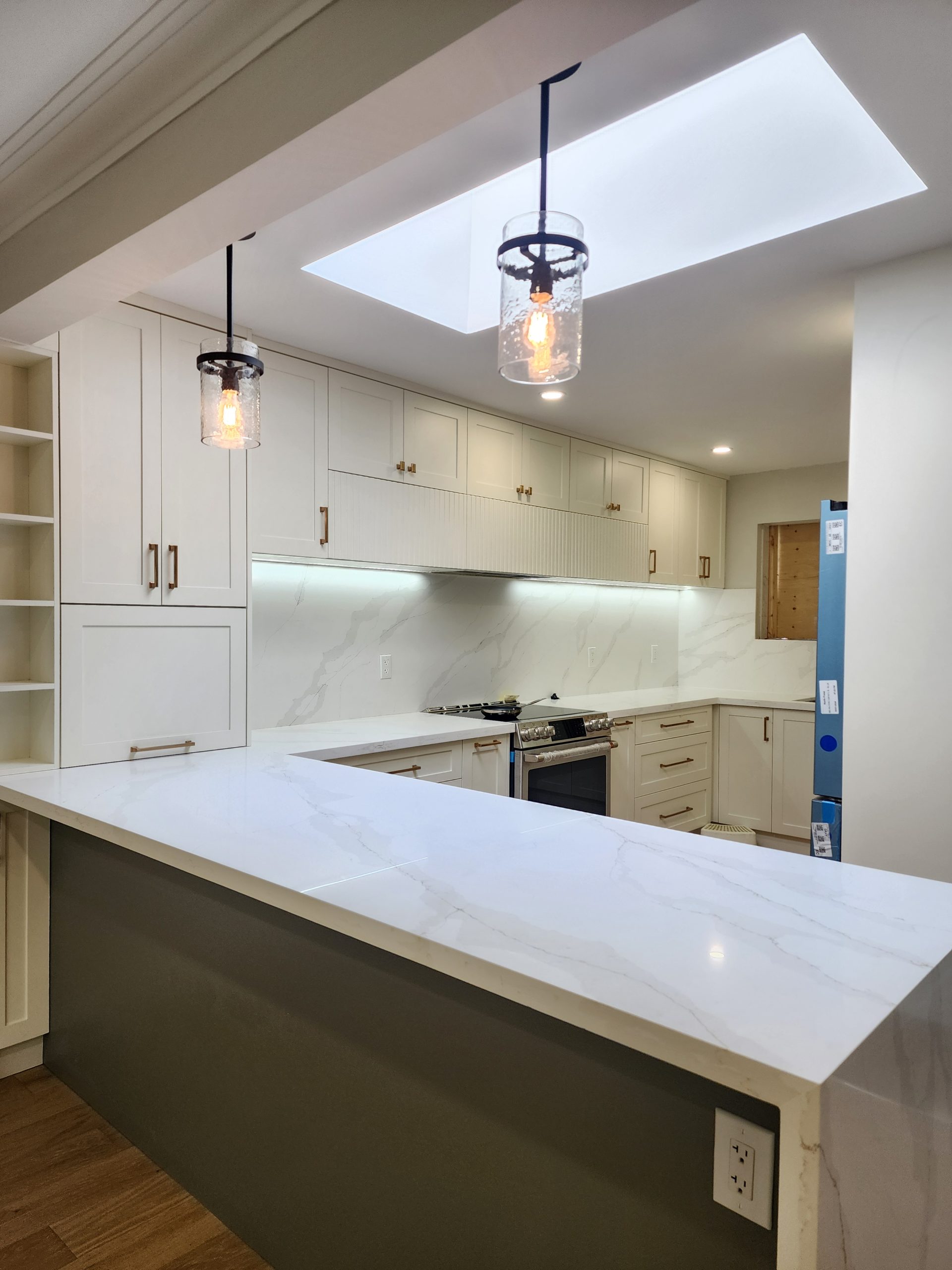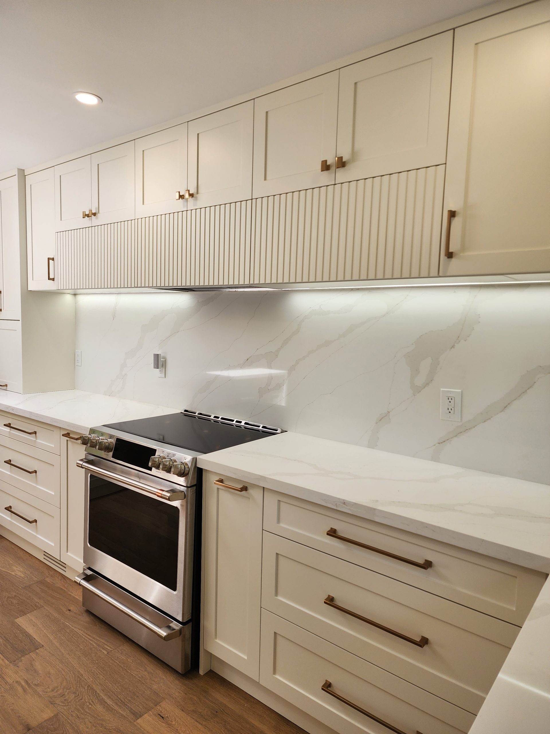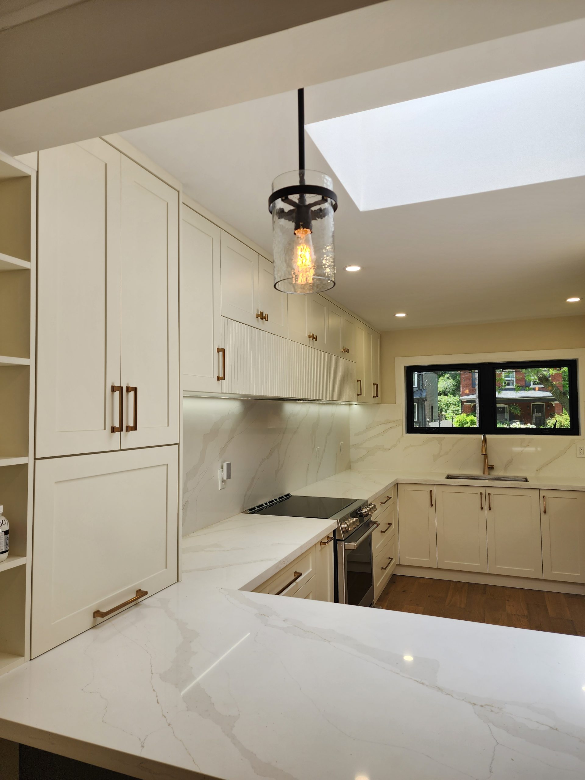 The renovation included a stunning new gourmet kitchen, featuring cream-colored shaker or flat-panel cabinetry, white quartz countertops and full-height slab backsplash, and elegant bronze hardware and faucet. Unique fluted or reeded panel accents on some upper cabinets add custom detail. Ample recessed lighting and a skylight ensure the space is always bright.
