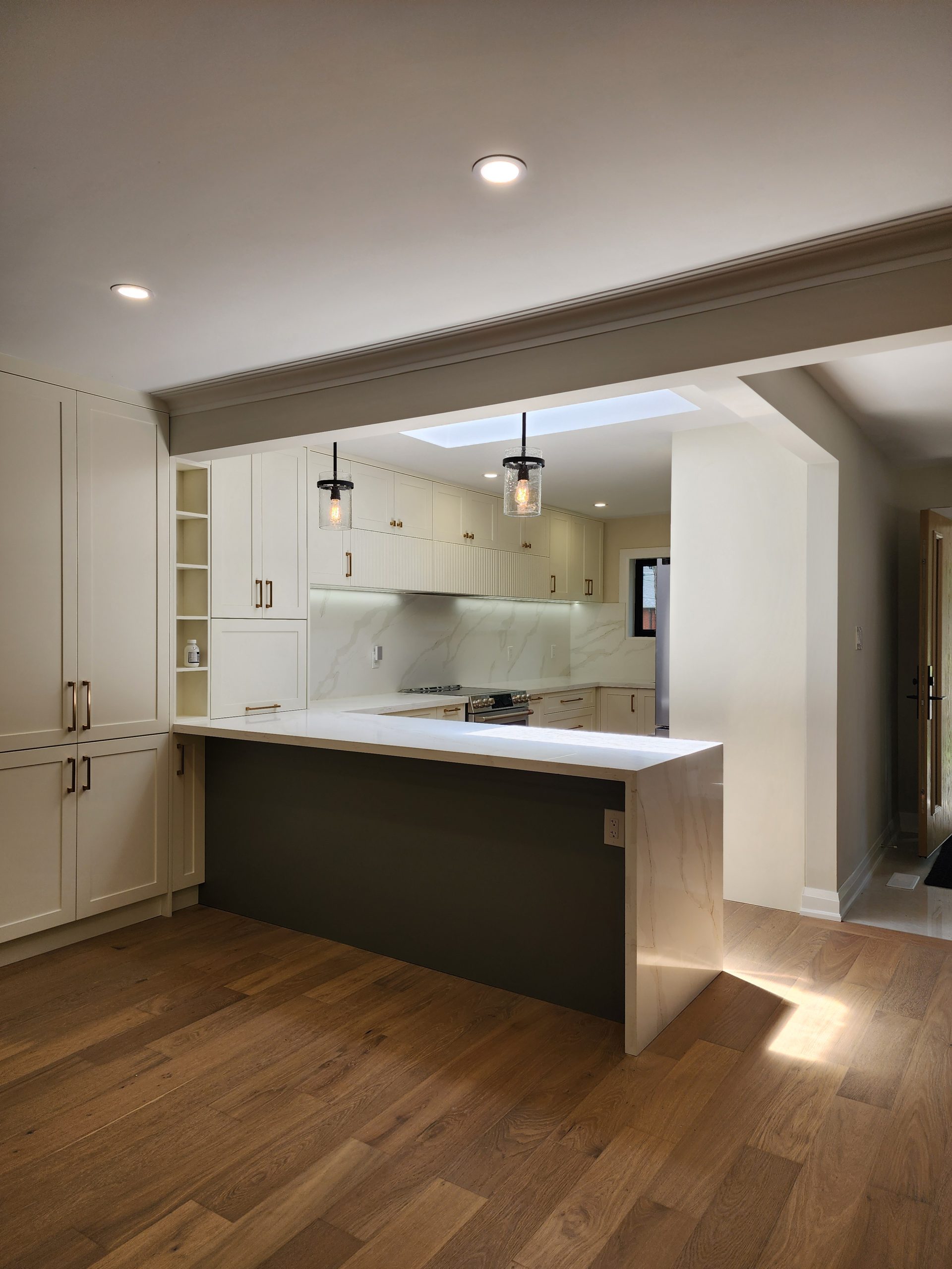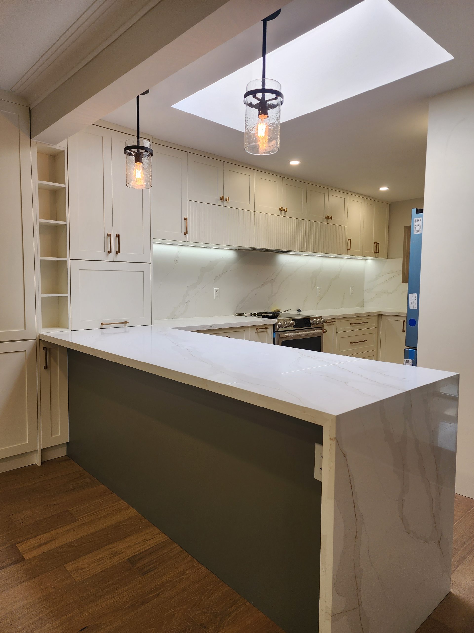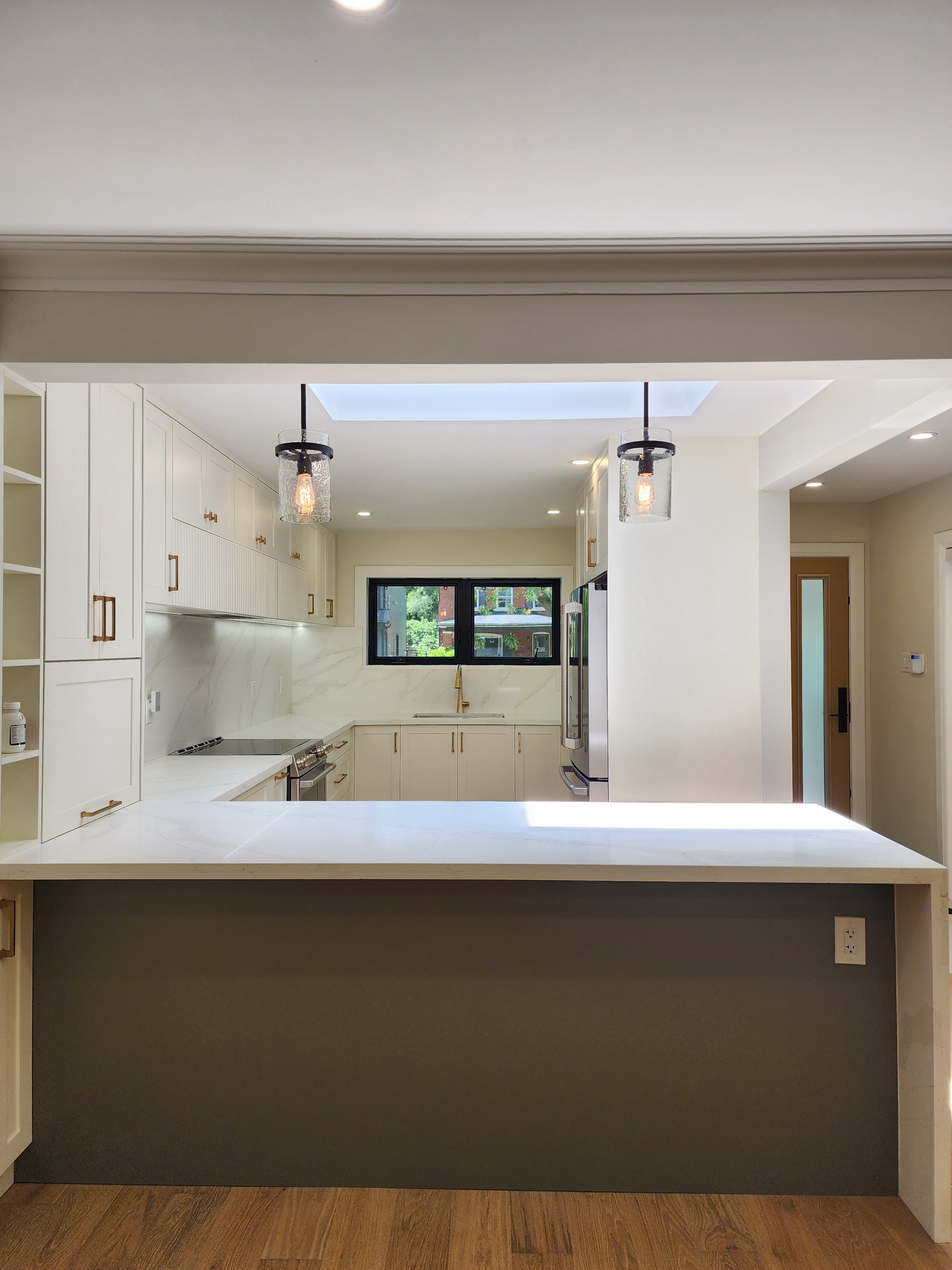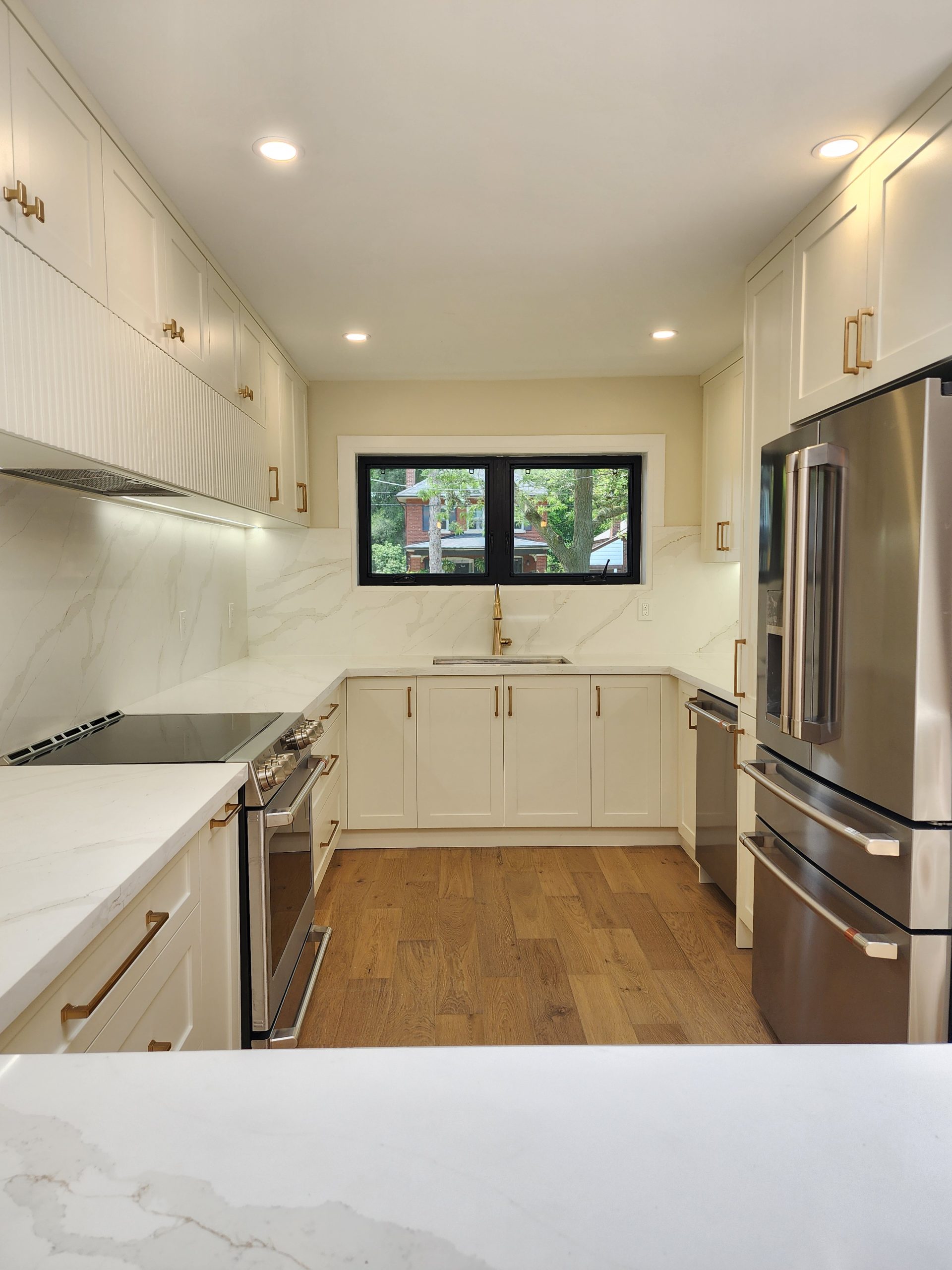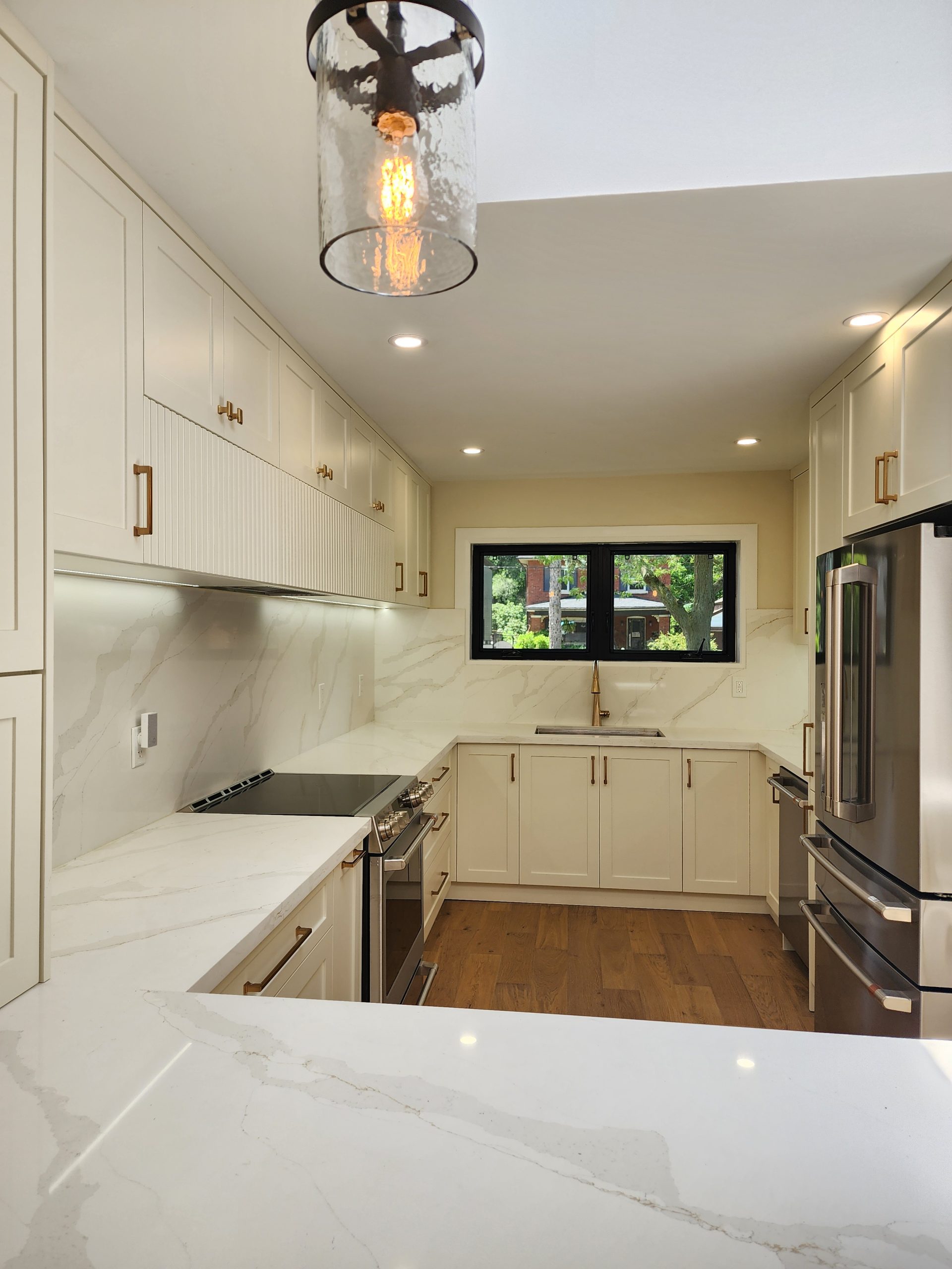 The renovation included a stunning new gourmet kitchen, featuring cream-colored shaker or flat-panel cabinetry, white quartz countertops and full-height slab backsplash, and elegant bronze hardware and faucet. Unique fluted or reeded panel accents on some upper cabinets add custom detail. Ample recessed lighting and a skylight ensure the space is always bright.