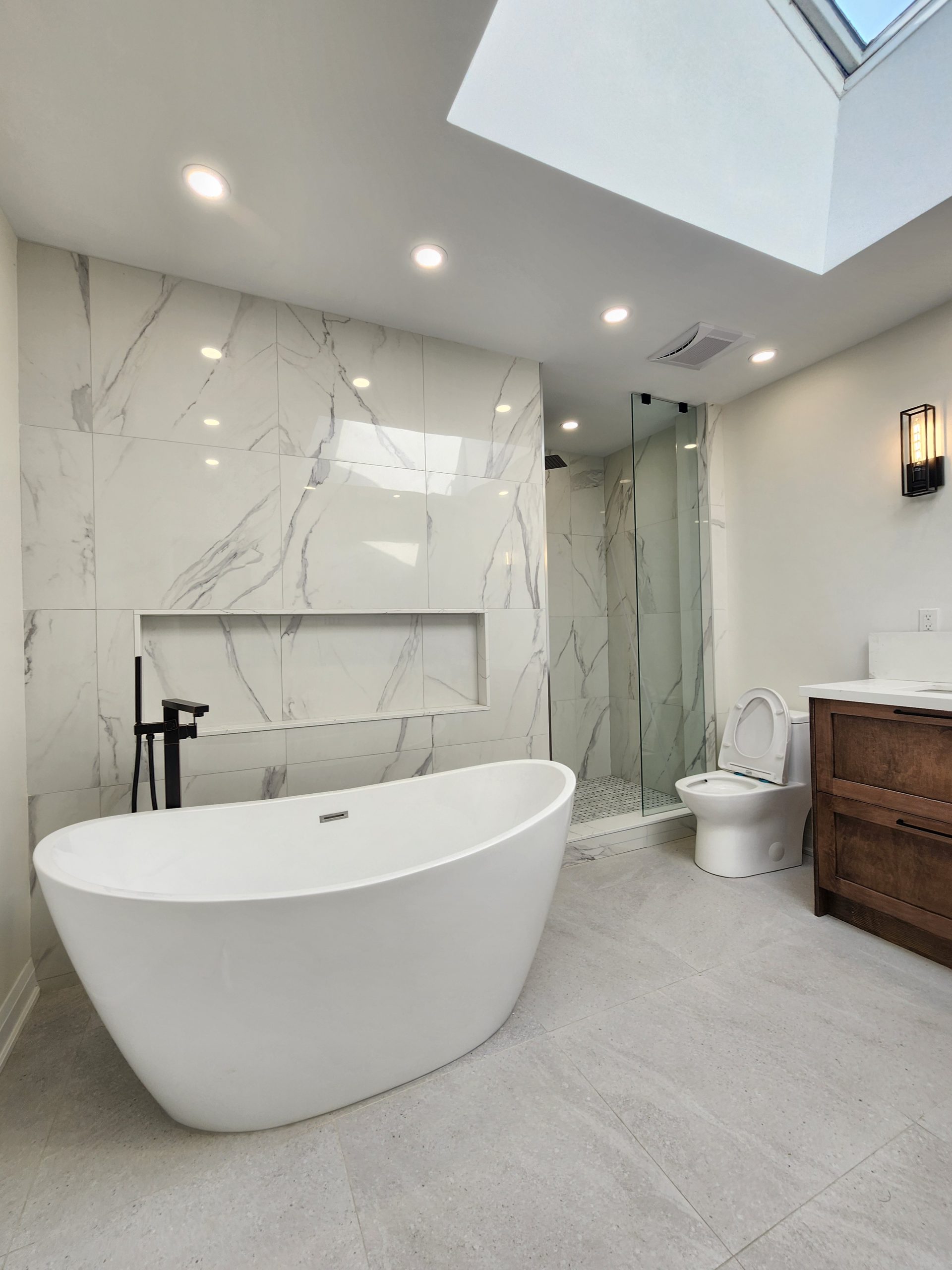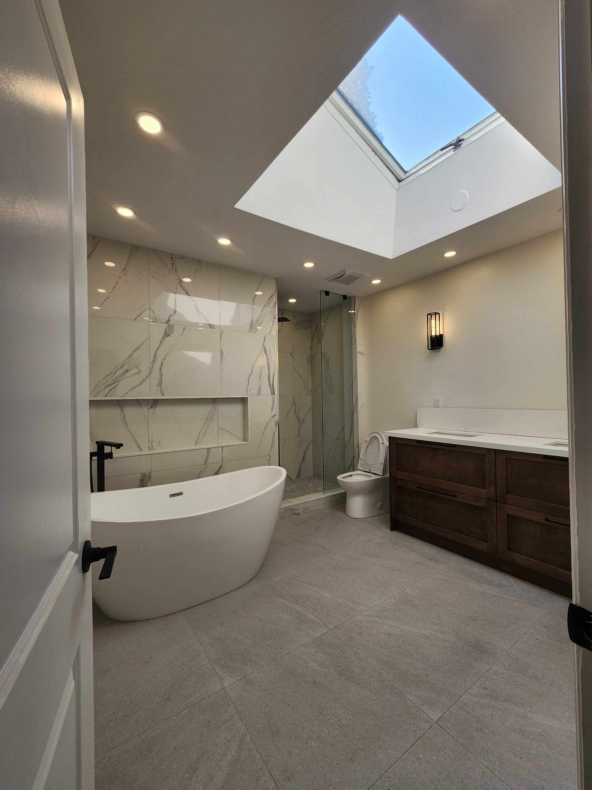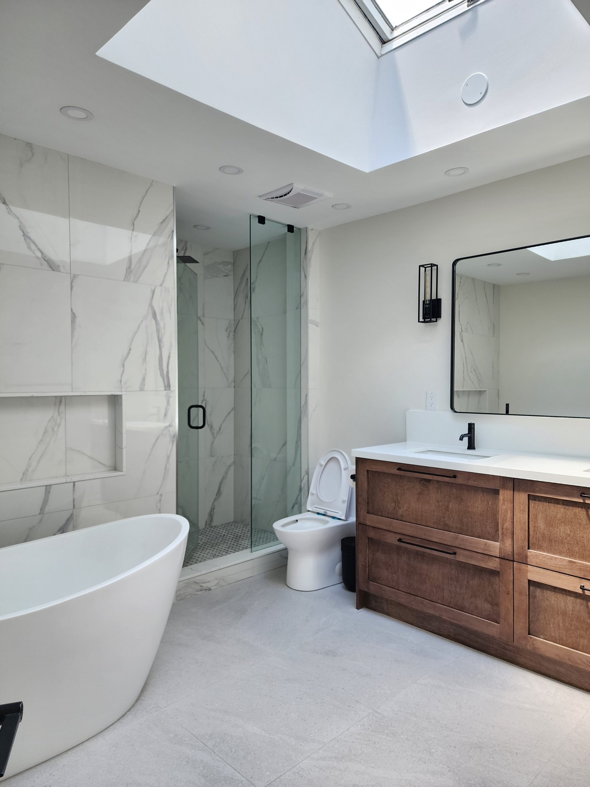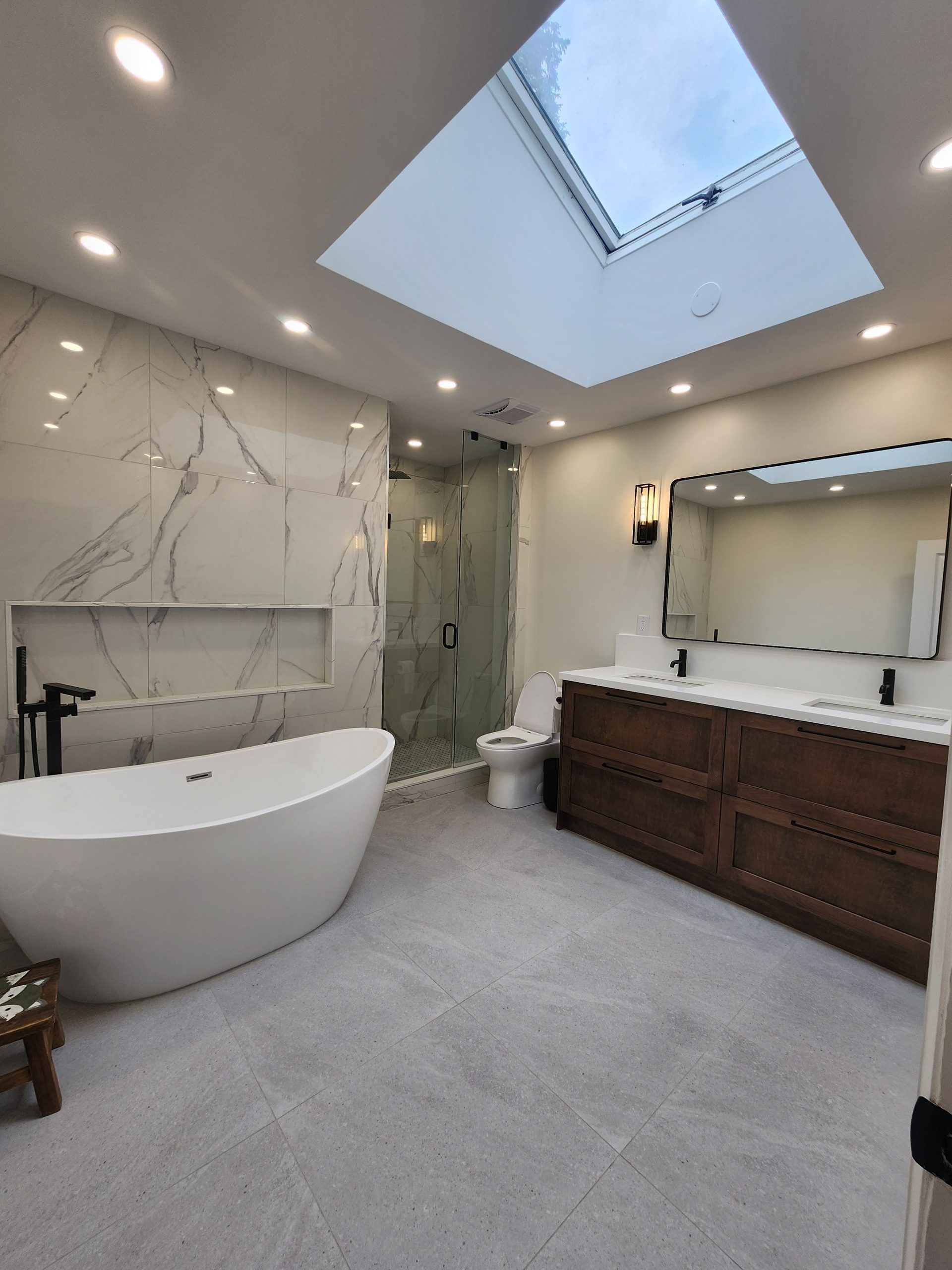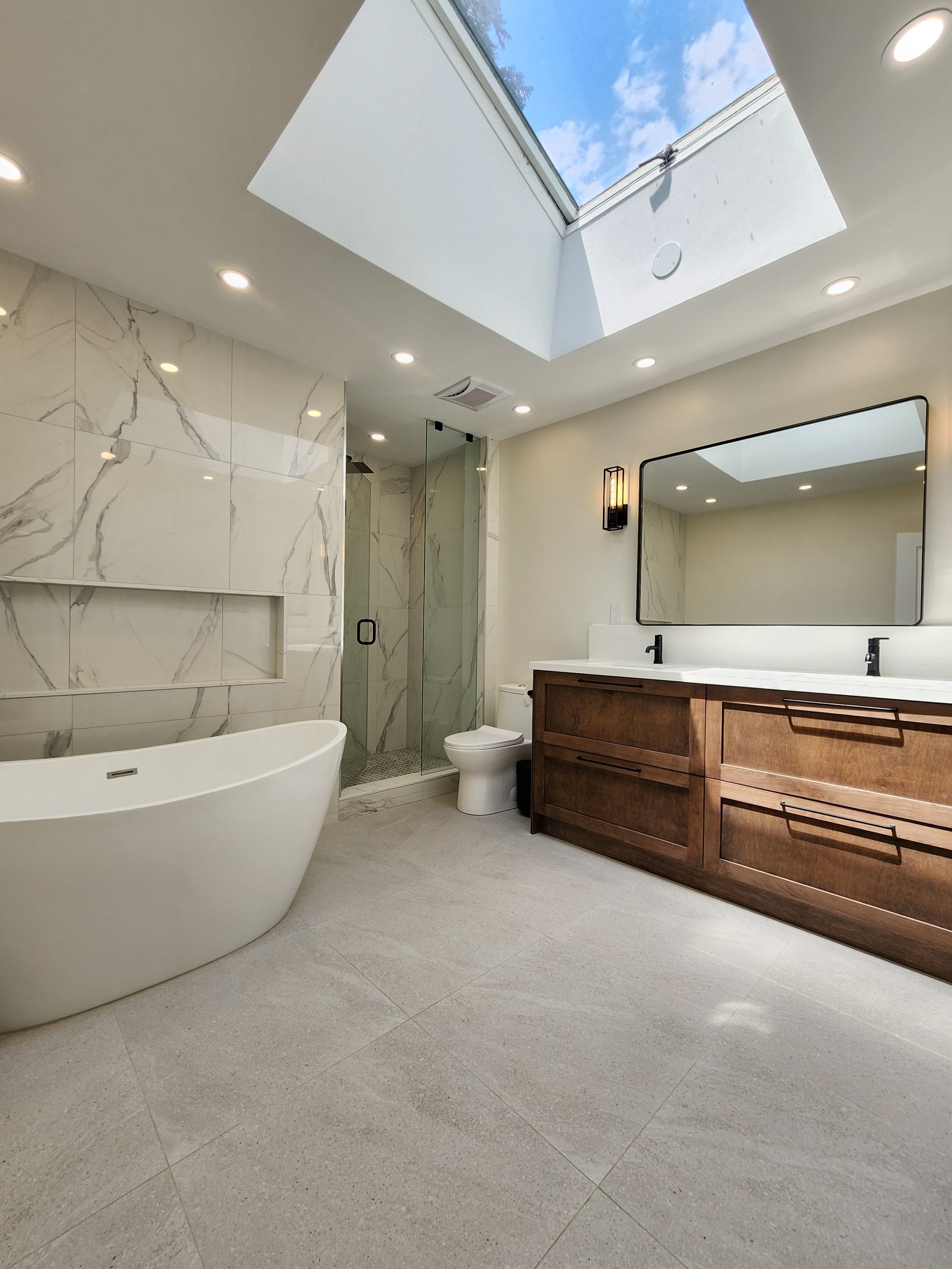 The luxury bathroom is a spa-like retreat, with large-format light grey floor tiles, a spacious walk-in shower lined with white marble-look porcelain tile and a mosaic shower pan, enclosed by a frameless glass door. A modern freestanding soaking tub sits beneath a window, while a wide, dark wood dual vanity with black hardware and sconces completes the sophisticated look. A large skylight bathes the space in natural light.