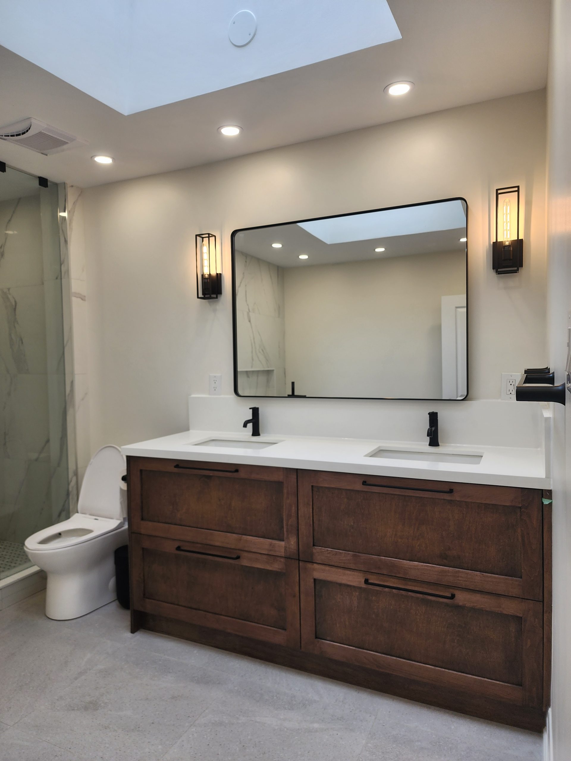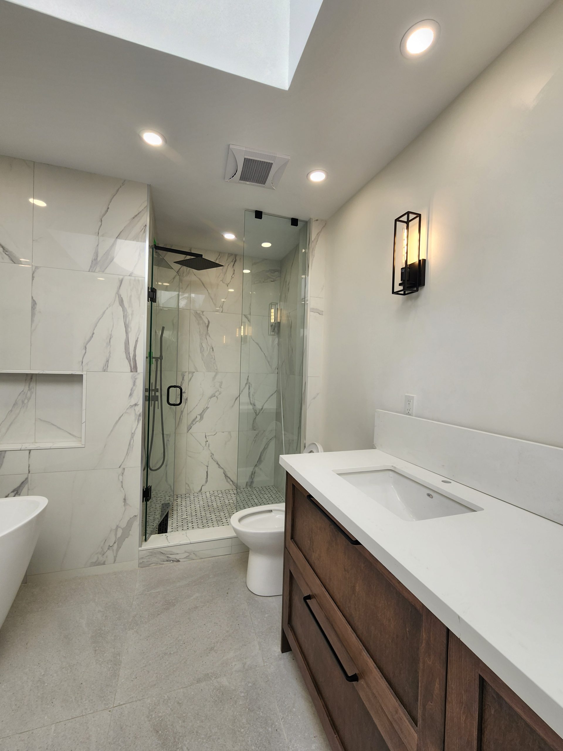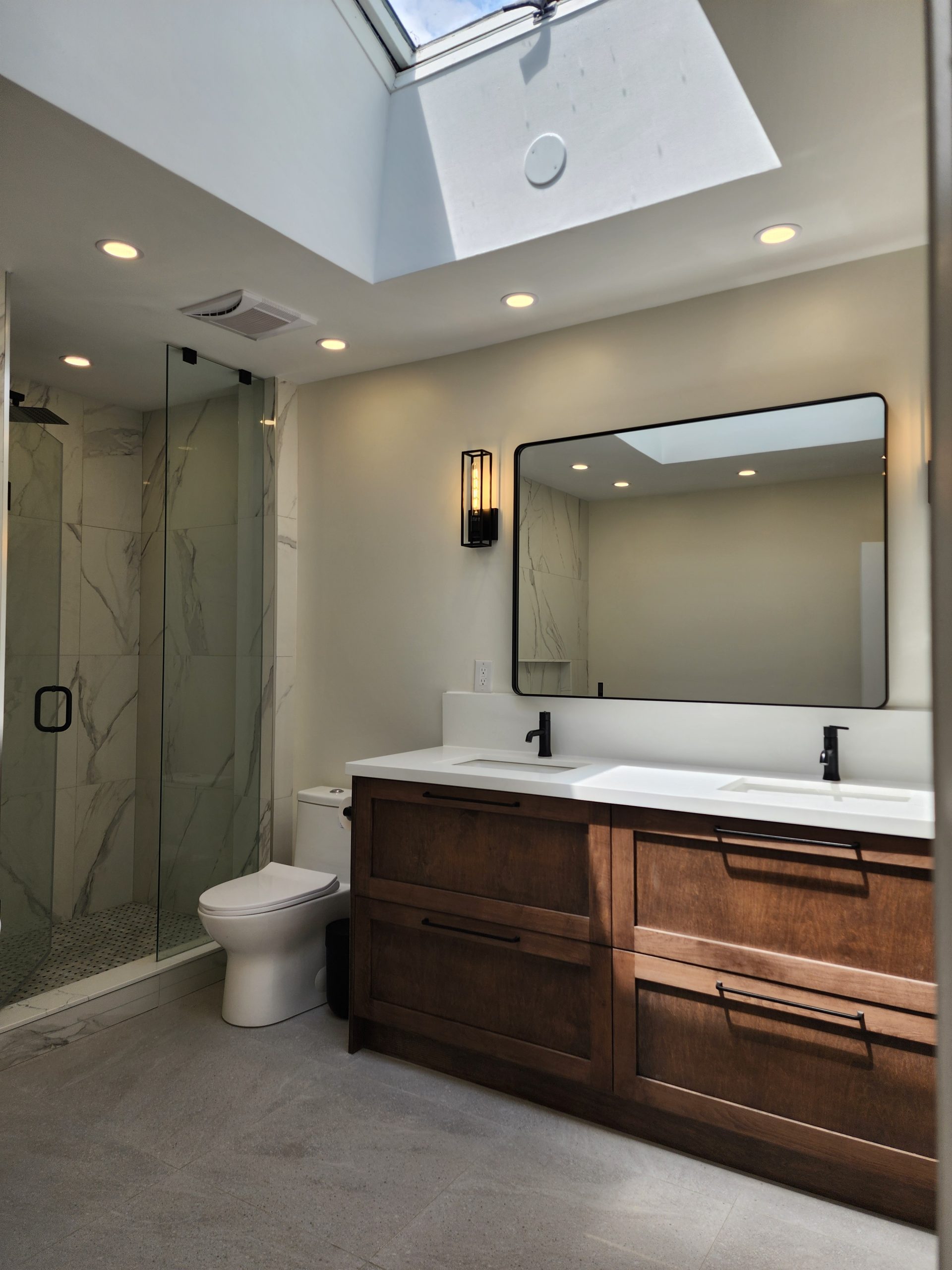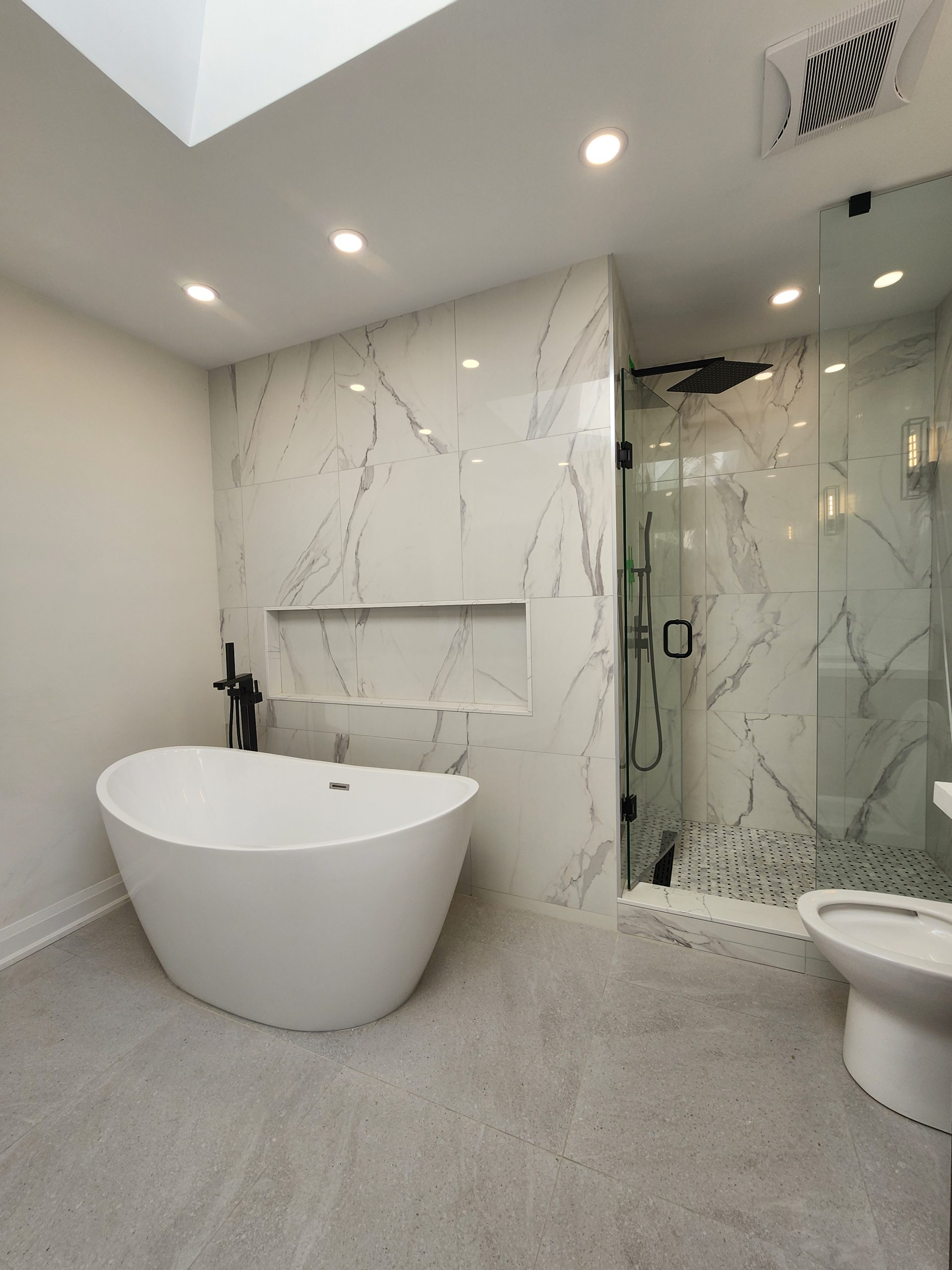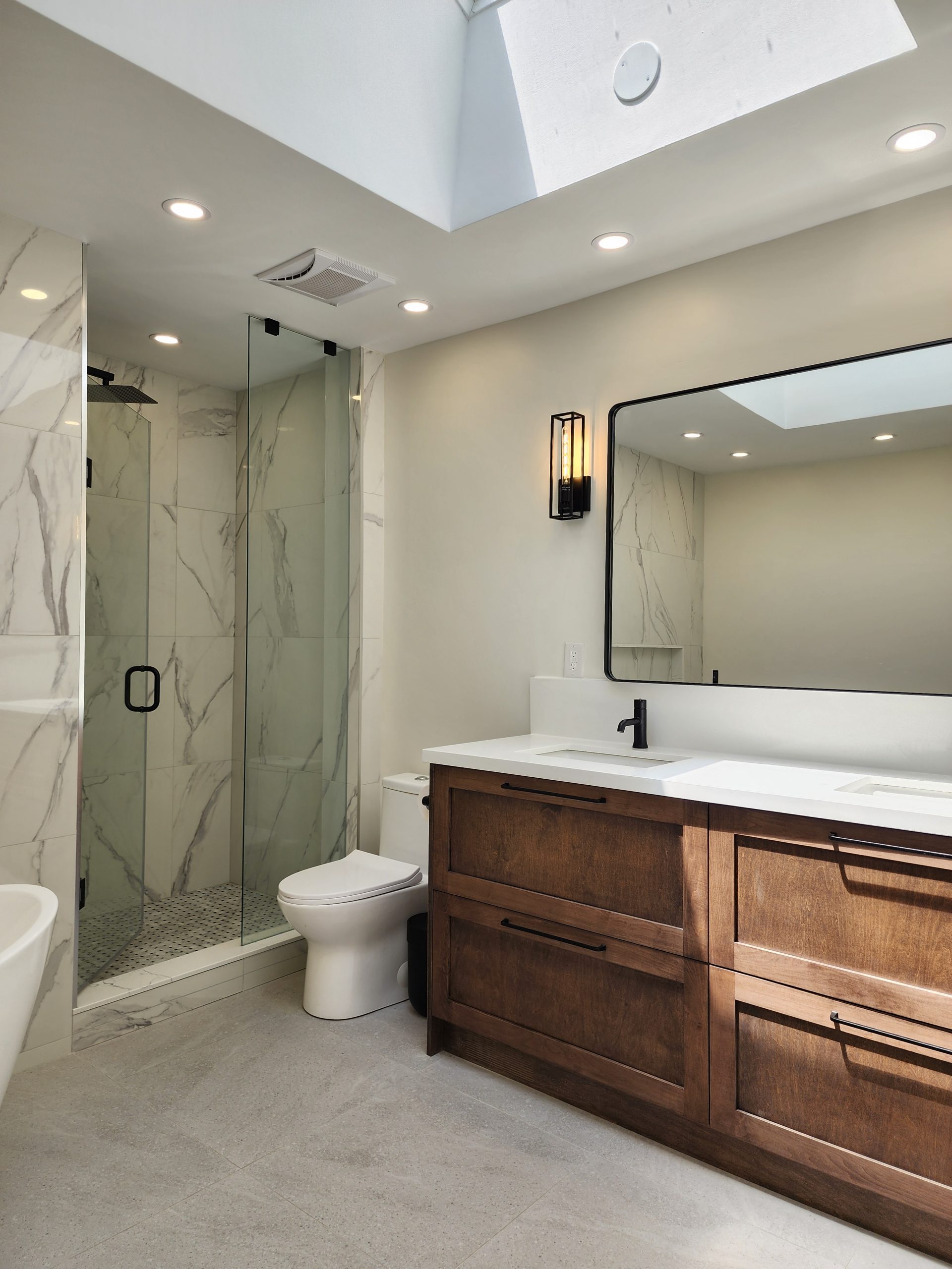 The luxury bathroom is a spa-like retreat, with large-format light grey floor tiles, a spacious walk-in shower lined with white marble-look porcelain tile and a mosaic shower pan, enclosed by a frameless glass door. A modern freestanding soaking tub sits beneath a window, while a wide, dark wood dual vanity with black hardware and sconces completes the sophisticated look. A large skylight bathes the space in natural light.