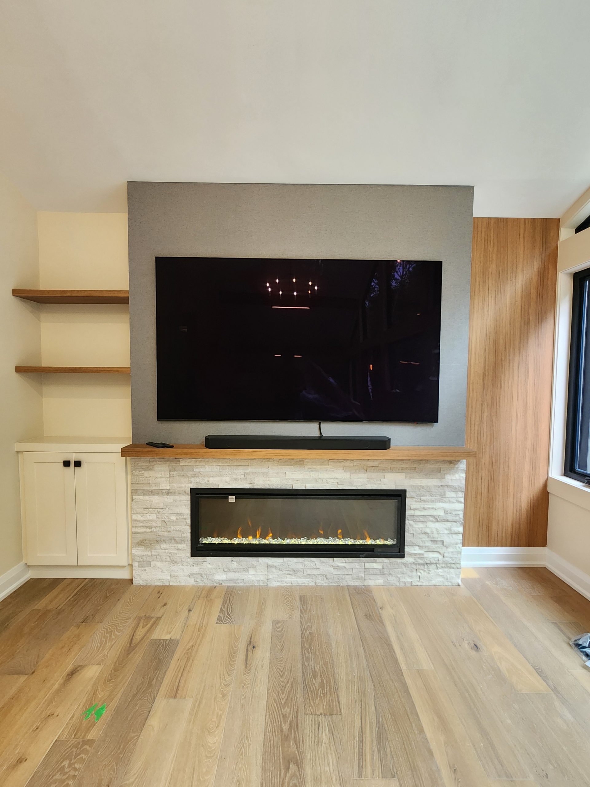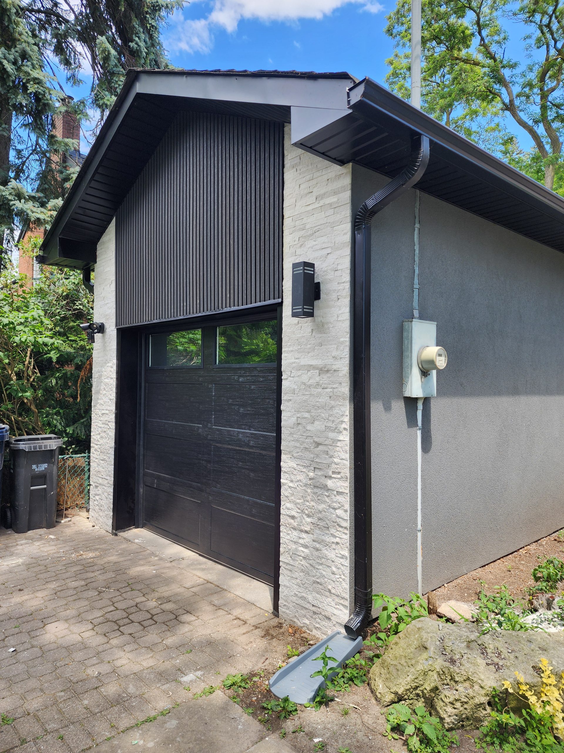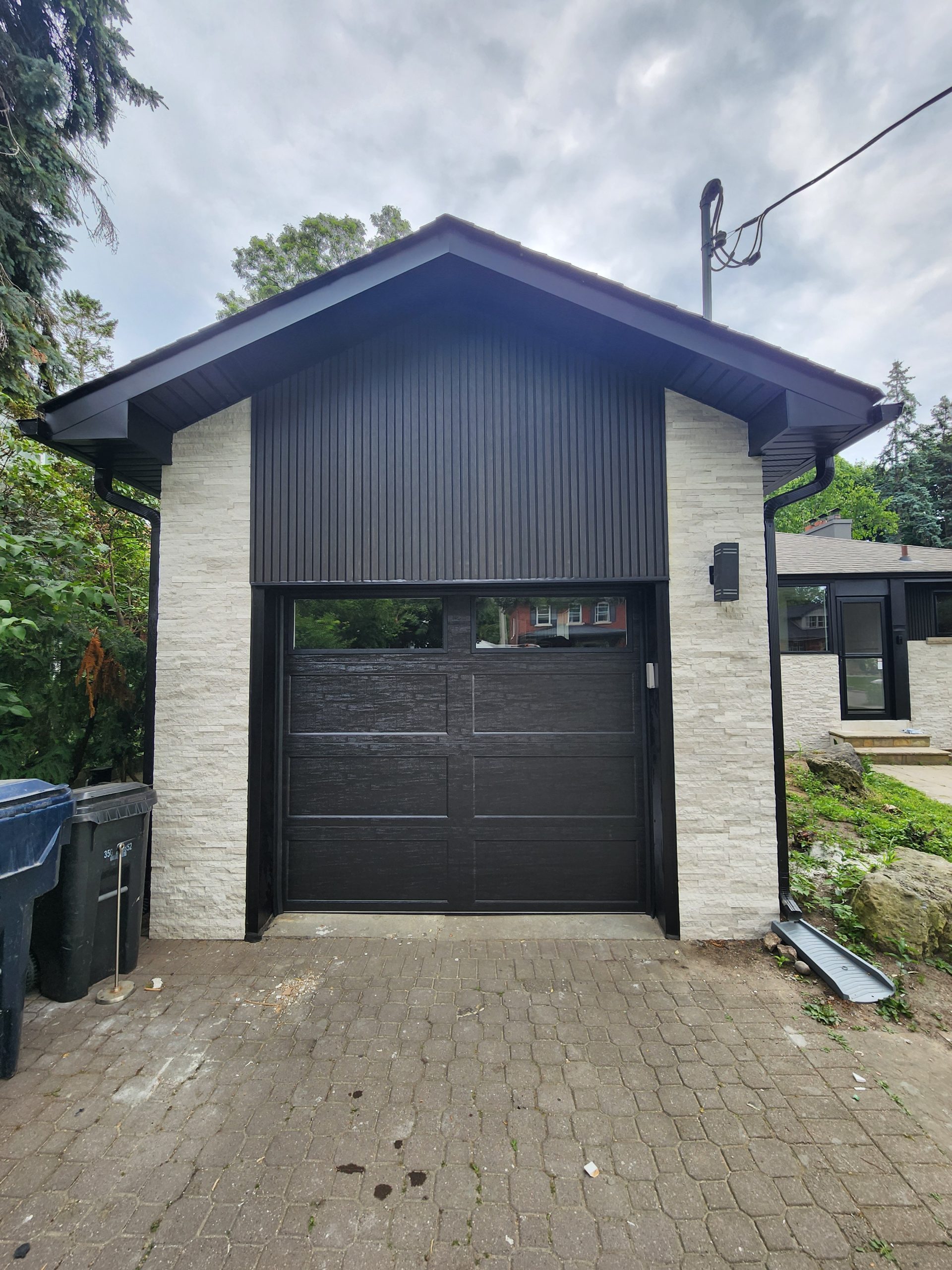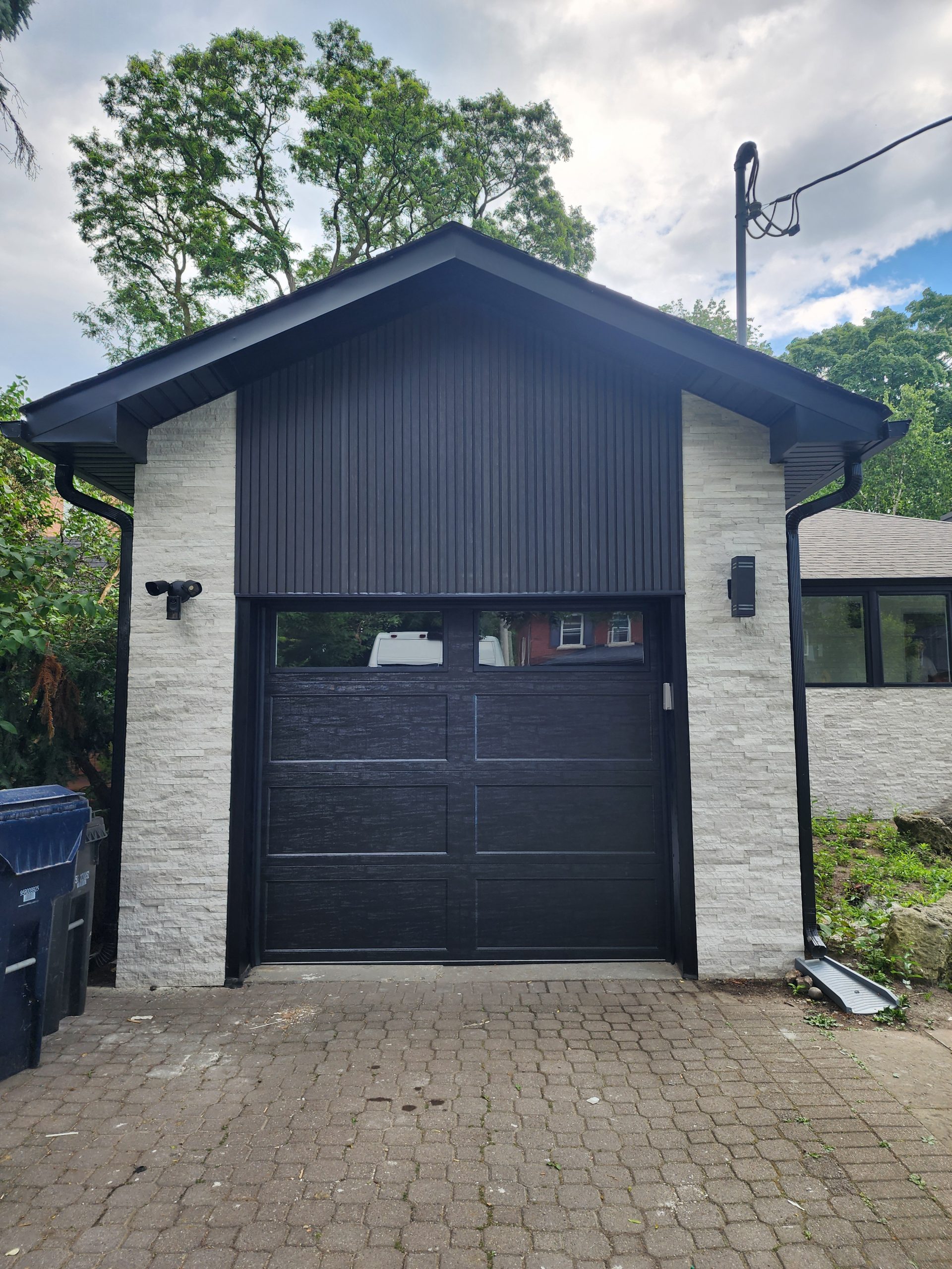 The exterior also received a significant facelift, featuring a striking black vertical slat siding accent, light stone cladding, new black-framed windows, and a sleek black garage door for a cohesive, modern curb appeal. The front entrance was updated with a contemporary wood door featuring a vertical glass insert.