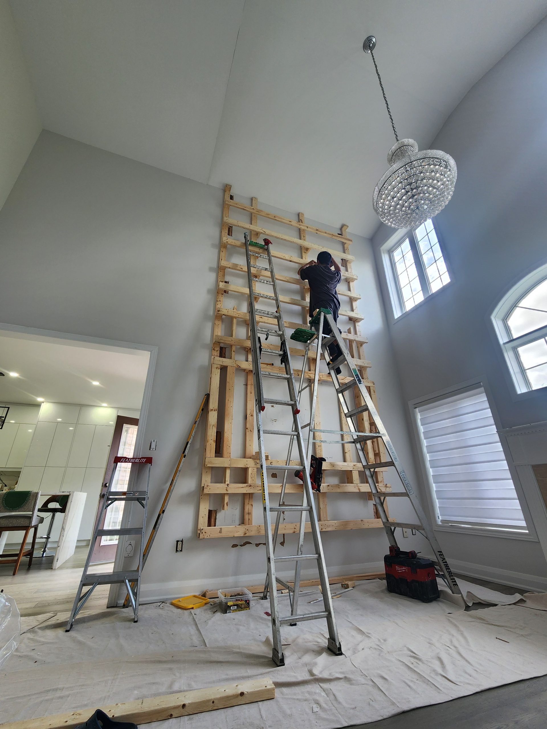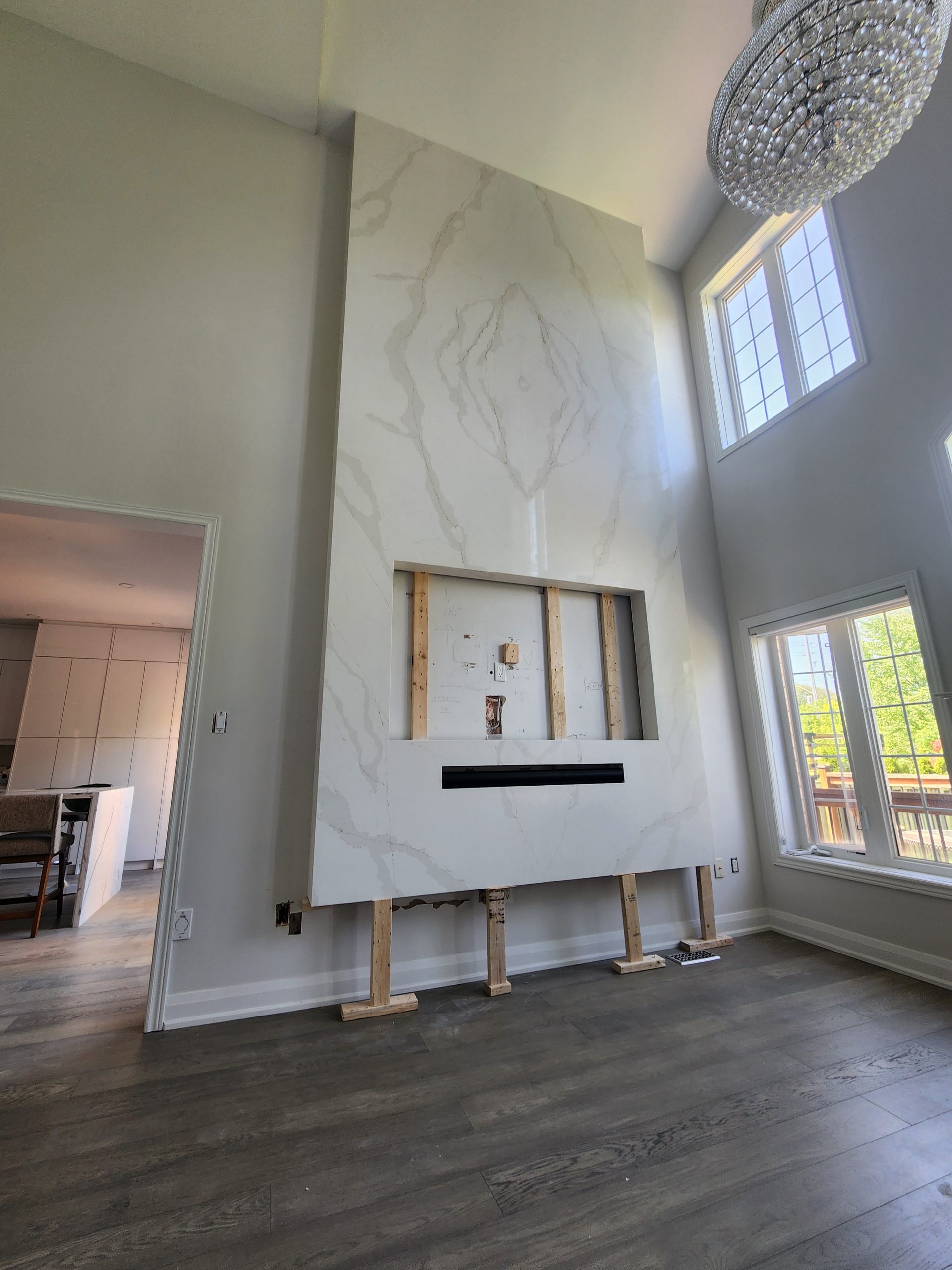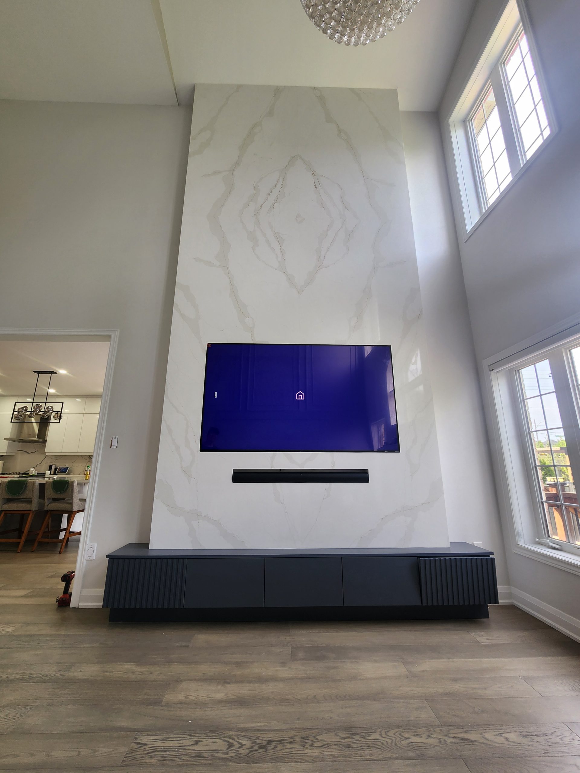 This project transforms a standard living room into a dramatic architectural focal point with a floor-to-ceiling porcelain feature wall. The existing wall was fully stripped, reframed, and structurally reinforced from floor to ceiling to support the weight of large-format slabs and embedded media components.