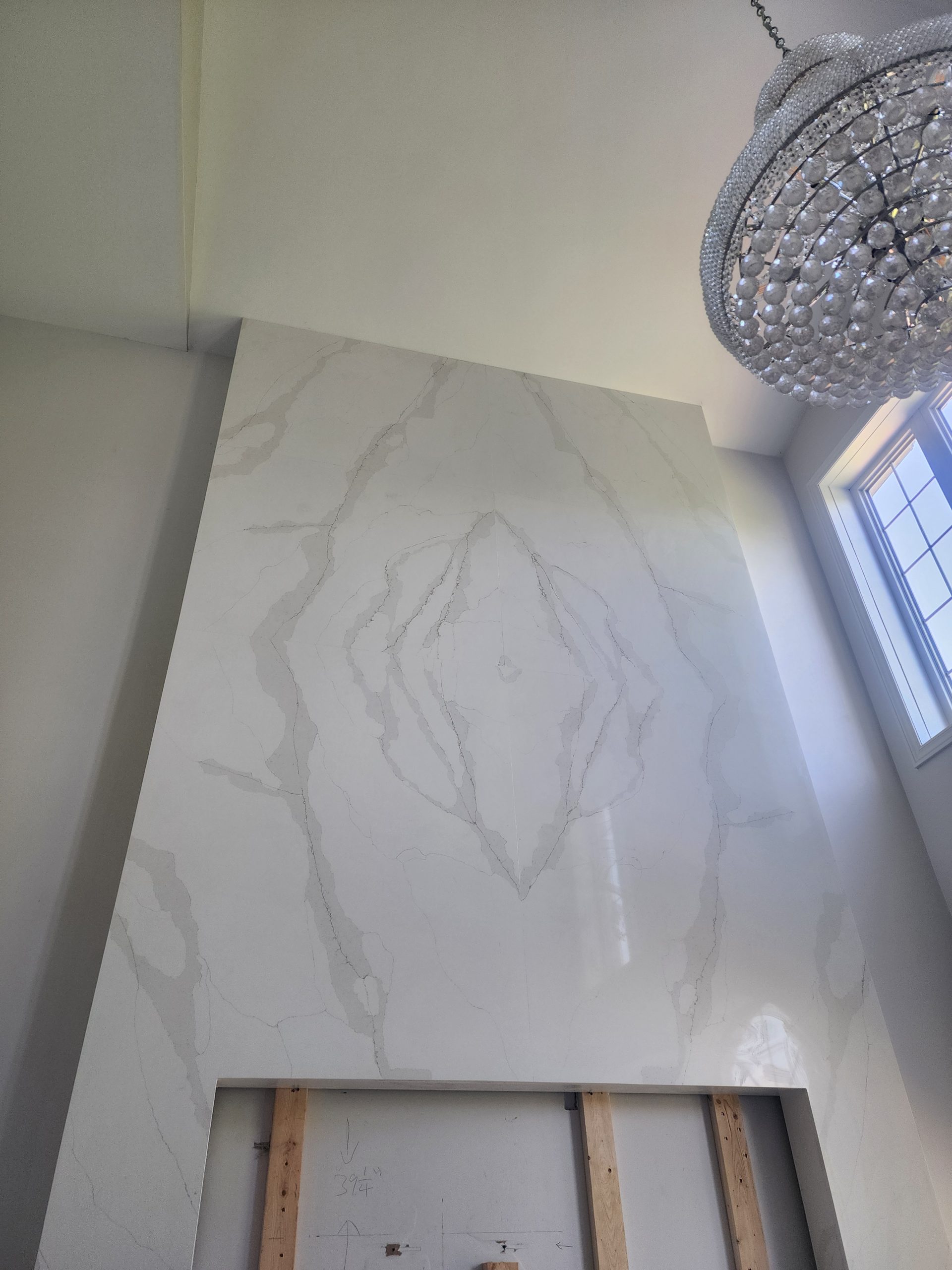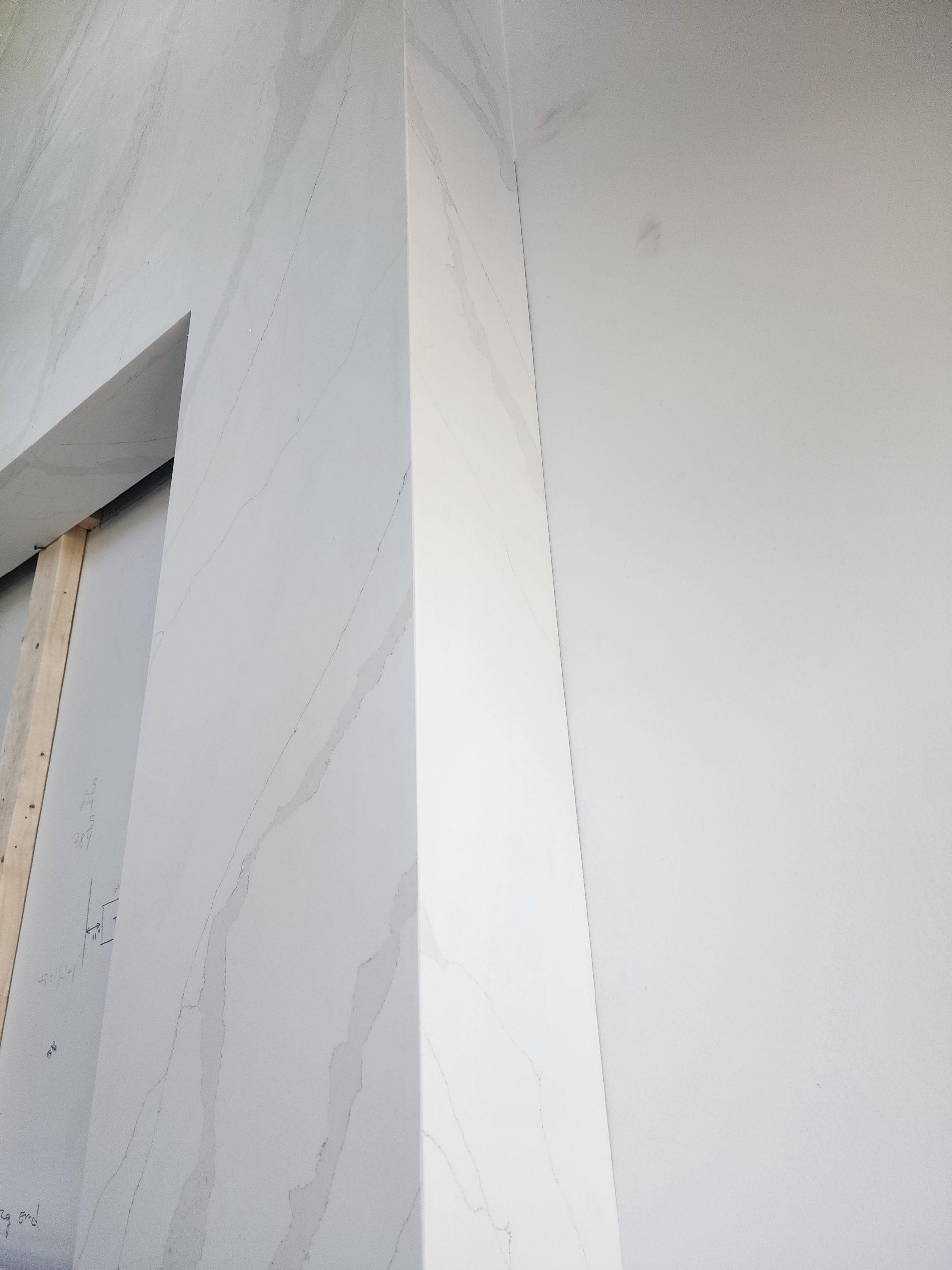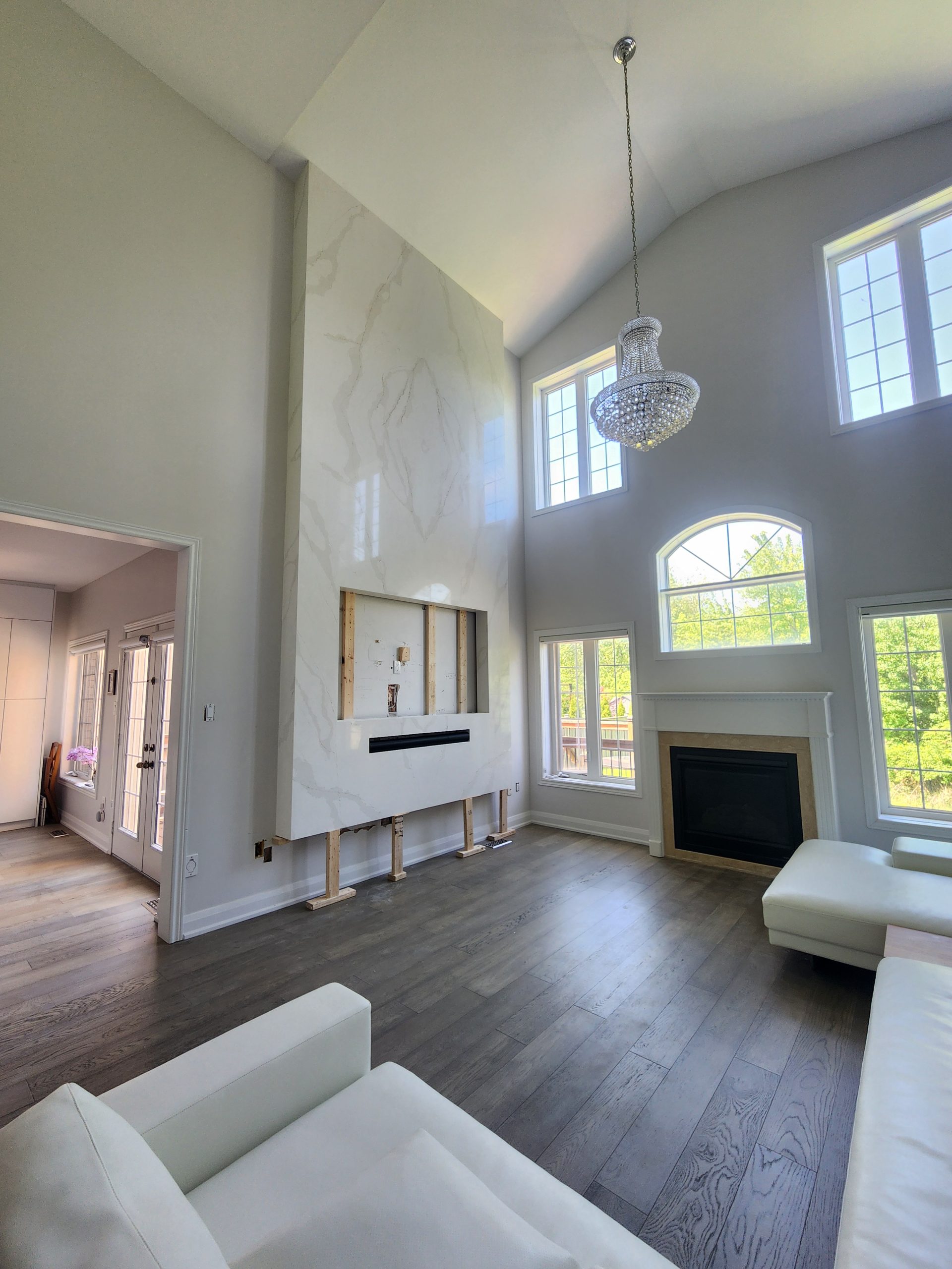 This project transforms a standard living room into a dramatic architectural focal point with a floor-to-ceiling porcelain feature wall. The existing wall was fully stripped, reframed, and structurally reinforced from floor to ceiling to support the weight of large-format slabs and embedded media components.