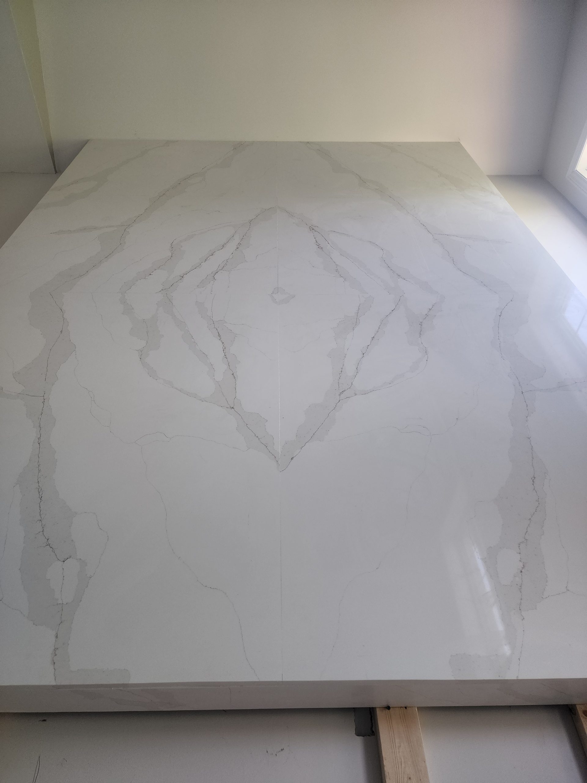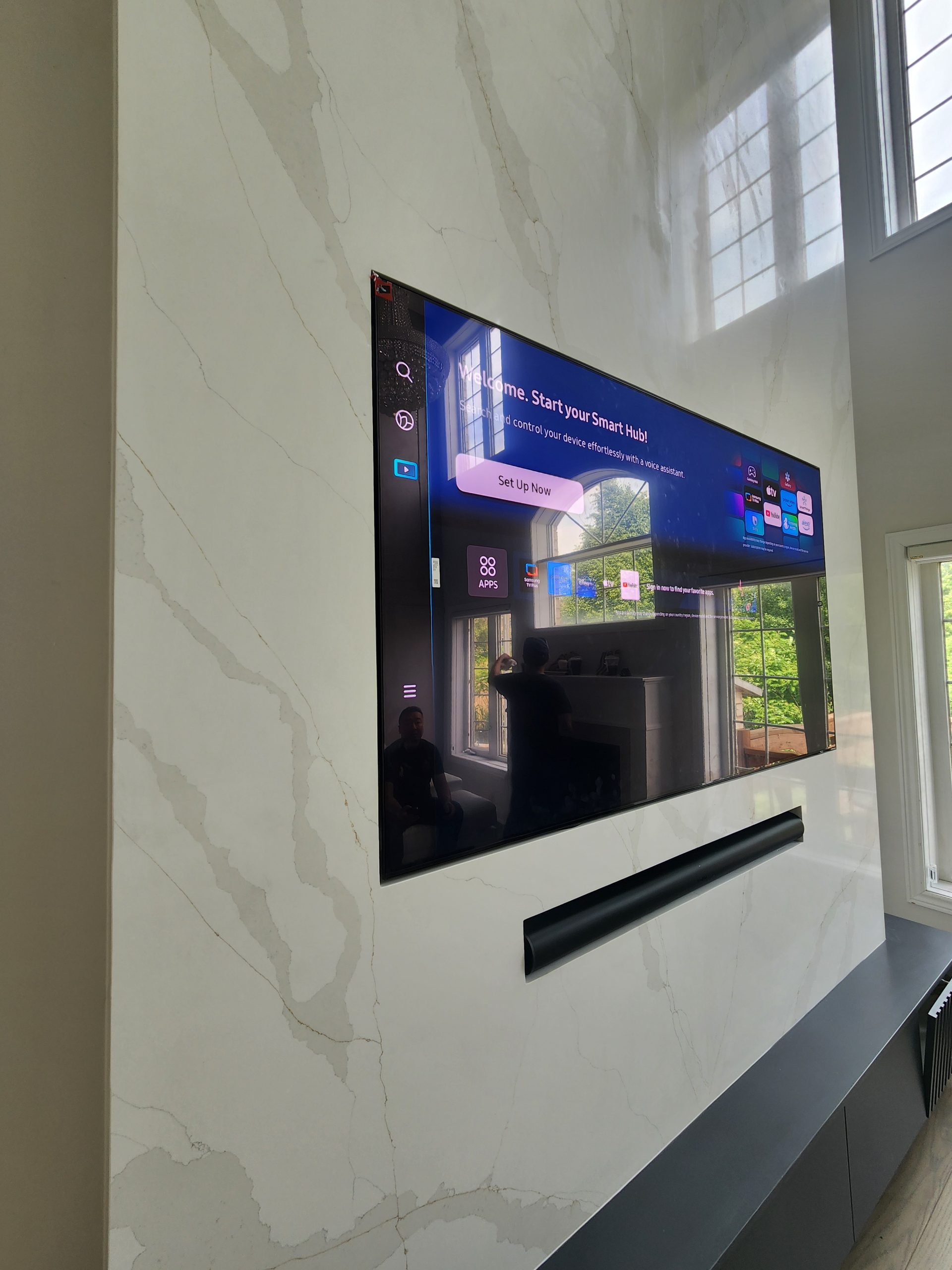 A book-matched porcelain finish was installed with precise seam alignment, creating an elegant marble-inspired pattern that spans the entire double-height wall. A recessed niche was custom-framed for the TV and soundbar, allowing both to sit flush against the slab for a sleek, modern appearance.