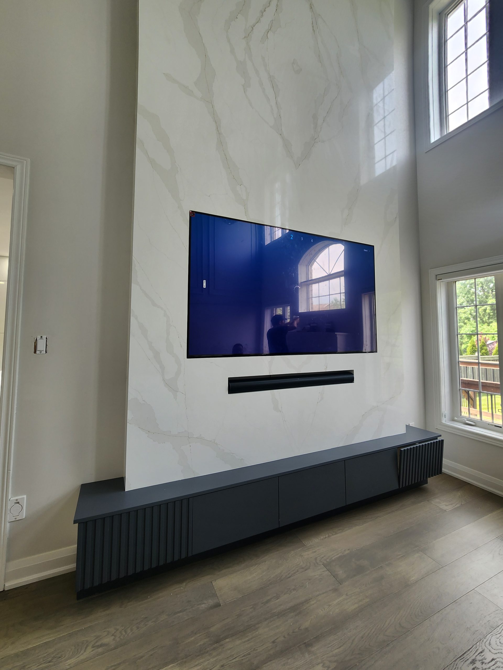 Below, a custom matte-charcoal media cabinet stretches wall-to-wall, featuring fluted end panels and hidden storage for a clean, contemporary look. All electrical outlets, wiring, and device connections were reworked and concealed inside the framing, eliminating all visible cables.