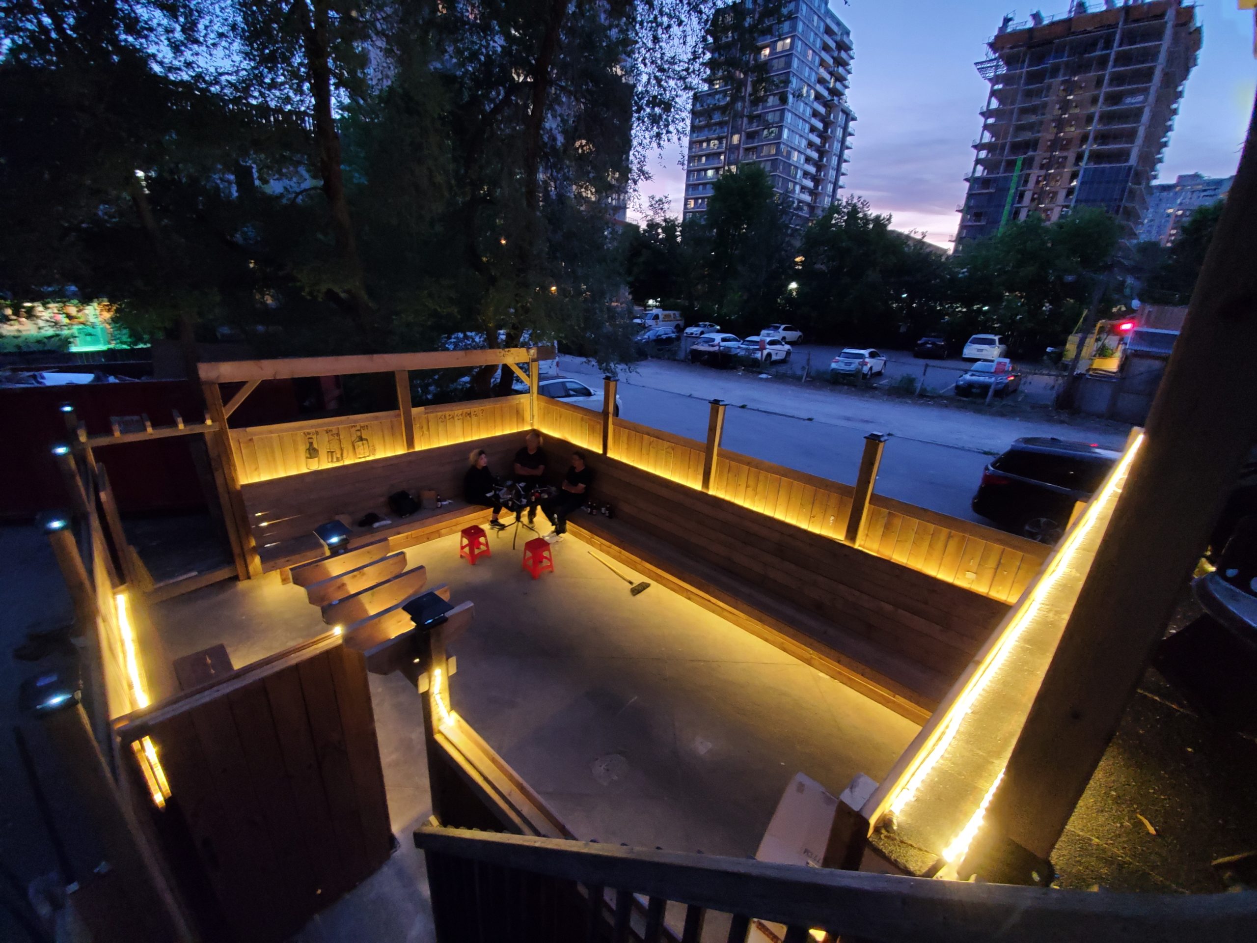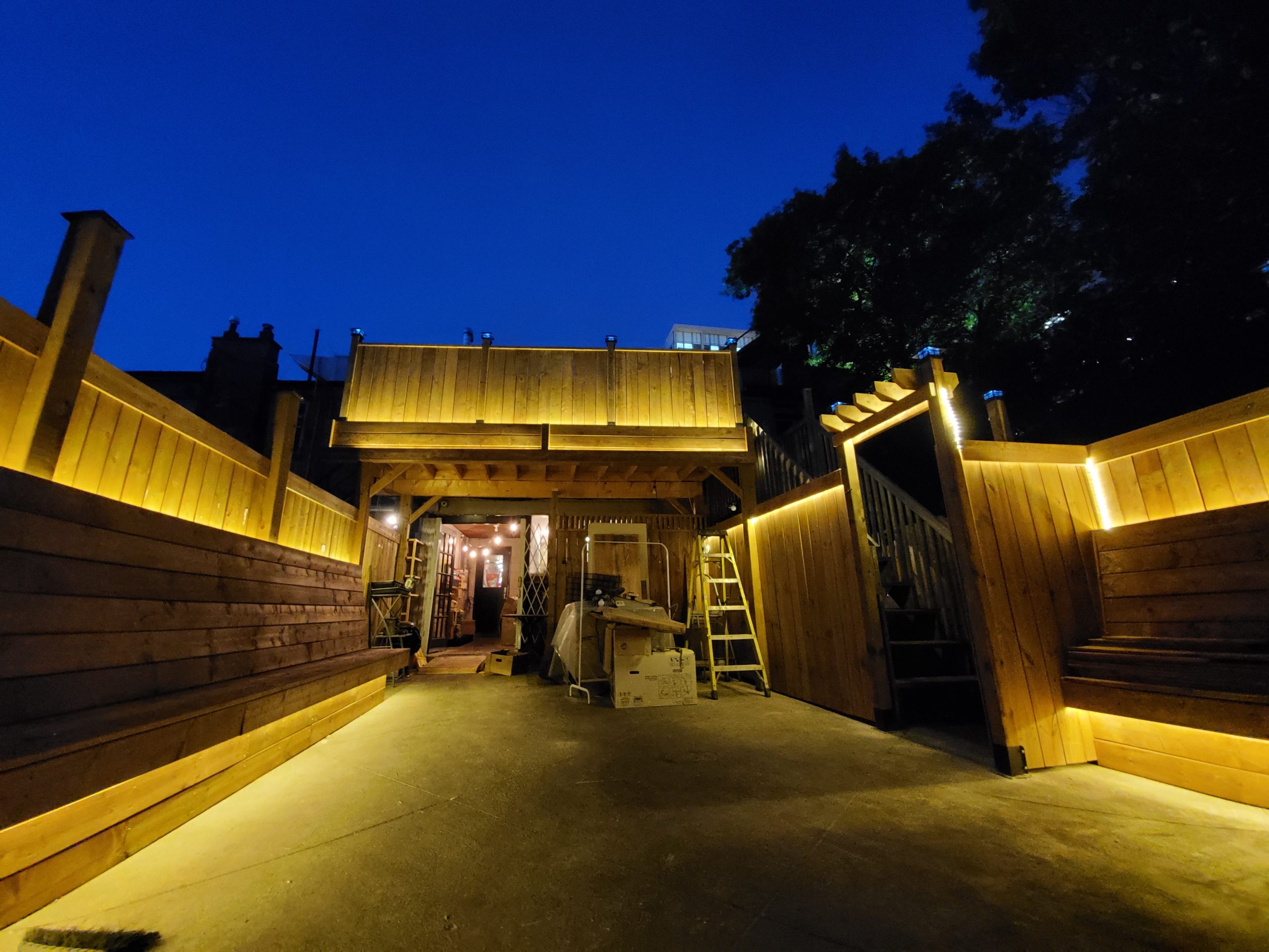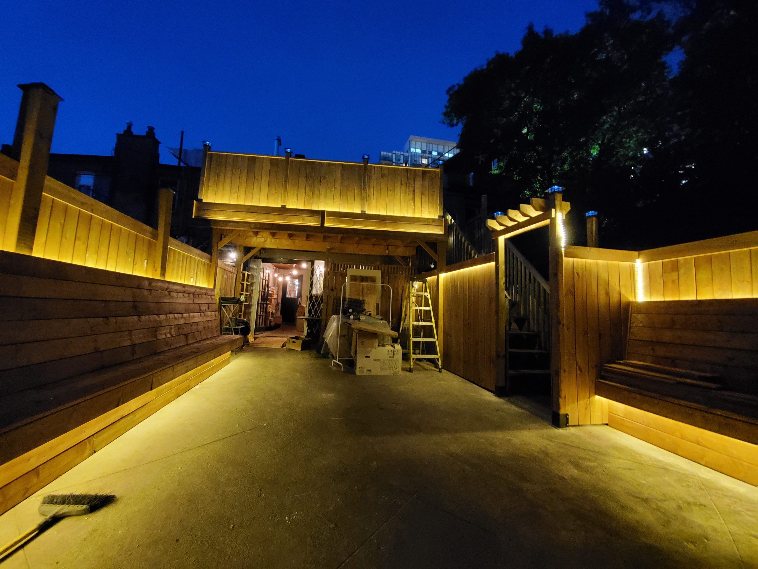 The primary feature is the custom-built back patio, designed to maximize seating capacity and ambiance. Constructed from natural wood, the patio features high privacy fencing and integrated tiered bench seating for communal dining. The construction included a gate entrance and multi-level design. Final touches involved staining the wood to a rich, warm tone and installing extensive hidden LED strip lighting along the benches and fence lines, creating a warm, inviting glow perfect for evening service. This build transformed an ordinary back area into a highly functional and attractive outdoor venue.