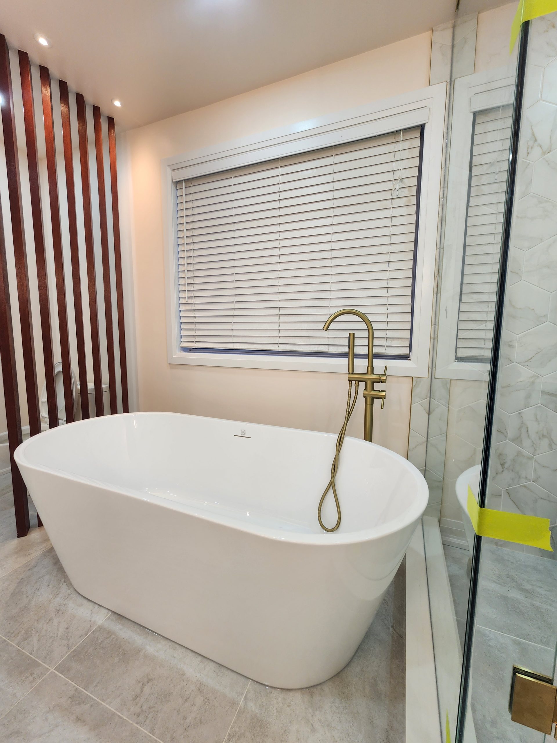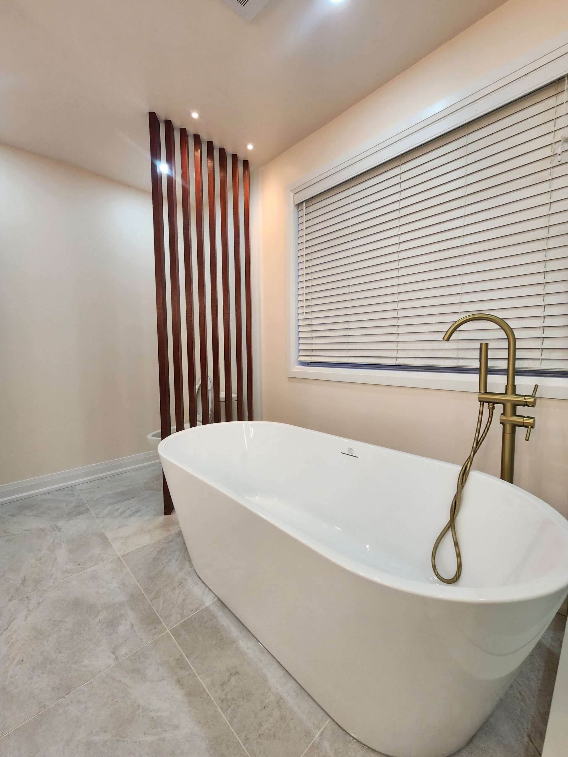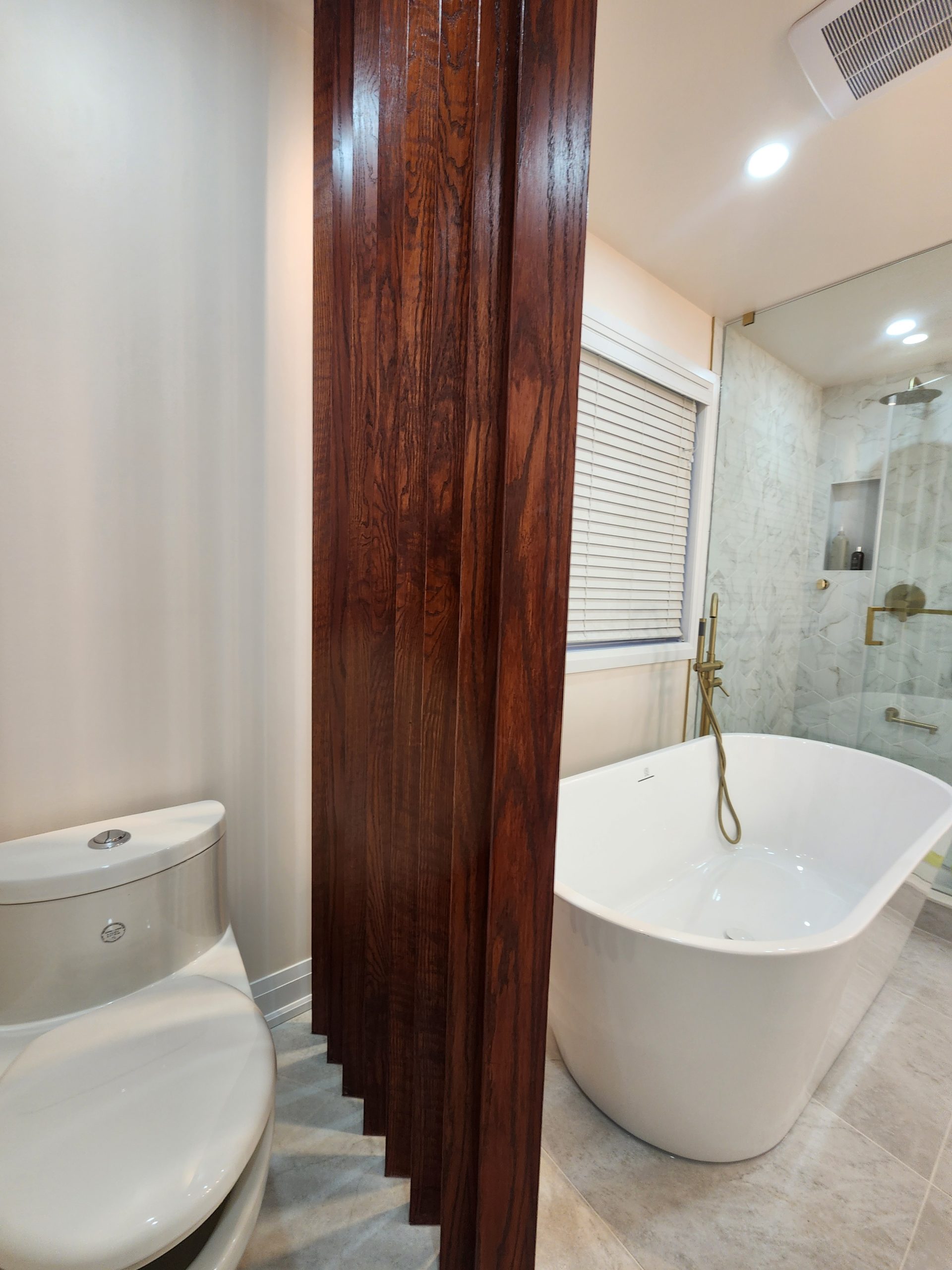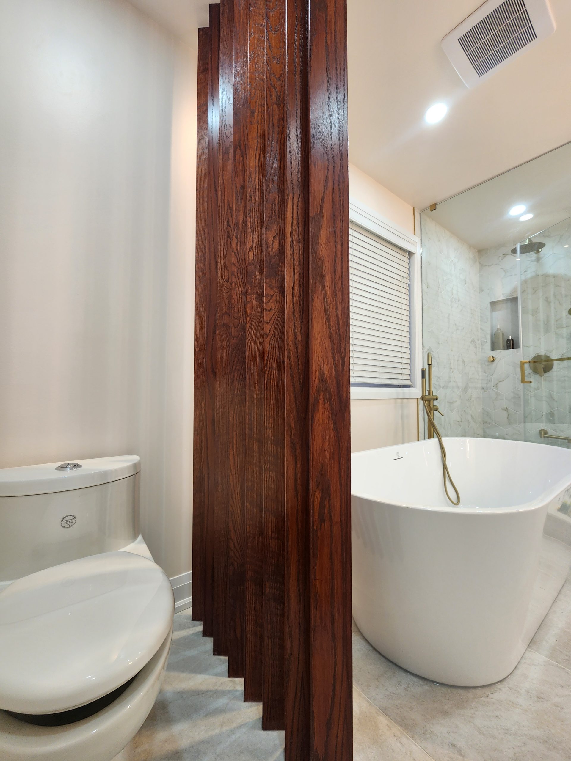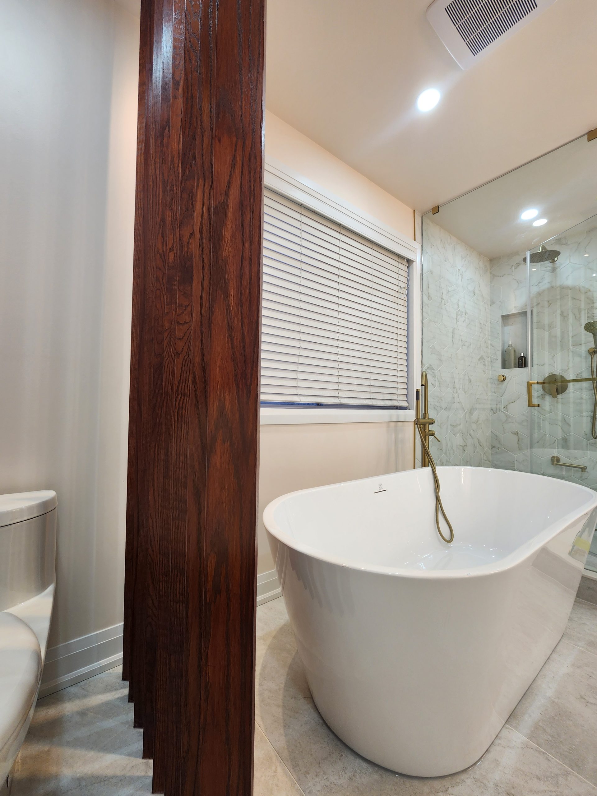 The ensuite received a complete luxury rebuild featuring a freestanding soaker tub paired with a floor-mounted brushed-gold filler, creating a bold focal point. A custom slat-wall detail adds warmth and architectural interest, balancing the soft marble-toned palette. The new walk-in shower includes large-format porcelain tiles, a marble hex accent wall, recessed niche, linear drain, and a dual-function gold rain head + handheld system for elevated comfort.