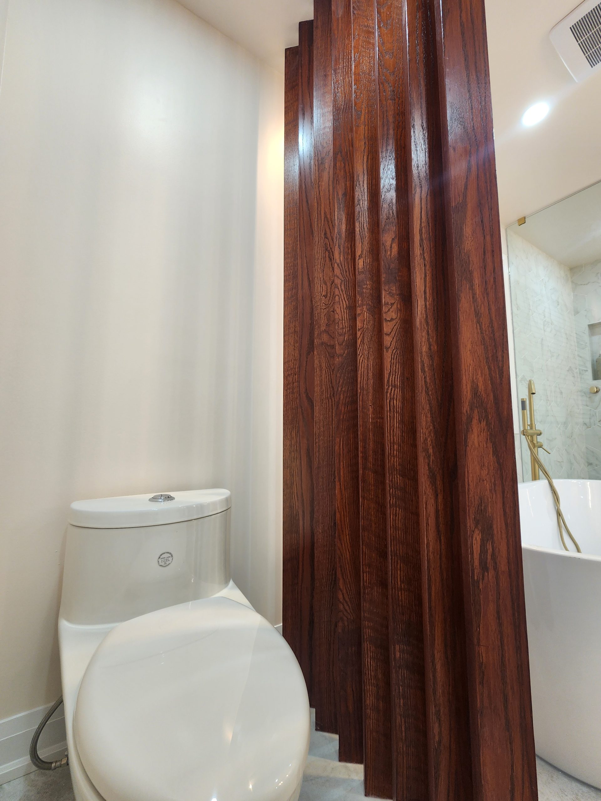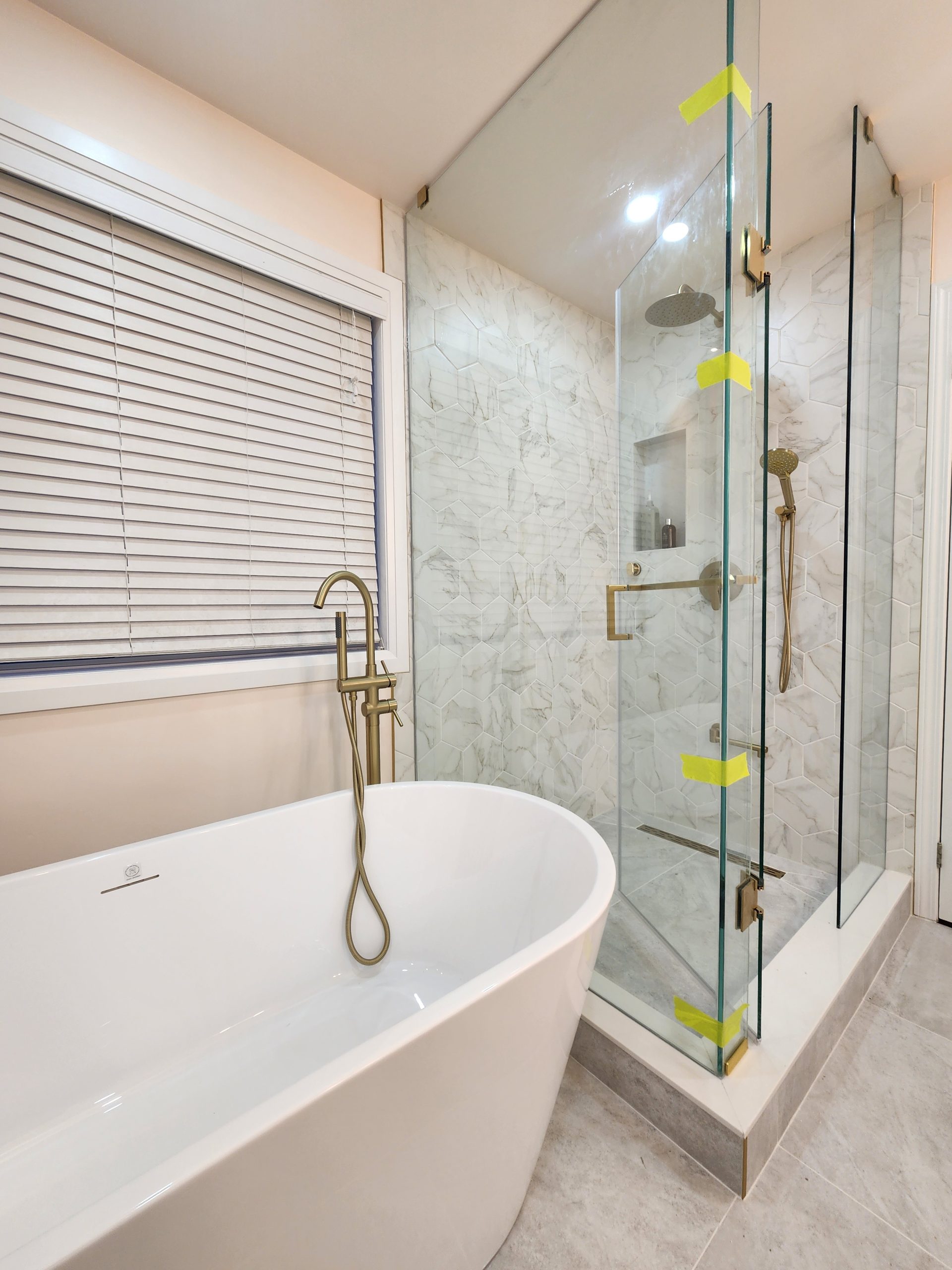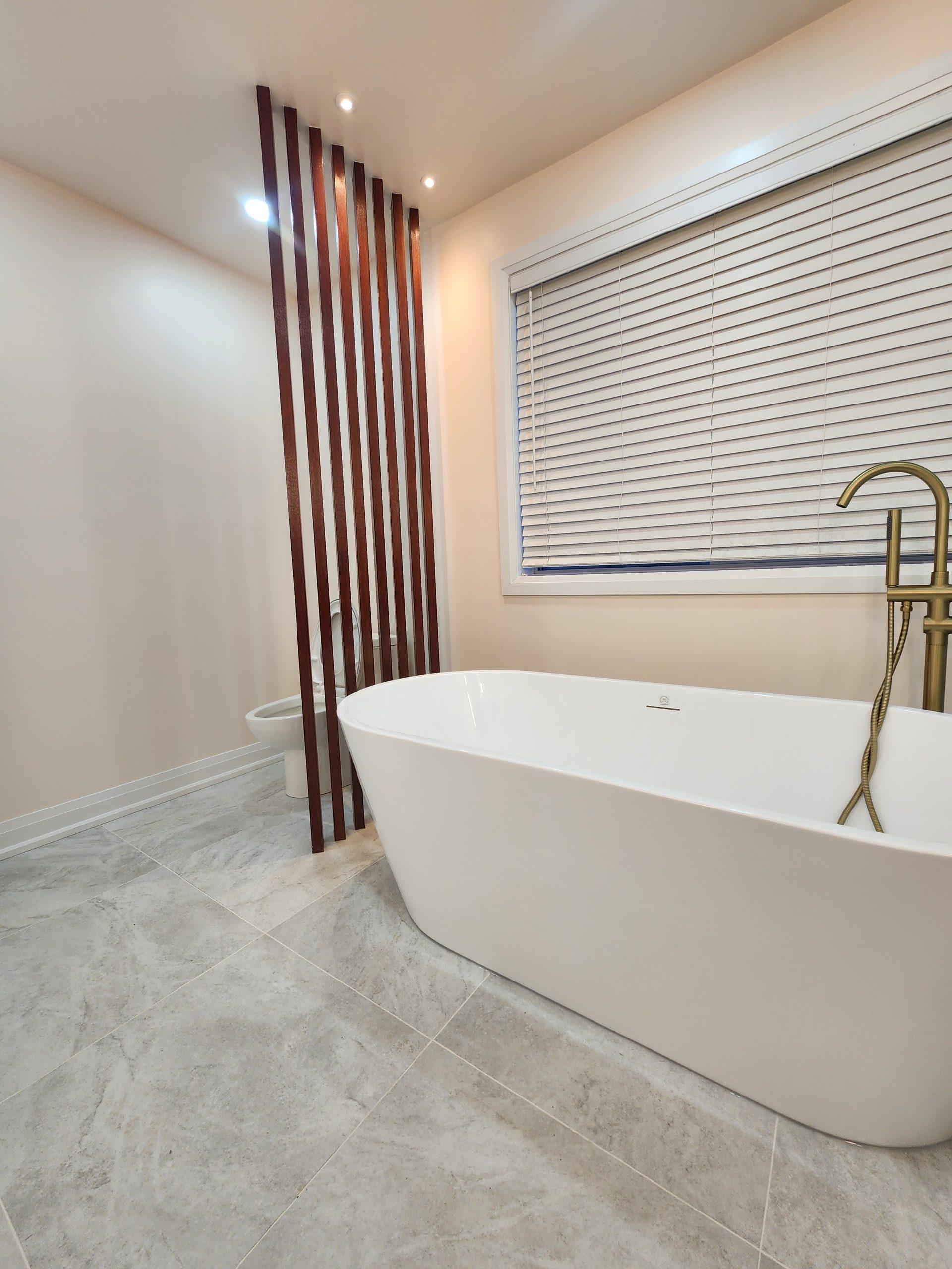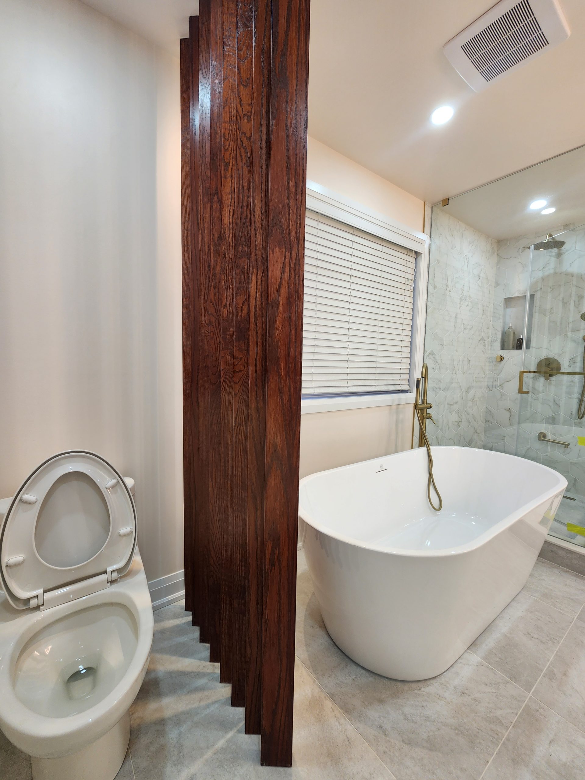 The ensuite received a complete luxury rebuild featuring a freestanding soaker tub paired with a floor-mounted brushed-gold filler, creating a bold focal point. A custom slat-wall detail adds warmth and architectural interest, balancing the soft marble-toned palette. The new walk-in shower includes large-format porcelain tiles, a marble hex accent wall, recessed niche, linear drain, and a dual-function gold rain head + handheld system for elevated comfort.