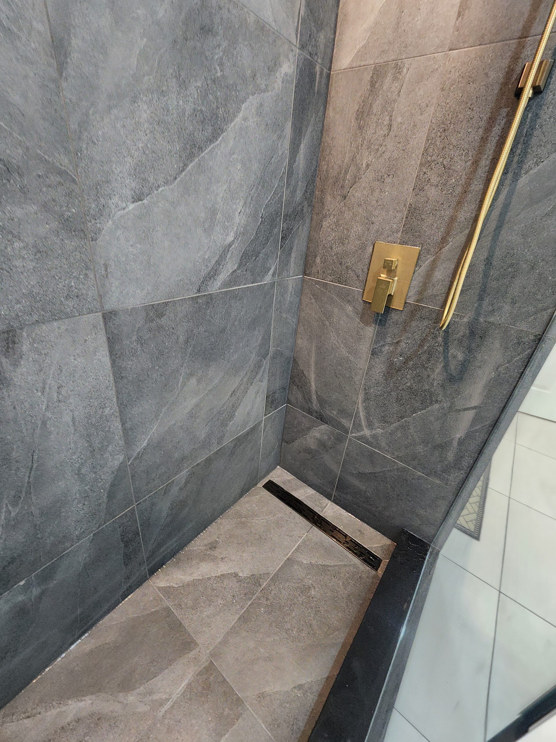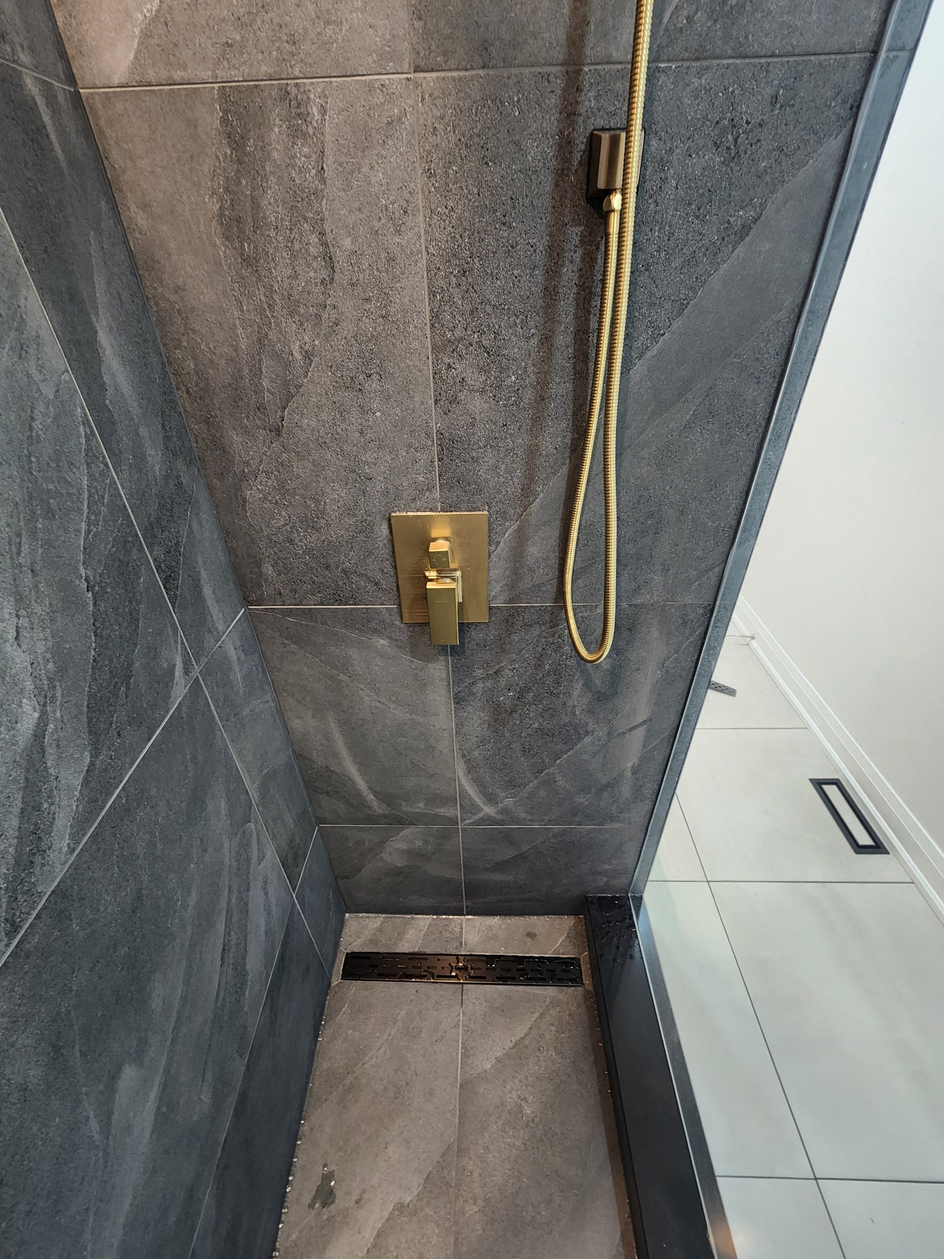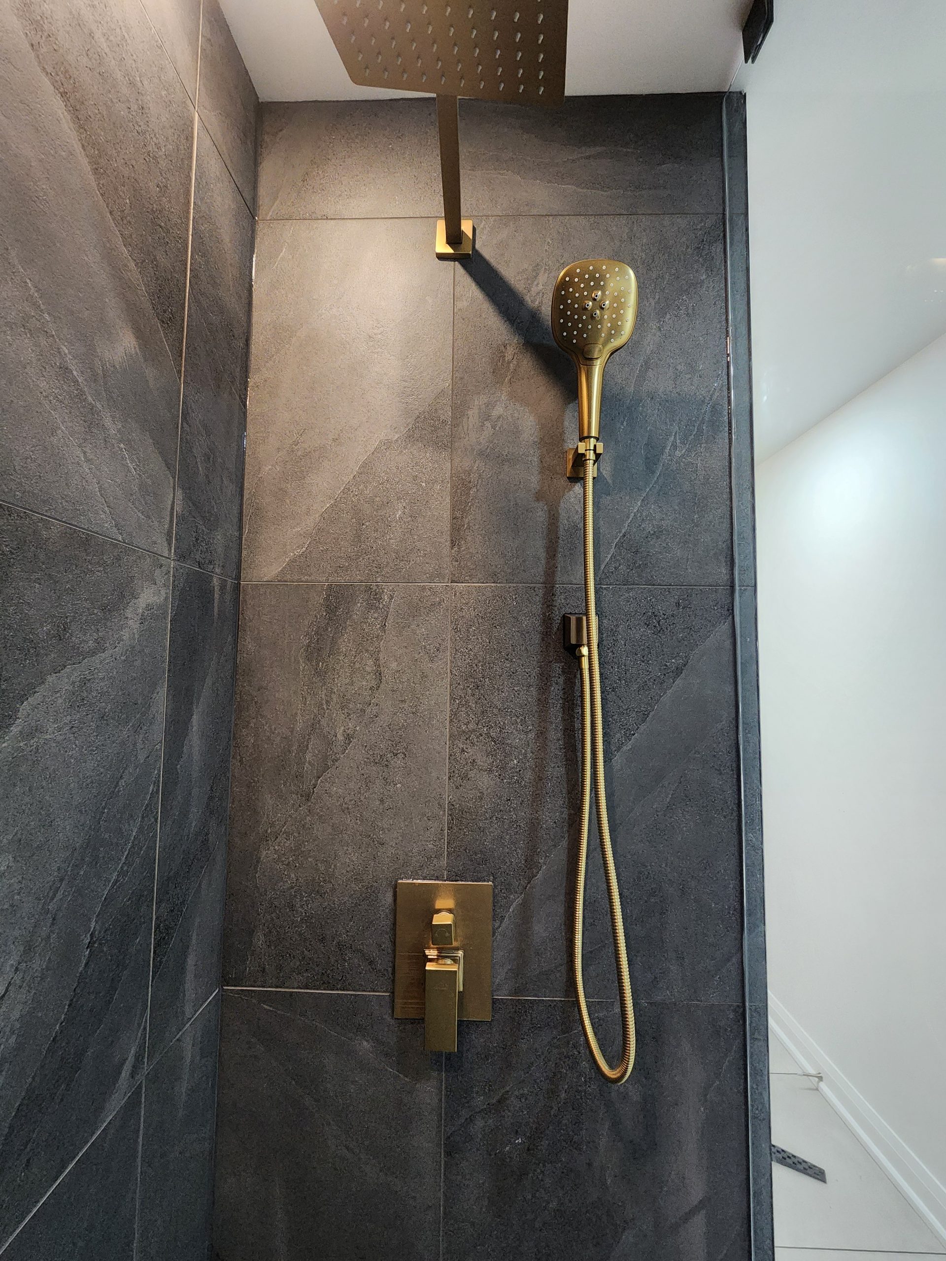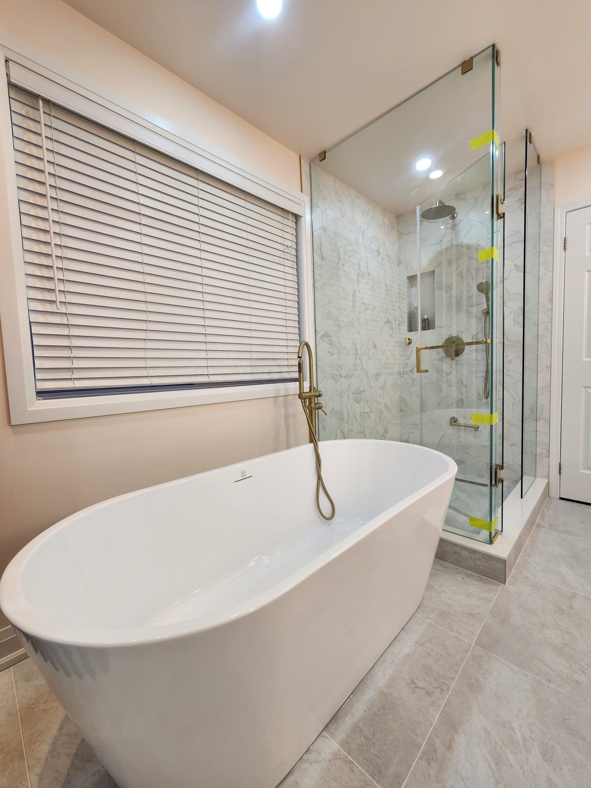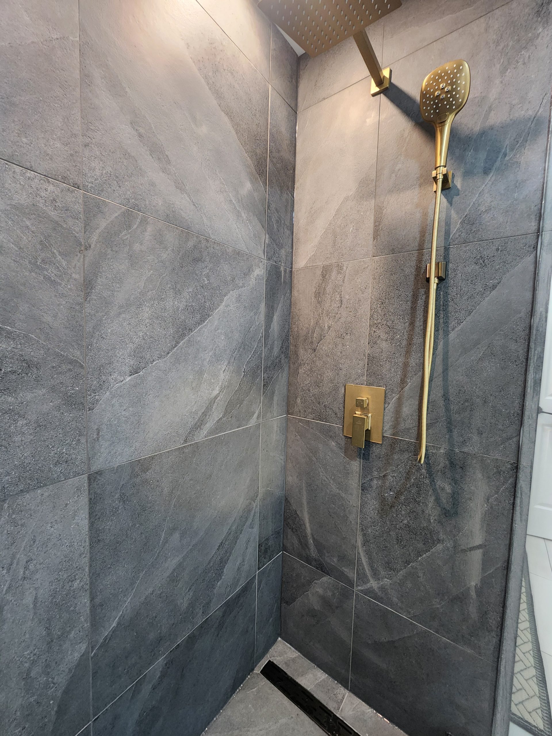 The ensuite received a complete luxury rebuild featuring a freestanding soaker tub paired with a floor-mounted brushed-gold filler, creating a bold focal point. A custom slat-wall detail adds warmth and architectural interest, balancing the soft marble-toned palette. The new walk-in shower includes large-format porcelain tiles, a marble hex accent wall, recessed niche, linear drain, and a dual-function gold rain head + handheld system for elevated comfort.
