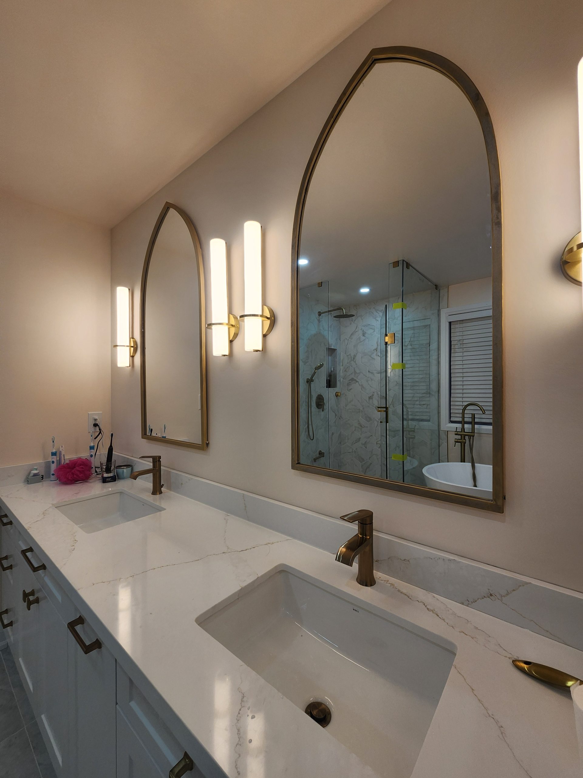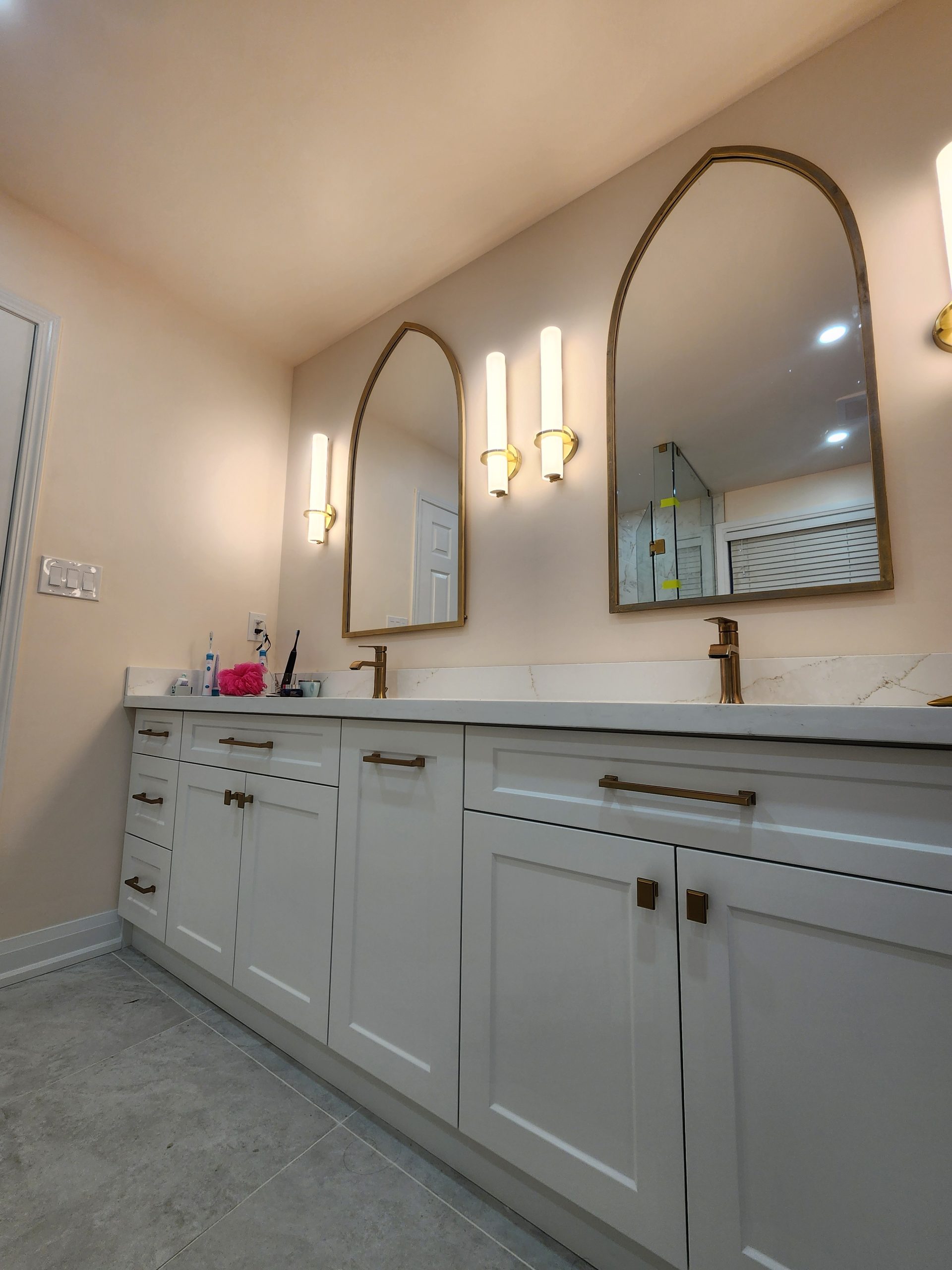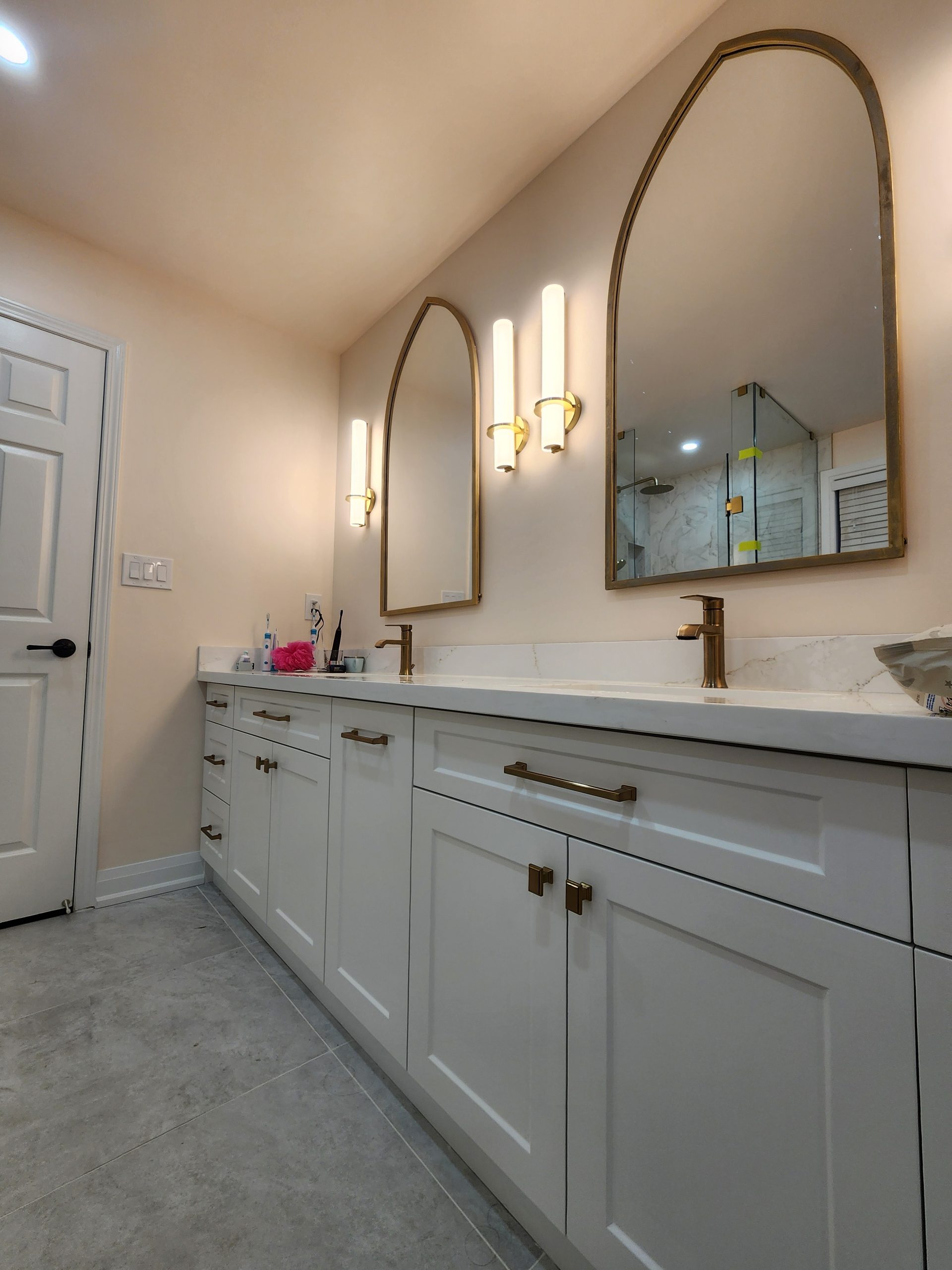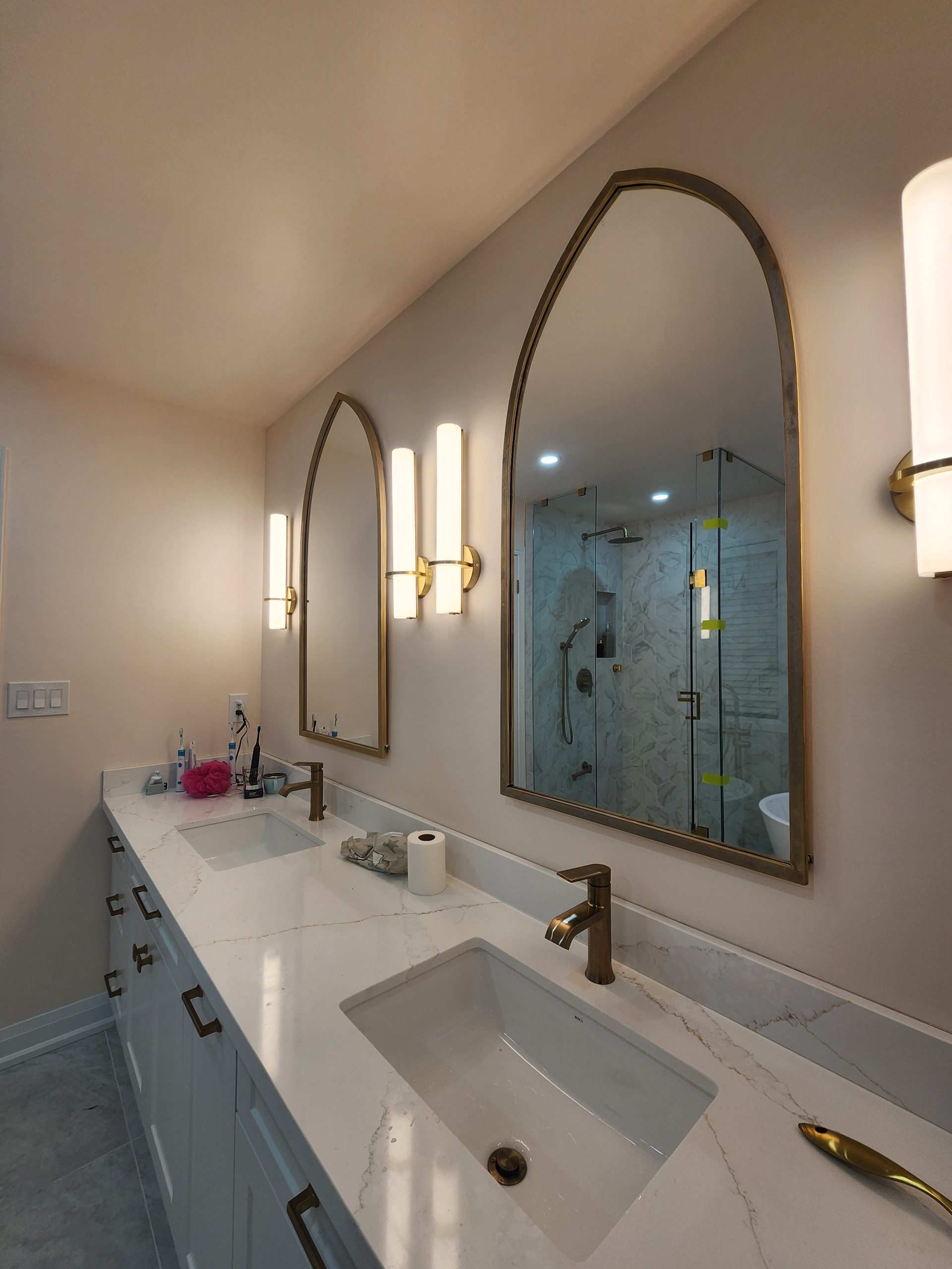 Across the room, a full-length double vanity with shaker cabinetry and premium quartz counters provides ample storage and a clean, tailored appearance. Arched mirrors and integrated wall sconces bring a soft modern ambiance, complementing the warm metallic fixtures throughout.