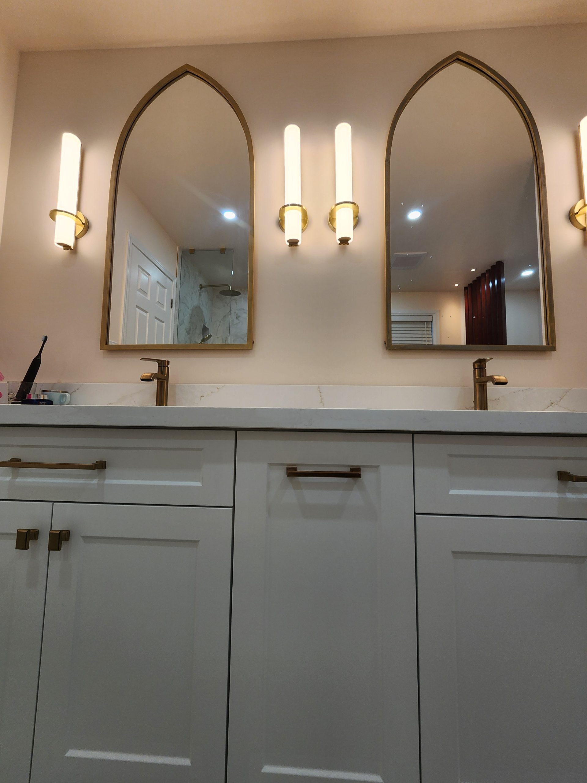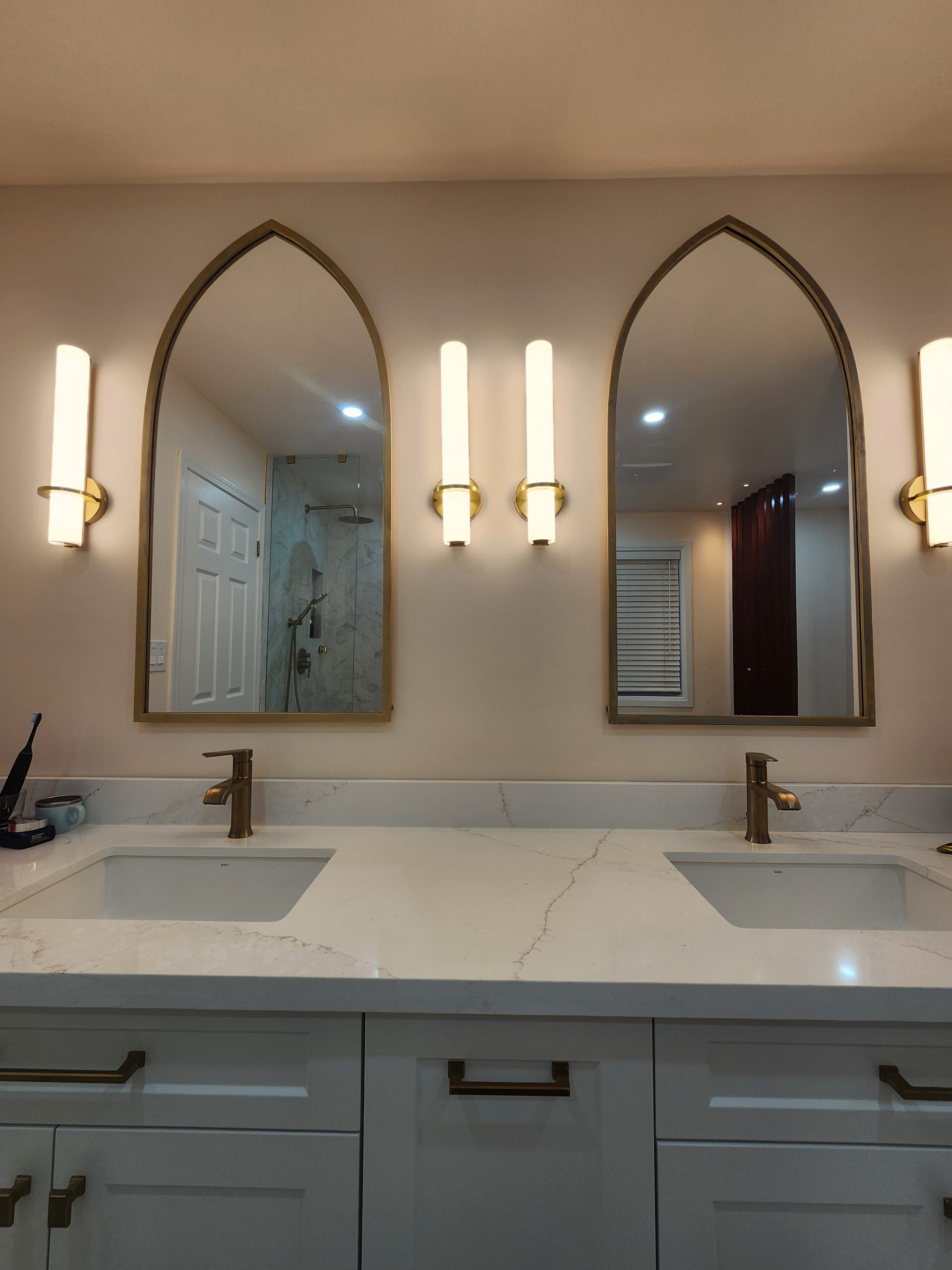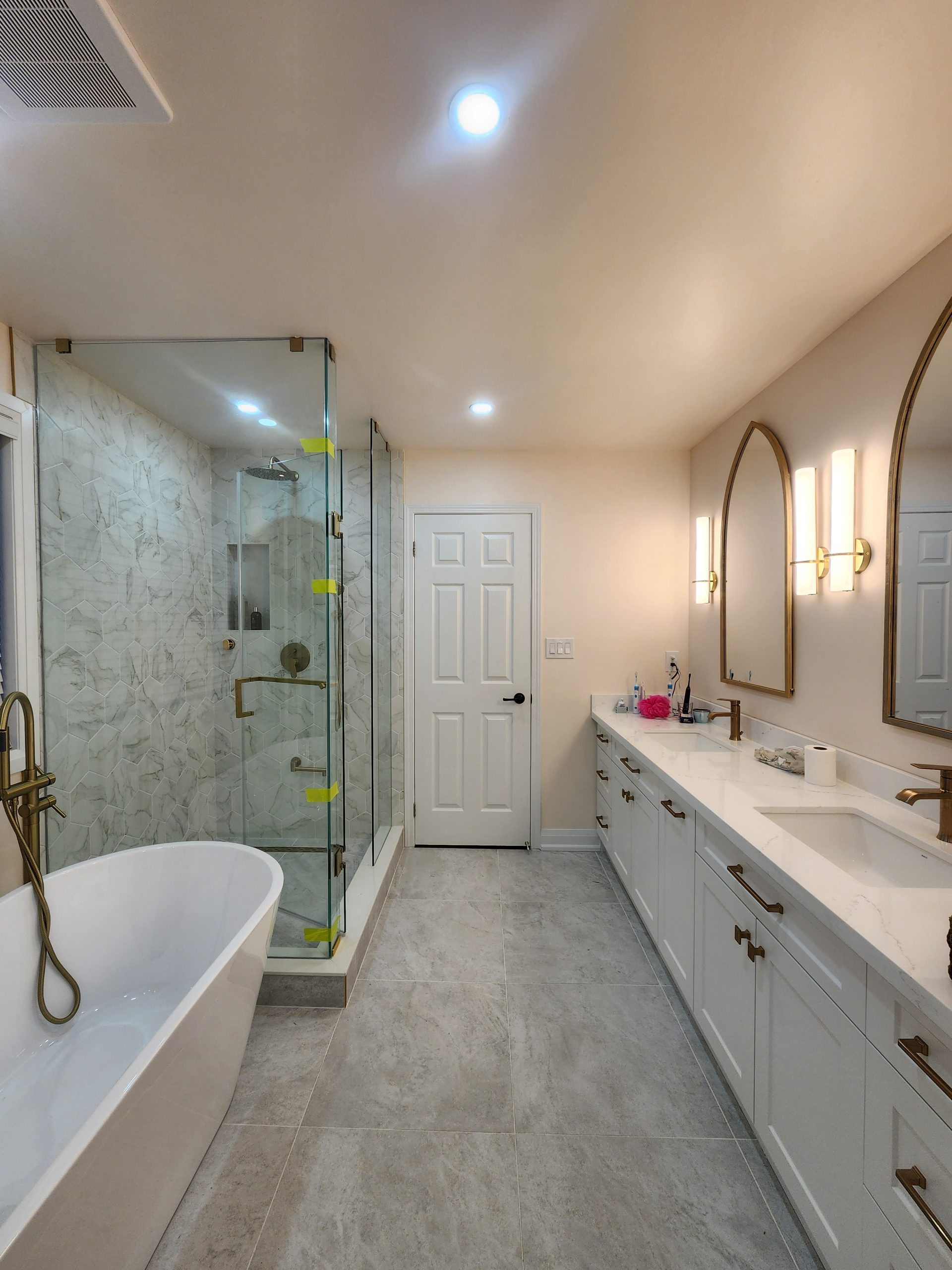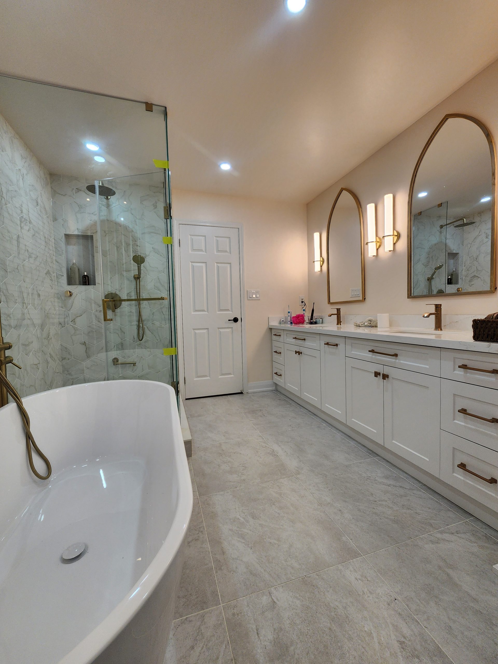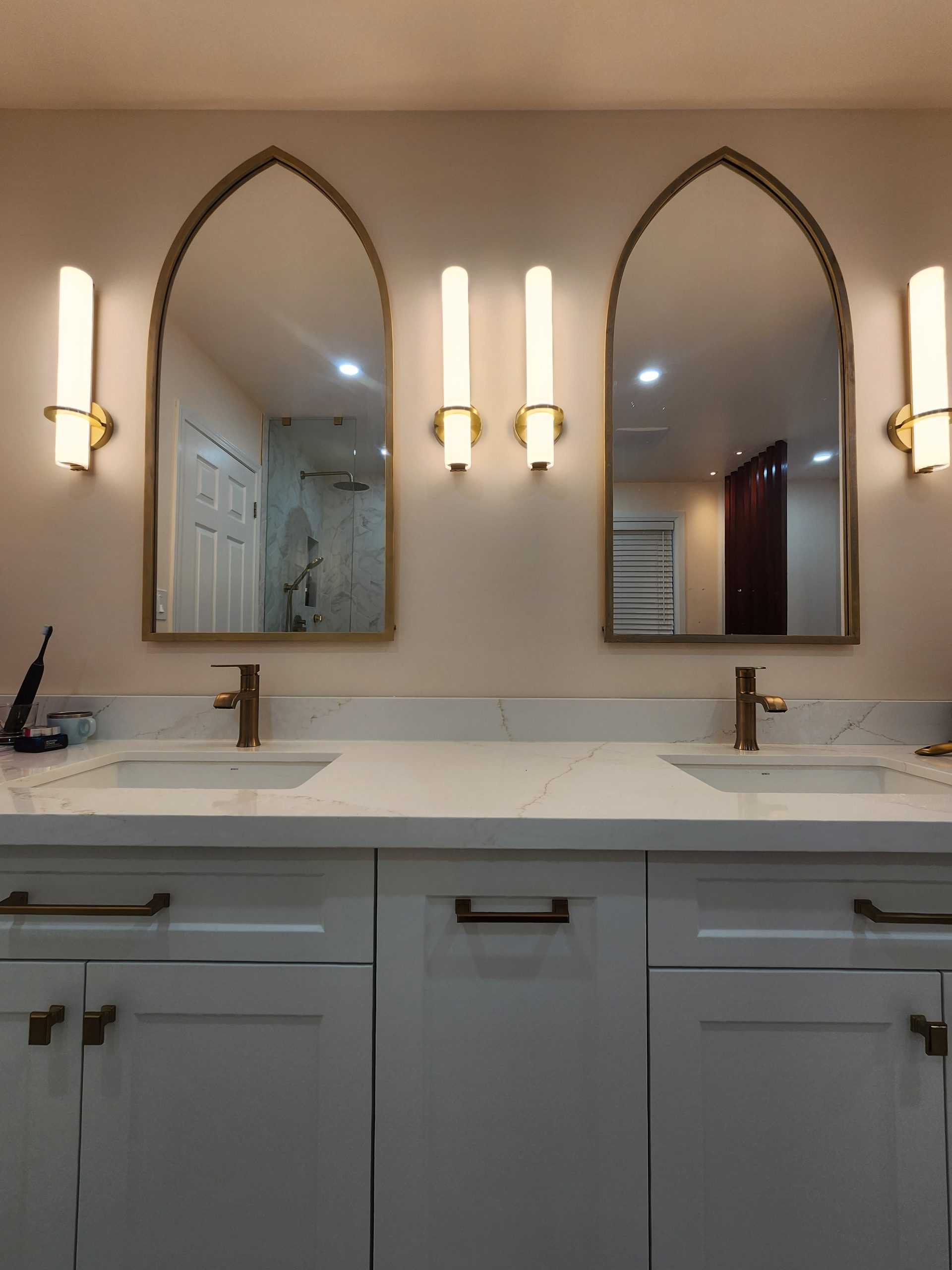 Across the room, a full-length double vanity with shaker cabinetry and premium quartz counters provides ample storage and a clean, tailored appearance. Arched mirrors and integrated wall sconces bring a soft modern ambiance, complementing the warm metallic fixtures throughout.