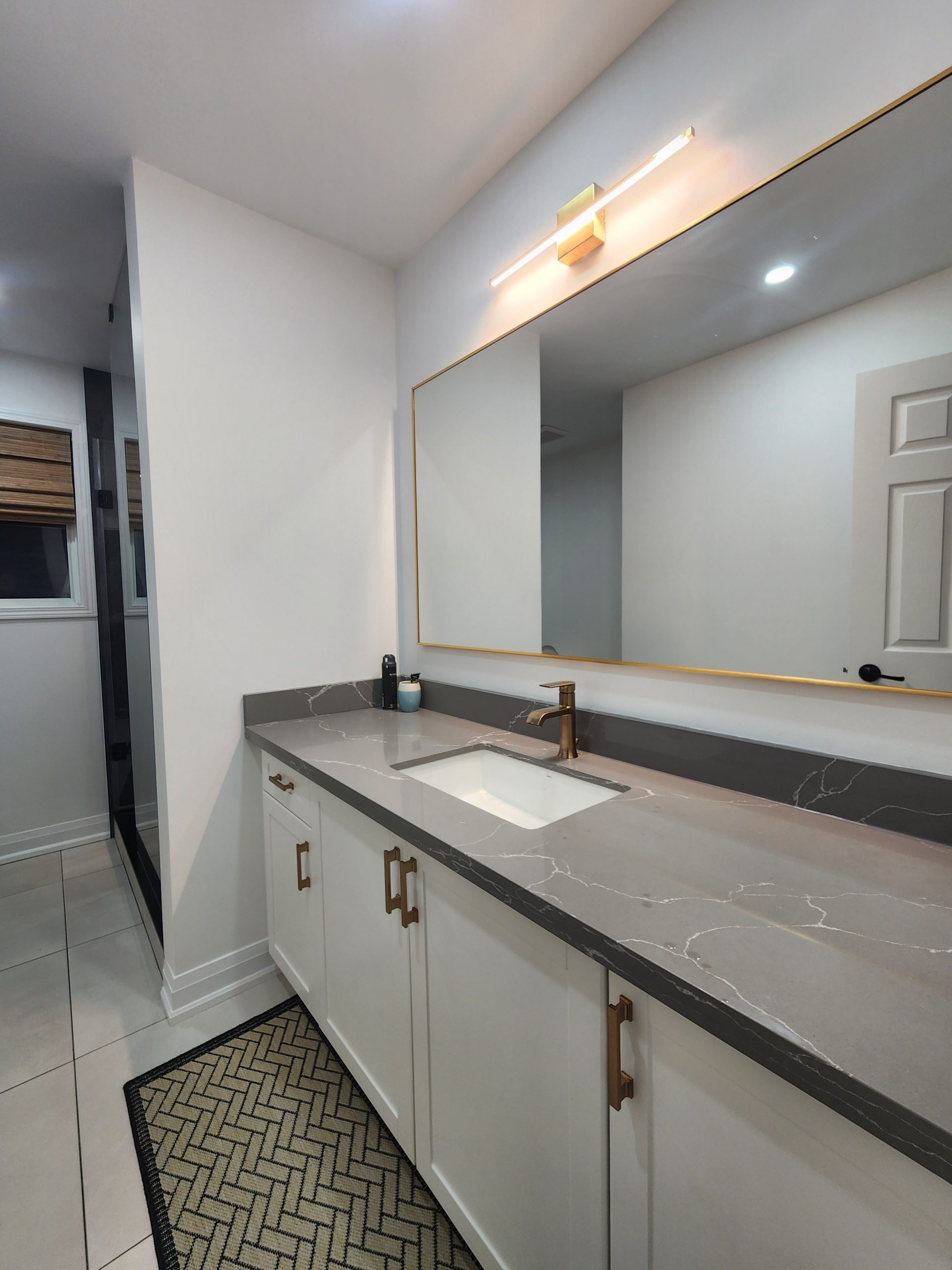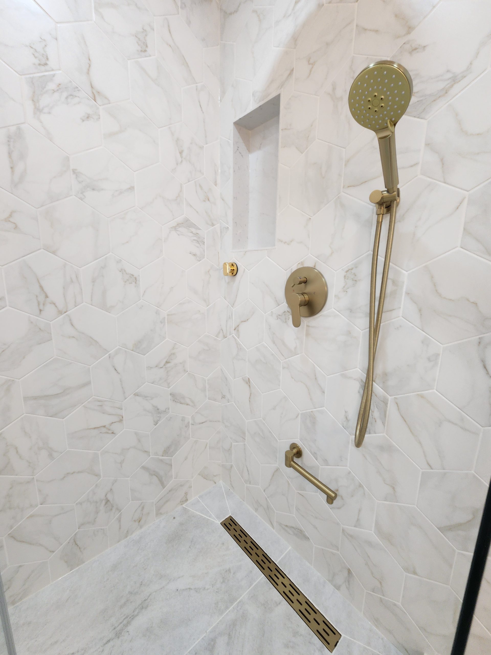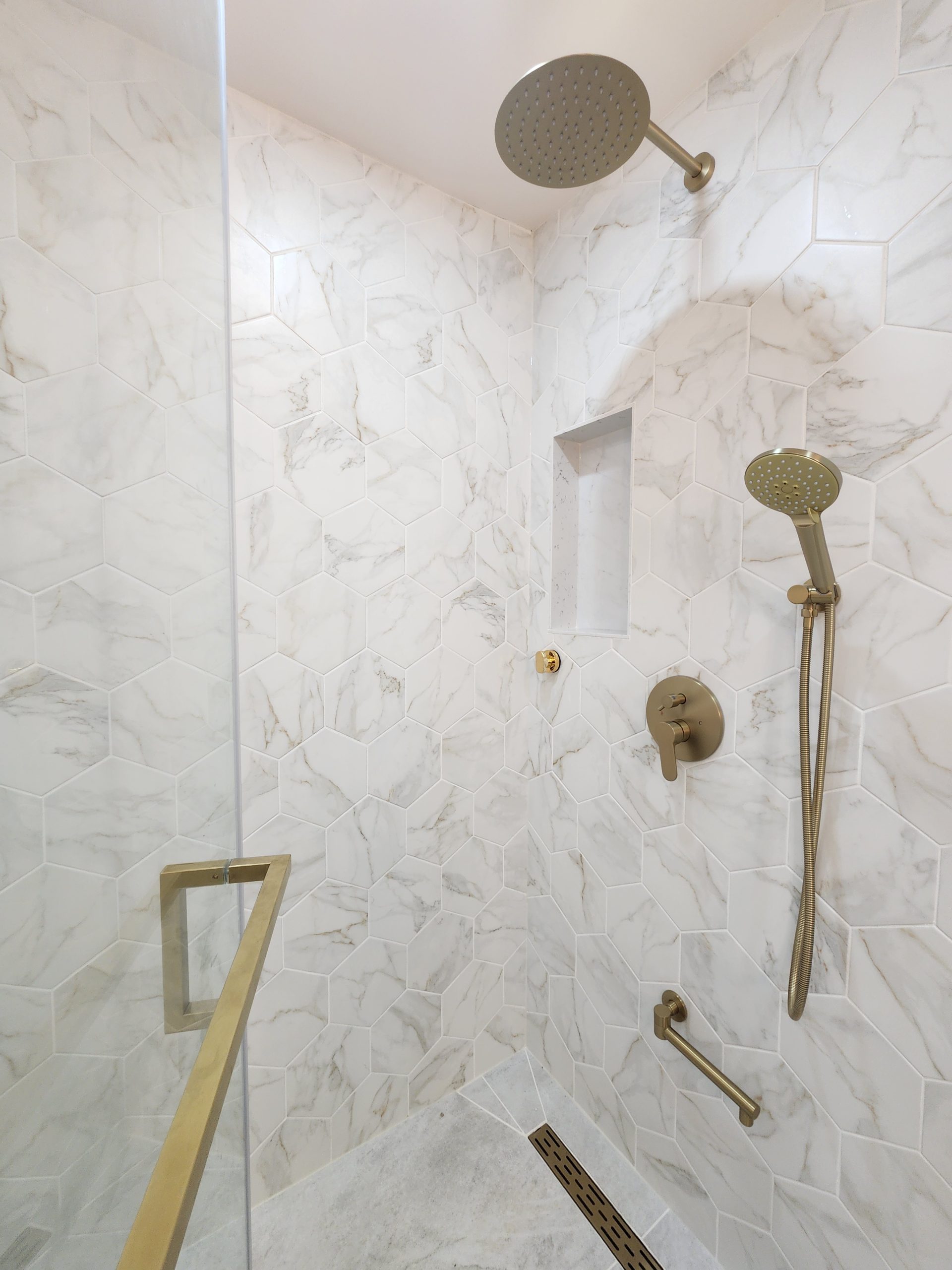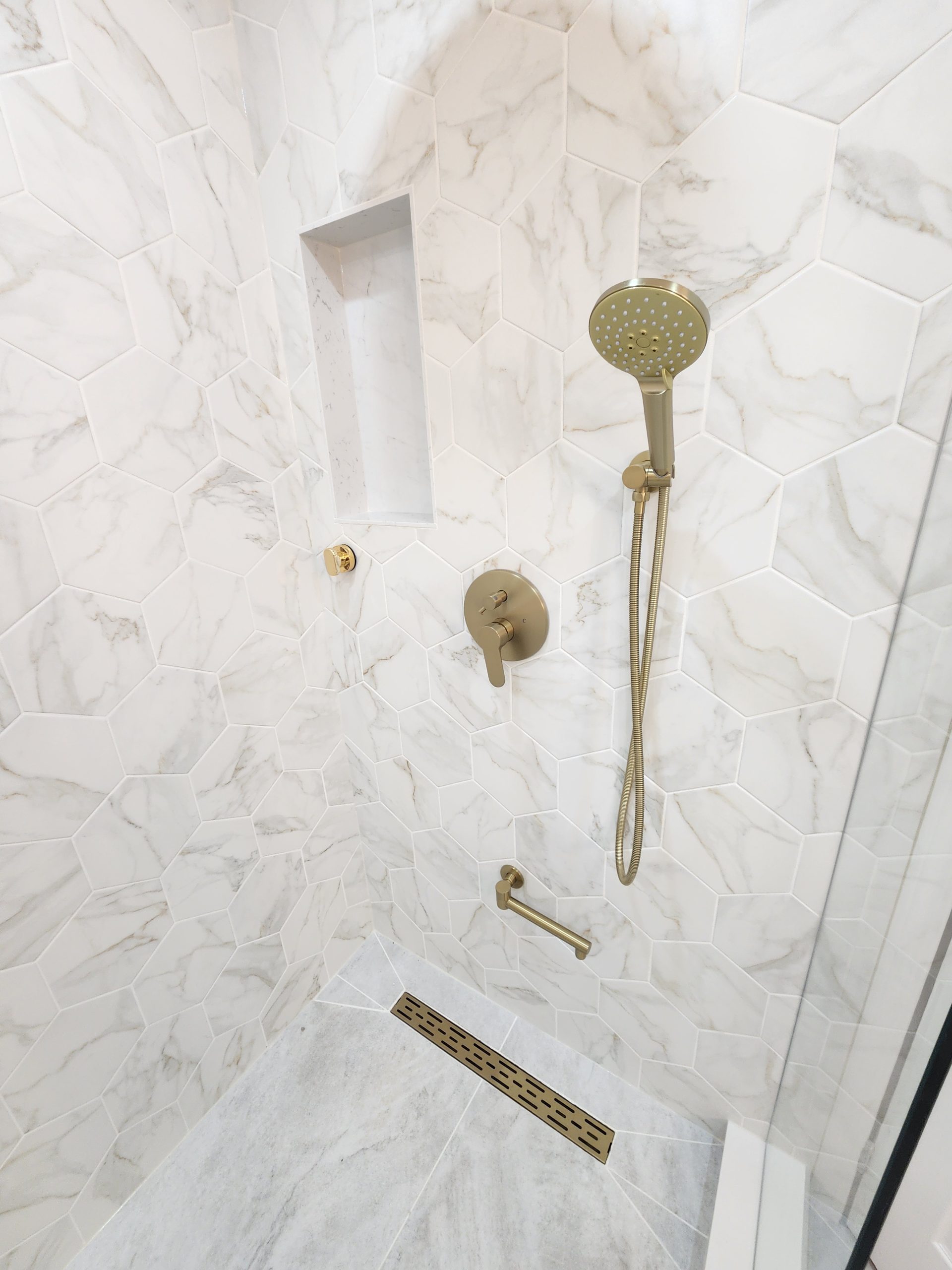 The secondary bathroom was also fully remodeled with a sleek quartz-top vanity, modern gold hardware, upgraded lighting, and a new porcelain tile shower featuring a white marble hex pattern and matching gold fixtures.