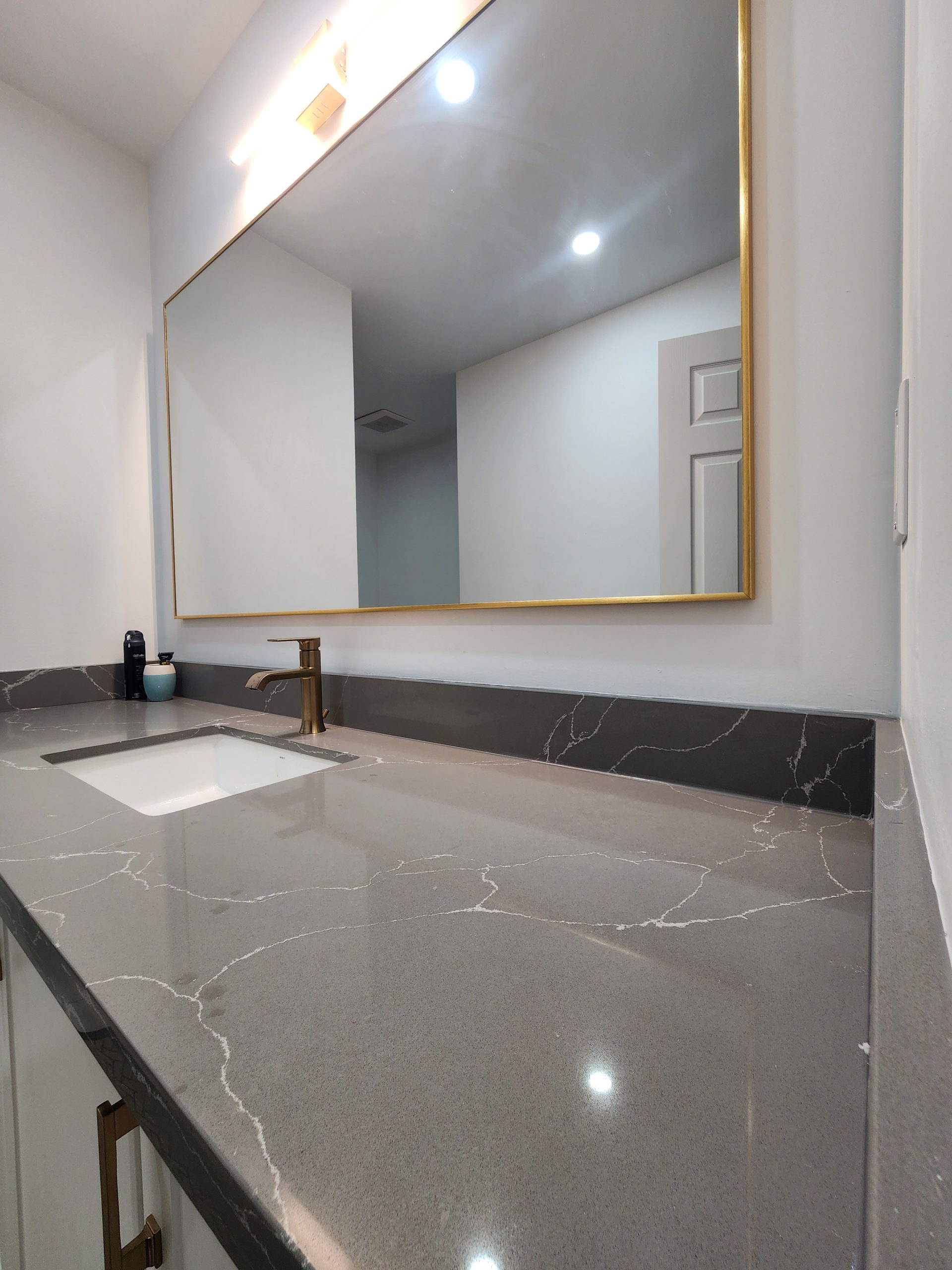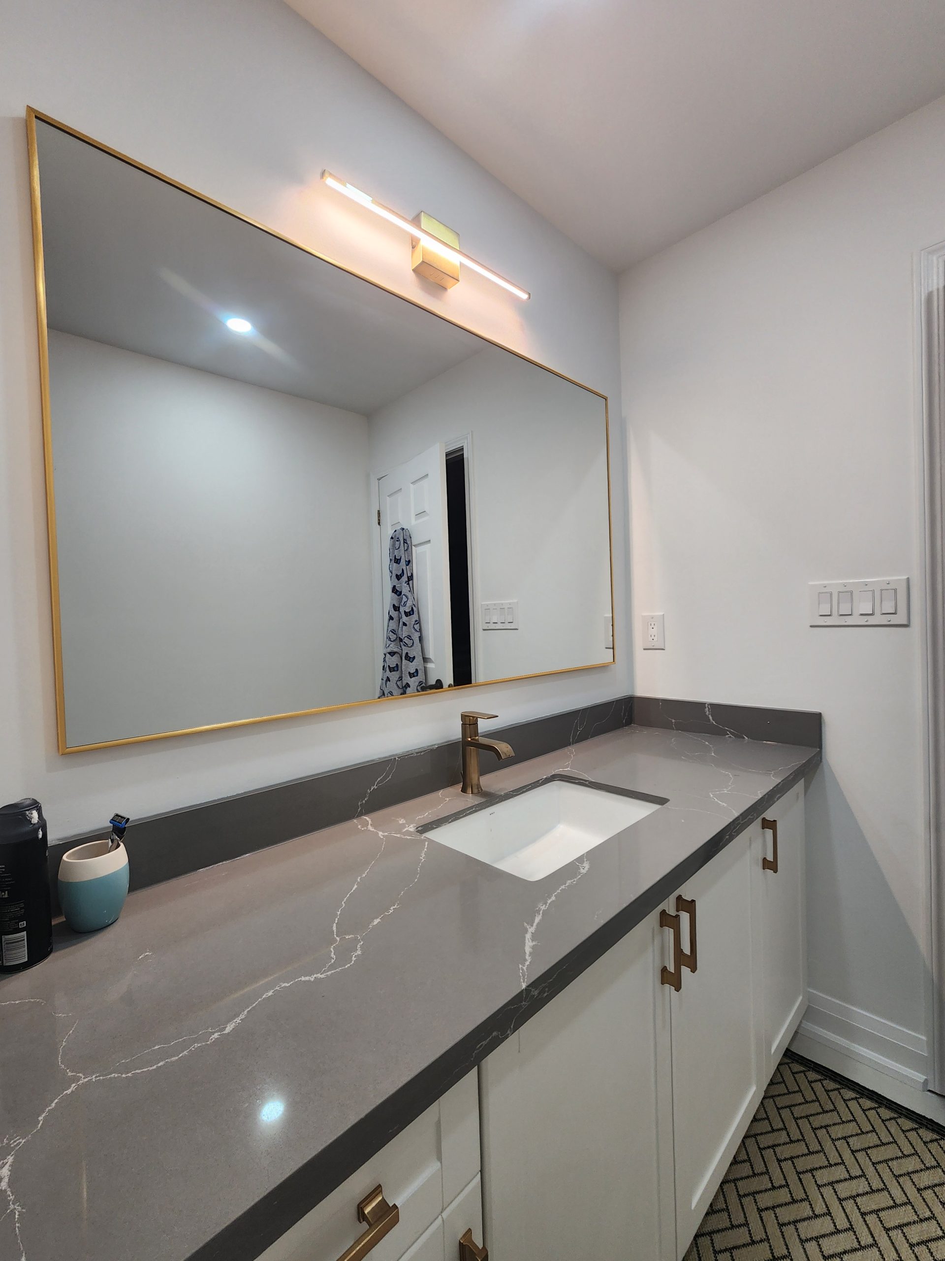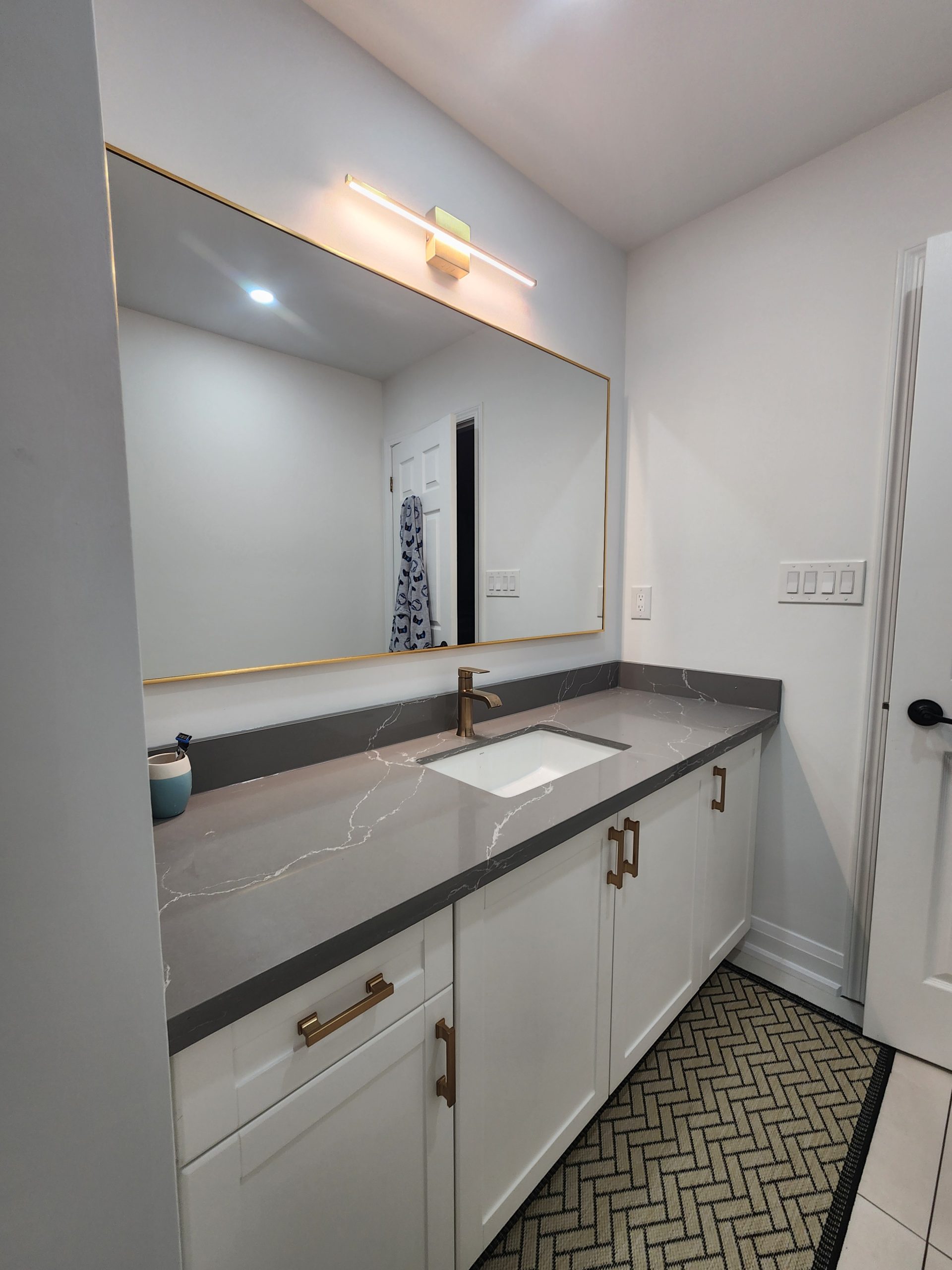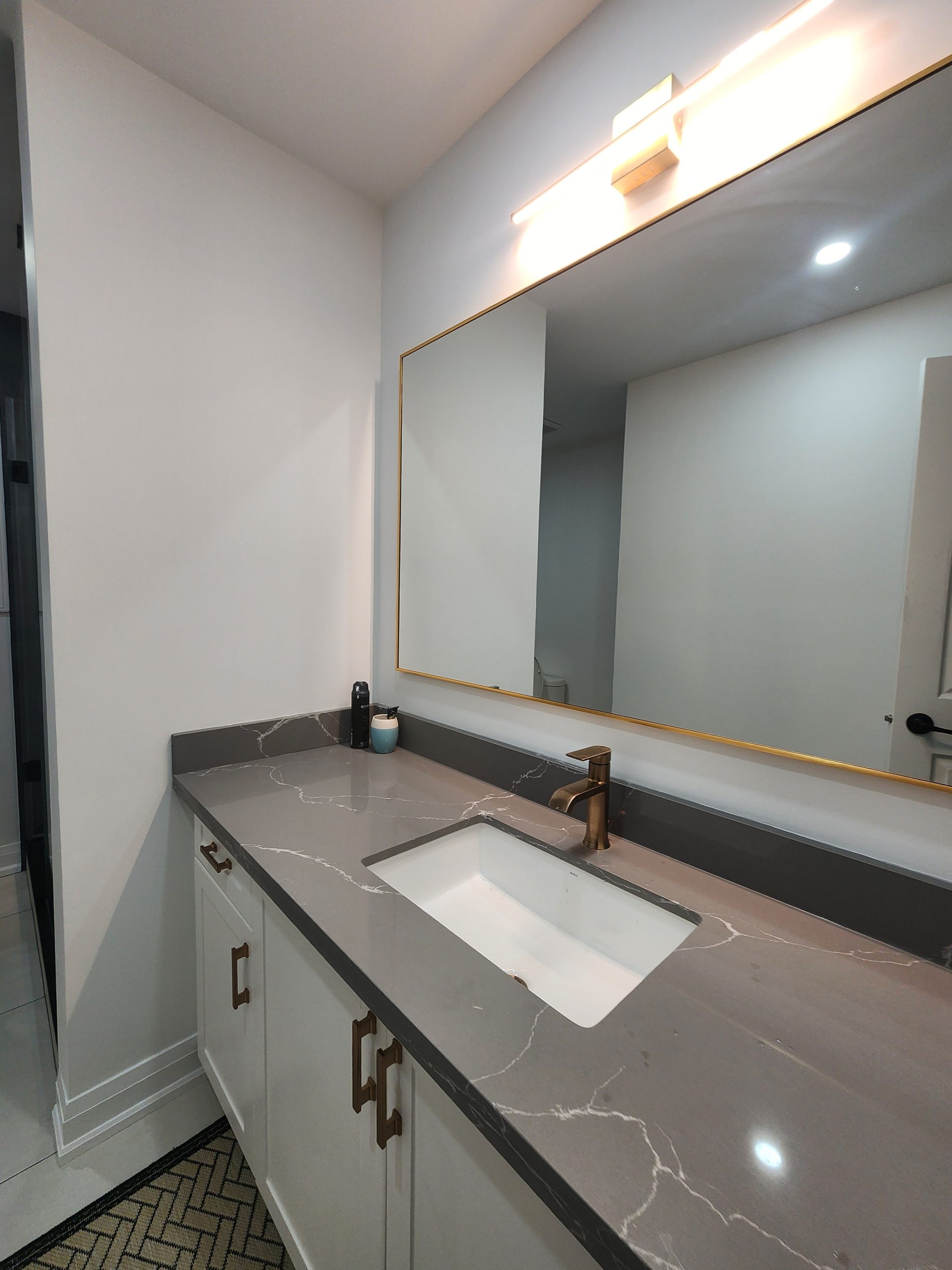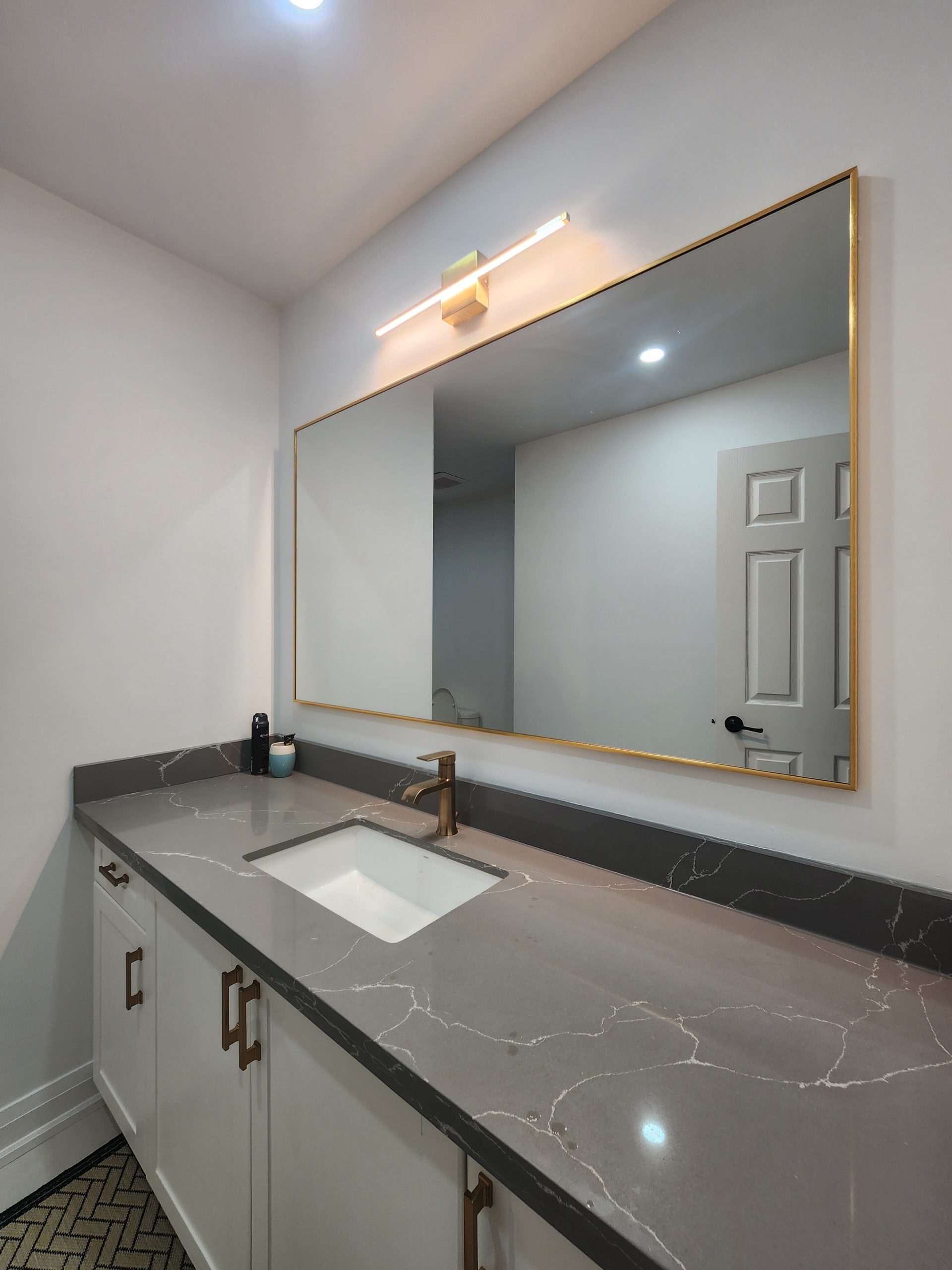 The secondary bathroom was also fully remodeled with a sleek quartz-top vanity, modern gold hardware, upgraded lighting, and a new porcelain tile shower featuring a white marble hex pattern and matching gold fixtures.