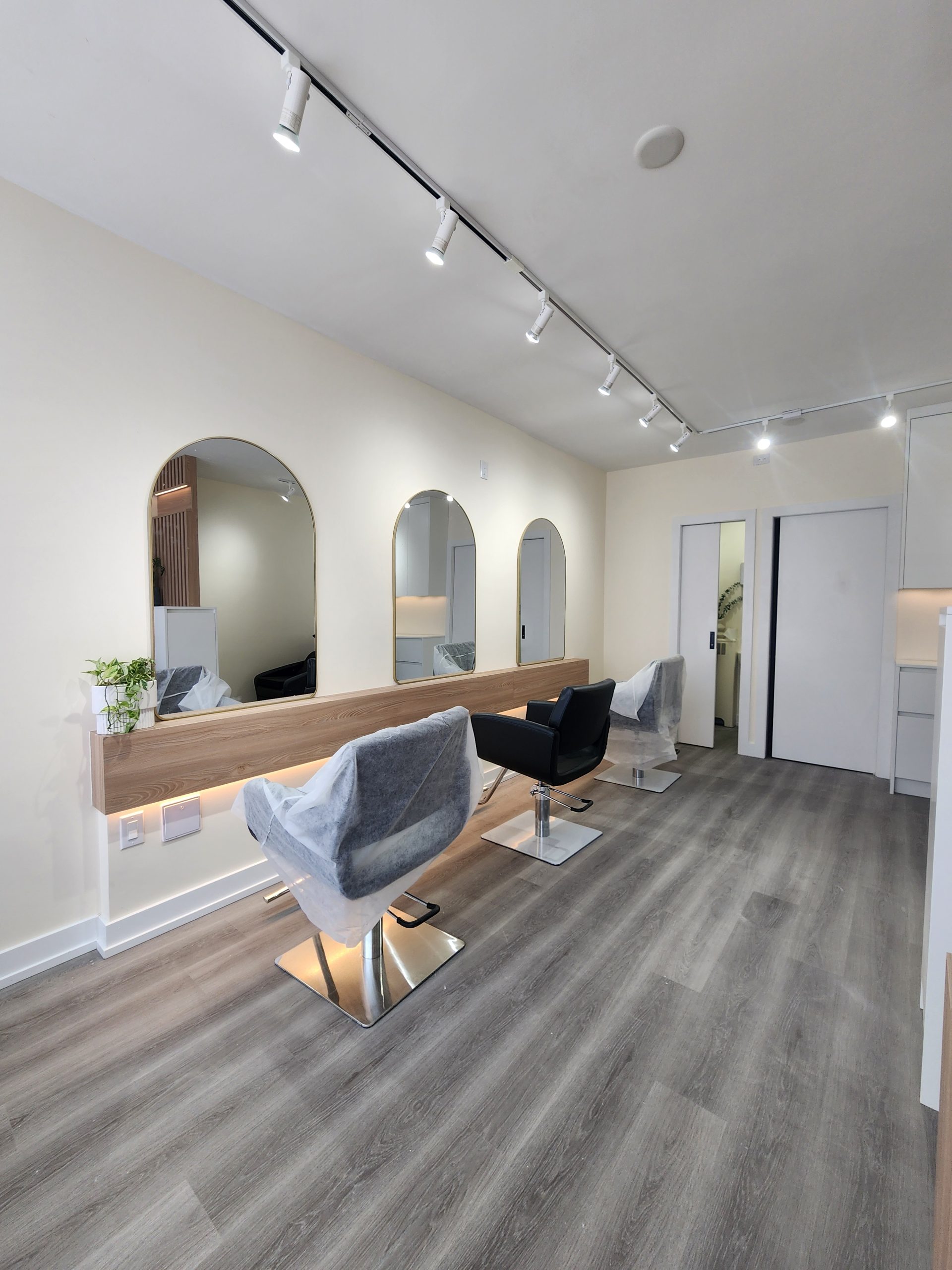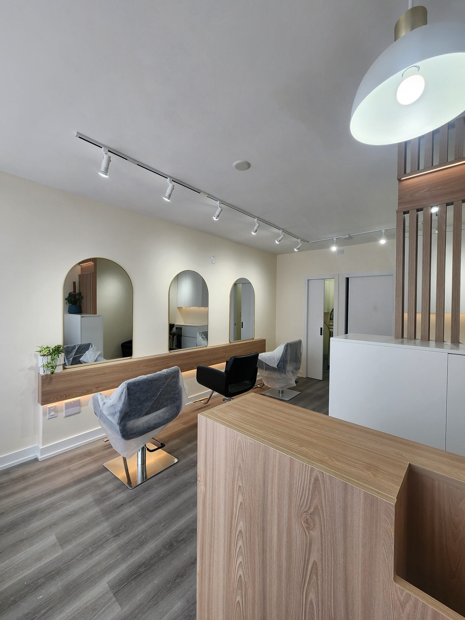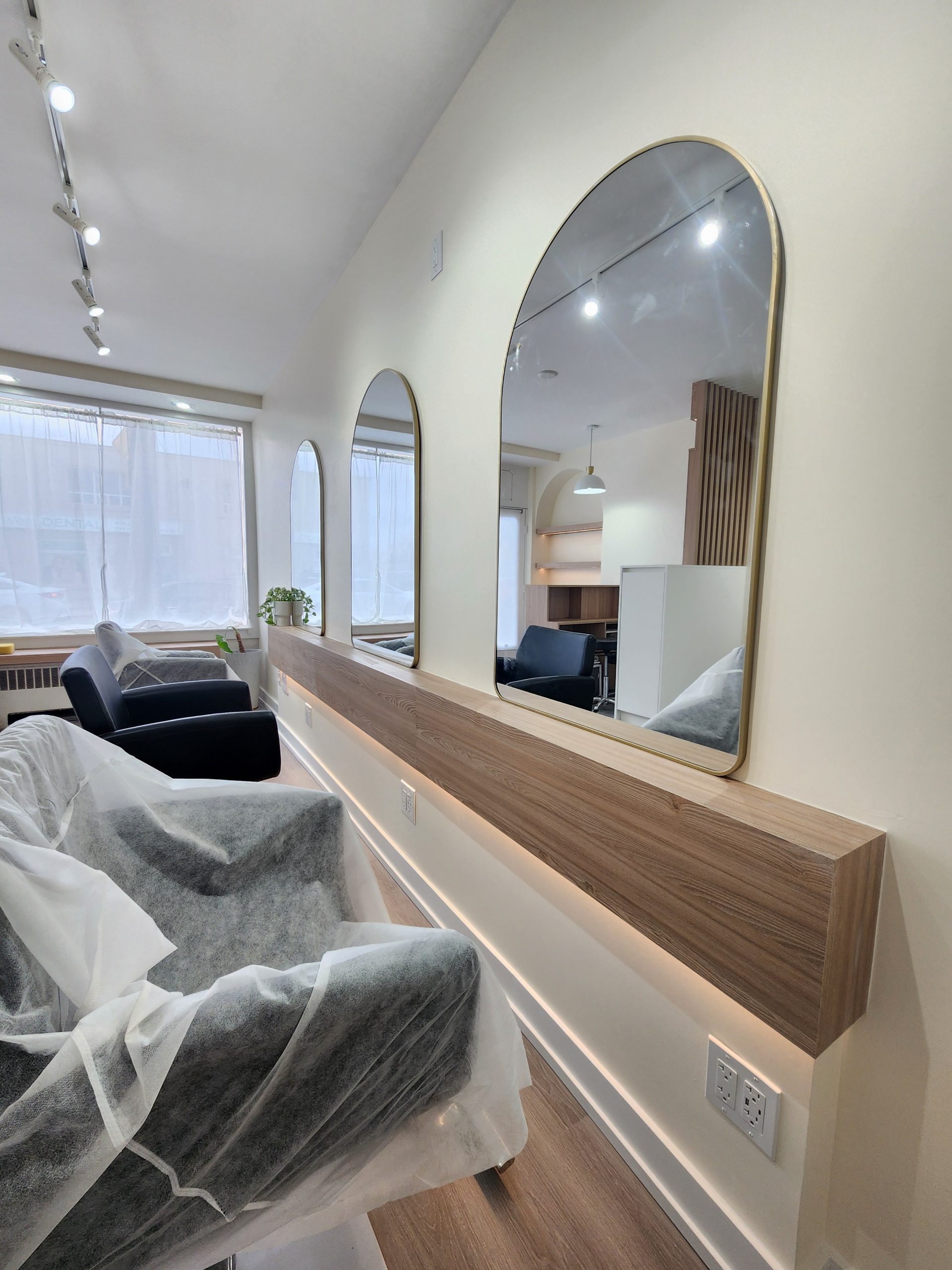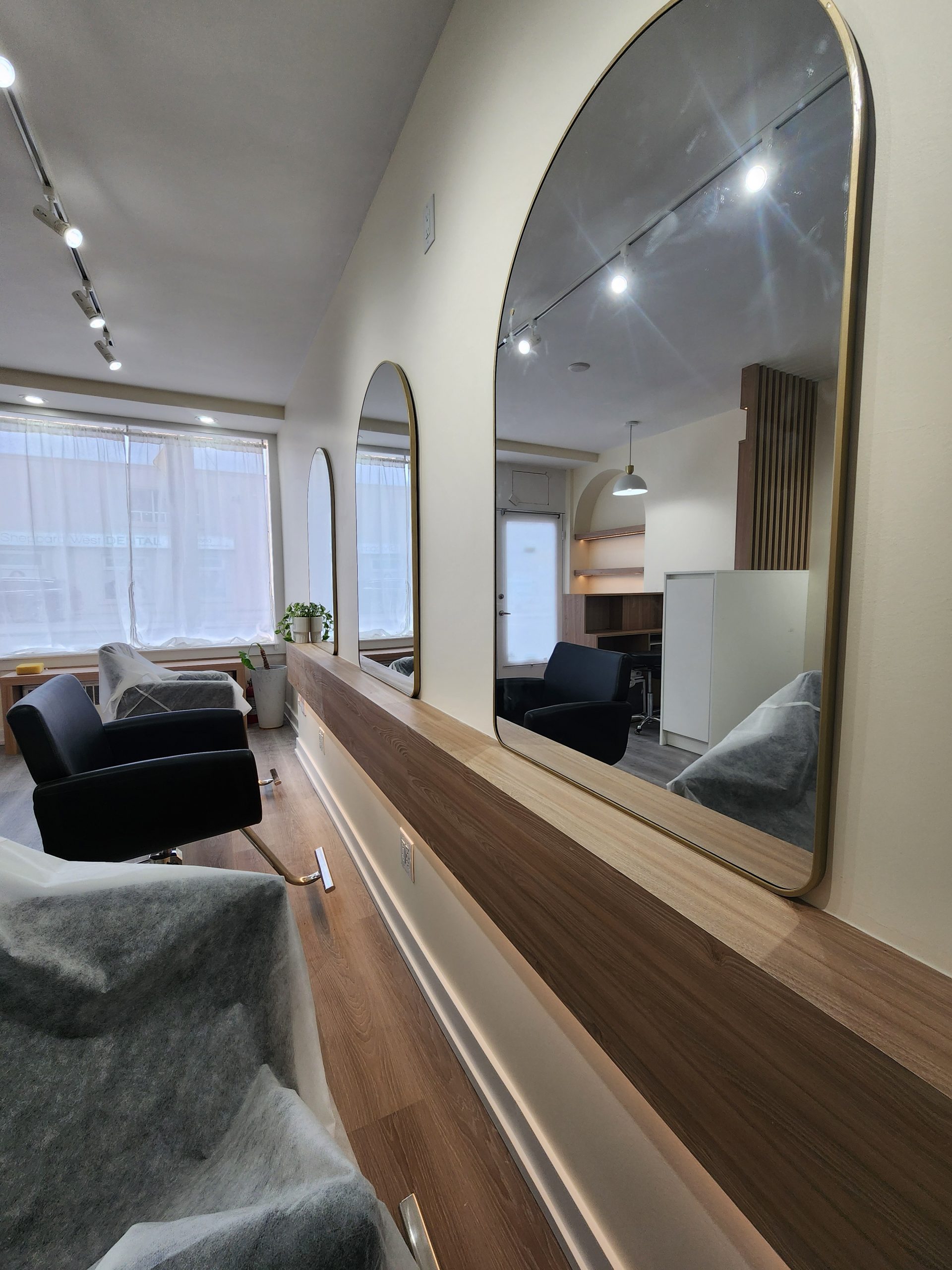 Along the stylist area, we installed oversized arched mirrors framed in gold, paired with a continuous wood-toned workstation featuring integrated LED underlighting for a clean, upscale look. New commercial-grade vinyl plank flooring runs throughout the studio, providing durability and a natural, warm tone.