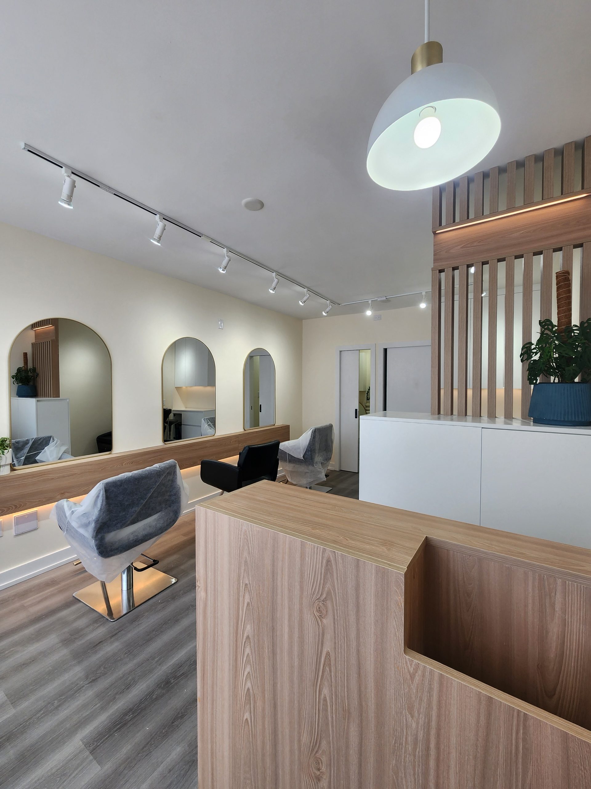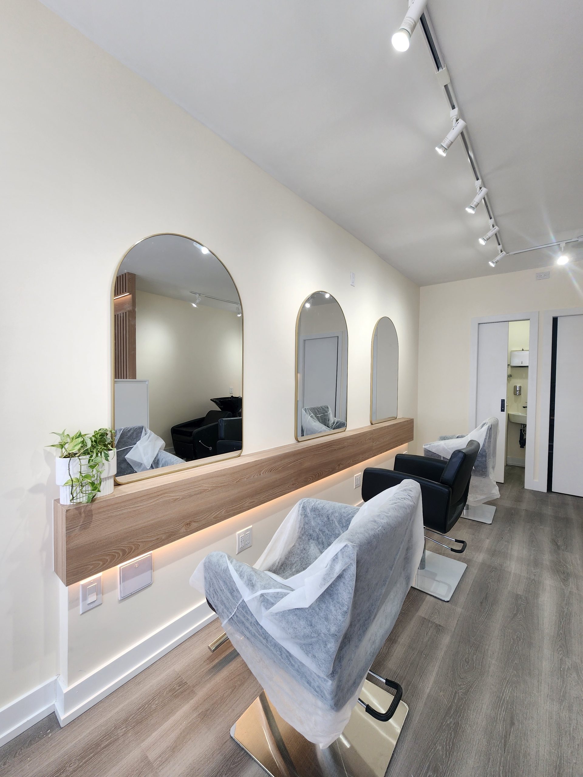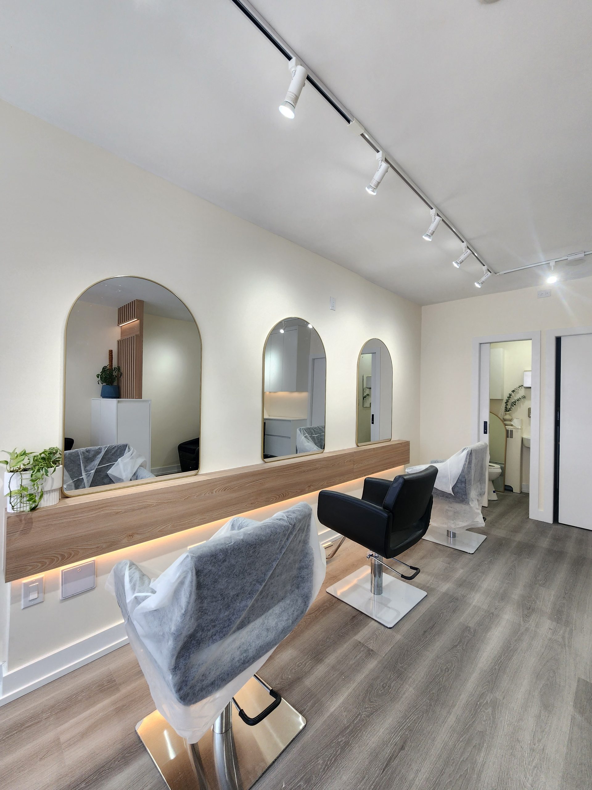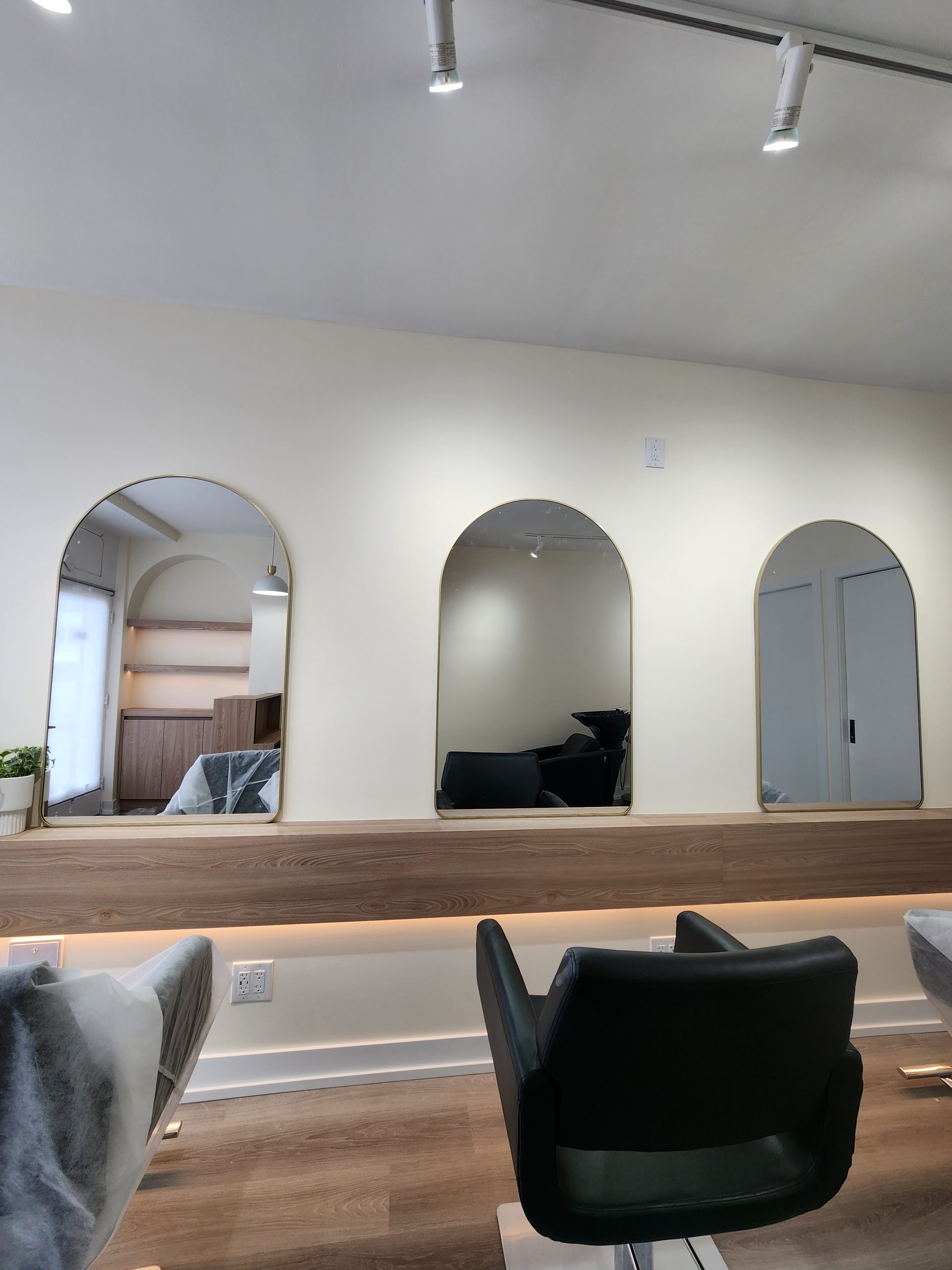 Along the stylist area, we installed oversized arched mirrors framed in gold, paired with a continuous wood-toned workstation featuring integrated LED underlighting for a clean, upscale look. New commercial-grade vinyl plank flooring runs throughout the studio, providing durability and a natural, warm tone.