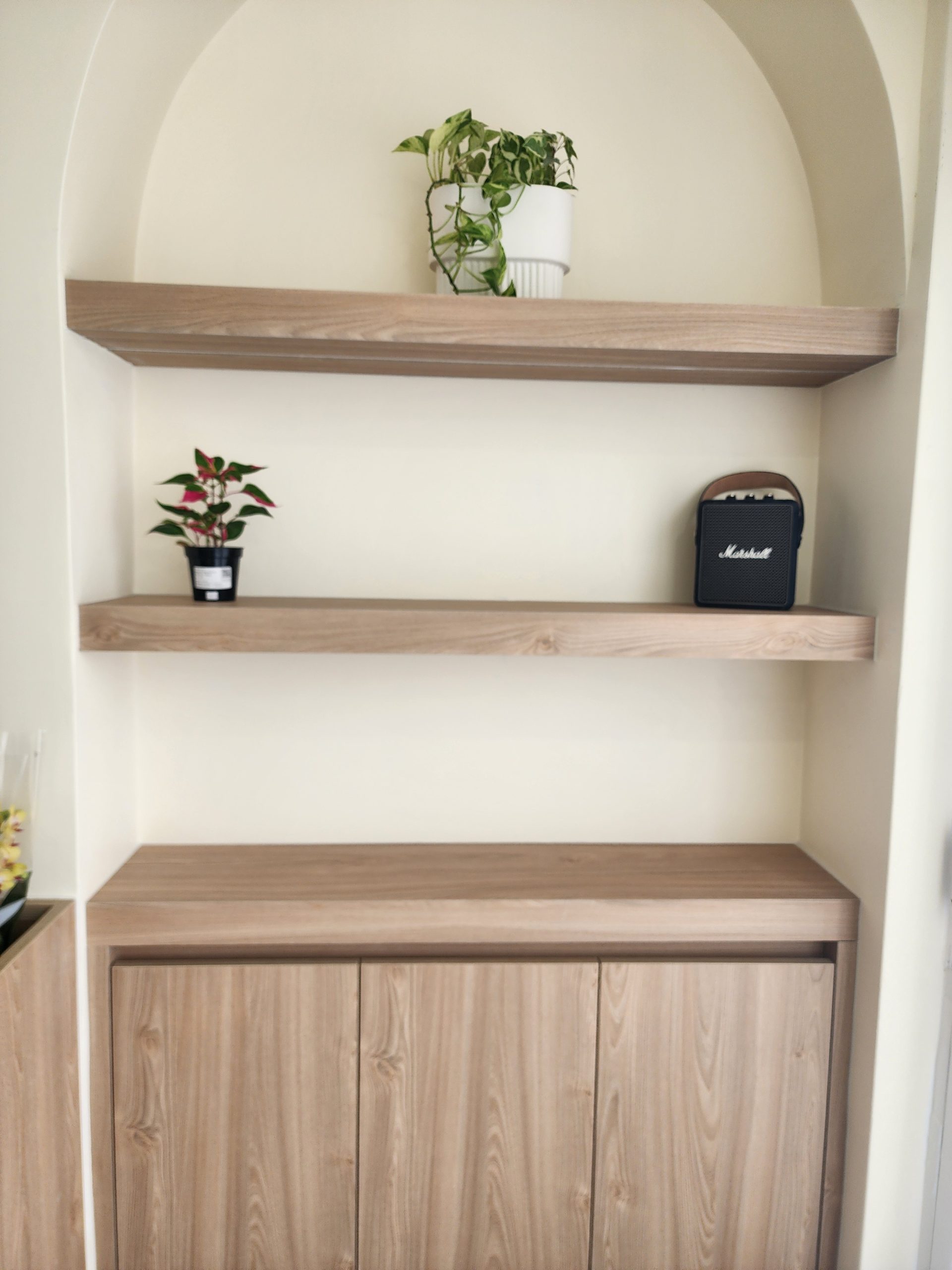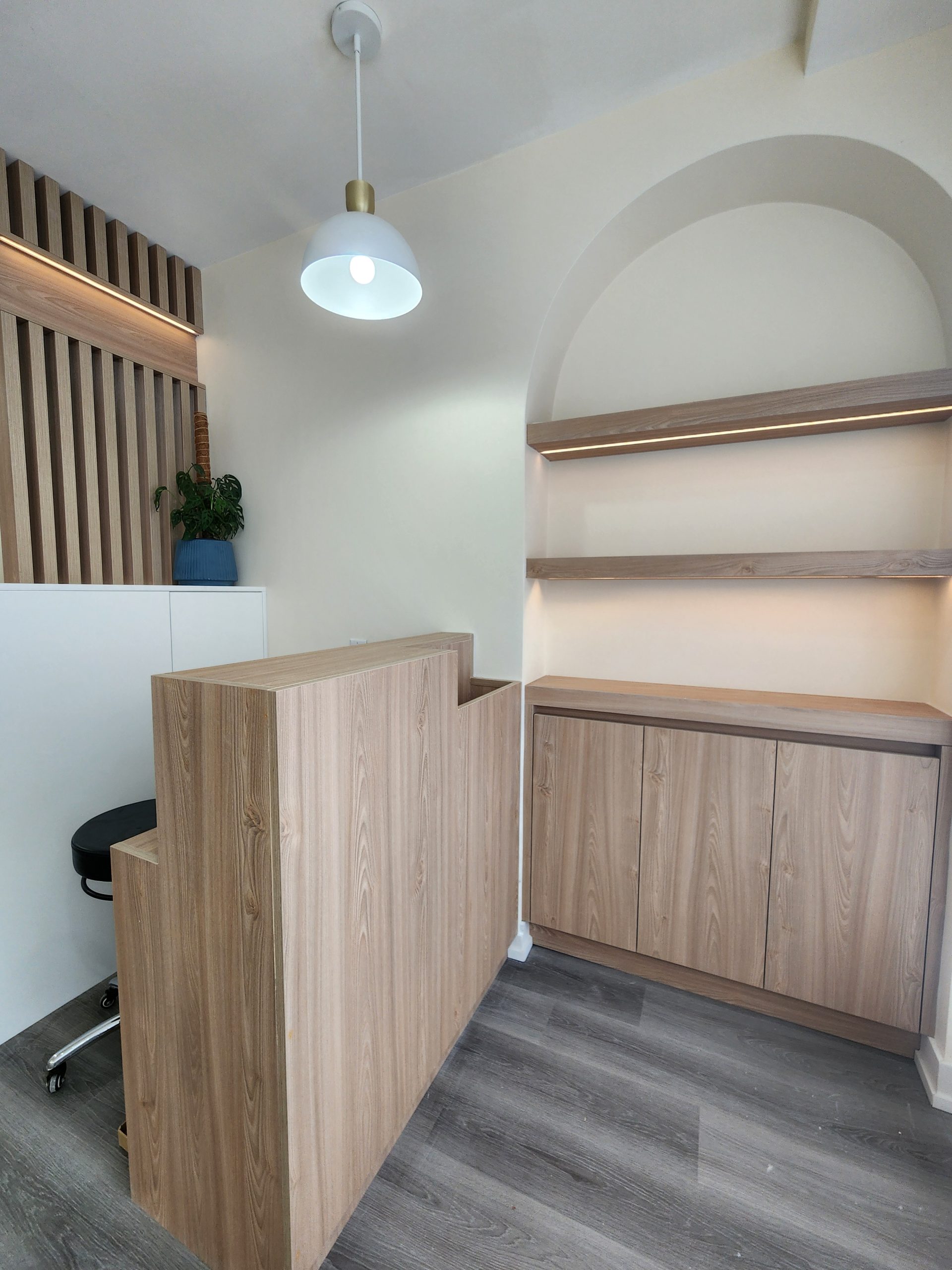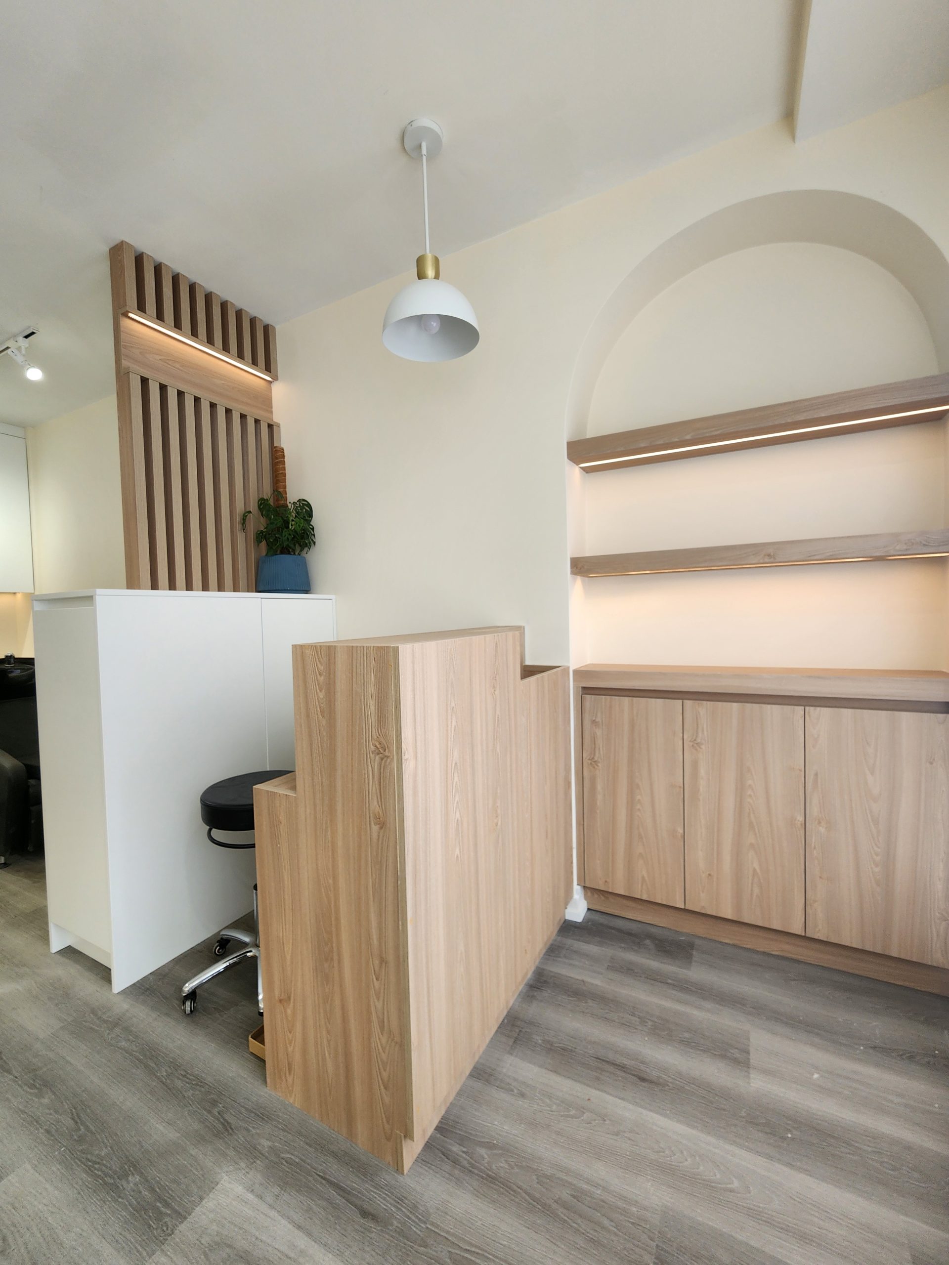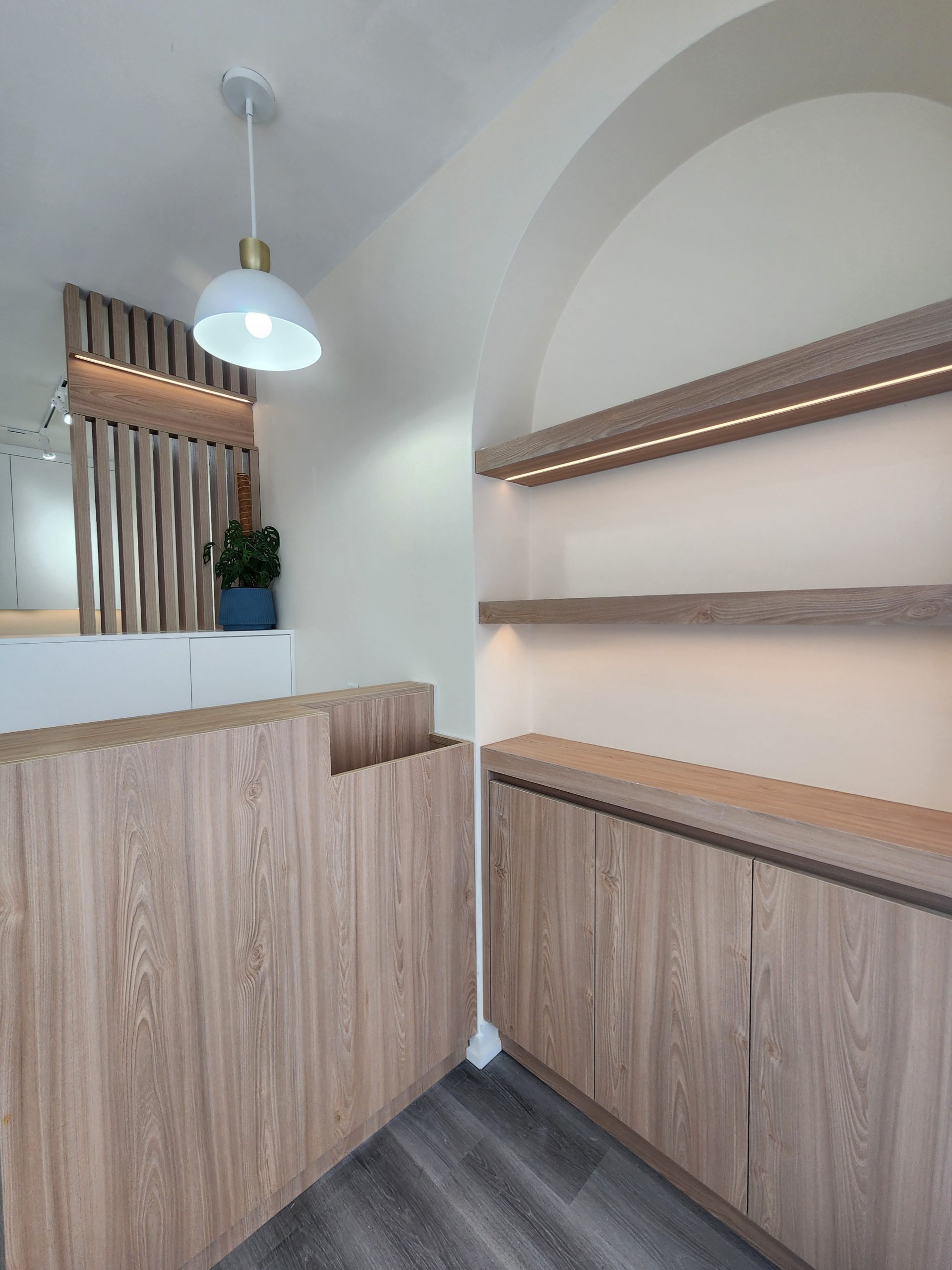 The new interior features warm neutral tones, soft curved design elements, and custom-built millwork crafted to maximize functionality and style. A custom reception desk and matching storage cabinet anchor the entry area, complemented by an arched niche with LED-lit floating shelves for a refined boutique aesthetic.
