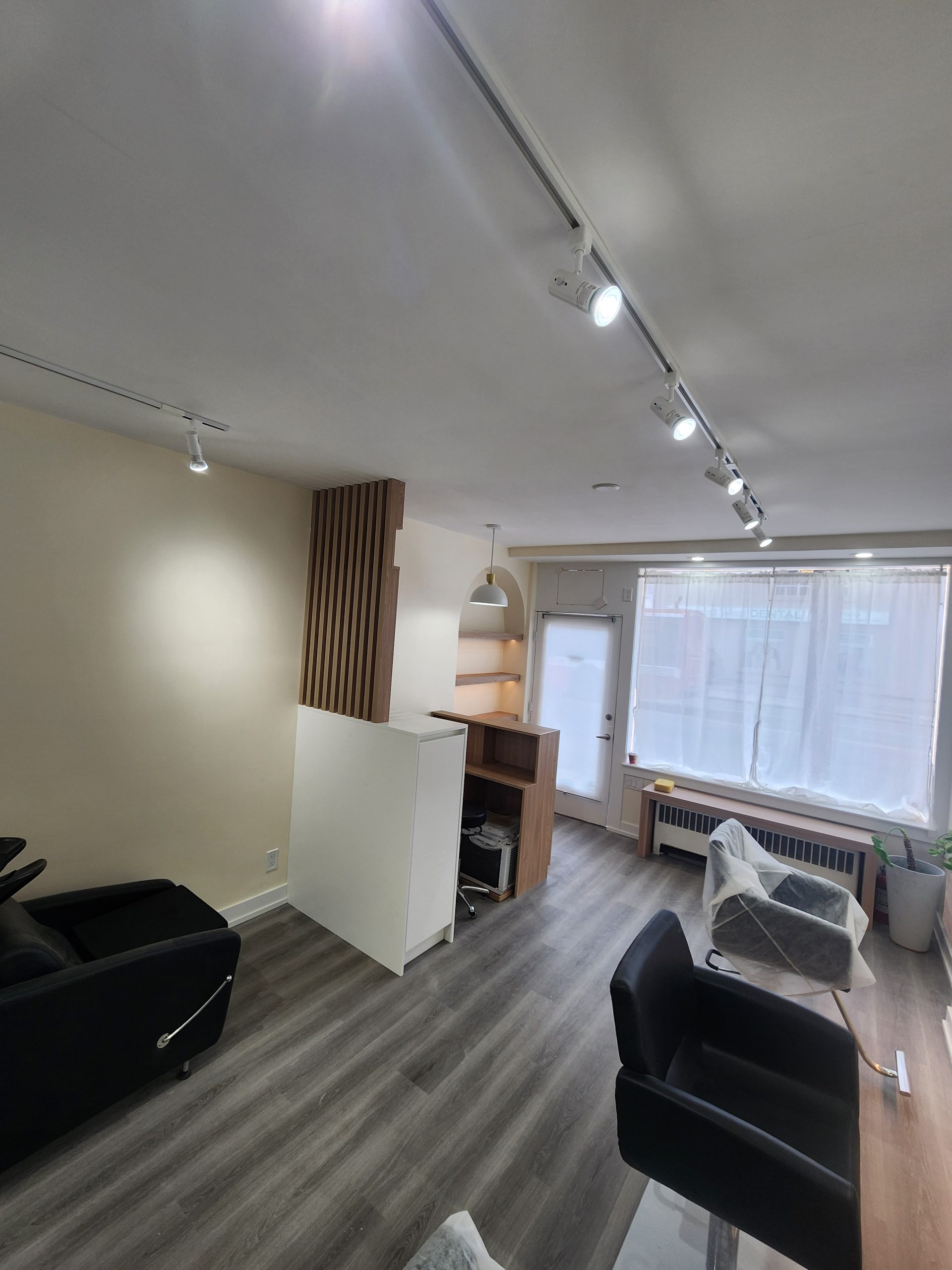 This commercial renovation transformed an outdated, deteriorated salon space into a bright, modern, and welcoming hair studio. The project began with a full teardown of aging ceiling tiles, damaged flooring, and old fixtures — clearing the way for a completely refreshed layout.