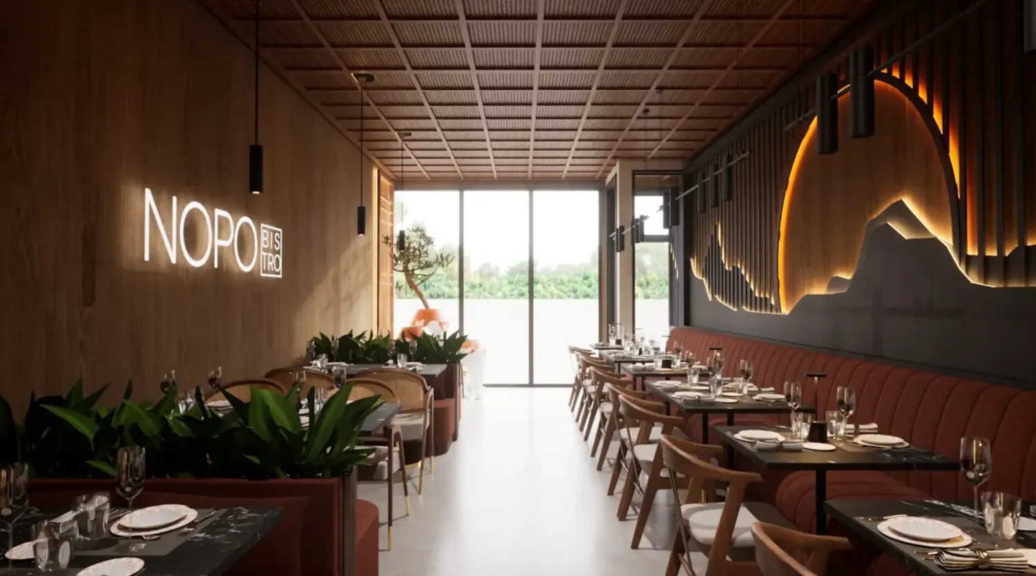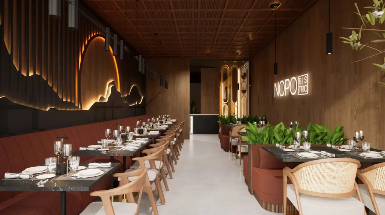 This rendering set showcases the full vision for NOPO Bistro prior to construction, establishing the foundation for finishes, millwork, lighting levels, and customer flow.