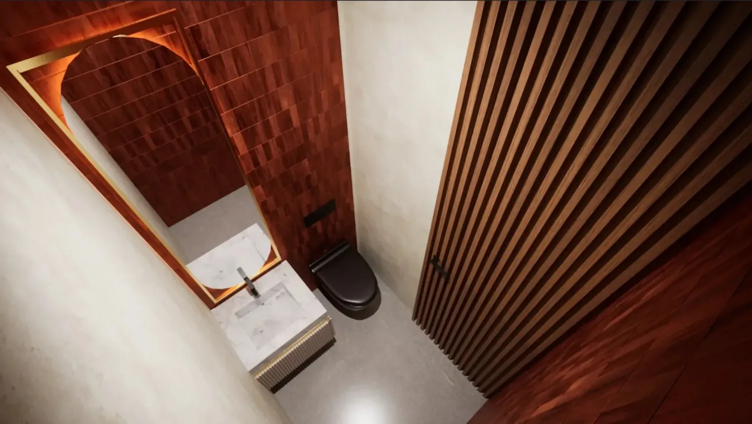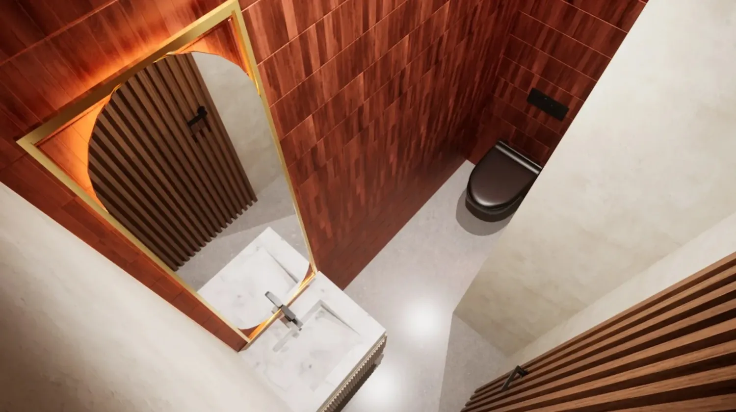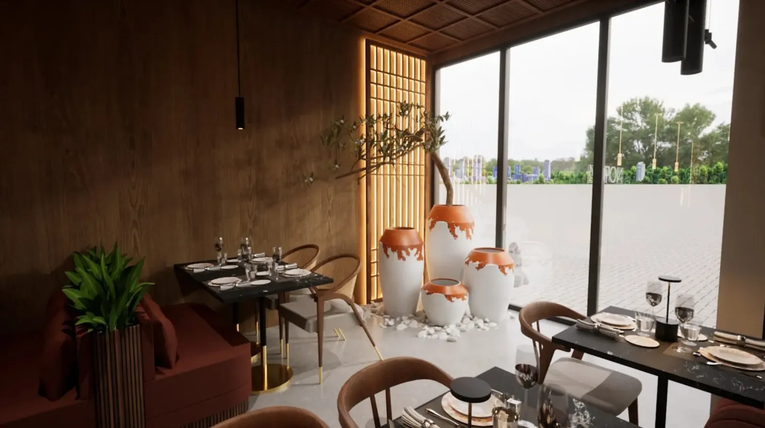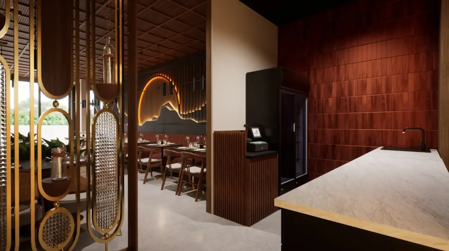 This design concept reimagines the dining experience through warm wood tones, sculptural lighting, and refined textures. The space blends modern minimalism with elevated hospitality features — from custom slatted wall panels and backlit mountain-scape accents to marble-inspired stone surfaces and curated greenery.
