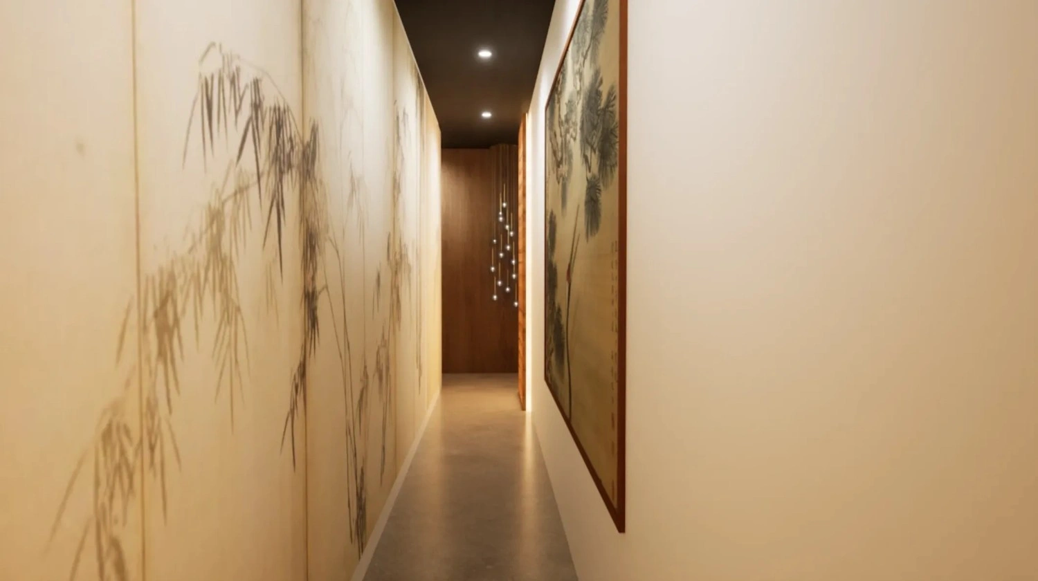 The narrow corridor is softened with traditional-inspired artwork, leading guests toward an inviting dining room anchored by rich banquette seating, natural wood furniture, and a glowing feature wall. Every detail, including ceiling treatments, decorative partitions, and material layering, was developed to create a cohesive, immersive atmosphere.