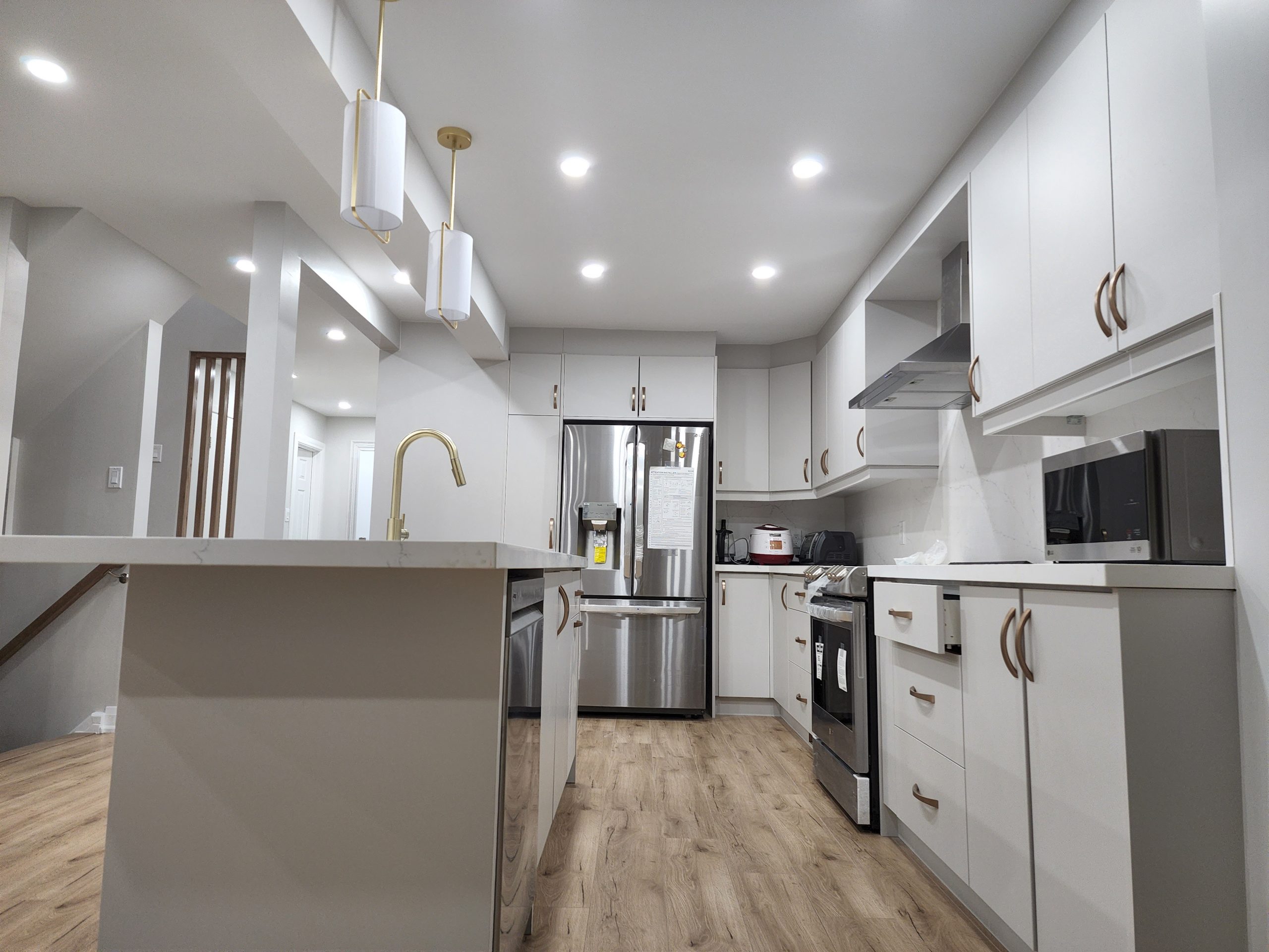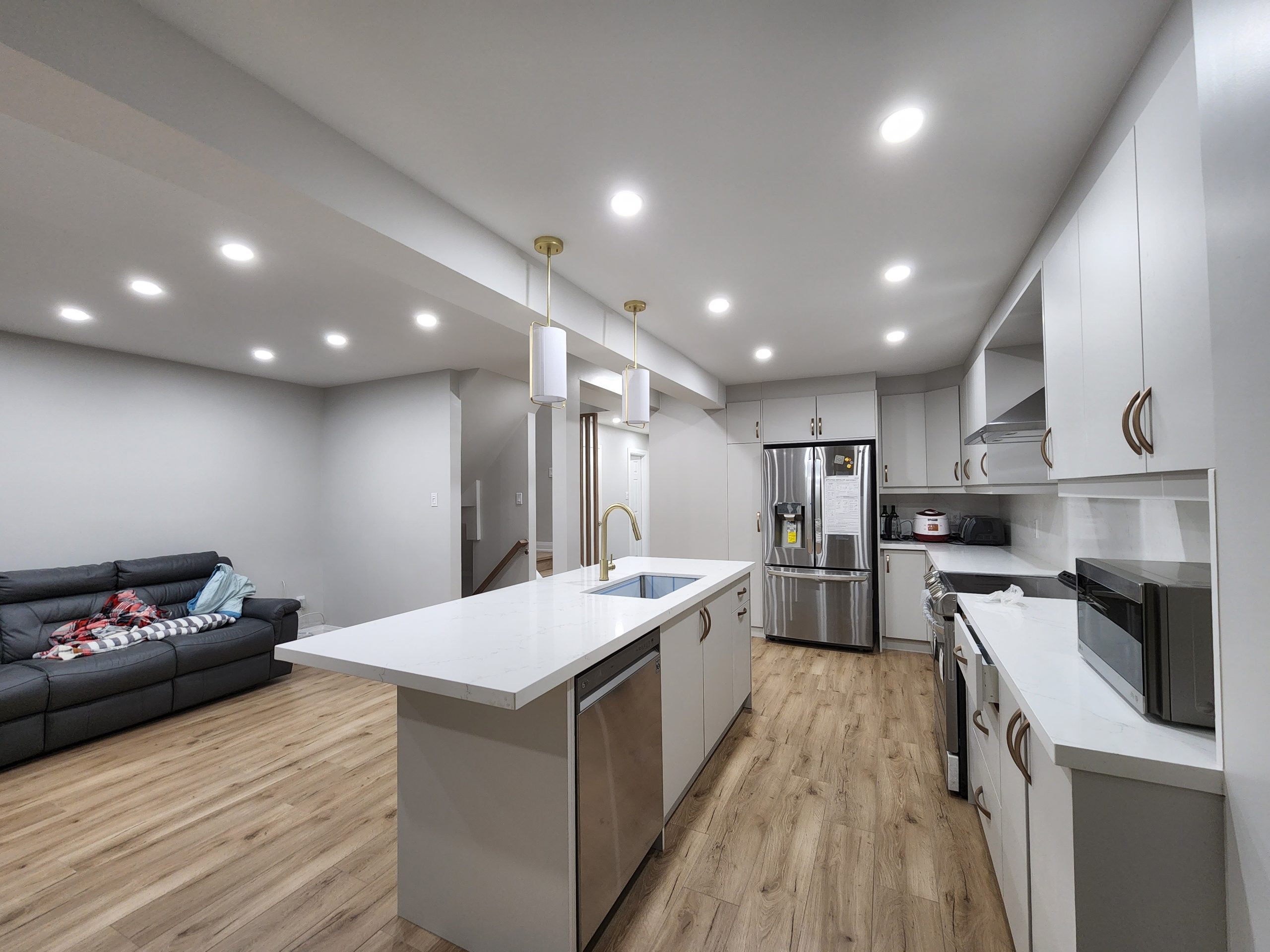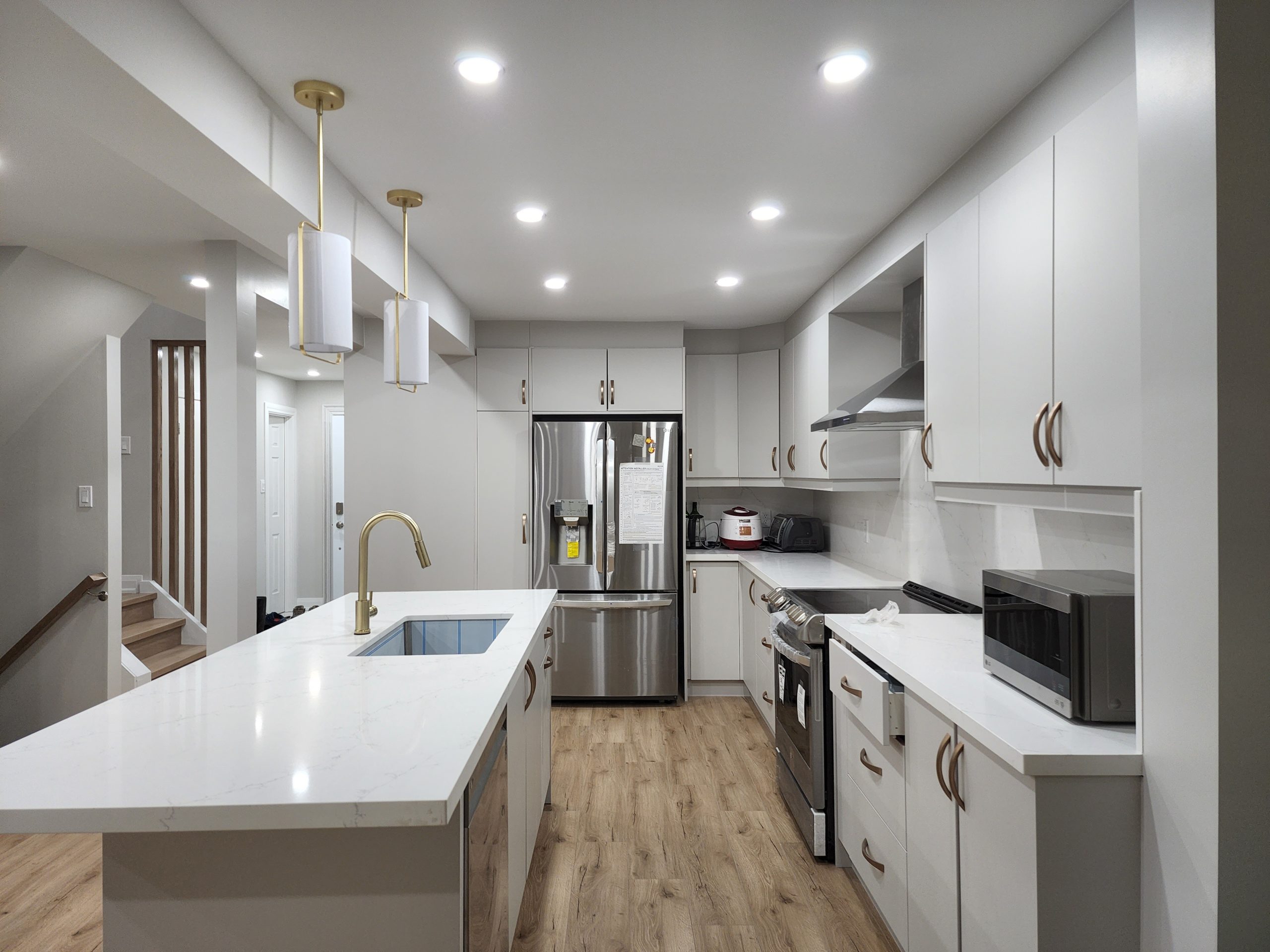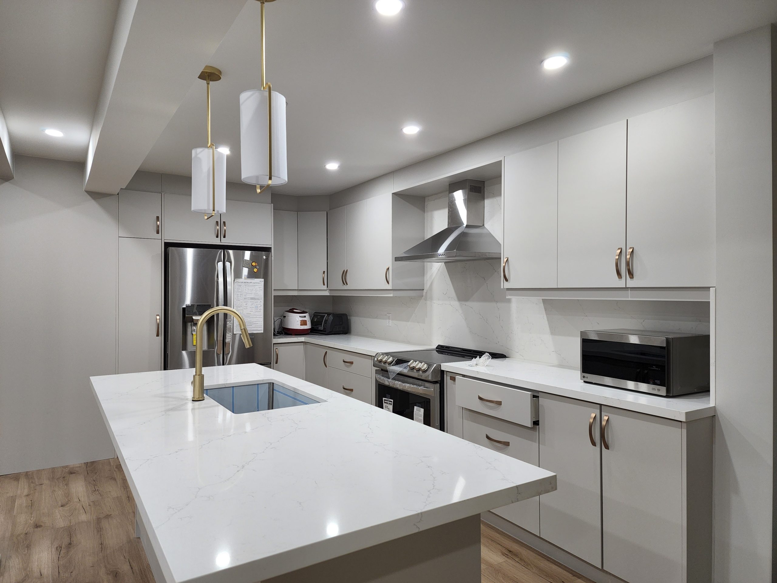 The new kitchen features sleek matte cabinetry, gold hardware, full-height quartz backsplash, and a large waterfall island equipped with modern pendant lighting and an undermount sink. Premium appliances, recessed LED potlights, and improved electrical layout complete the upgrade with both function and style.