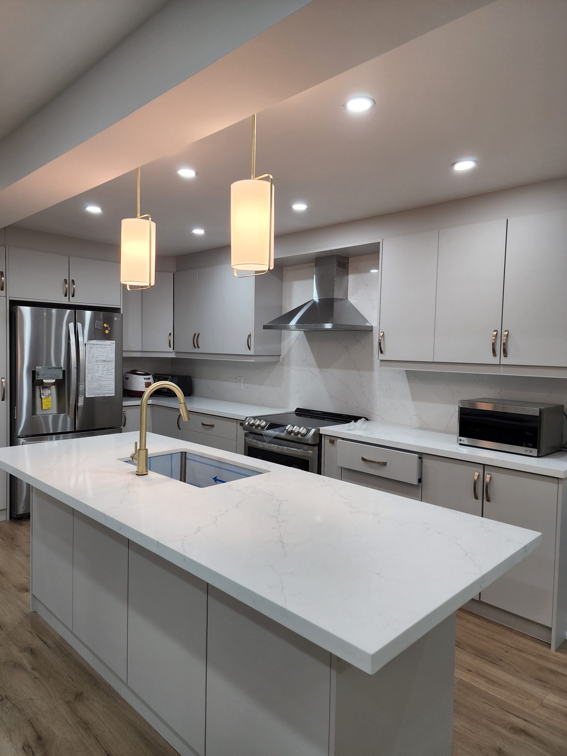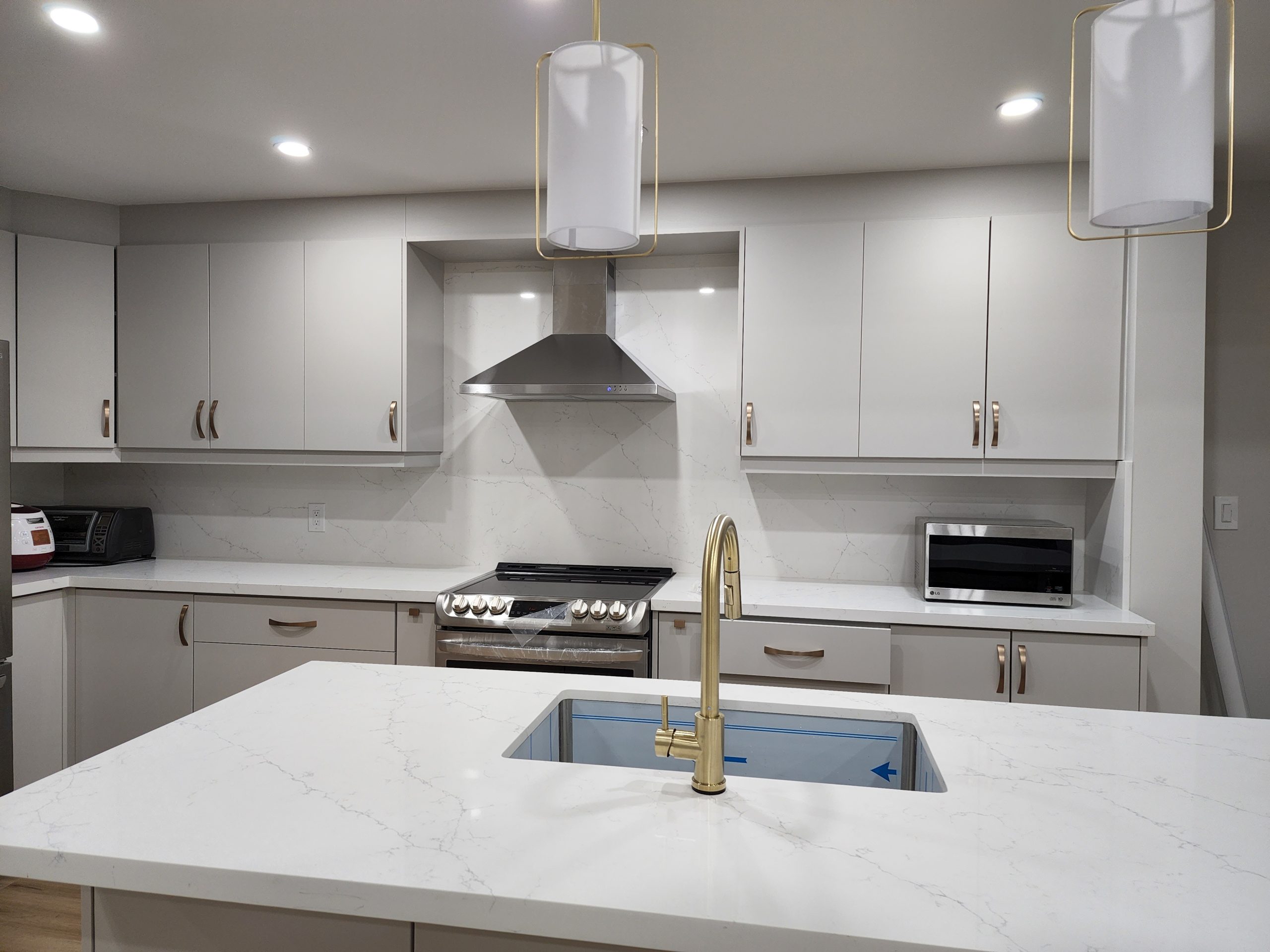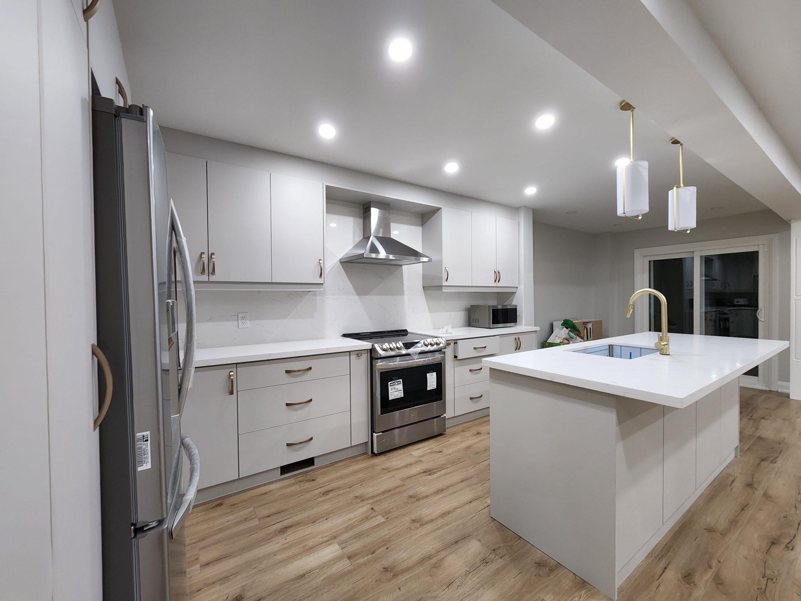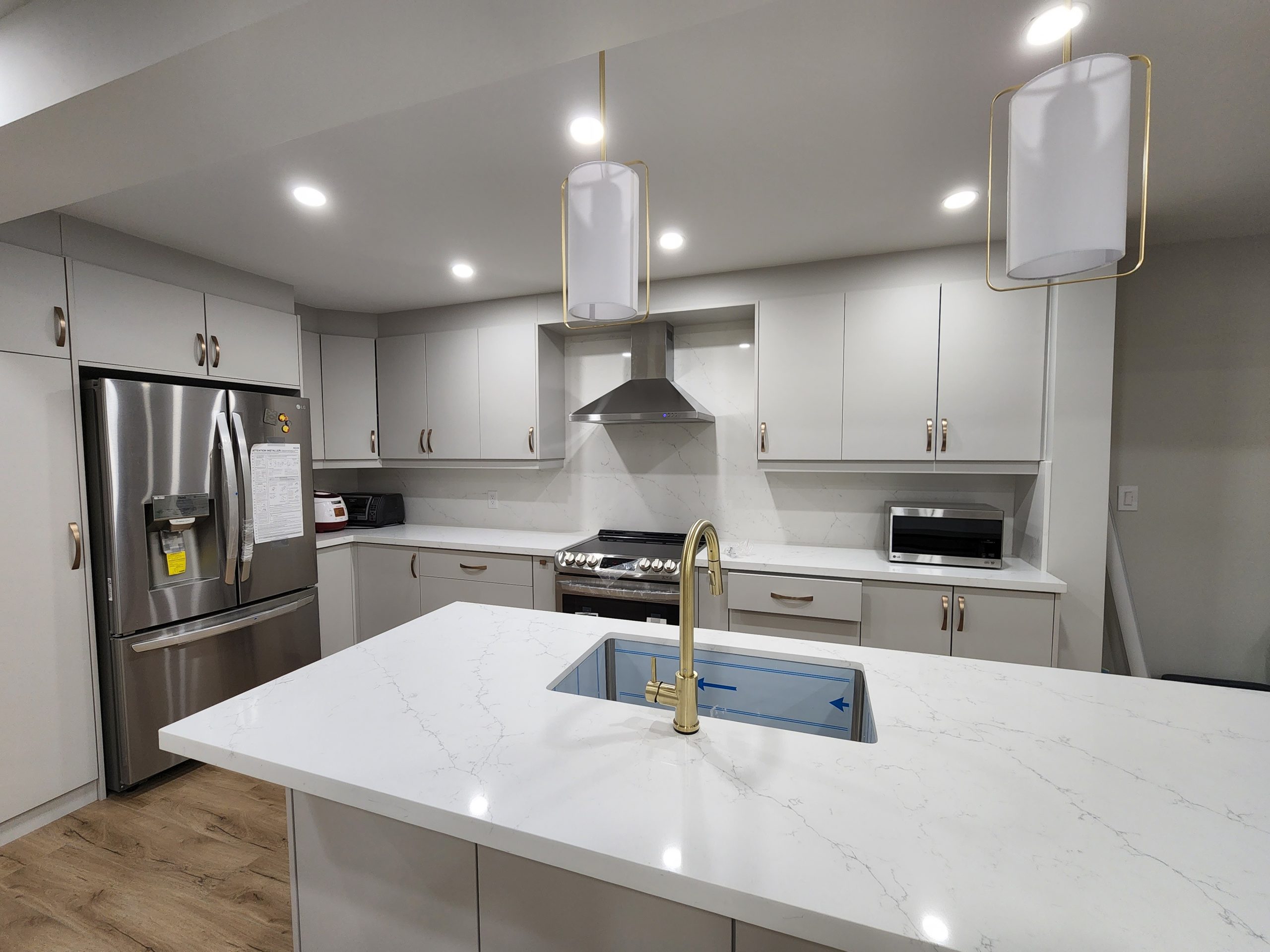 The new kitchen features sleek matte cabinetry, gold hardware, full-height quartz backsplash, and a large waterfall island equipped with modern pendant lighting and an undermount sink. Premium appliances, recessed LED potlights, and improved electrical layout complete the upgrade with both function and style.