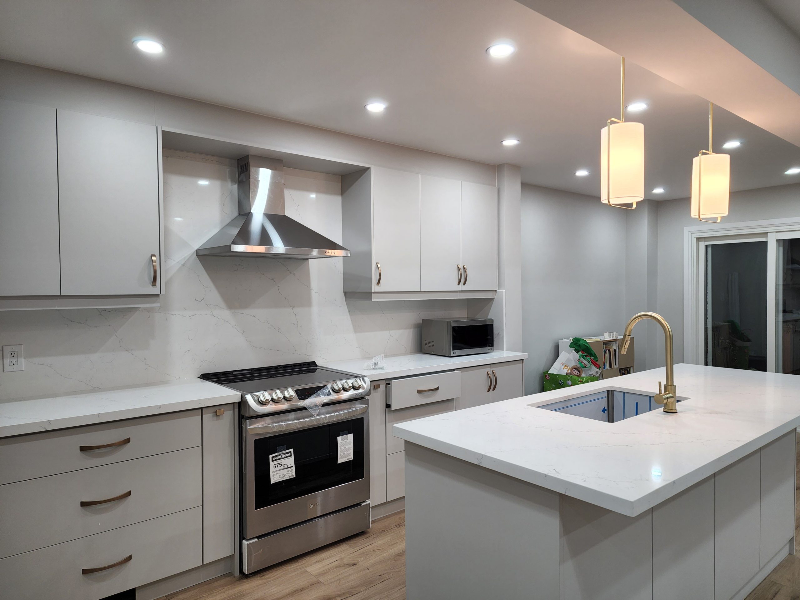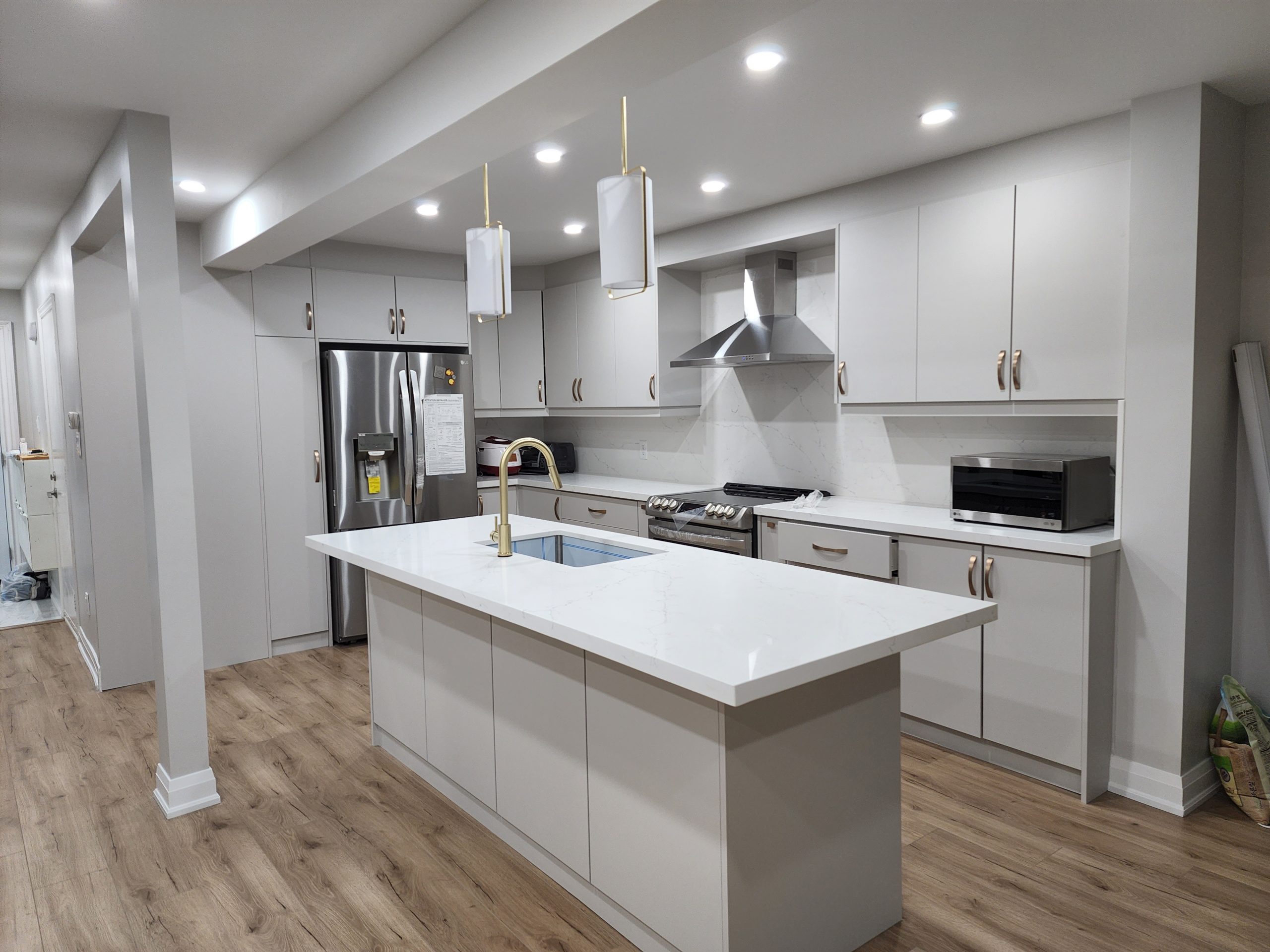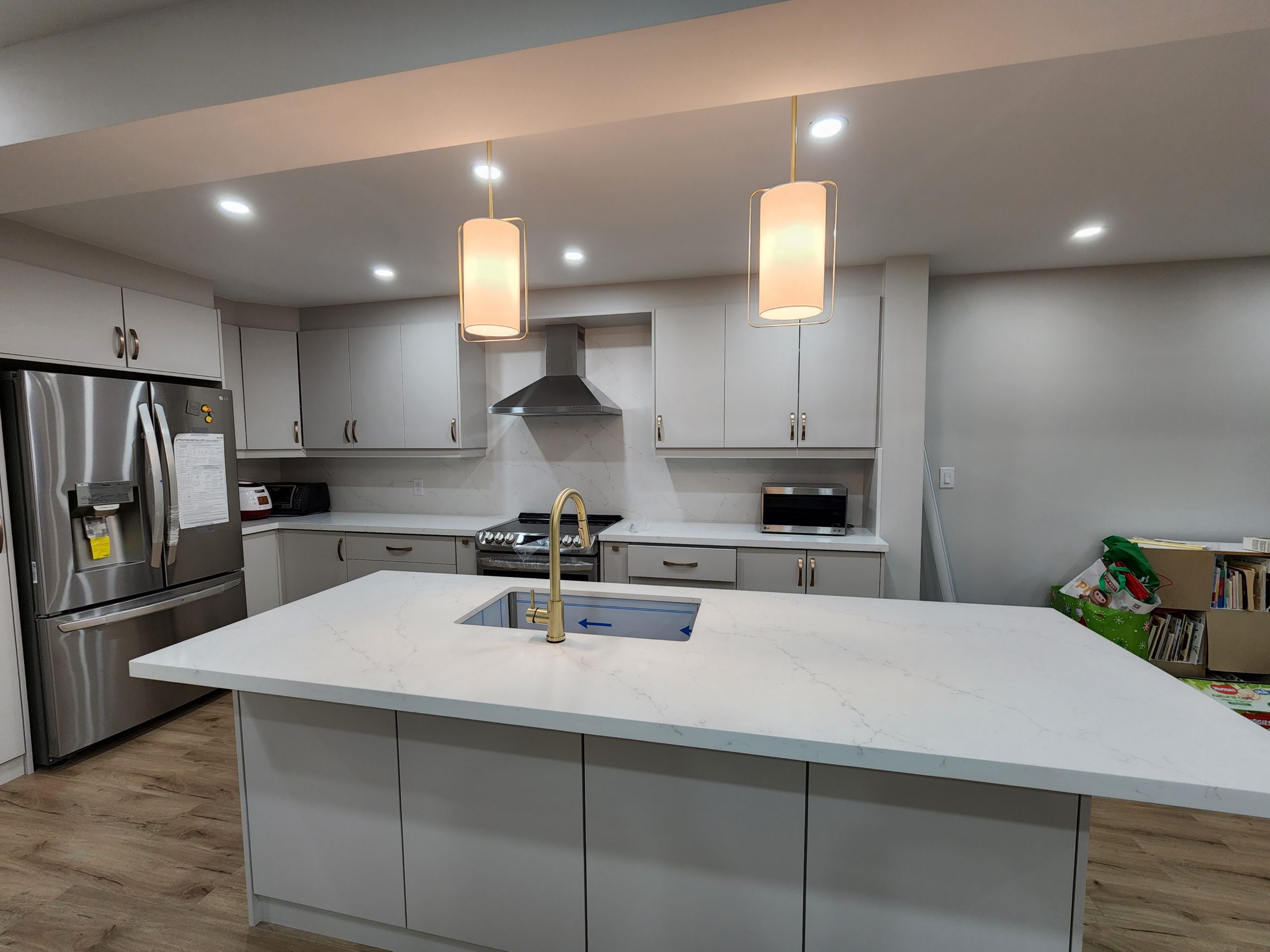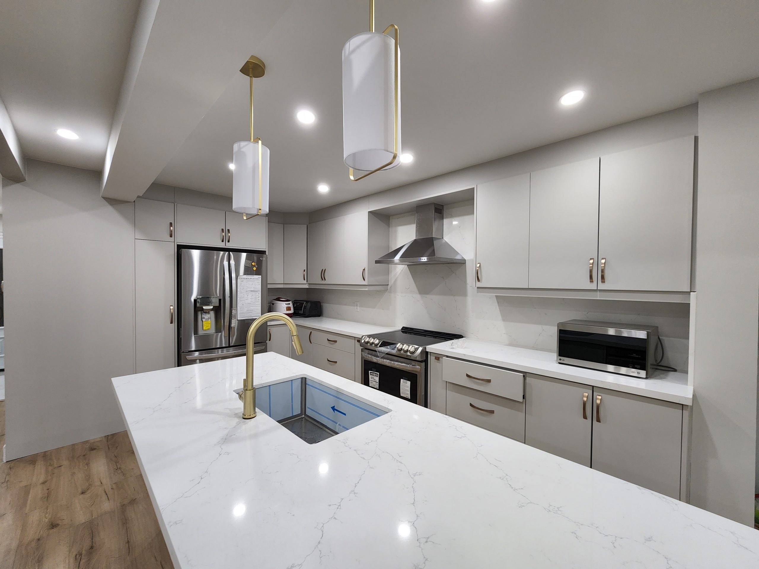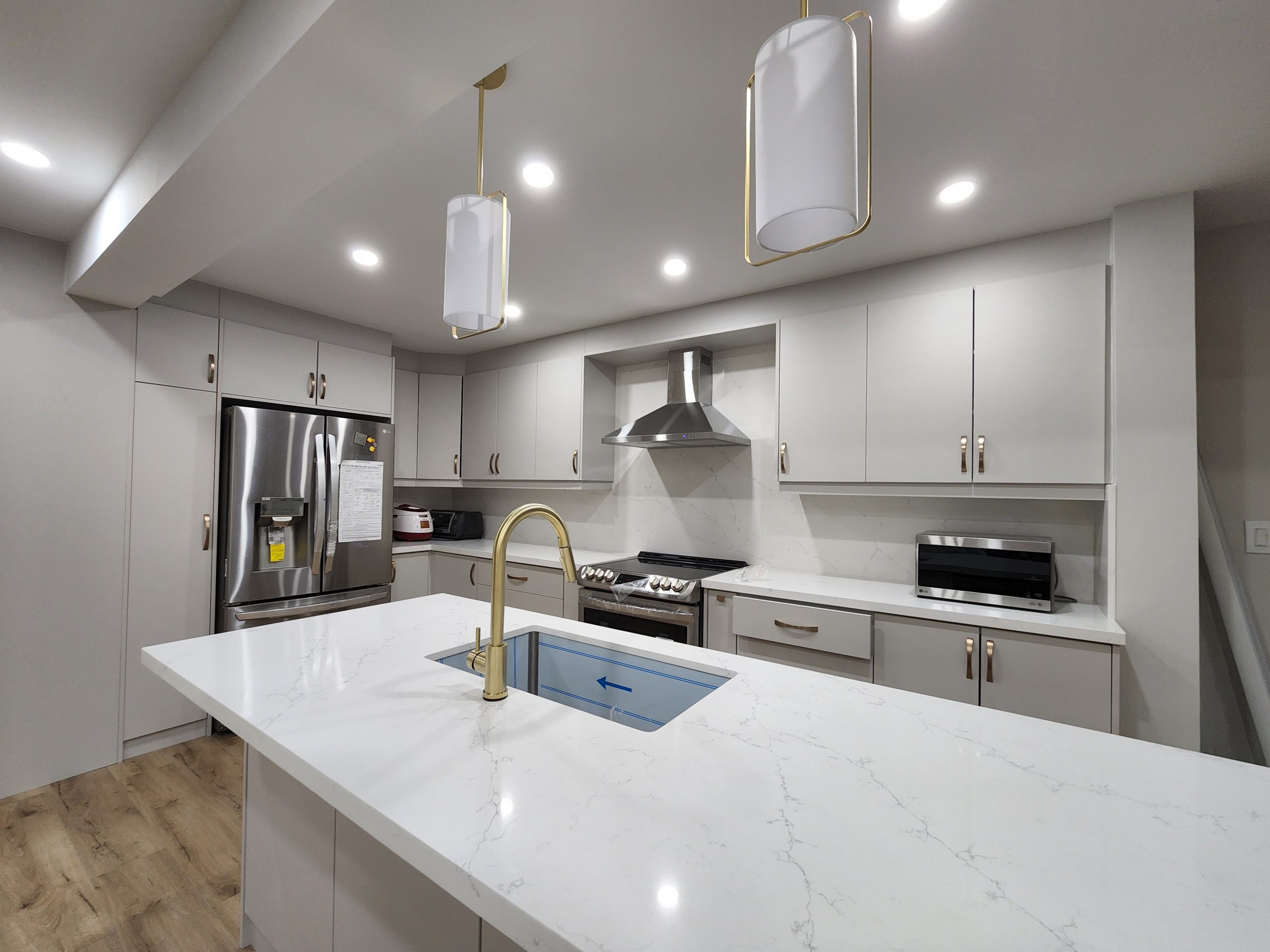 The new kitchen features sleek matte cabinetry, gold hardware, full-height quartz backsplash, and a large waterfall island equipped with modern pendant lighting and an undermount sink. Premium appliances, recessed LED potlights, and improved electrical layout complete the upgrade with both function and style.