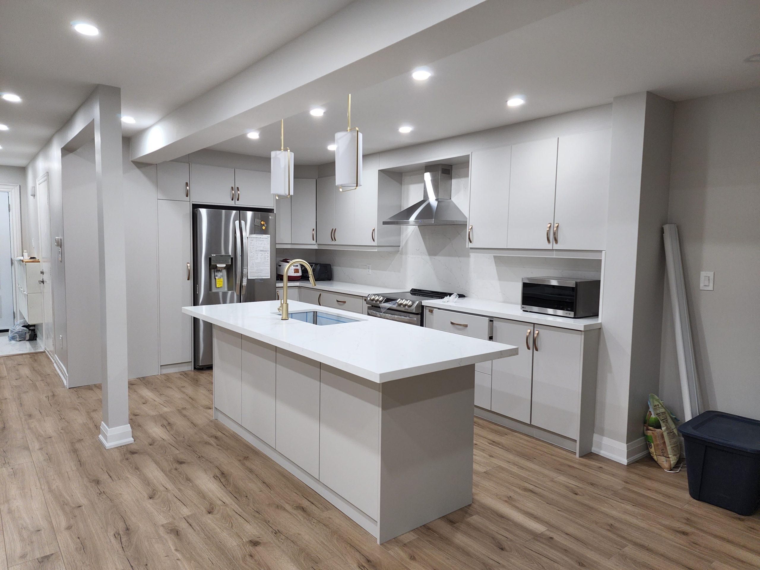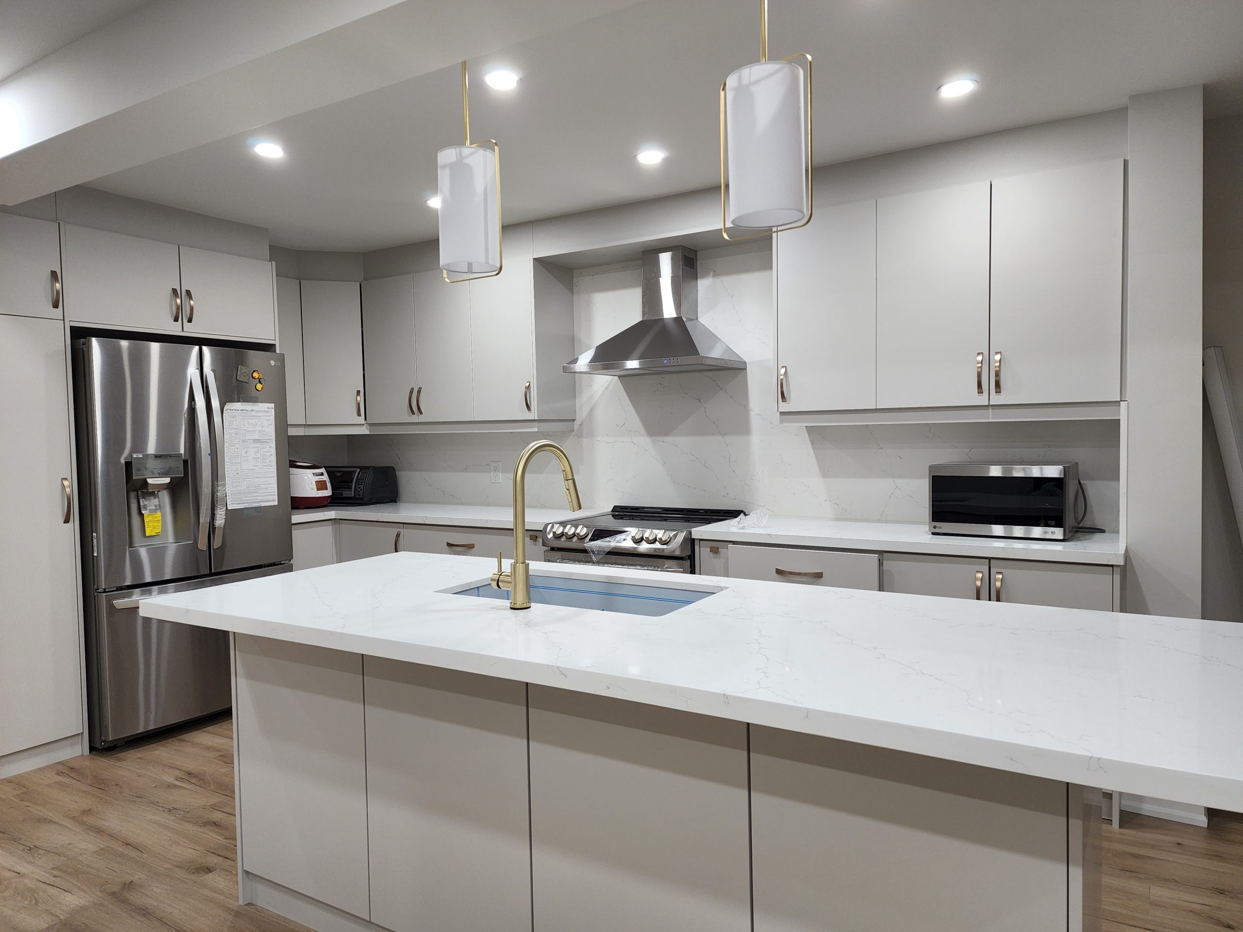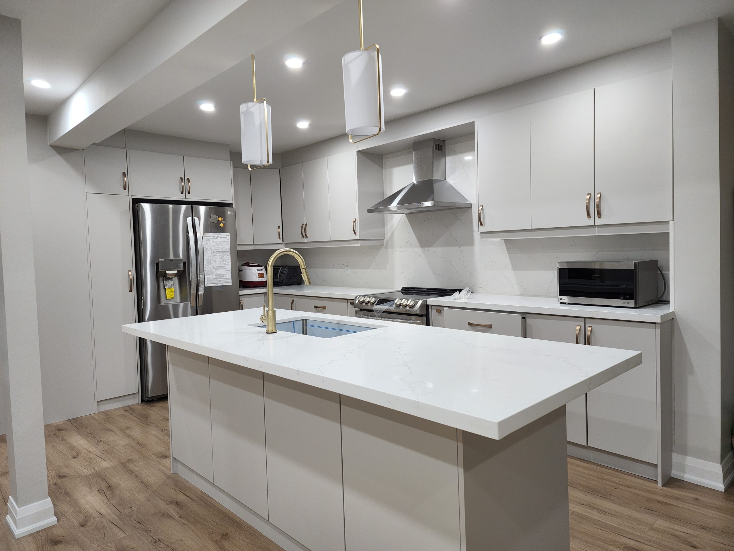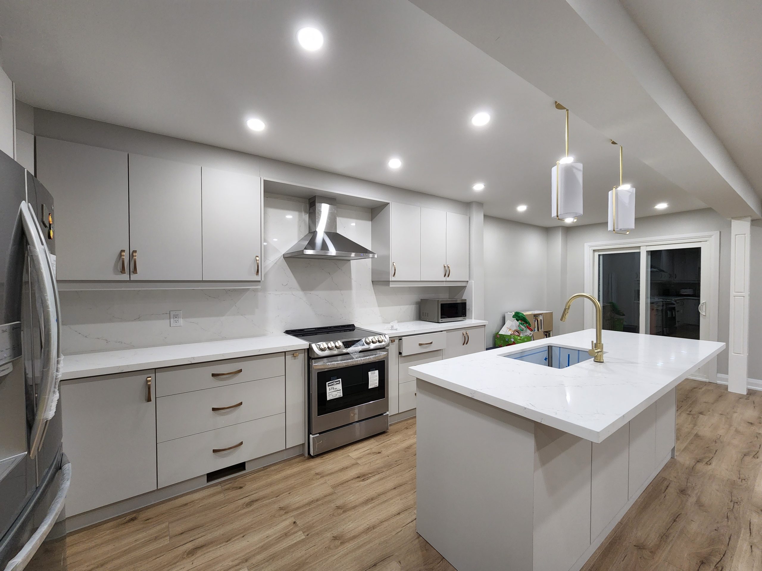 The new kitchen features sleek matte cabinetry, gold hardware, full-height quartz backsplash, and a large waterfall island equipped with modern pendant lighting and an undermount sink. Premium appliances, recessed LED potlights, and improved electrical layout complete the upgrade with both function and style.