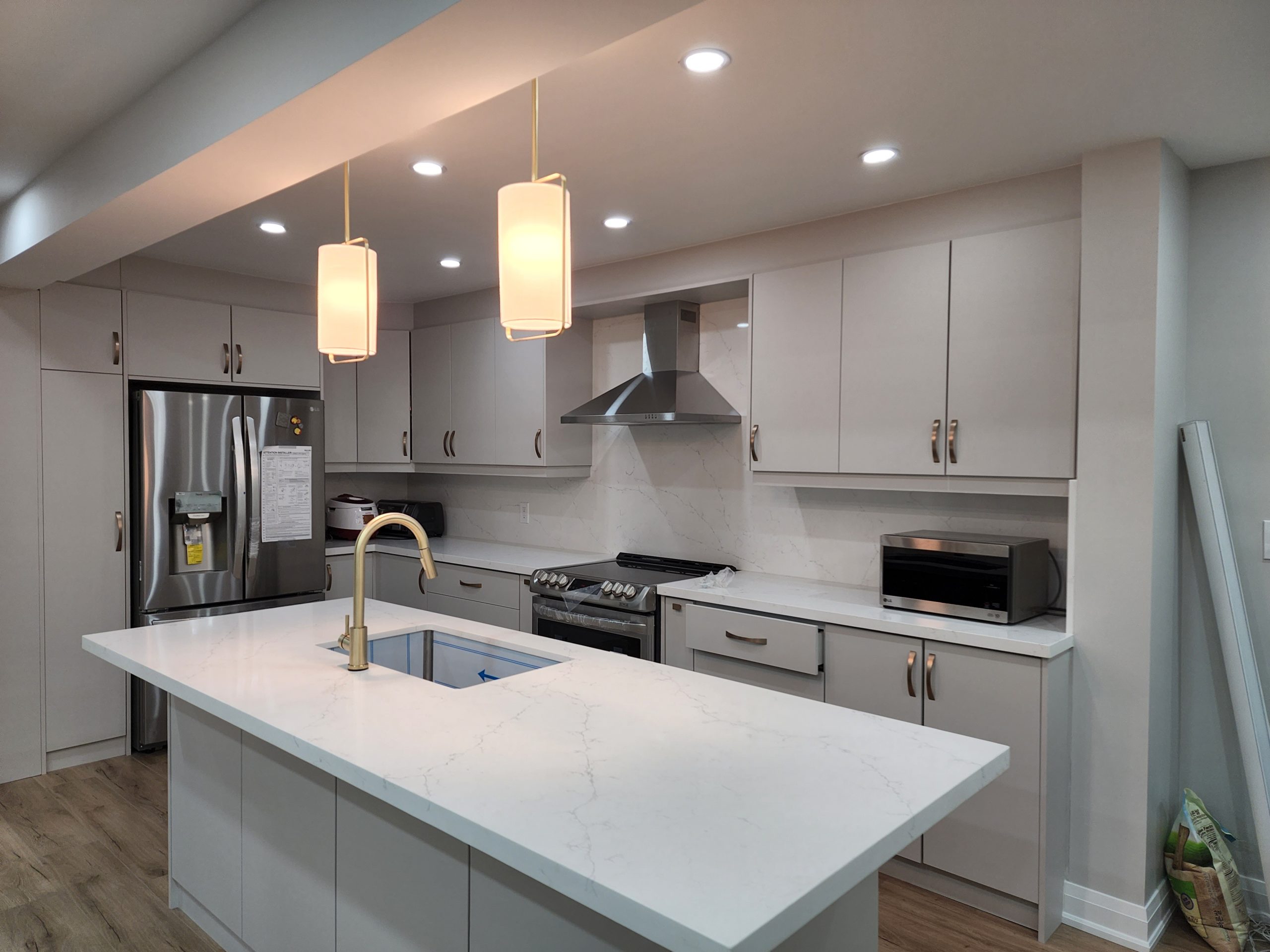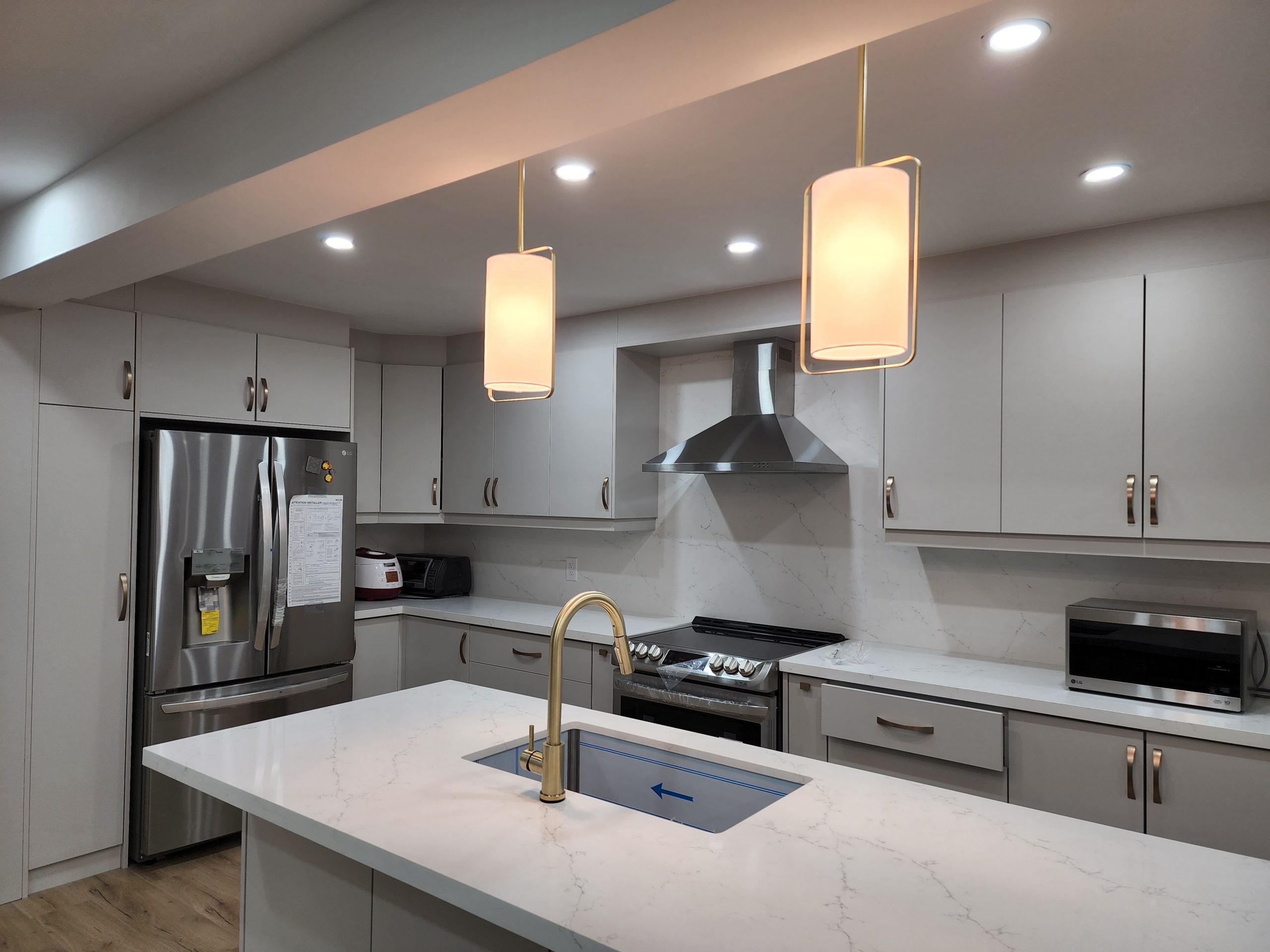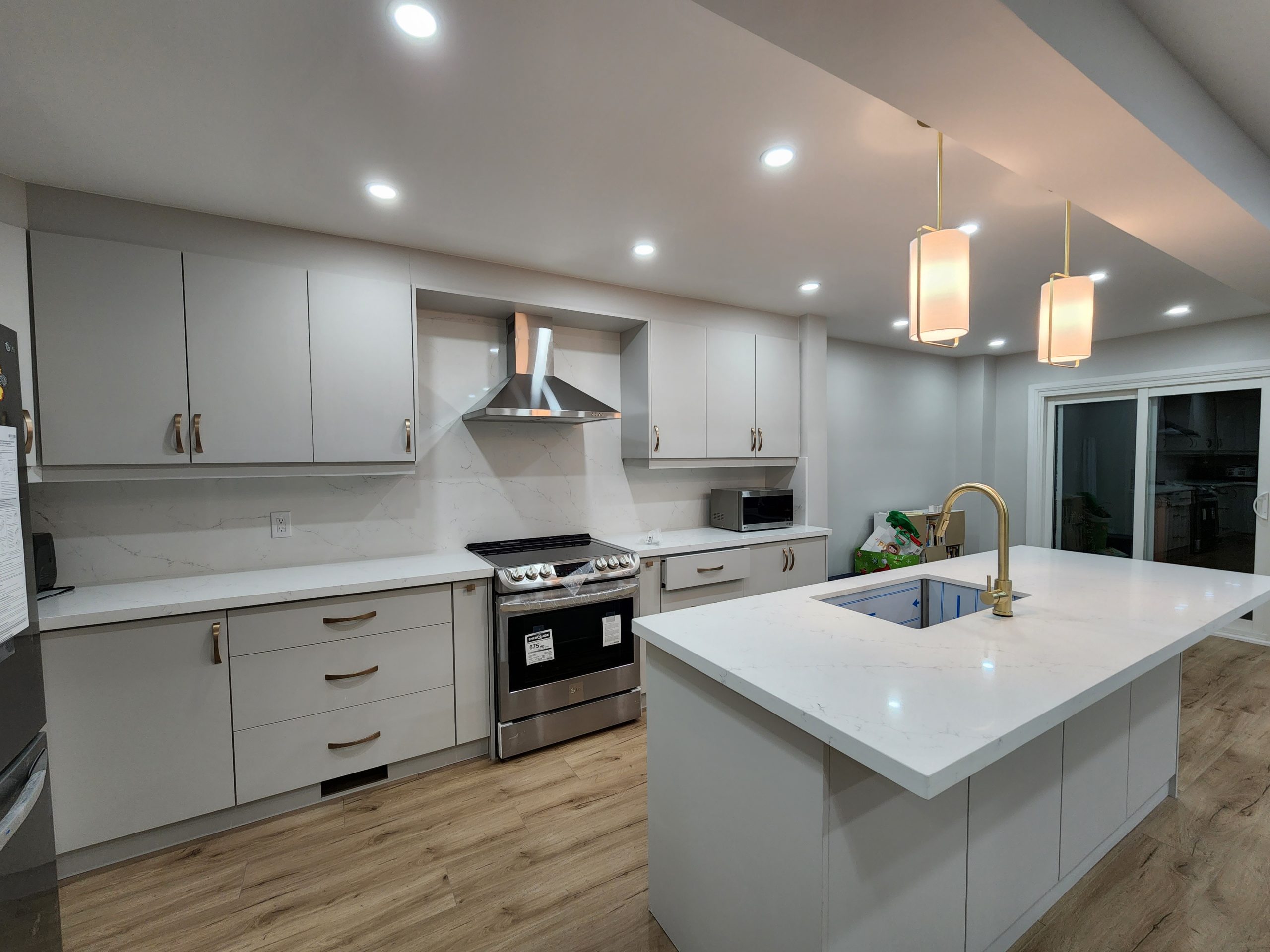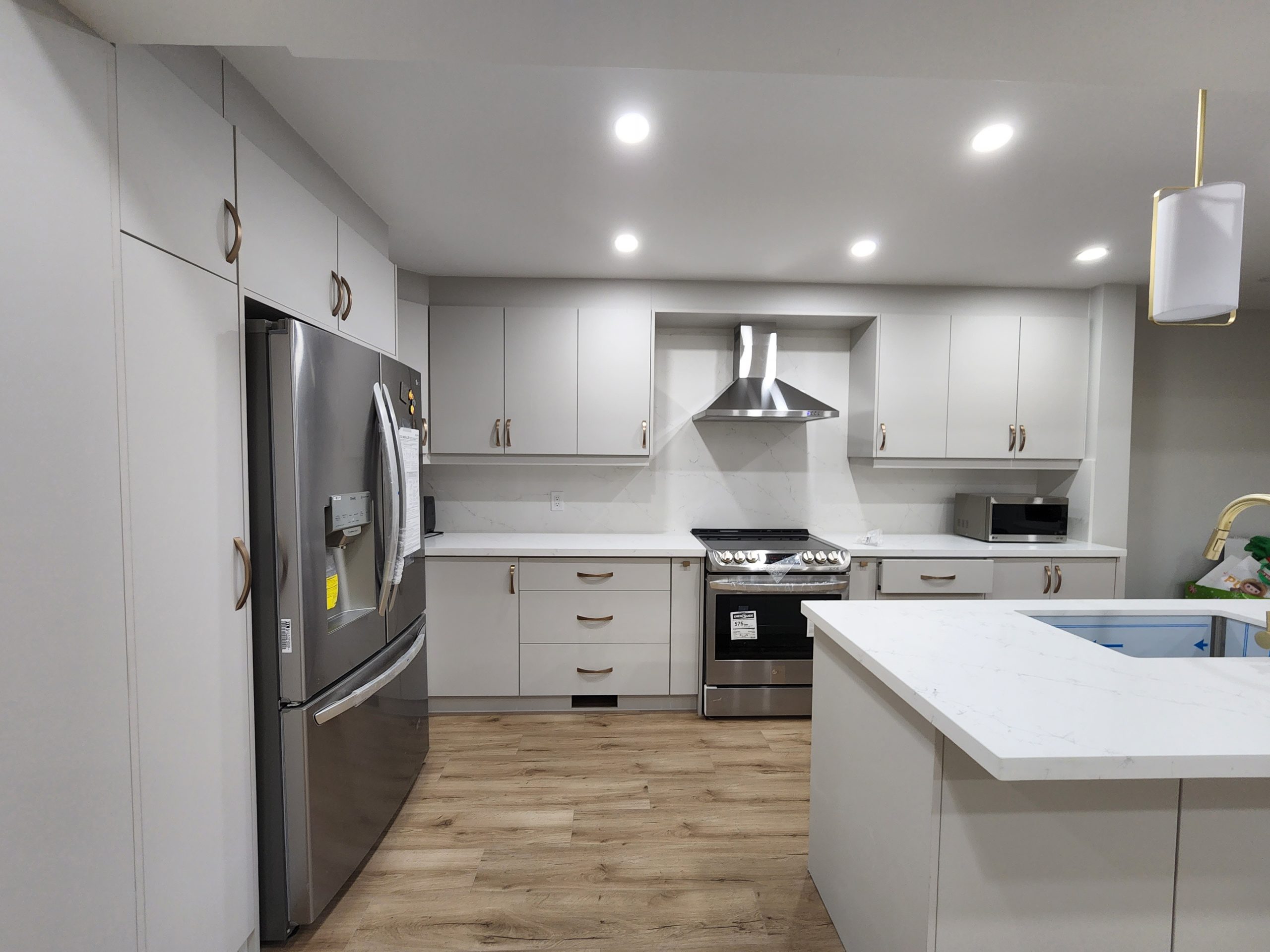 The new kitchen features sleek matte cabinetry, gold hardware, full-height quartz backsplash, and a large waterfall island equipped with modern pendant lighting and an undermount sink. Premium appliances, recessed LED potlights, and improved electrical layout complete the upgrade with both function and style.
