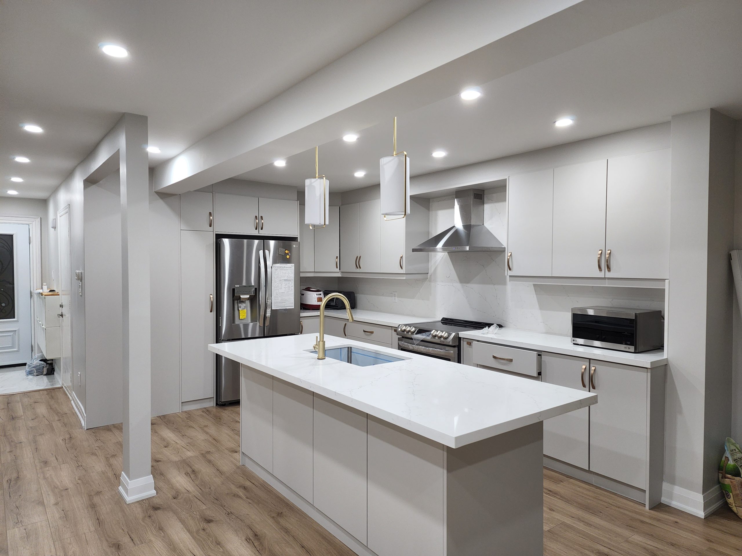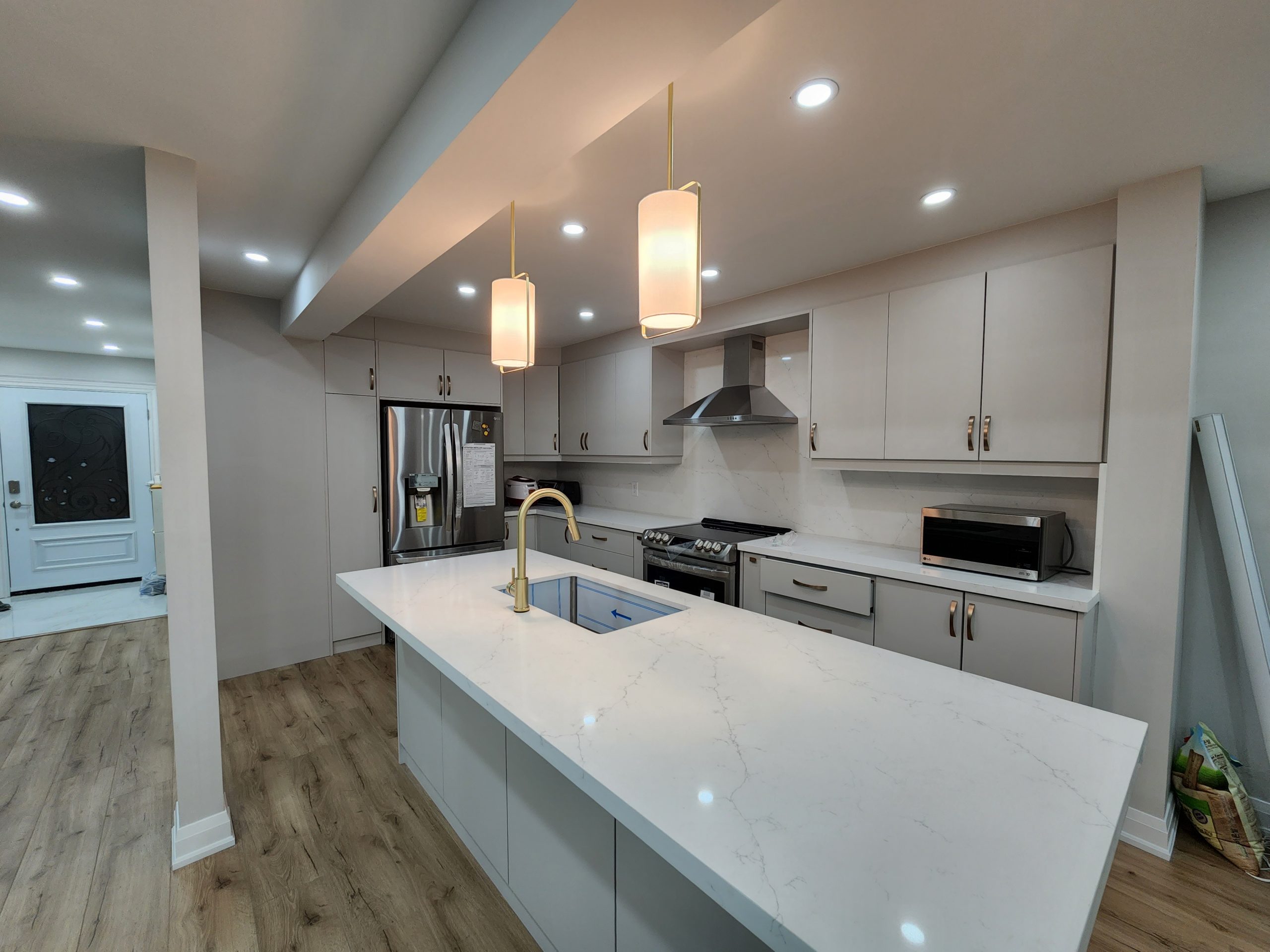 This project showcases a full transformation of a dated home into a bright, modern open-concept living space. The renovation began with the removal of a major load-bearing wall, supported by a custom-engineered steel beam and new framing to create a seamless, spacious layout connecting the kitchen, dining, and living areas.