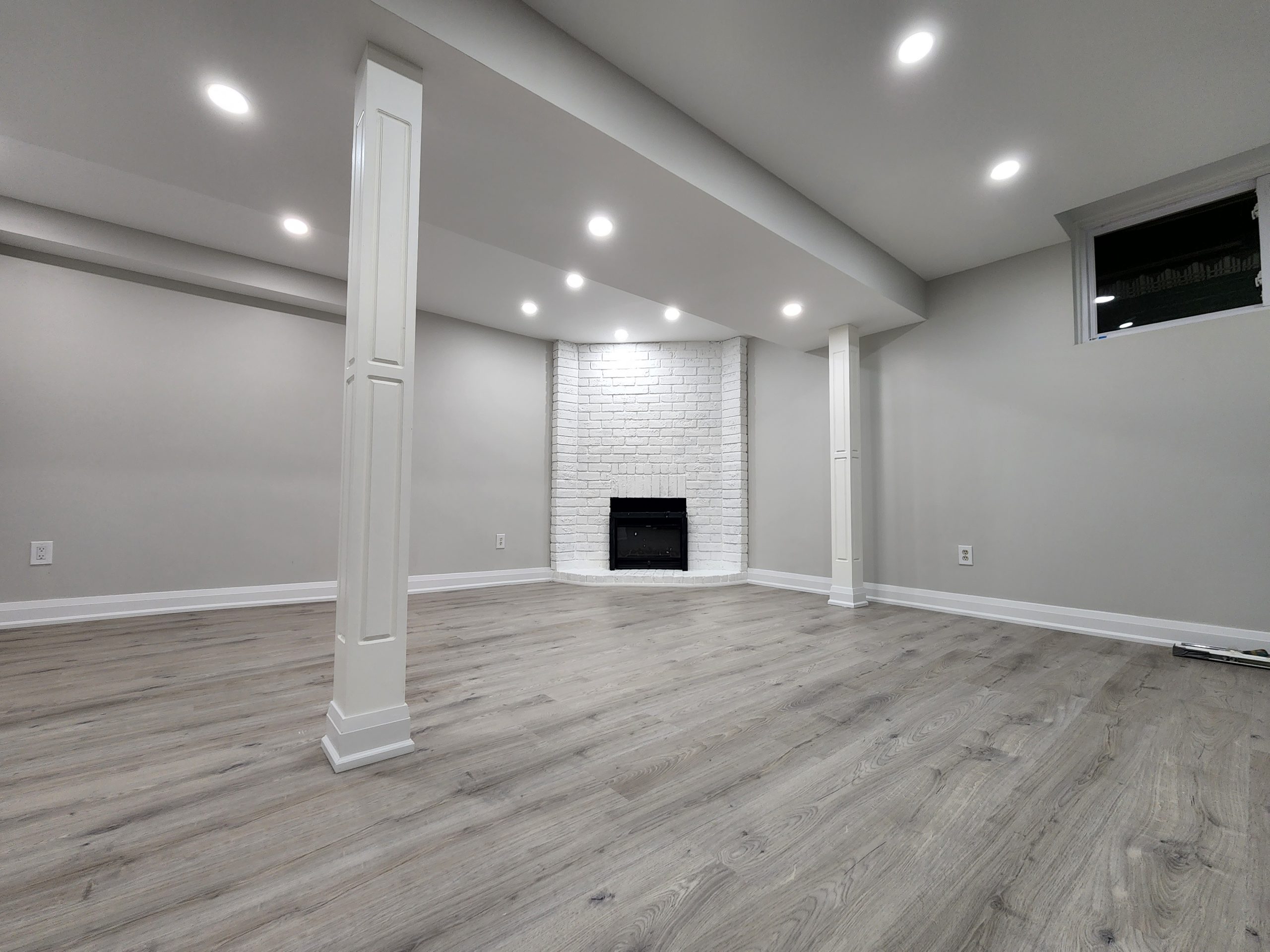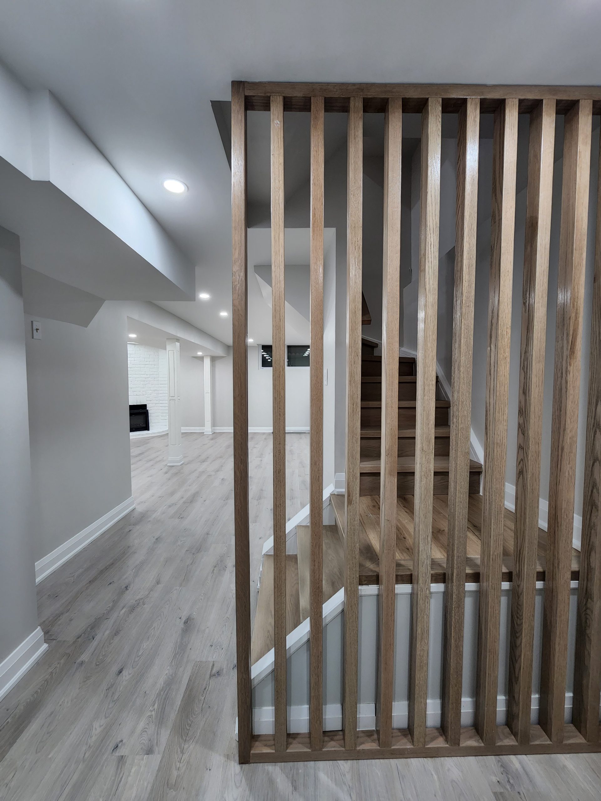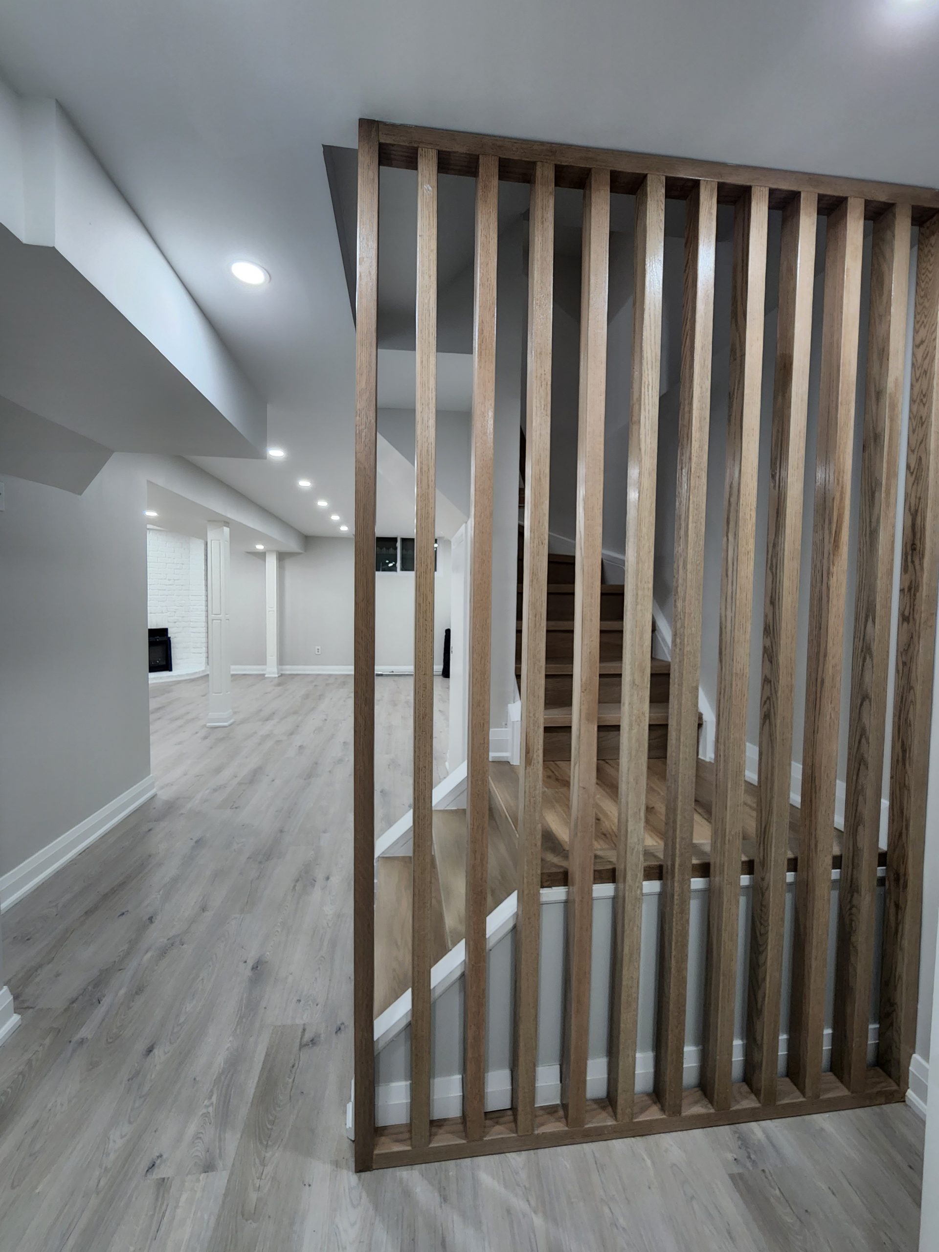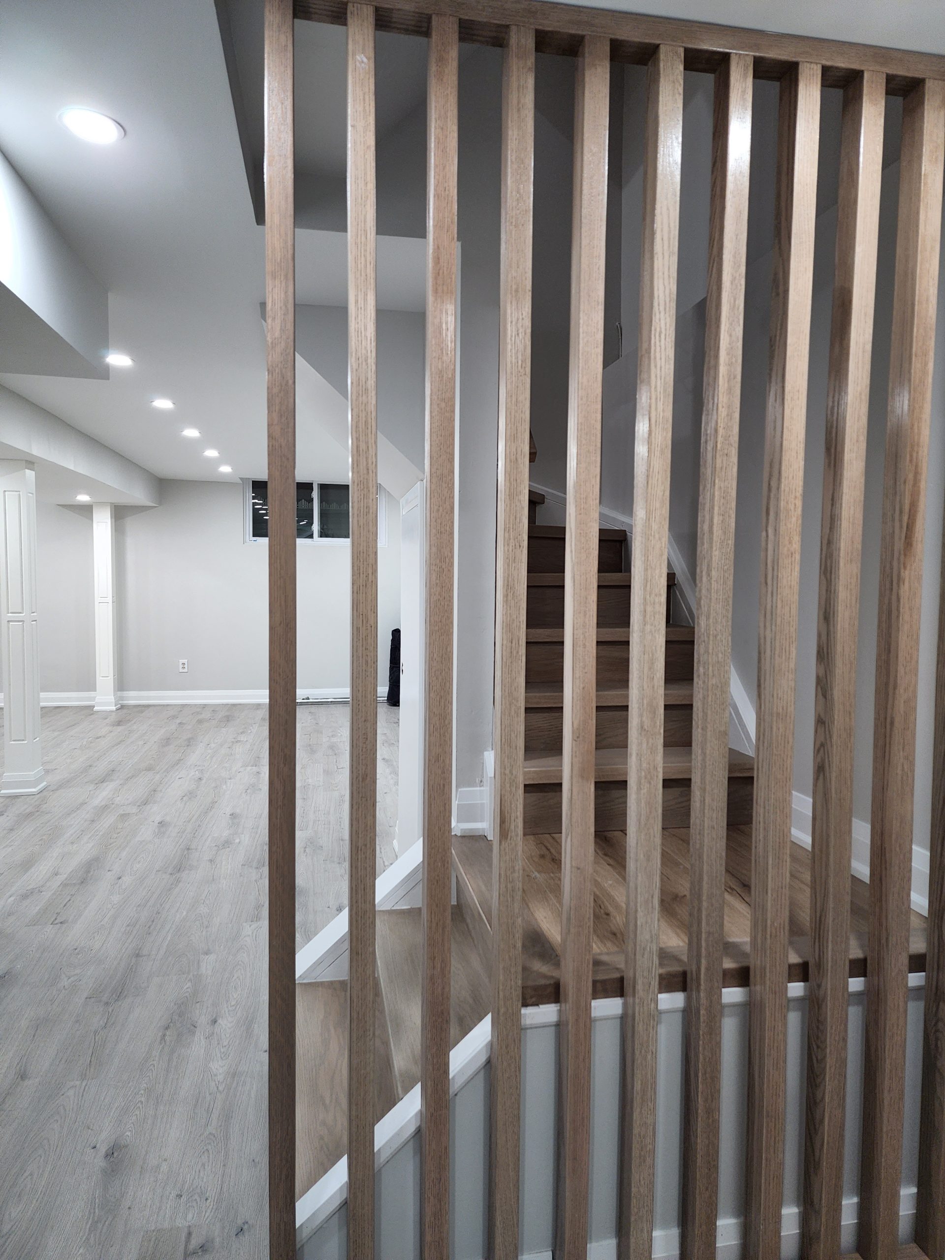 The renovation continues into the basement, where fresh flooring, new drywall, recessed lighting, and a refinished fireplace create a clean and comfortable living area. A custom wood slat divider and rebuilt staircase add architectural detail and warmth, tying the entire home’s aesthetic together.