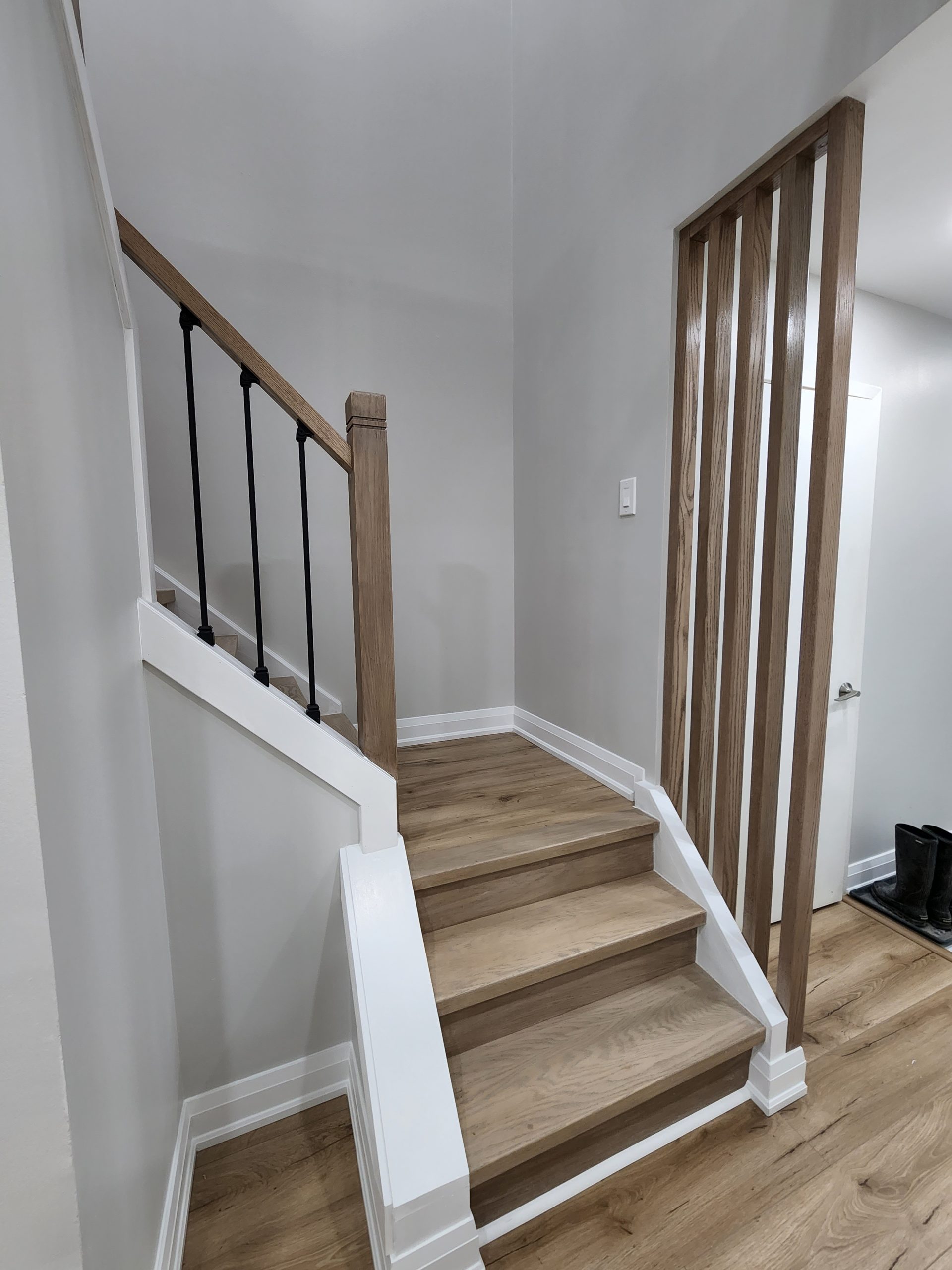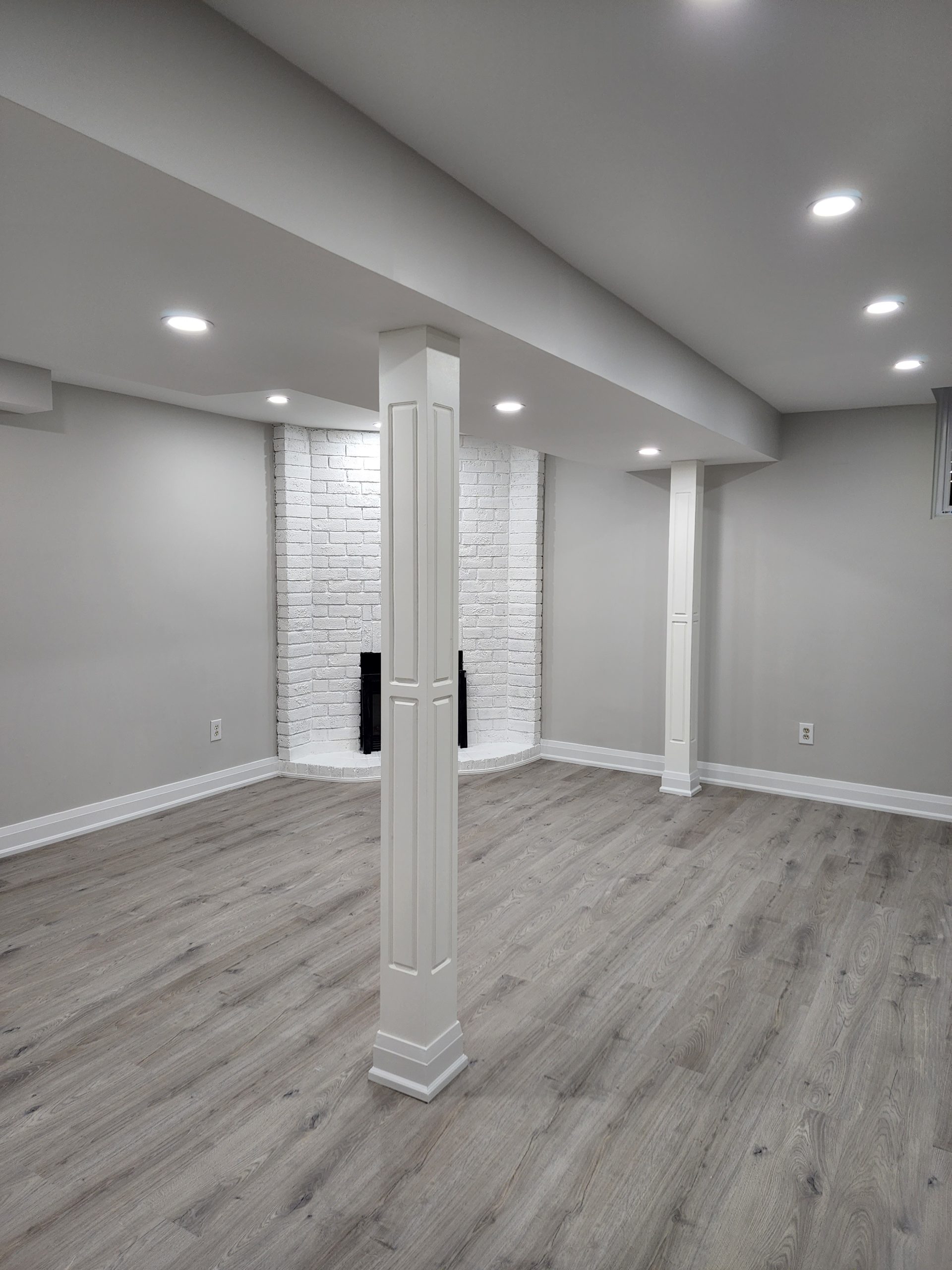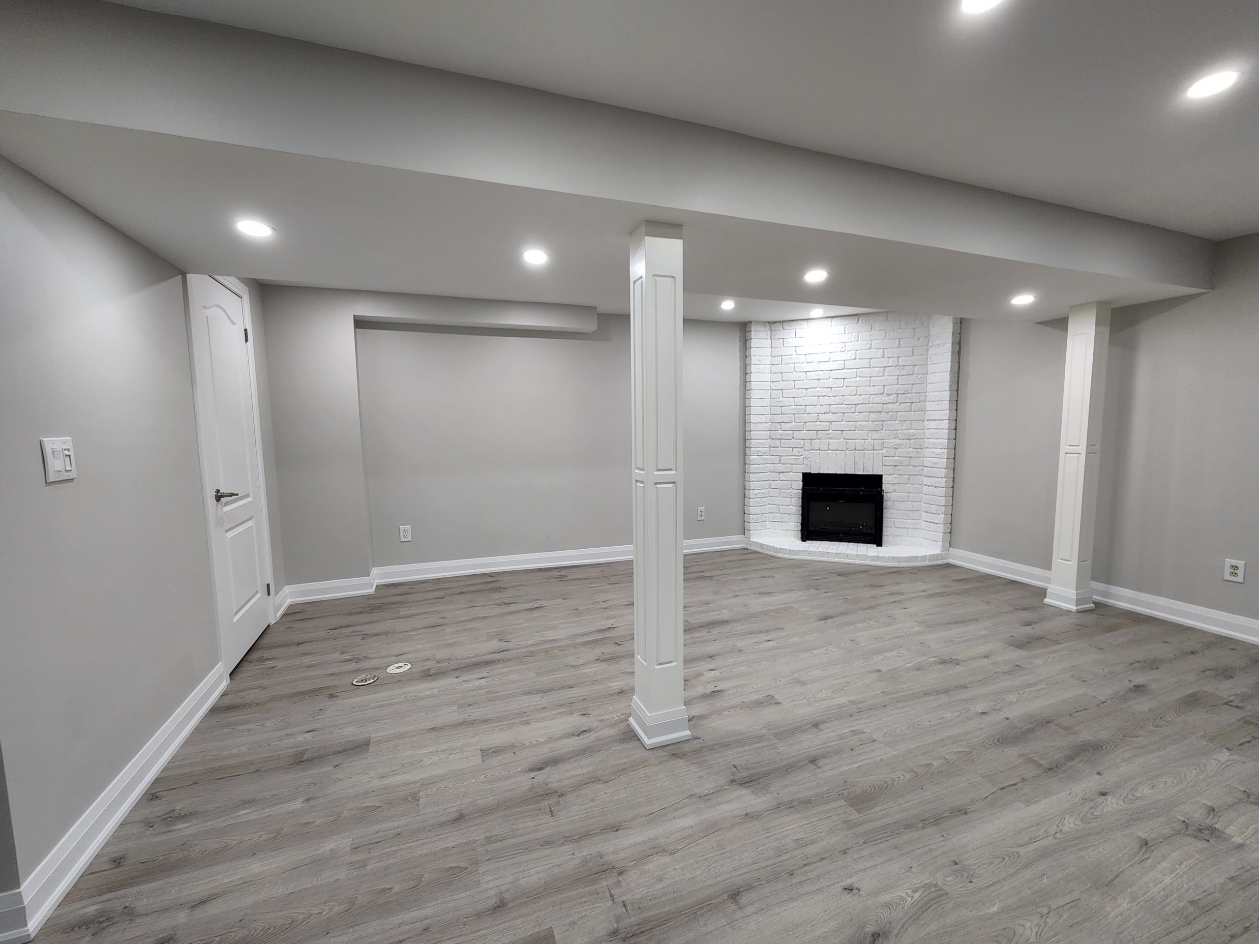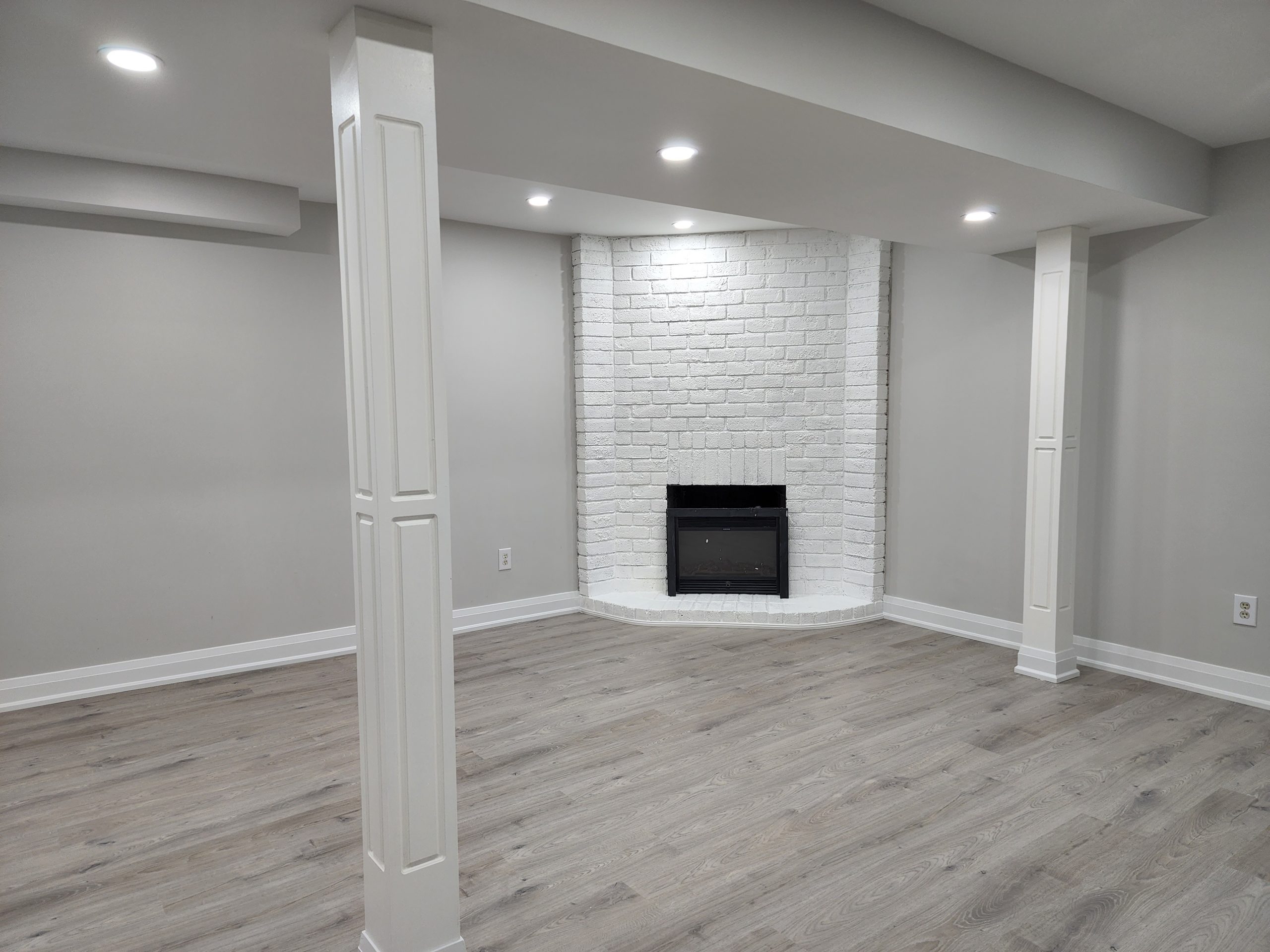 The renovation continues into the basement, where fresh flooring, new drywall, recessed lighting, and a refinished fireplace create a clean and comfortable living area. A custom wood slat divider and rebuilt staircase add architectural detail and warmth, tying the entire home’s aesthetic together.