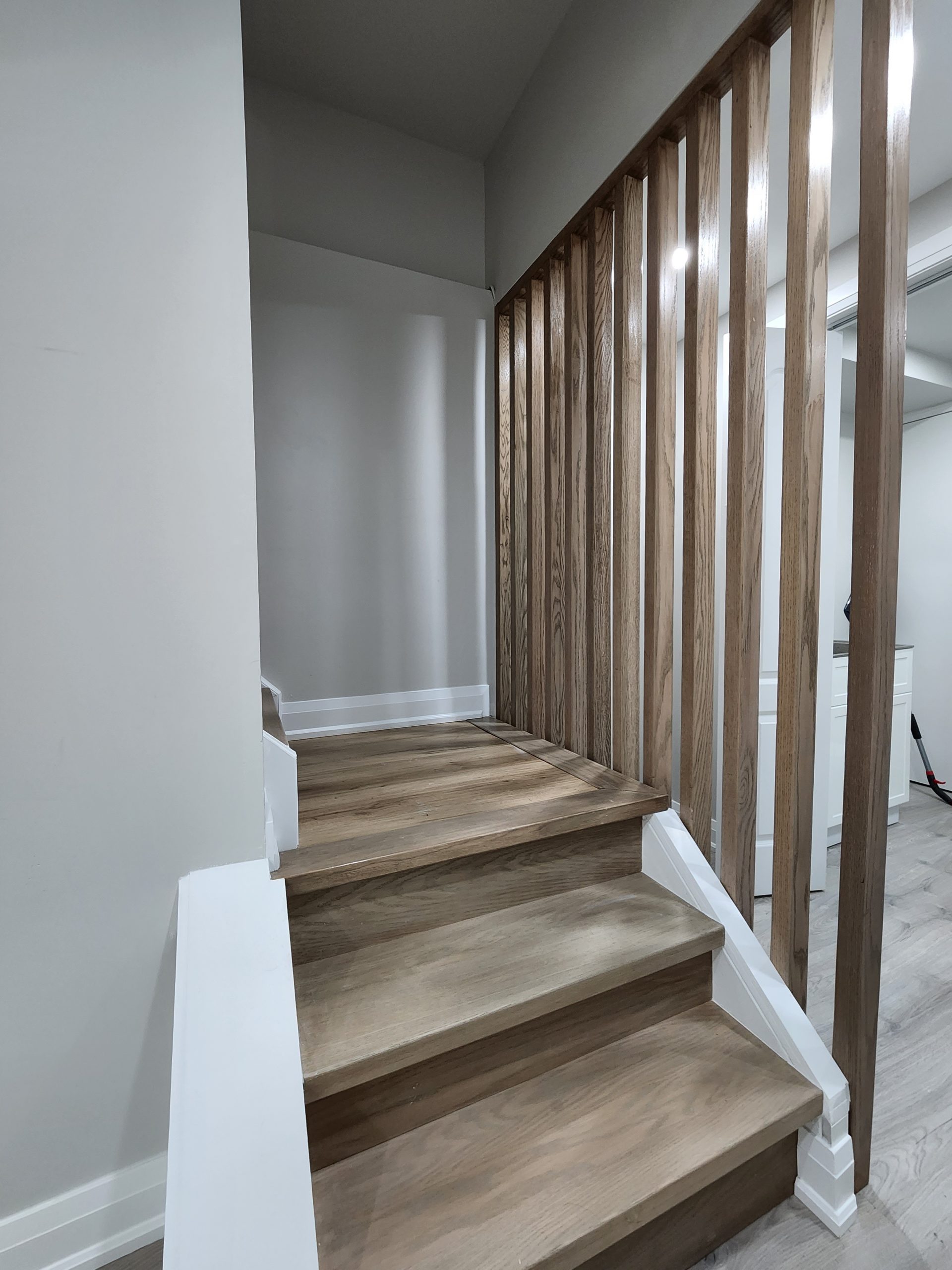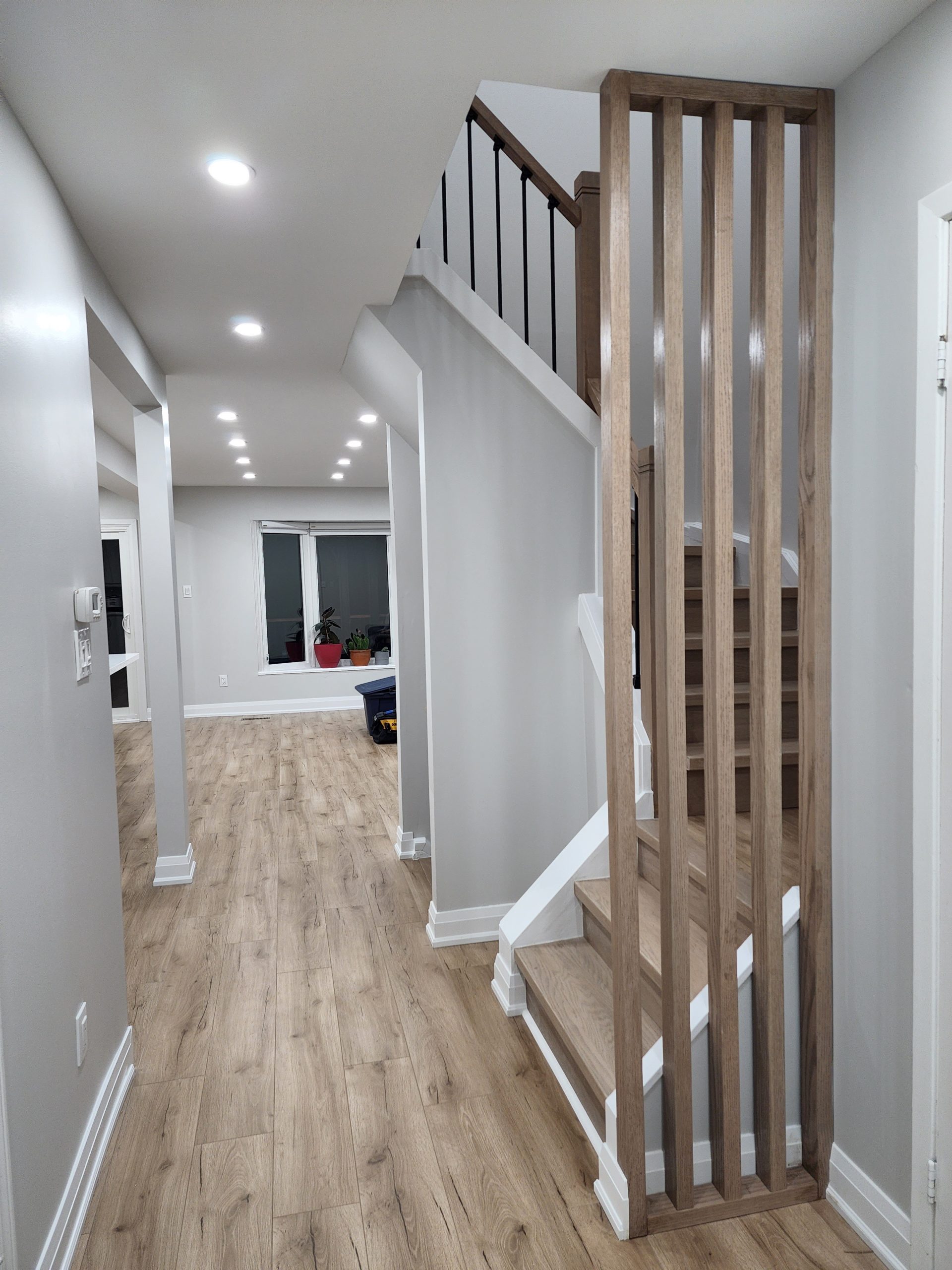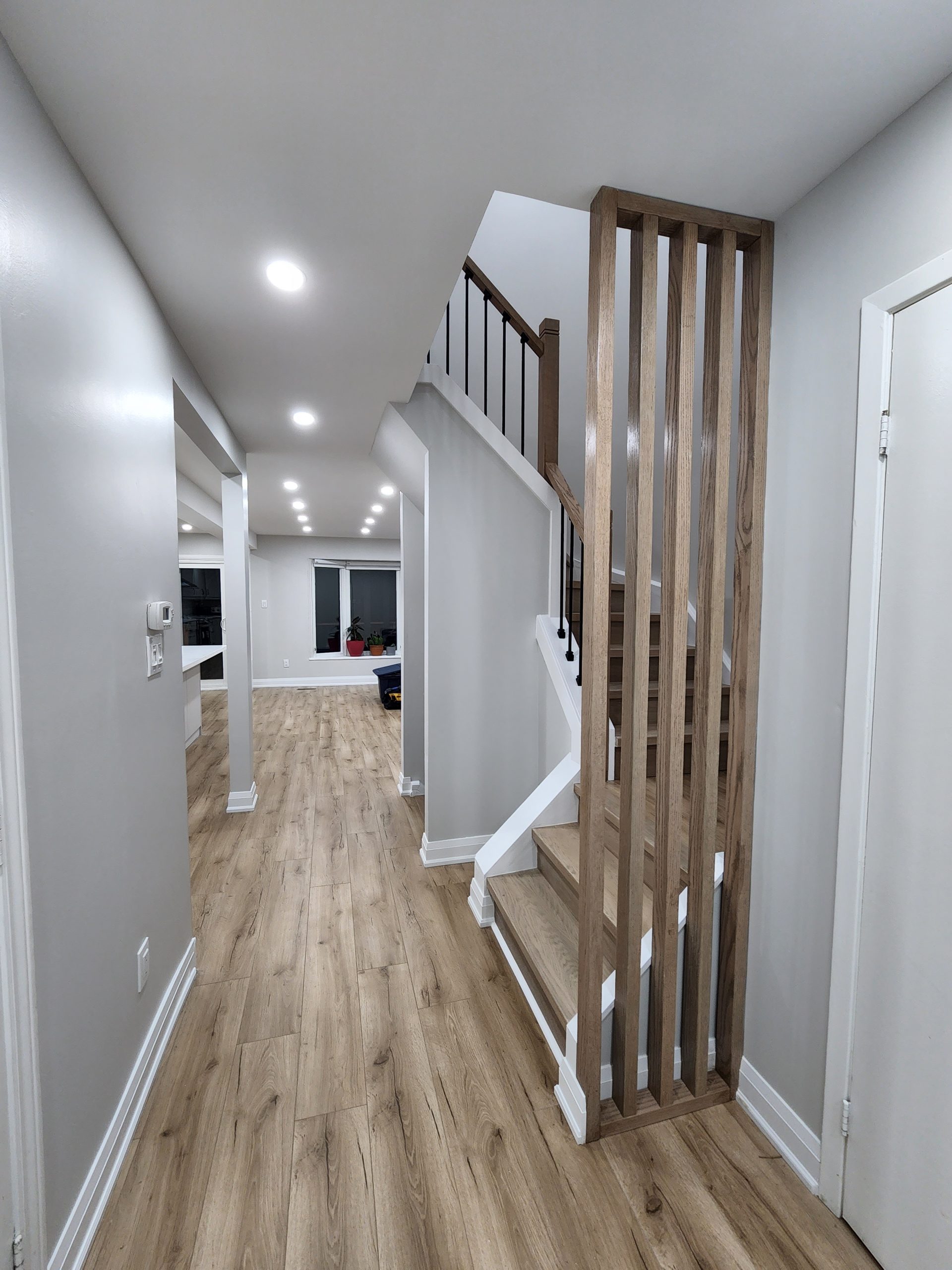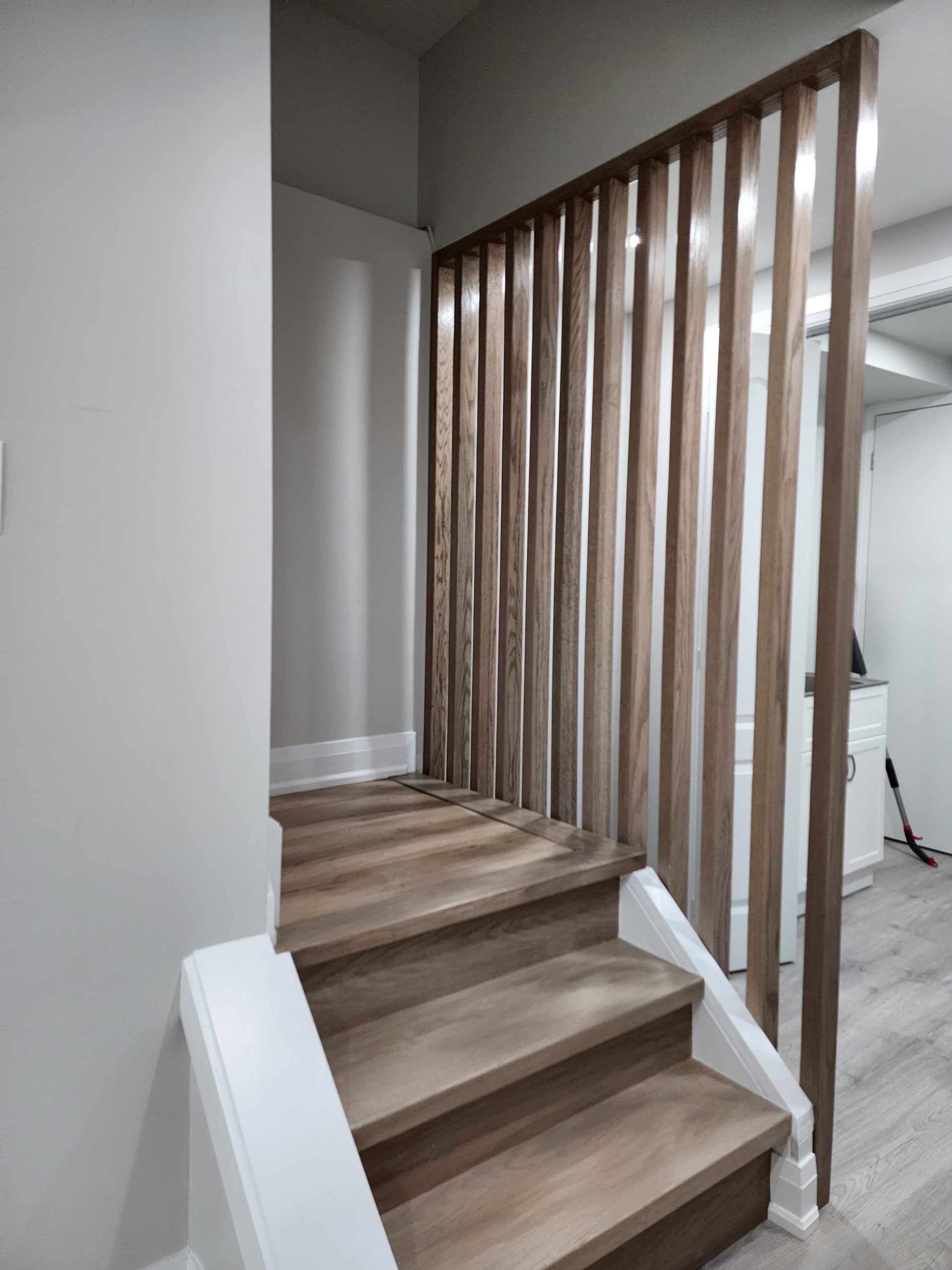 The renovation continues into the basement, where fresh flooring, new drywall, recessed lighting, and a refinished fireplace create a clean and comfortable living area. A custom wood slat divider and rebuilt staircase add architectural detail and warmth, tying the entire home’s aesthetic together.