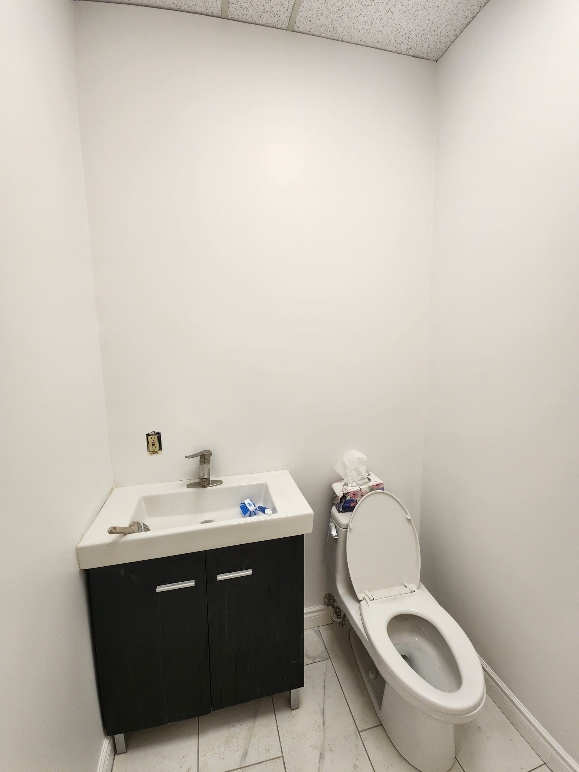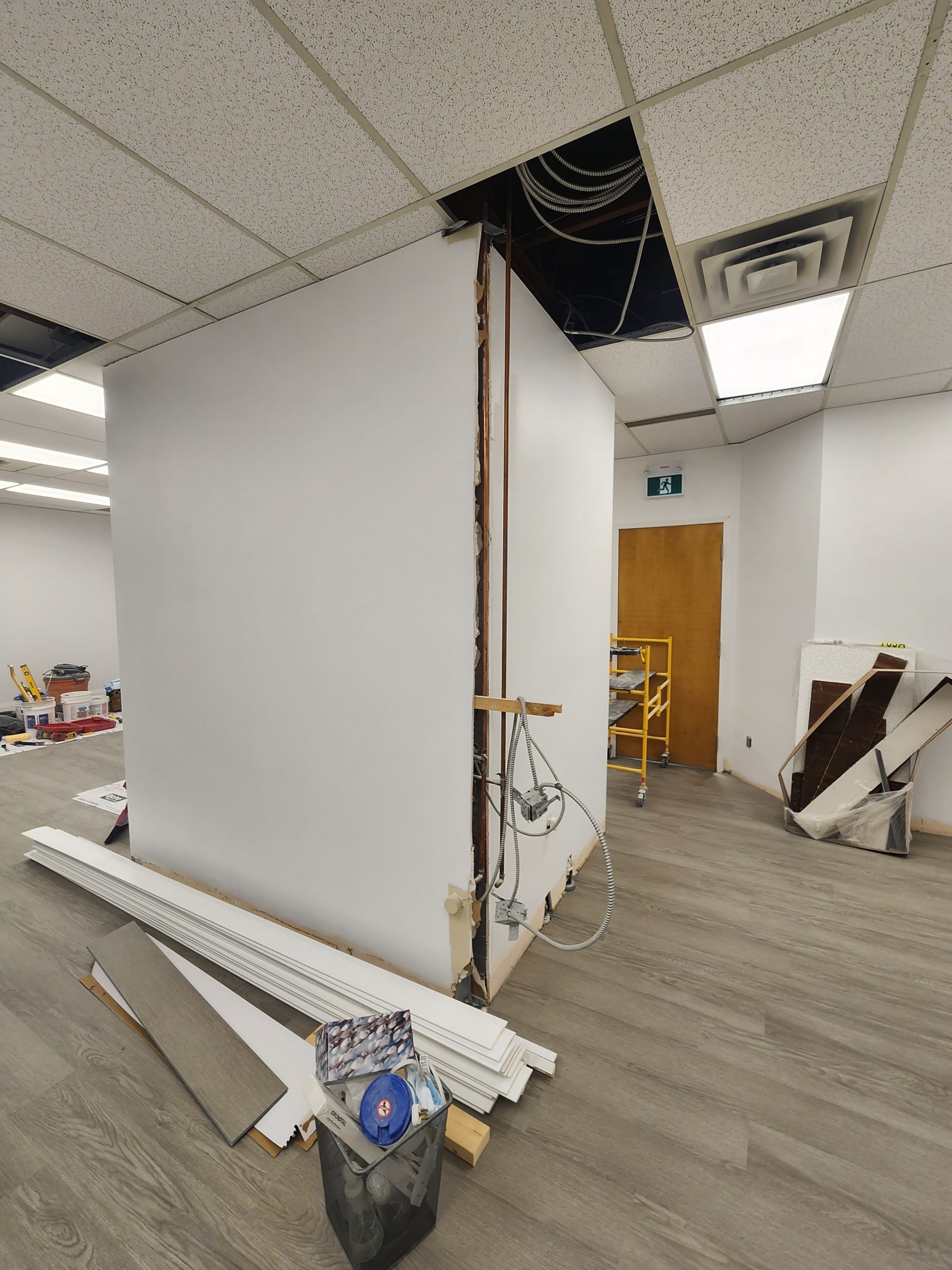 The renovation began with a full demolition of the old interior, including removal of damaged ceiling tiles, worn flooring, outdated cabinetry, and non-functional electrical. After exposing the structure, all walls were patched, primed, and repainted in crisp studio-clean finishes to create a bright and hygienic environment suitable for tattoo work.