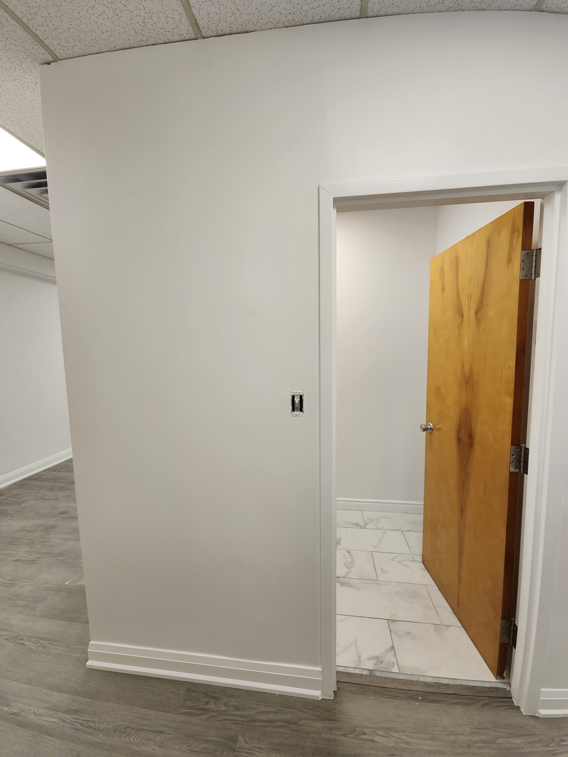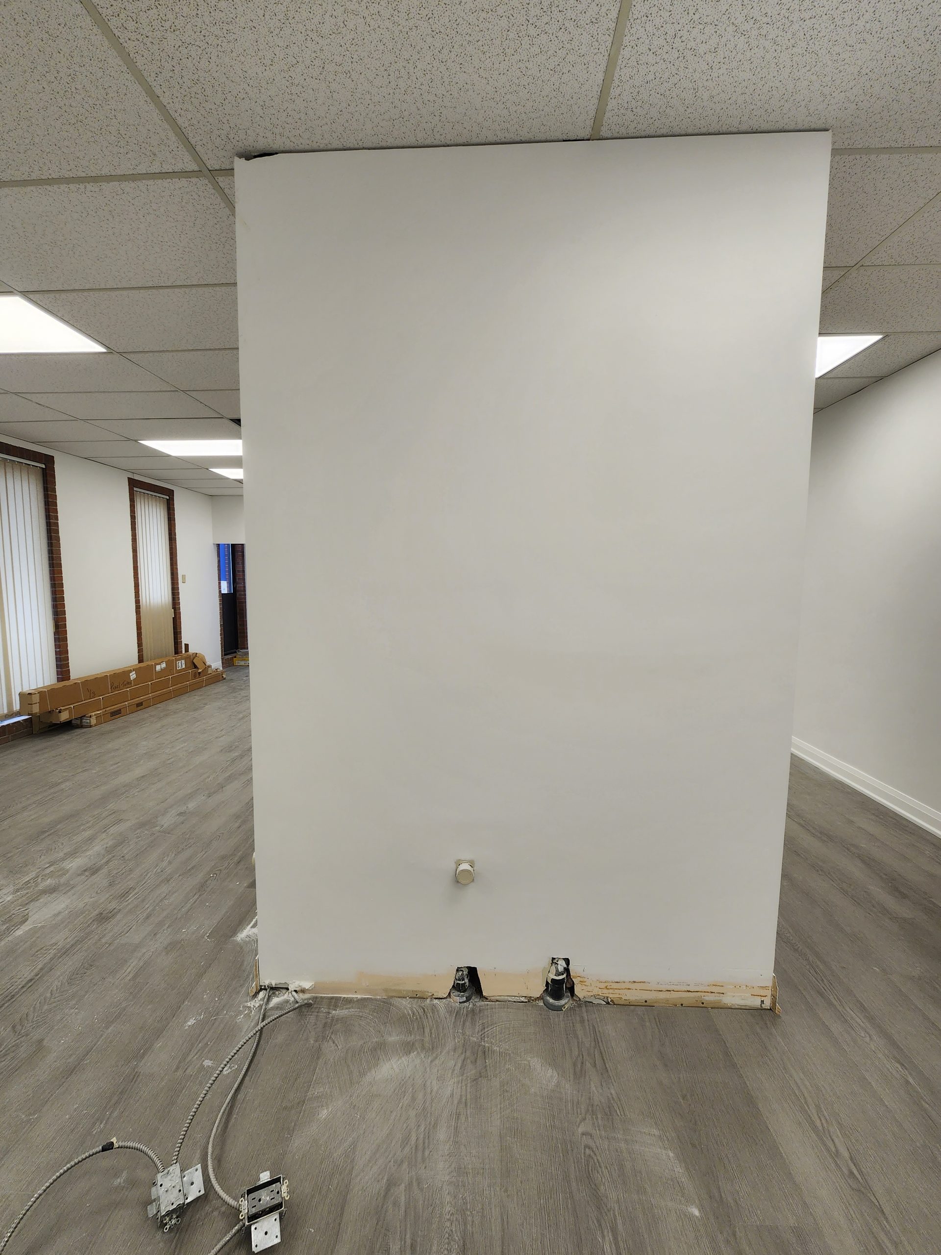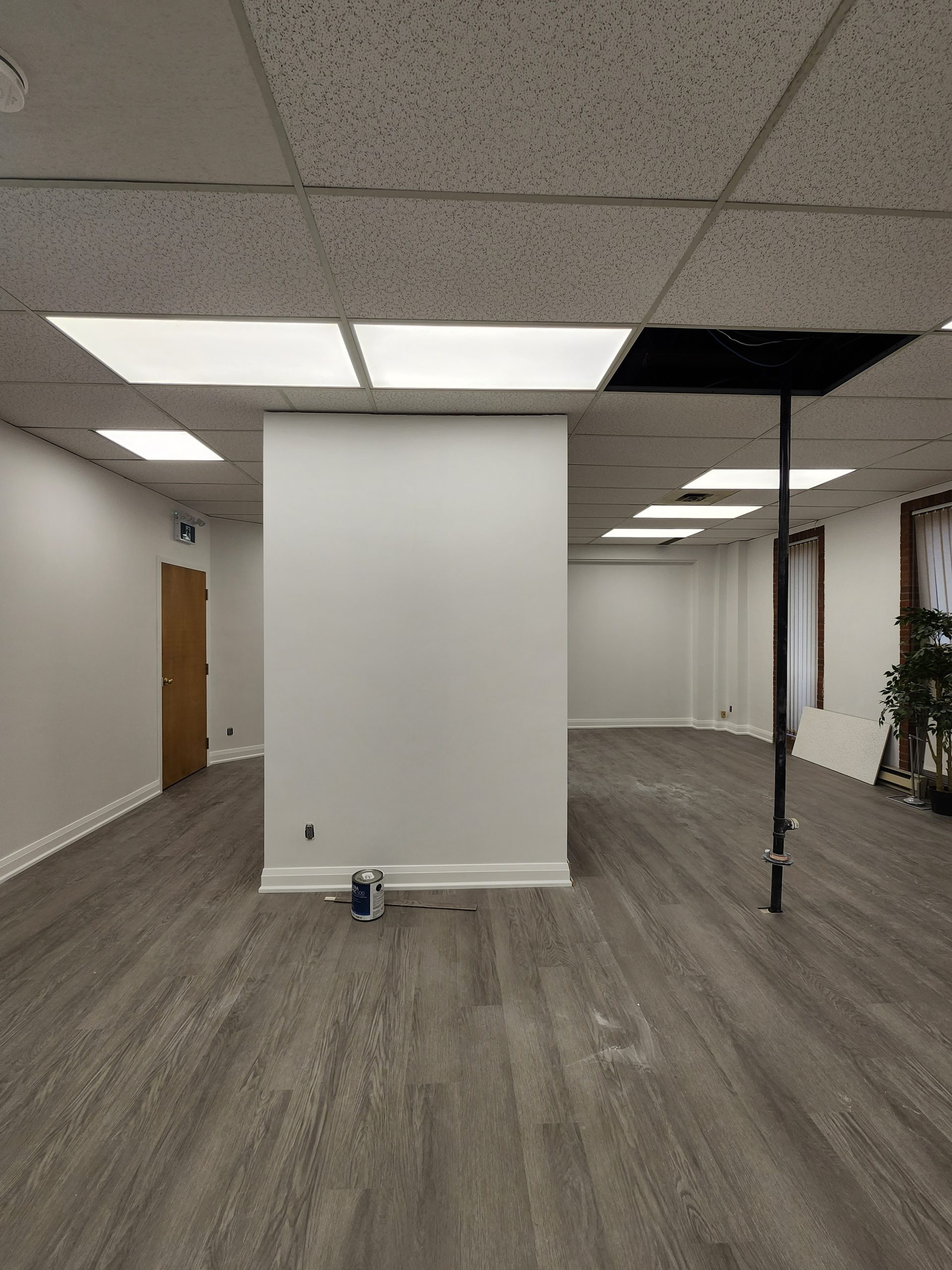 A fresh commercial-grade LVT flooring system was installed throughout, providing durability, easy maintenance, and seamless continuity across all rooms. The ceiling grid was upgraded with new LED panel lighting, giving artists clear visibility and reducing shadows during detailed work.